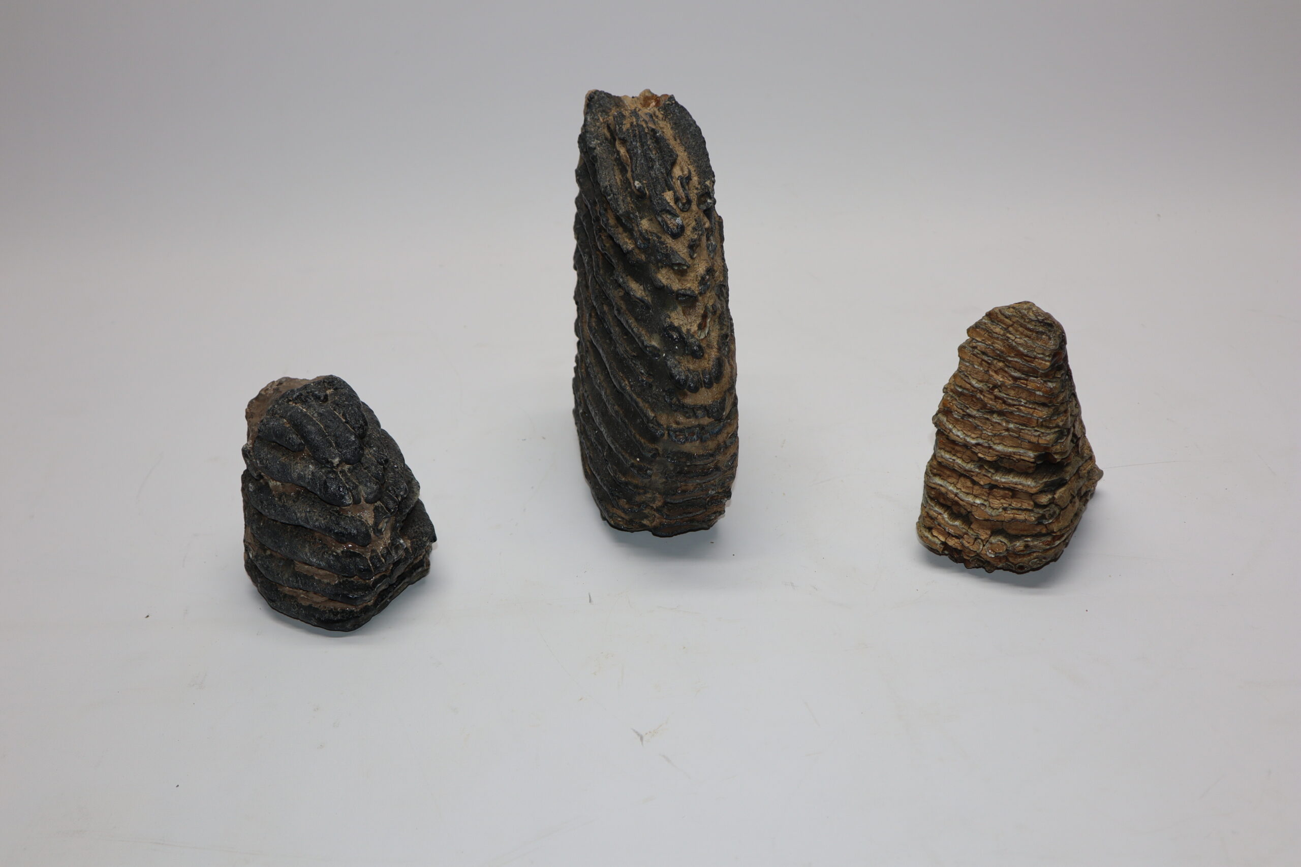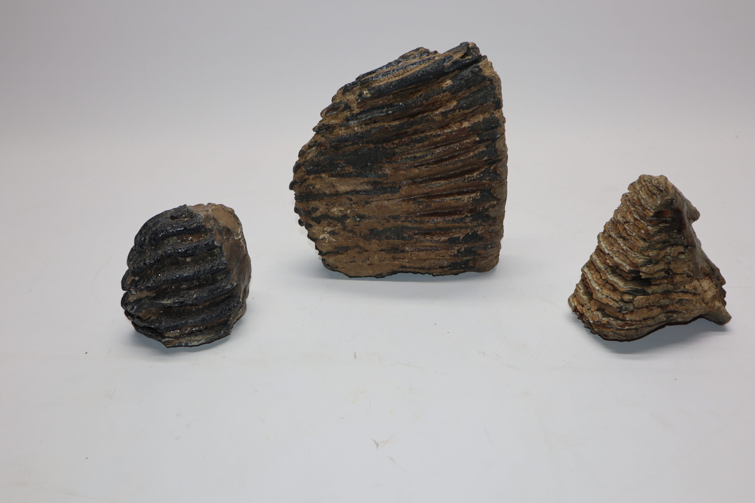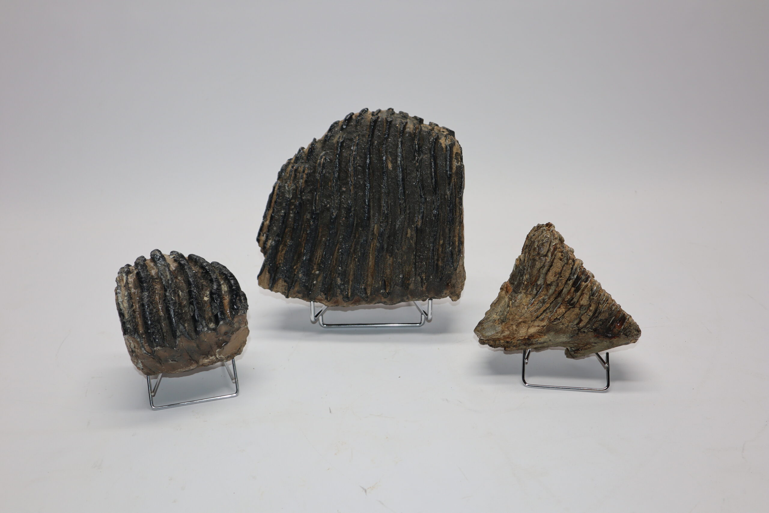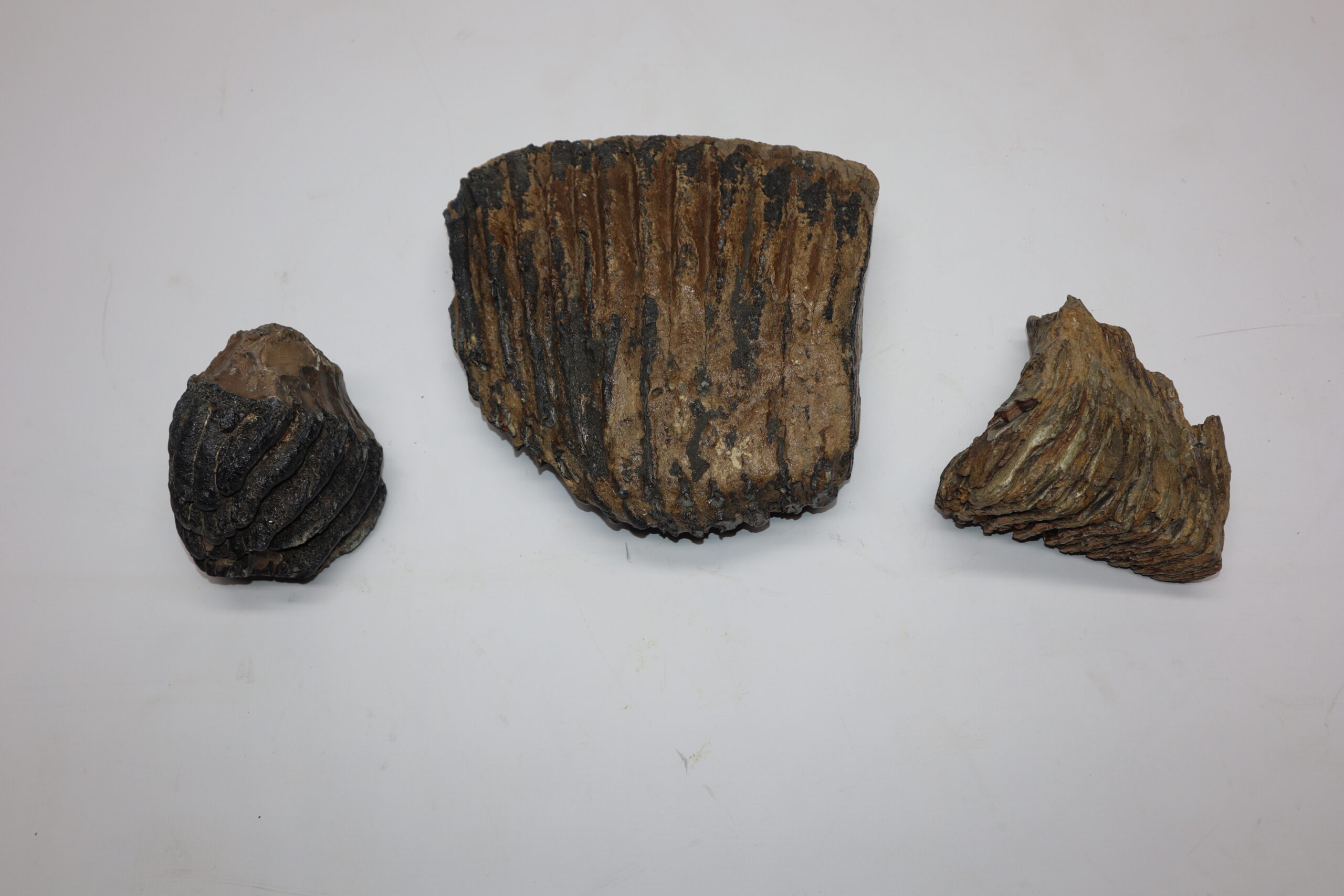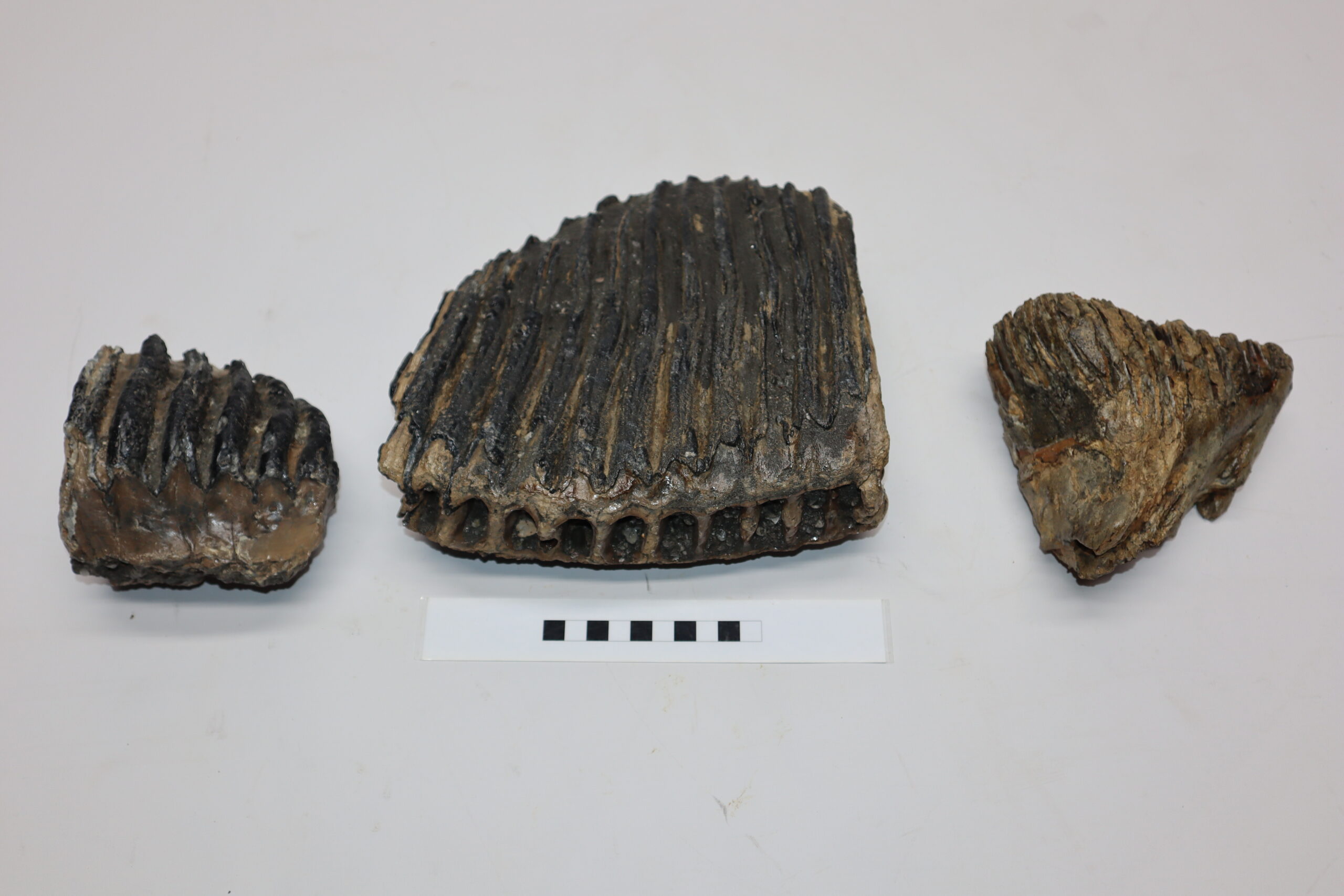 This bargain lot contains three partial molars that belonged to Woolly Mammoth (Mammuthus primigenius), Southern Mammoth (Mammuthus meridionalis) and Palaeoloxodon (Elephas antiquus). All in partial but still good condition and interesting to be able to compare the size differences between these species. No restoration whatsoever. The ruler in the image represents 10 cm / 3.9 in.