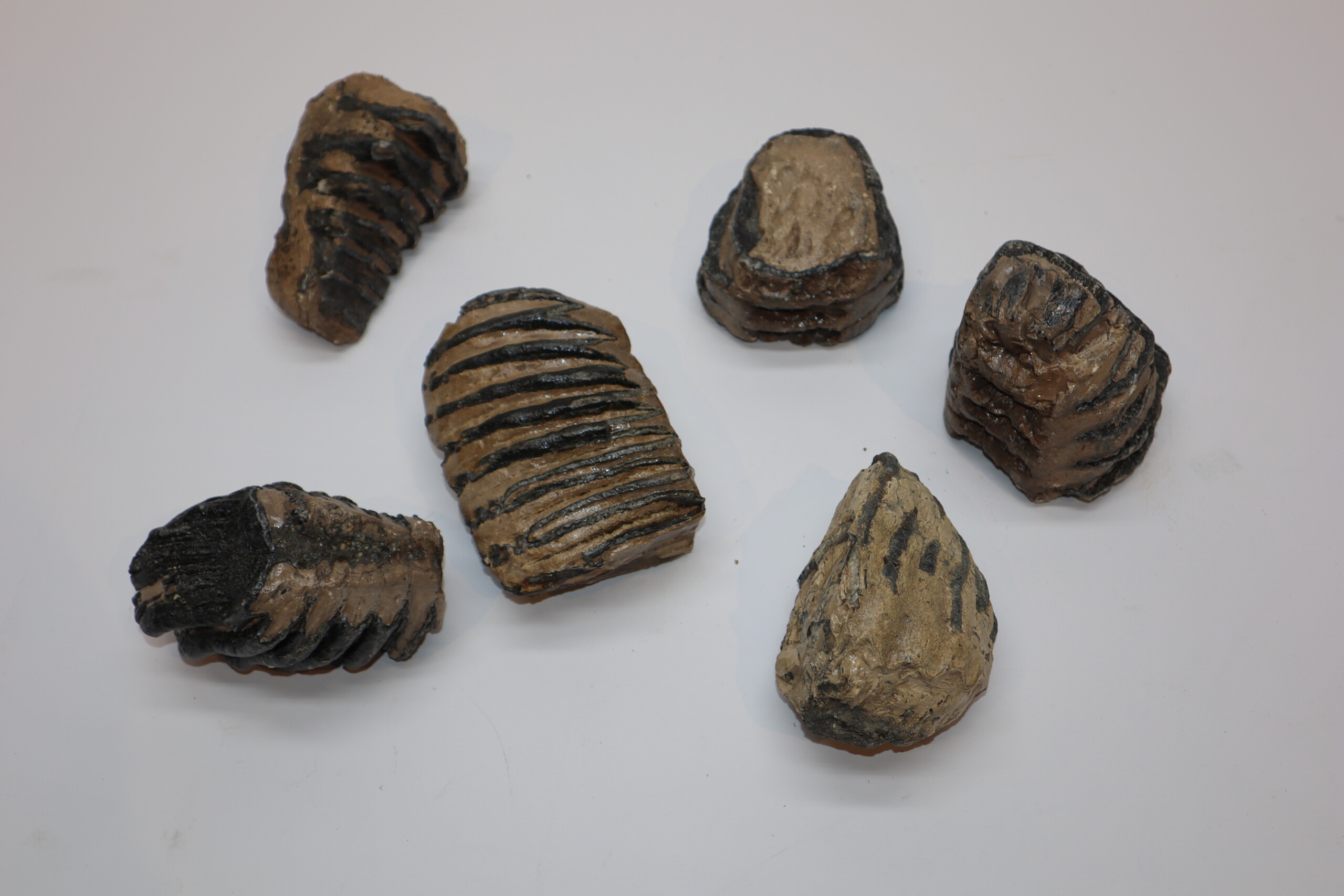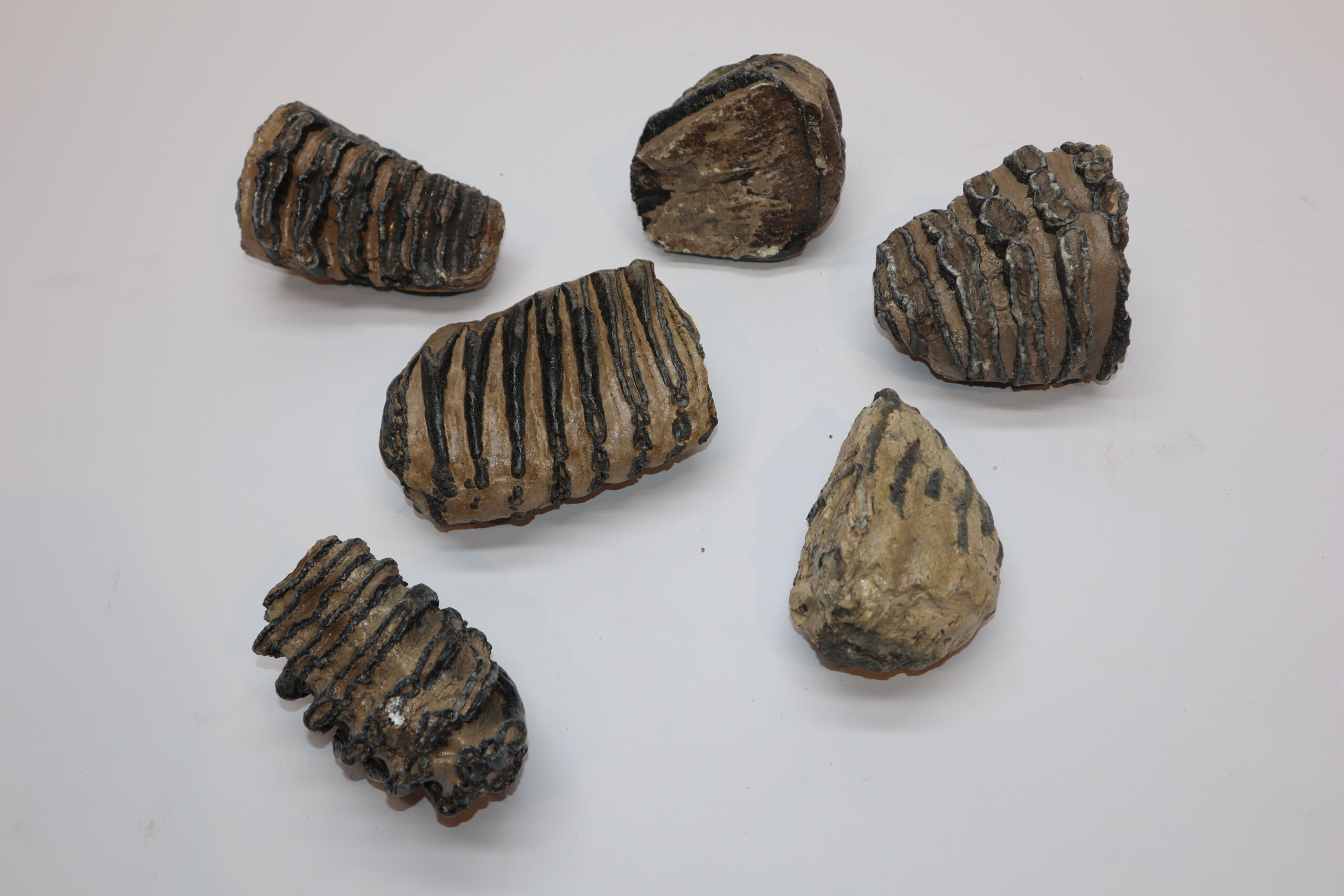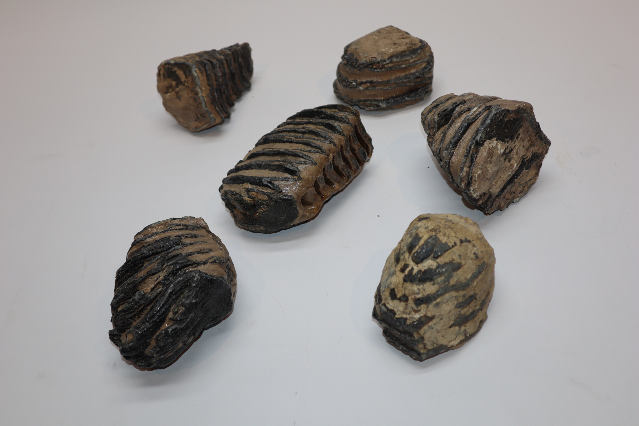 On offer is an interesting collection of six large partial molars of the Southern Mammoth, or Mammuthus meridionalis. With a shoulder height of approx 4 metres (13 feet), this is one of the largest species of Mammoth to have ever lived. It is also much older and very much rarer than the more commonly encountered Woolly Mammoth. Wonderful opportunity for the beginning collector or for re-selling. These molars are in partial but nice condition, as seen in the images. The black-and-white section of the ruler in the image represents 10 cm / 3.9 inch.