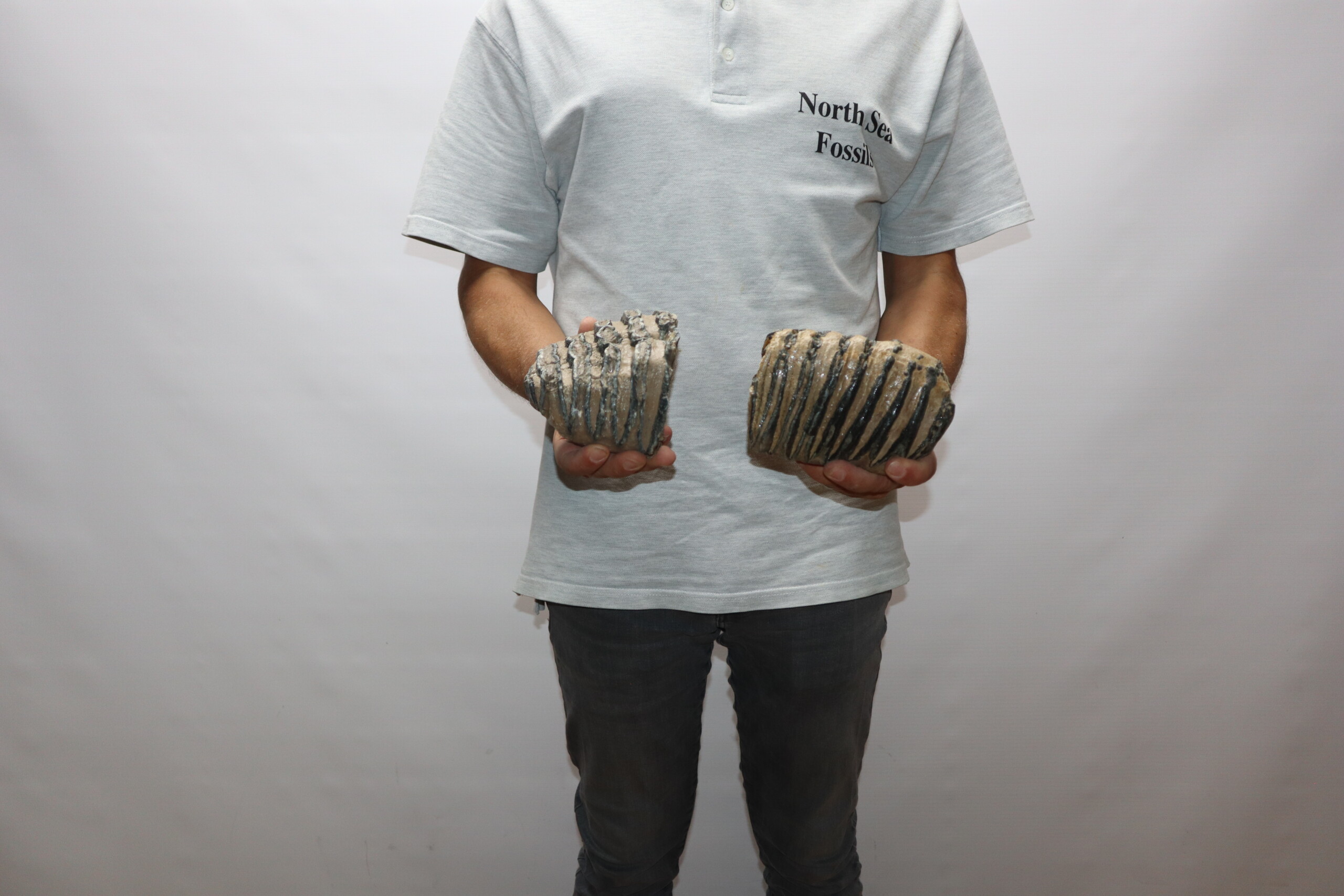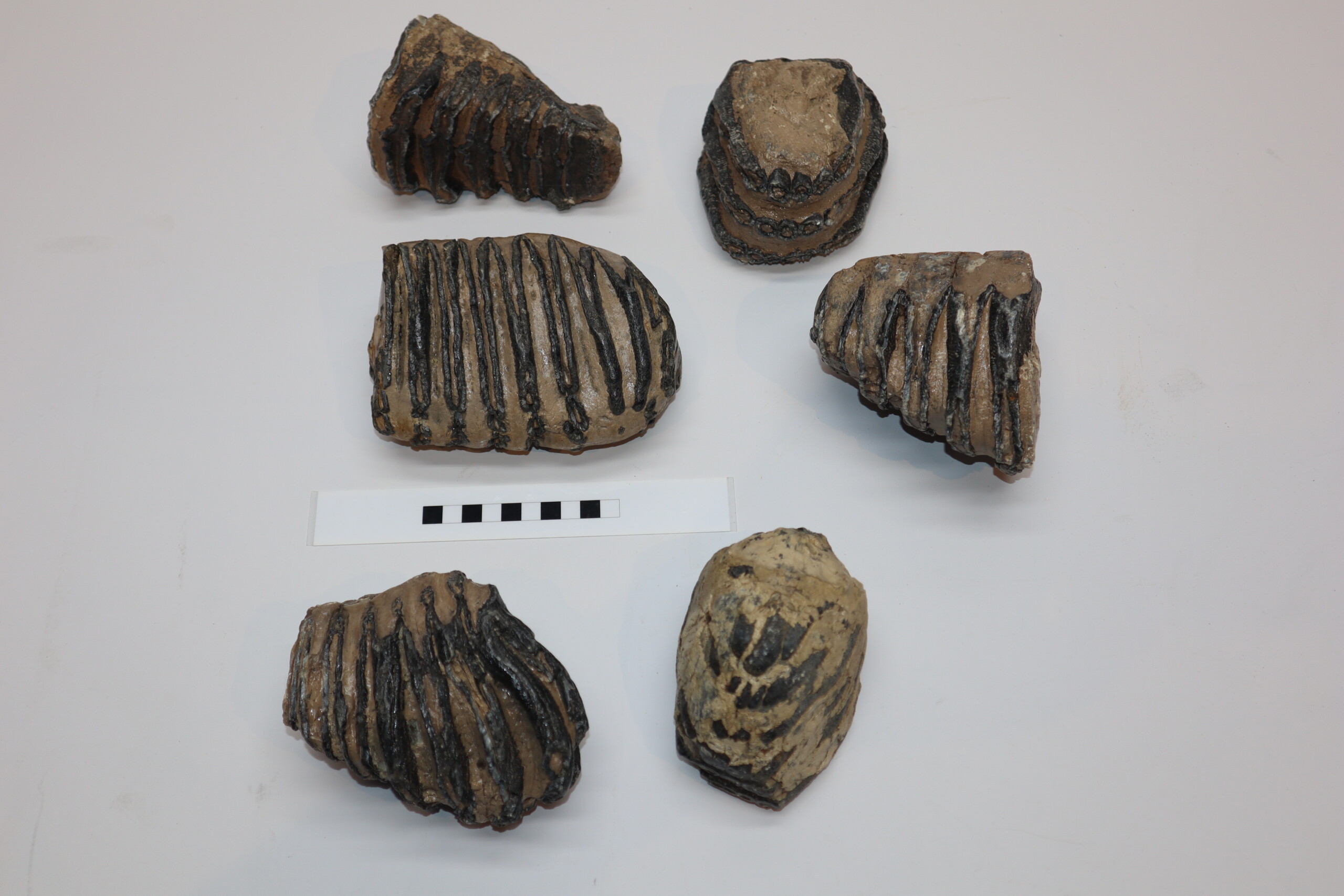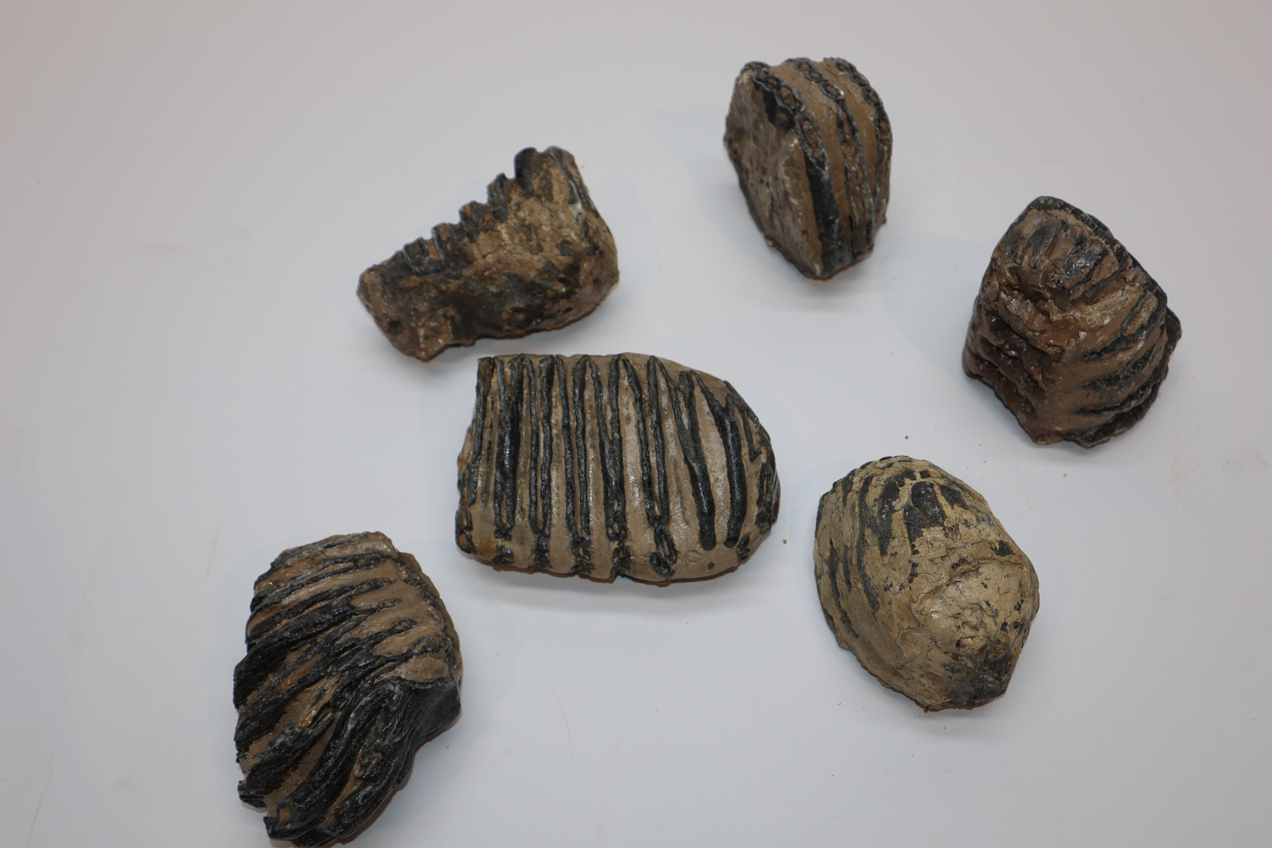 On offer is an interesting collection of six large partial molars of the Southern Mammoth, or Mammuthus meridionalis. With a shoulder height of approx 4 metres (13 feet), this is one of the largest species of Mammoth to have ever lived. It is also much older and very much rarer than the more commonly encountered Woolly Mammoth. Wonderful opportunity for the beginning collector or for re-selling. These molars are in partial but nice condition, as seen in the images. The black-and-white section of the ruler in the image represents 10 cm / 3.9 inch.