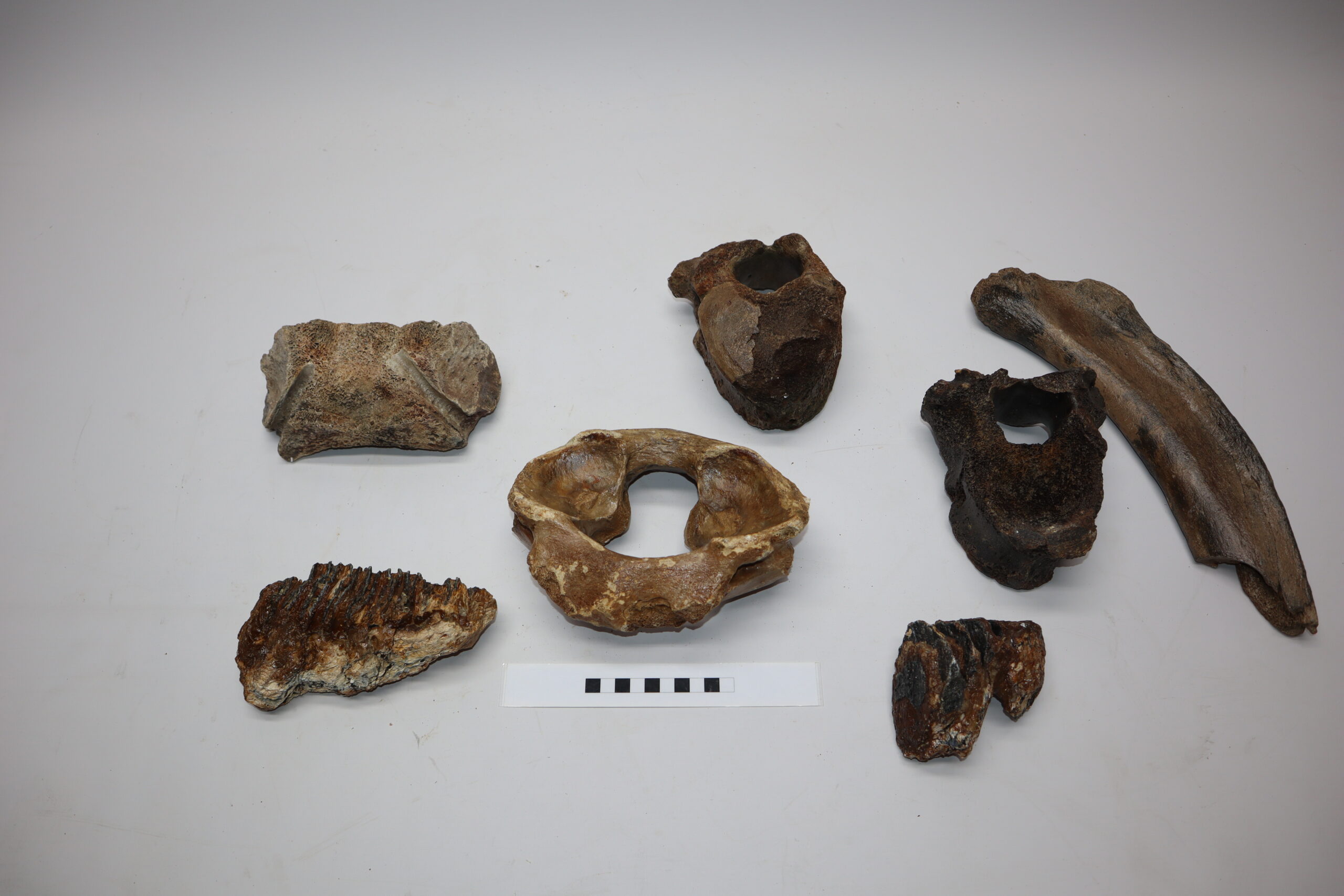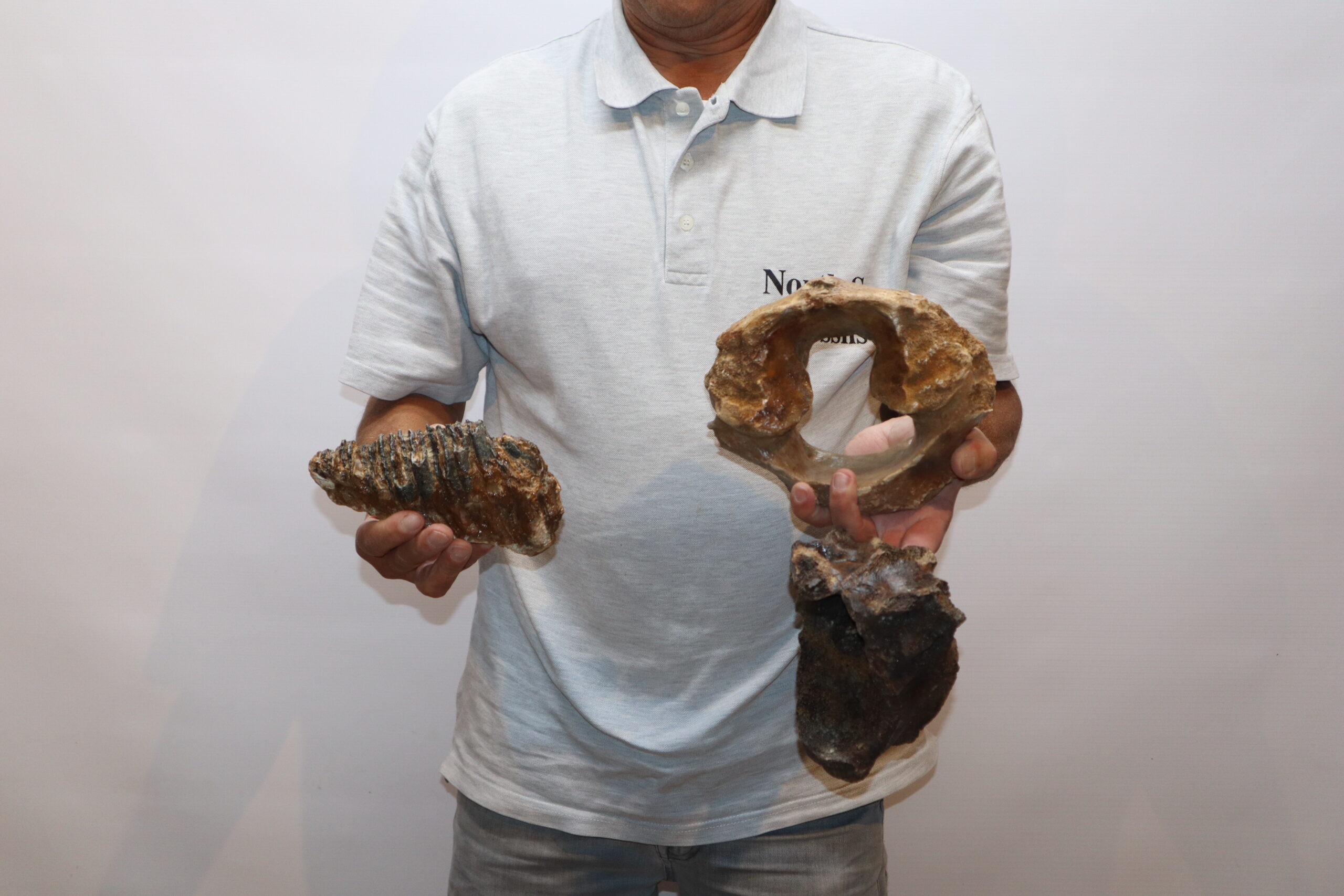 On offer is a bargain lot of seven partial Woolly Mammoth fossils. These include three vertebrae, a sacrum, two molars and a costa, all in partial but still interesting condition. Ideal for beginning collectors or for re-selling. No restoration whatsoever. The ruler in the image represents 10 cm / 3.9 inch.