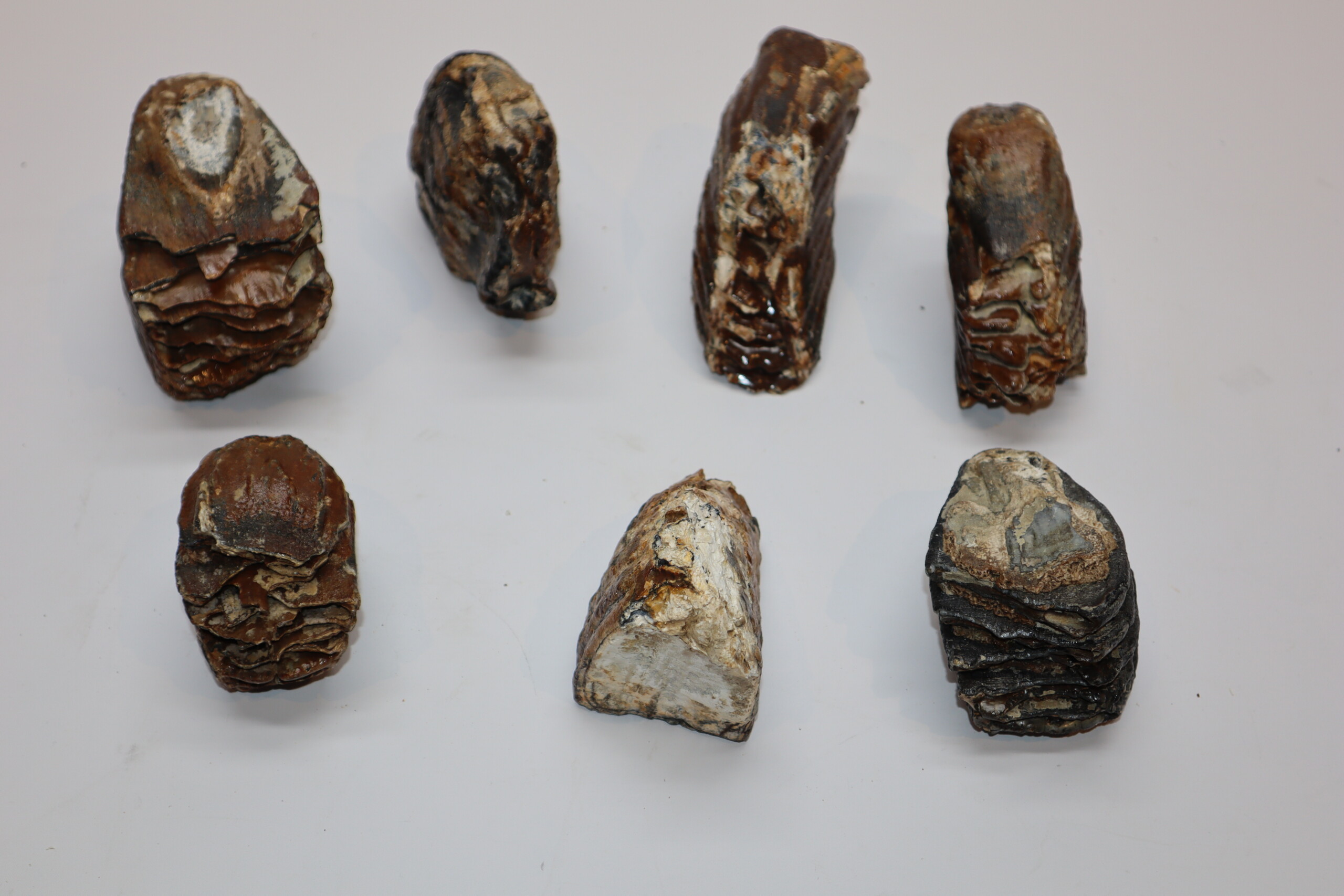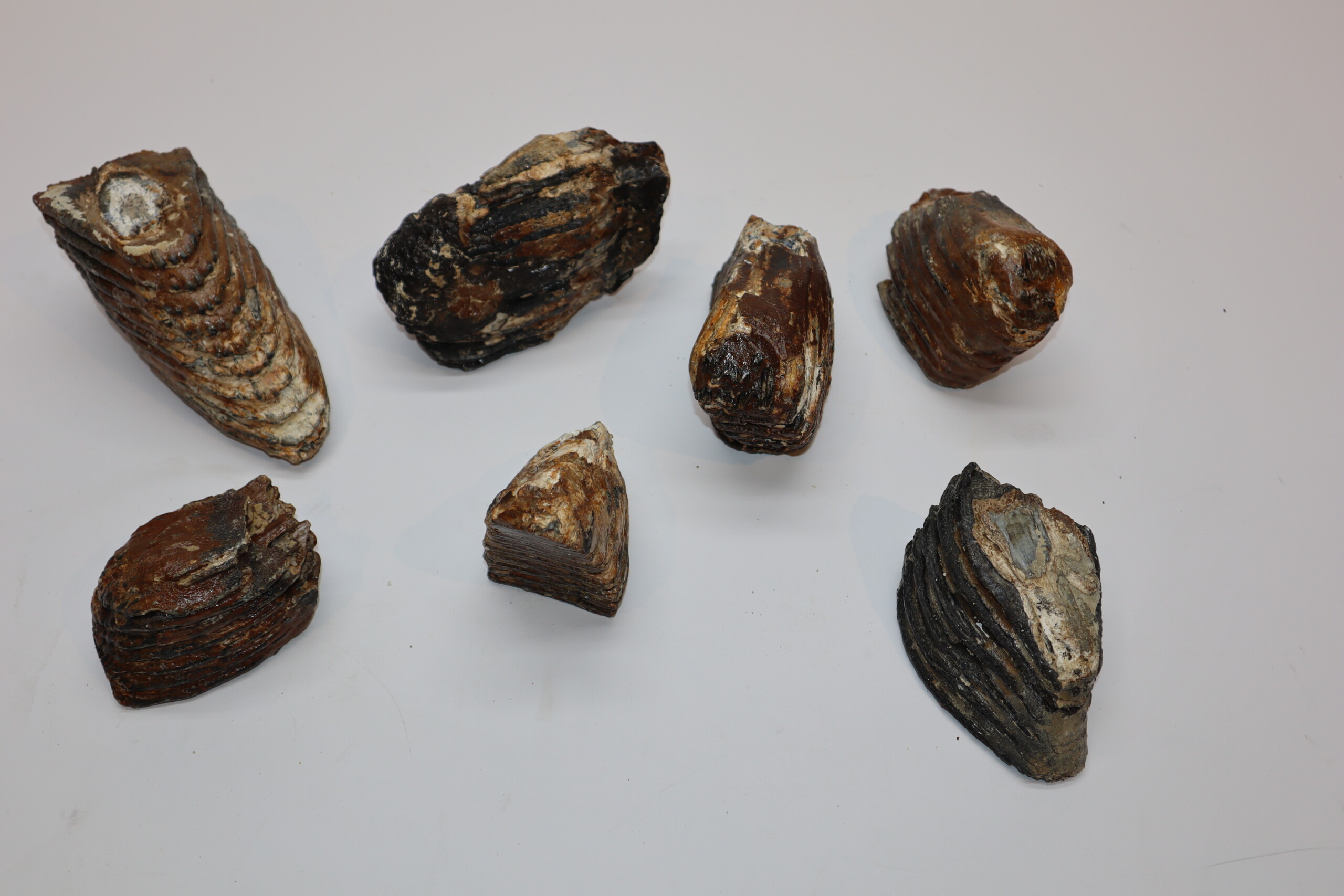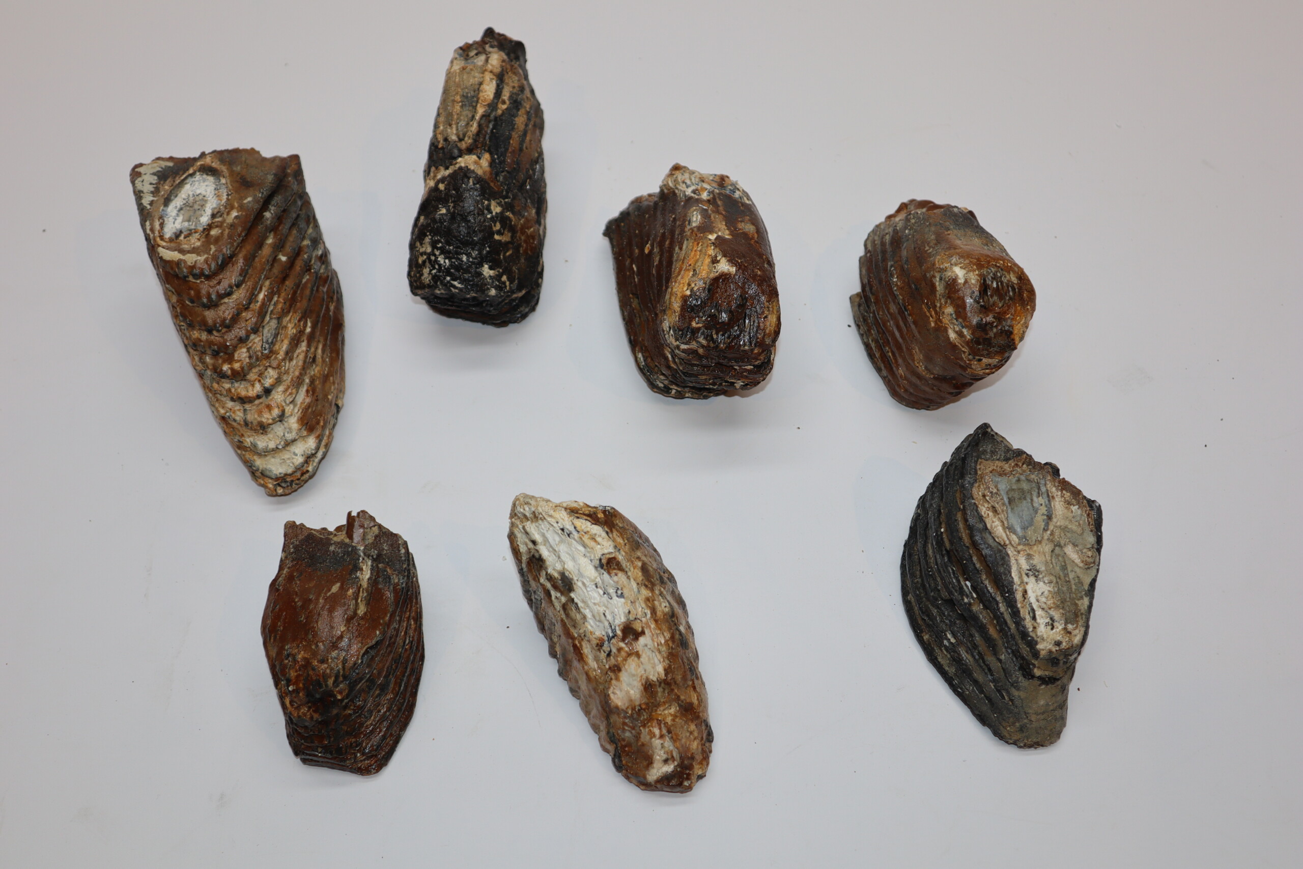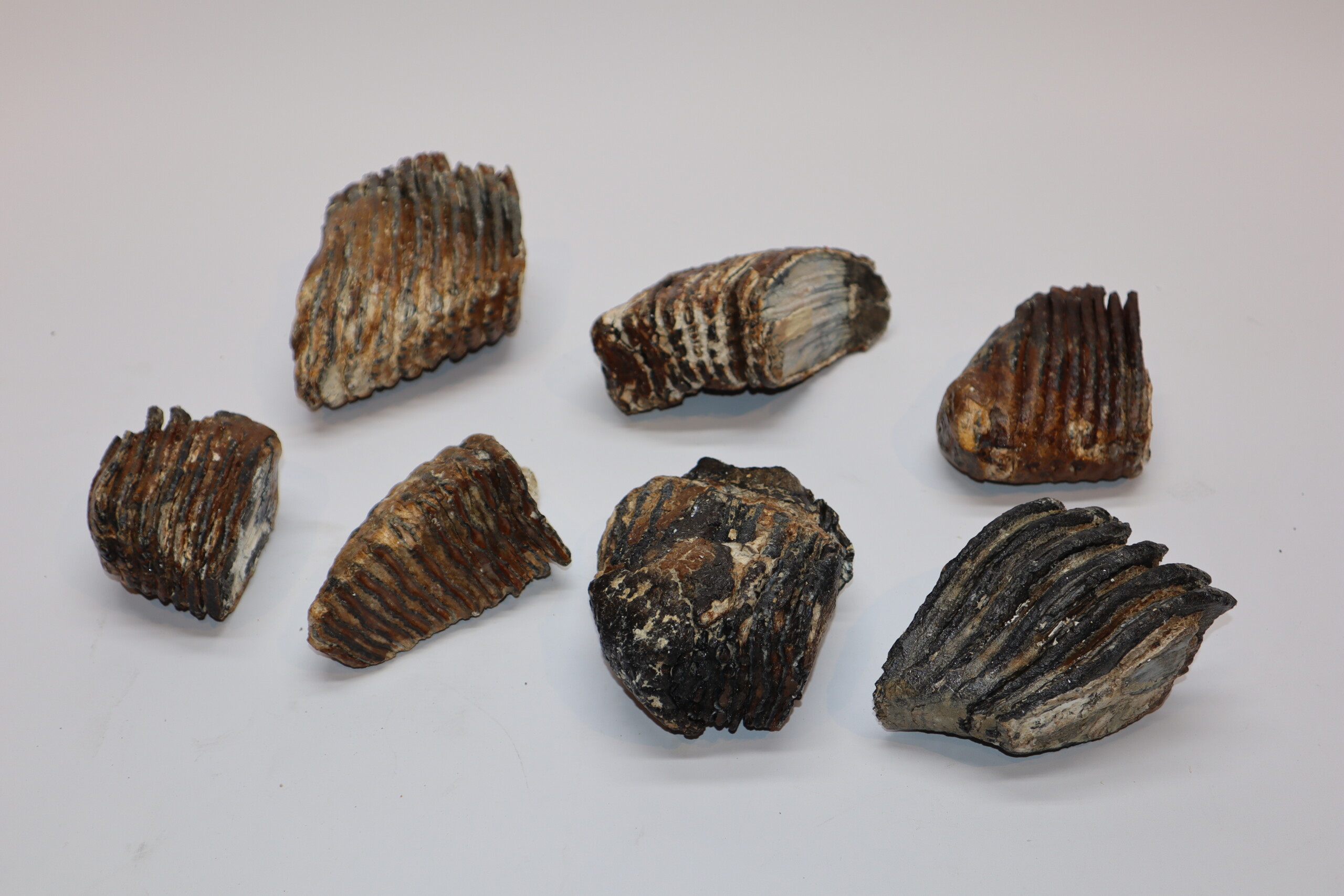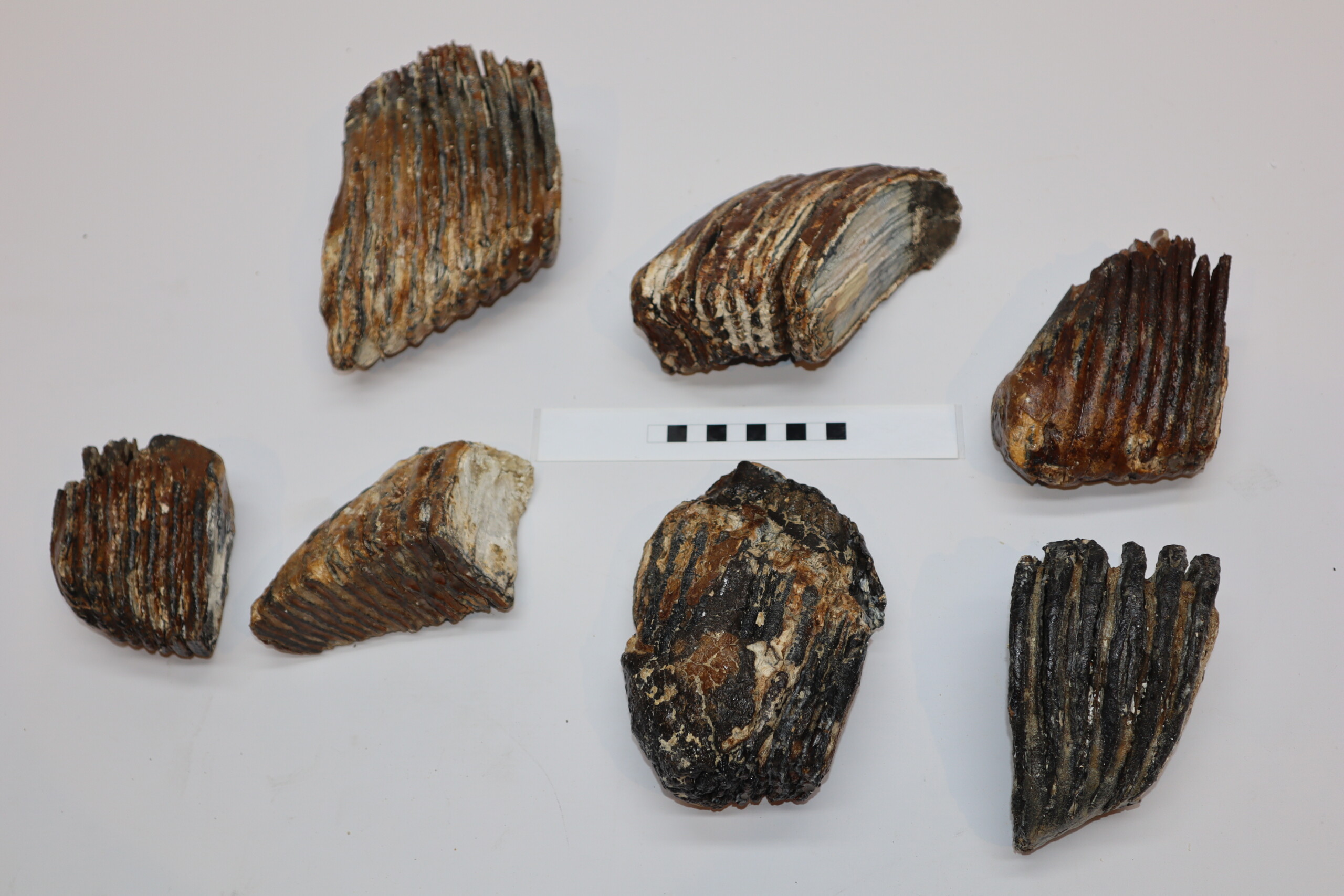 This collection contains seven good Woolly Mammmoth partial molars from the Pleistocene era. Ideal for reselling or the beginning collector. Incomplete partial molars, but still nice pieces, as seen in the images. No restoration whatsoever. The black-and-white section of the ruler in the images represents 10 cm / 3.9 inch.