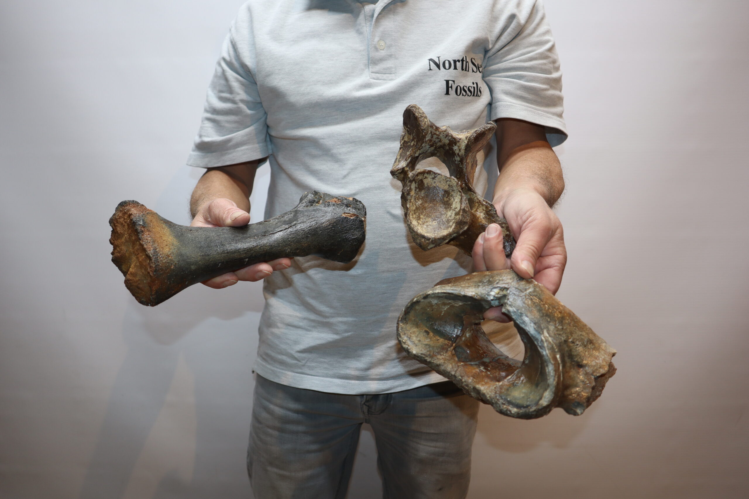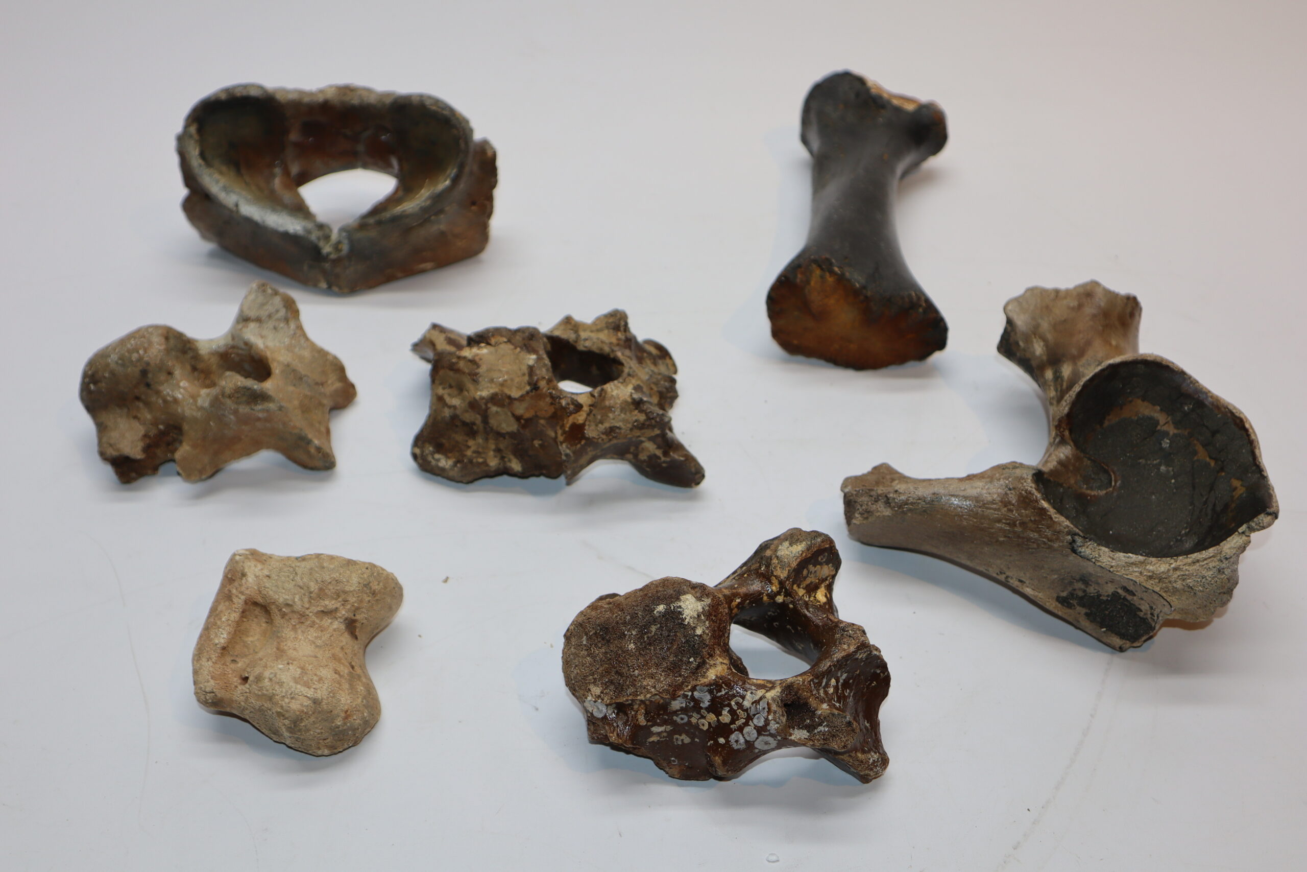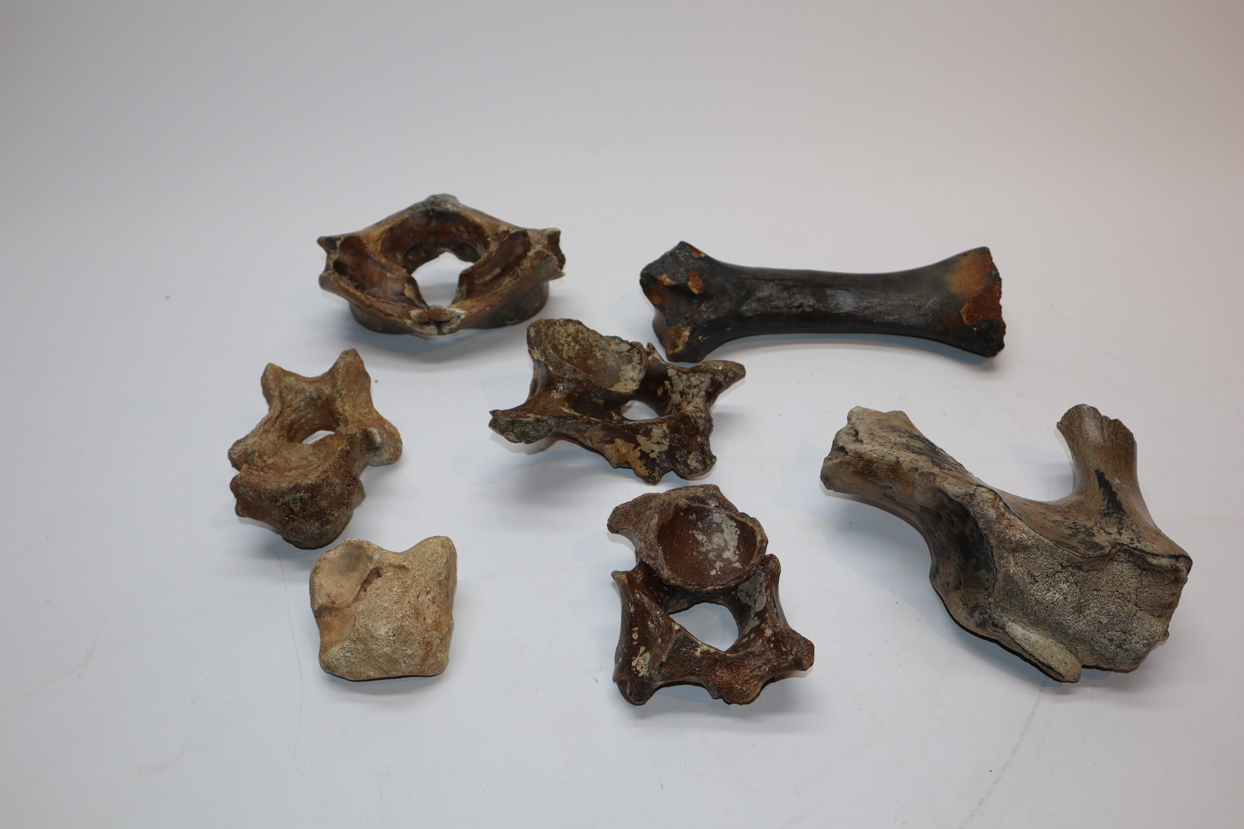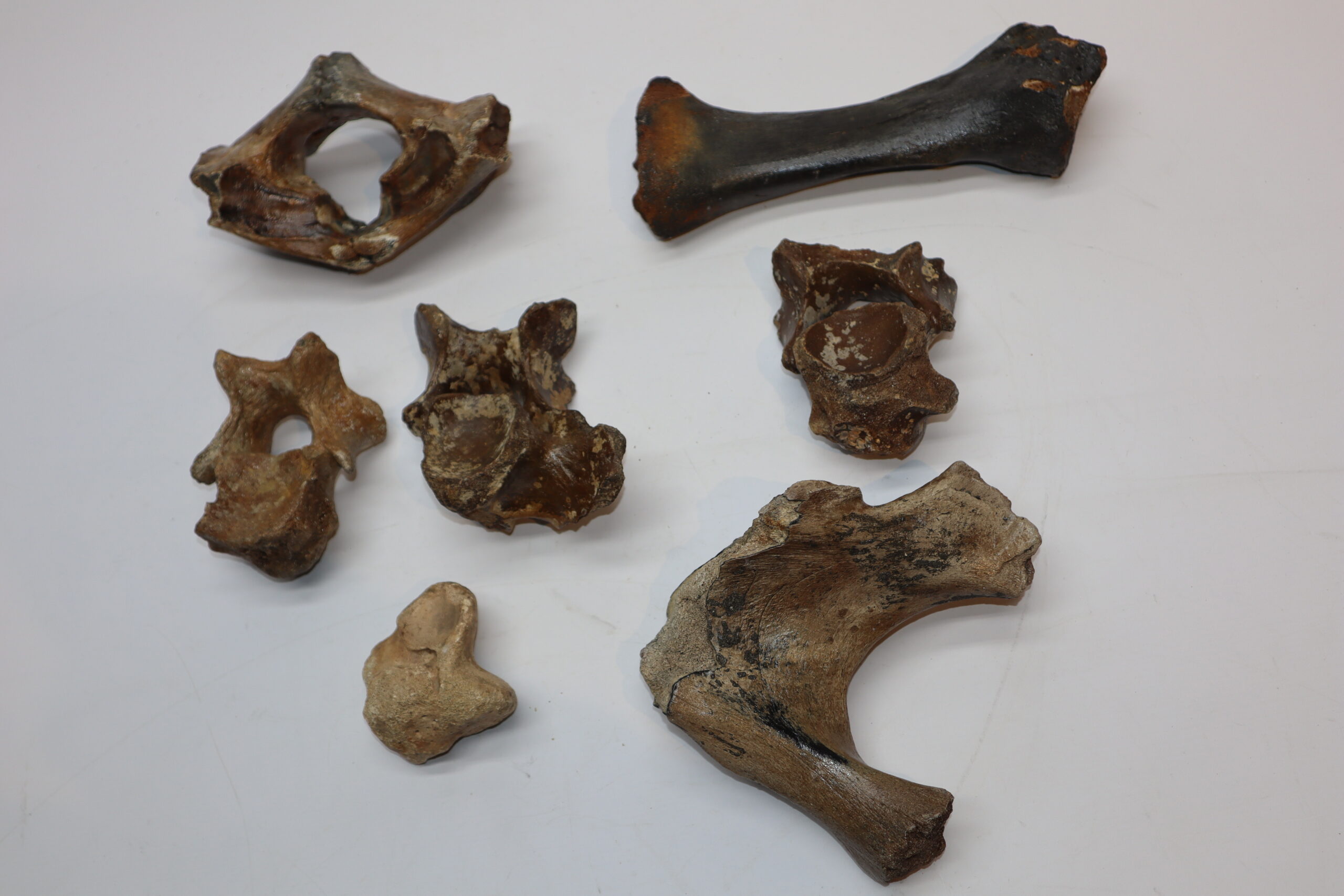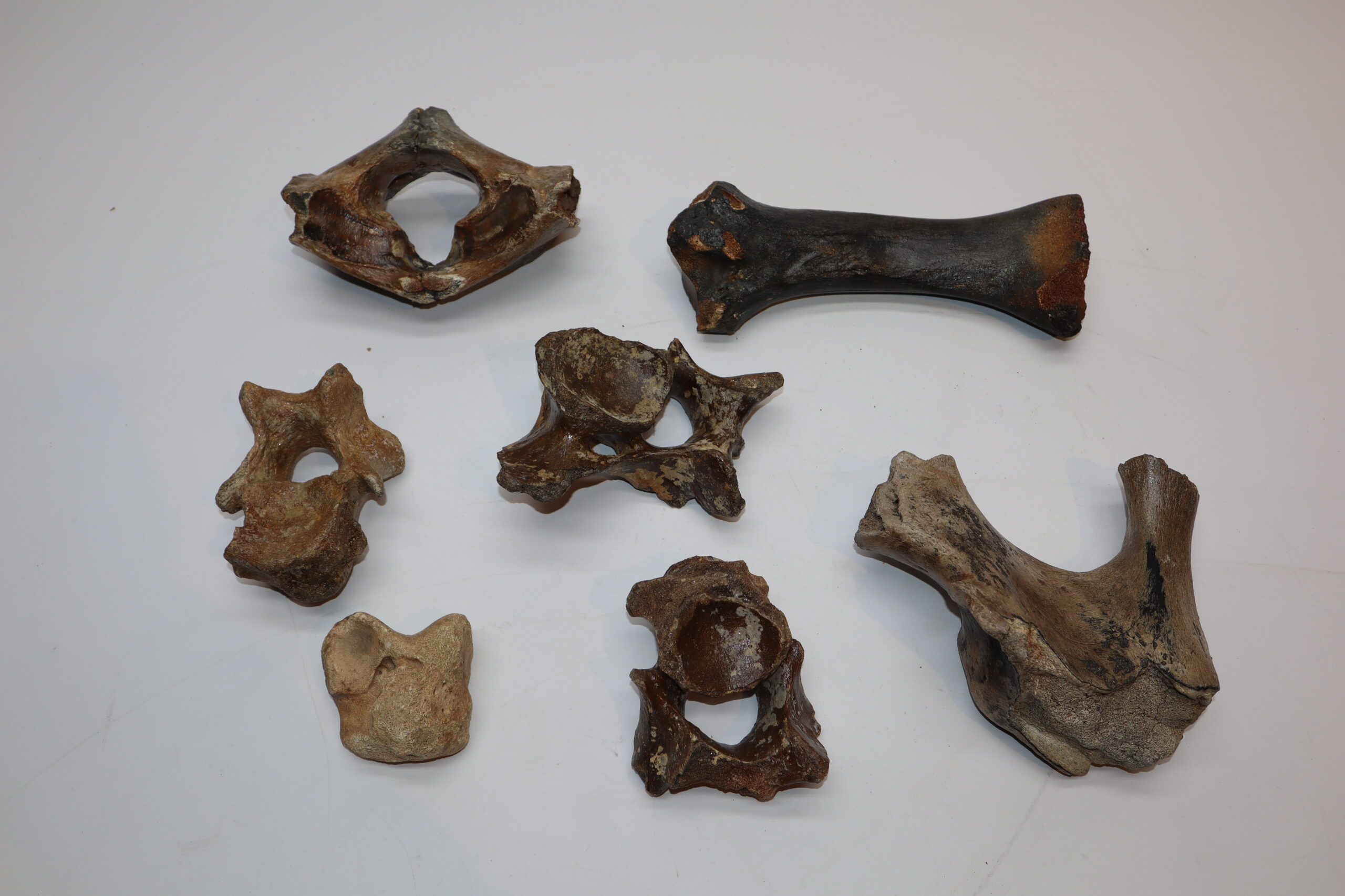 On offer is a bargain lot of seven partial Woolly Rhinoceros fossils from the Pleistocene era. These include four vertebrae, a radius, scapula and astragalus, all in partial but still interesting condition as shown in the images. No restoration whatsoever. Interesting lot for the beginning collector or for re-selling.