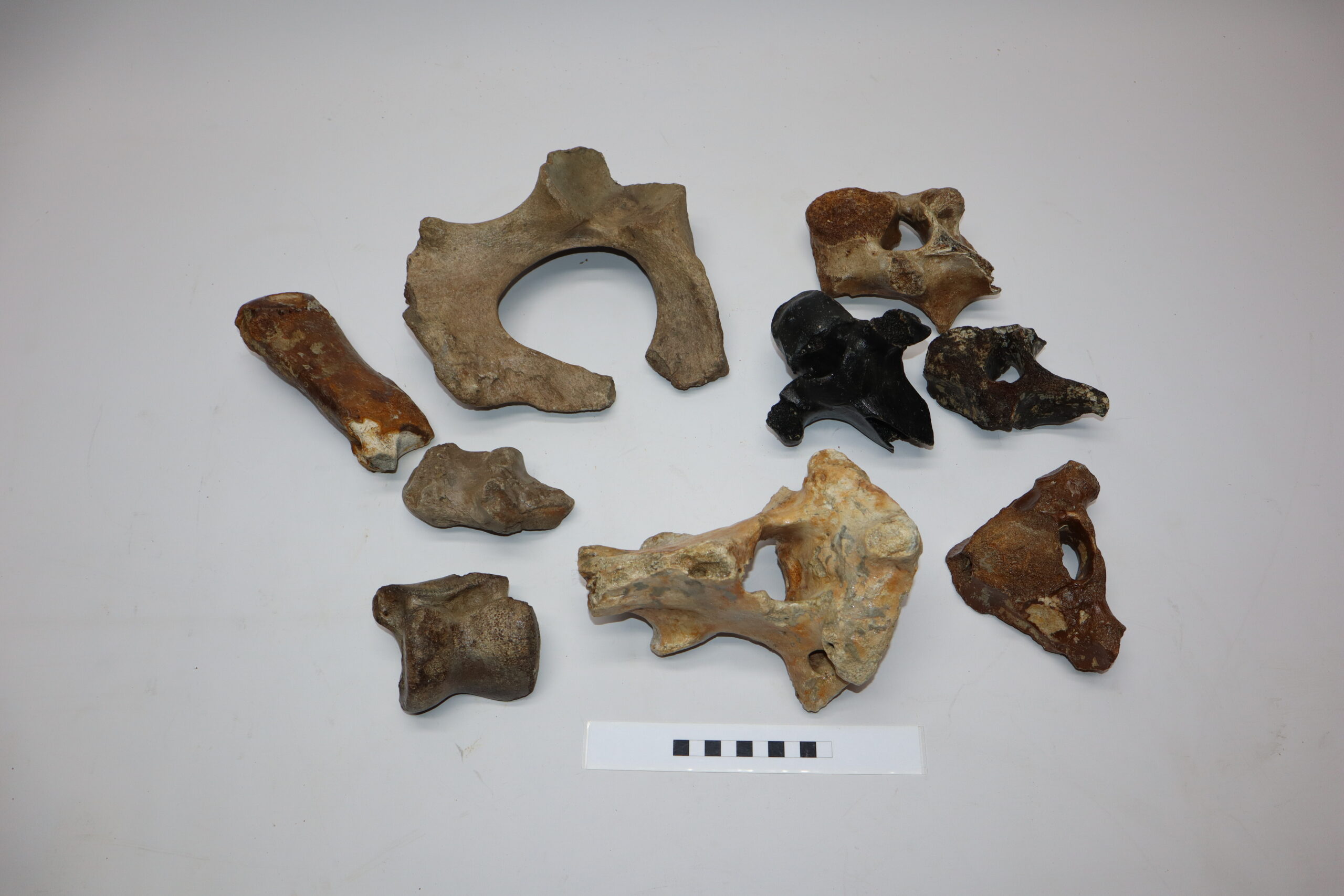 On offer is a bargain lot of nine partial Woolly Rhinoceros fossils from the Pleistocene era. These include five vertebrae, a calcaneum, an astrgalus, a pelvis and a footbone, all in partial but still interesting condition as shown in the images. No restoration whatsoever. Interesting lot for the beginning collector or for re-selling. The ruler shown in the image represents 10 cm / 3.9 in.