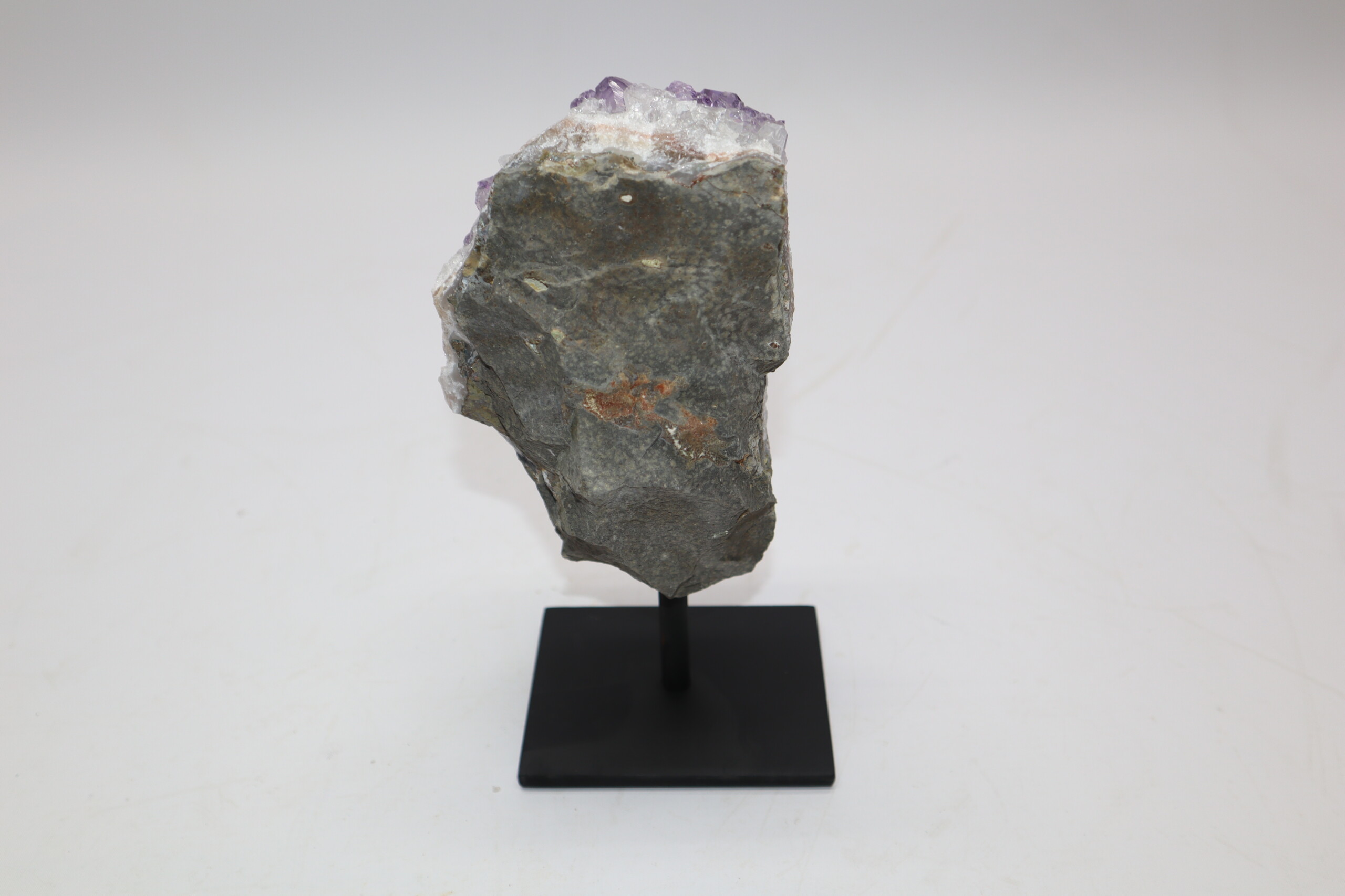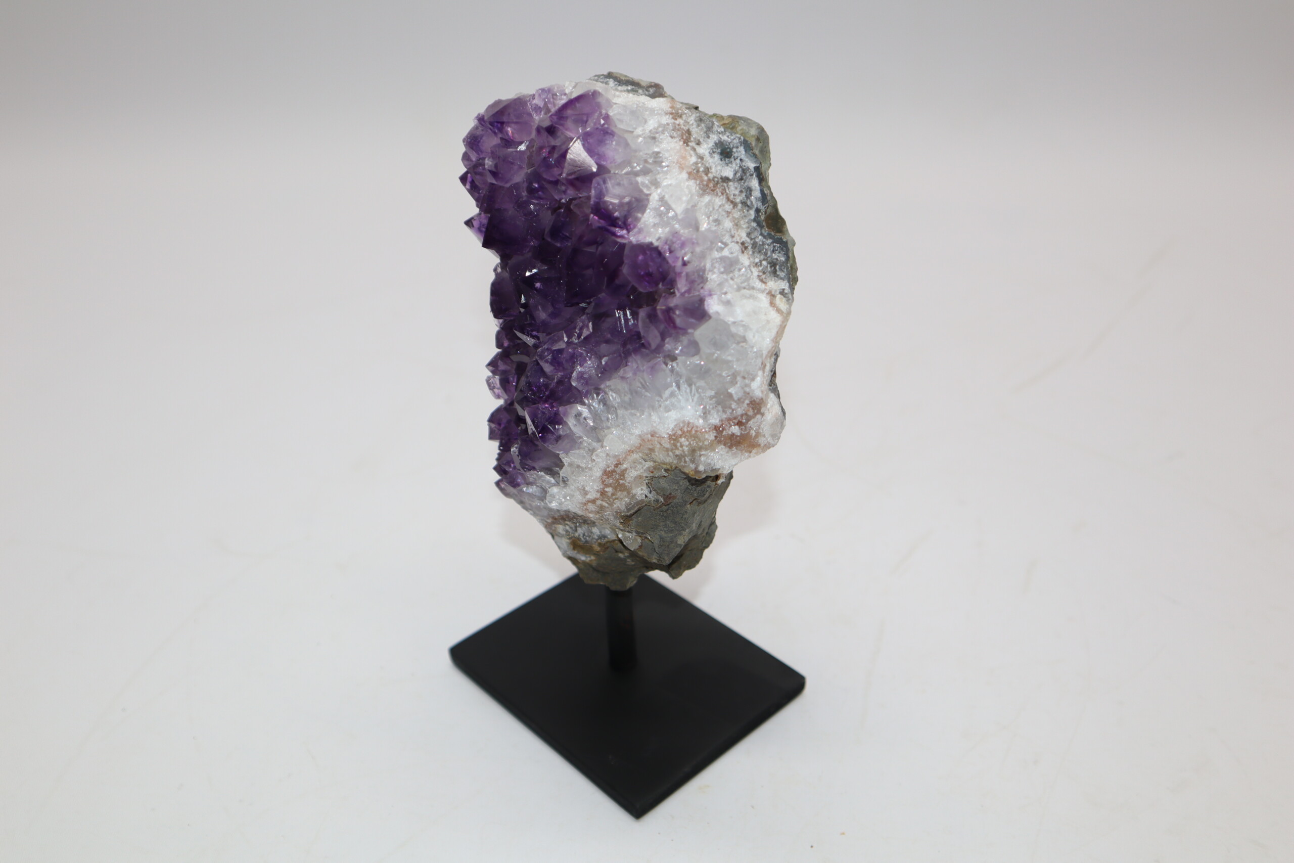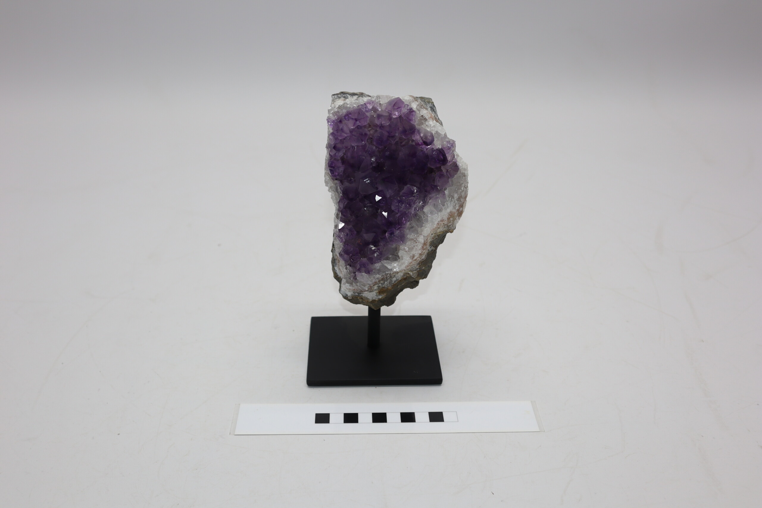 On offer is a piece of a gorgeous amethyist geode, revealing the dark purple cyristals of amethyst, a variety of quartz. A beautiful and interesting shape. The black-and-white section of the ruler in the image represents 10 cm / 3.9 inch.