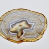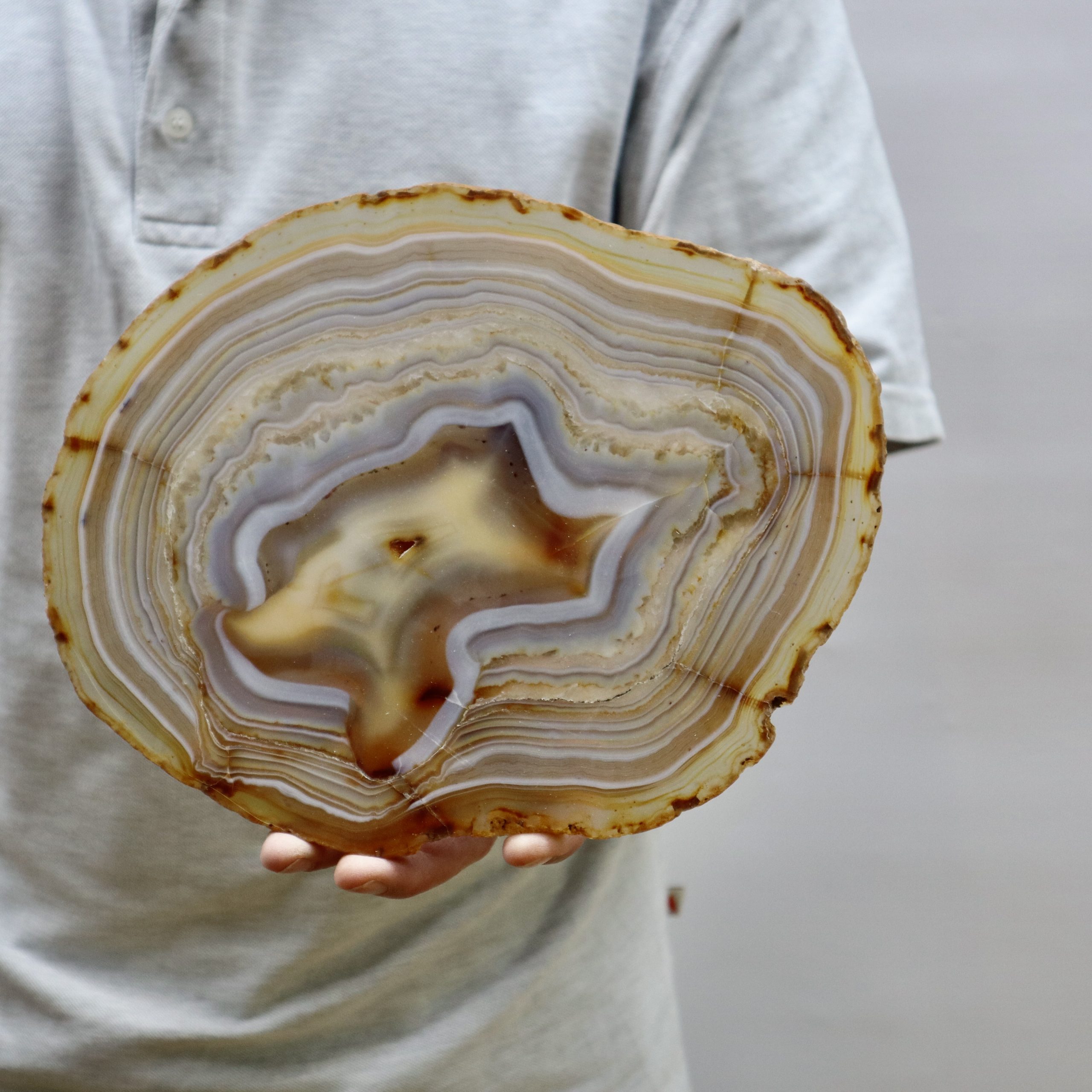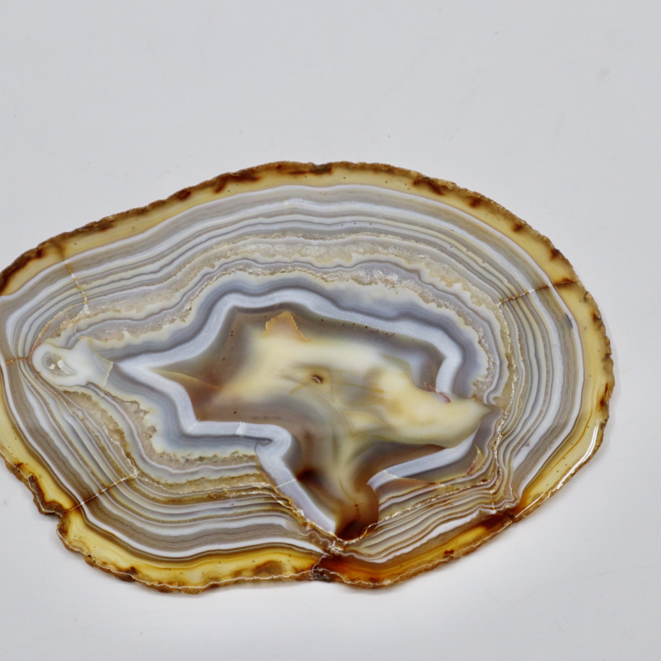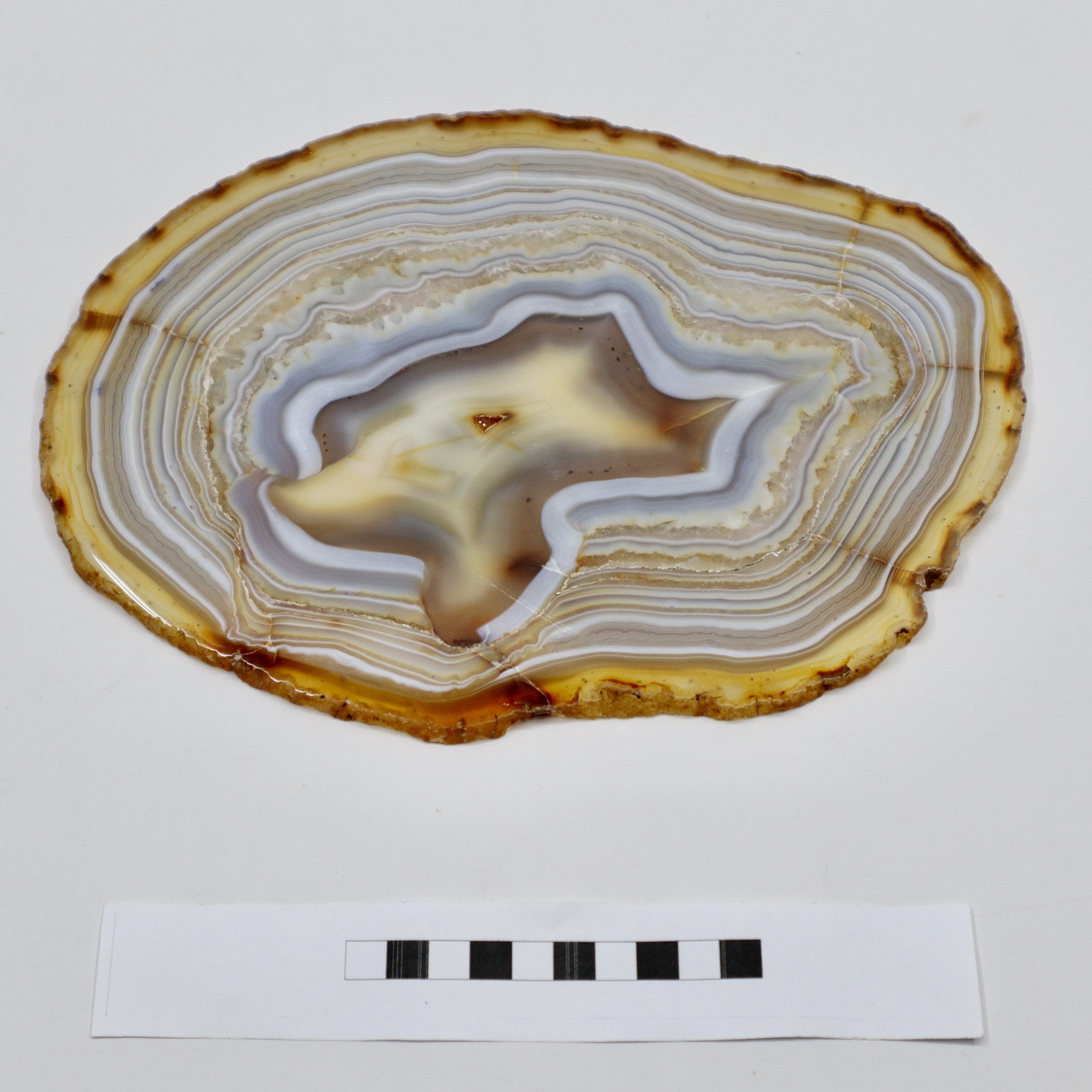 On offer is a beautiful and large slice of agate, of fantastic transparency and with good colours and patterning. Agate mostly consists of quartz and chalcedony and is primarily formed within volcanic rocks. The black-and-white section of the ruler in the image represents 10 cm / 3.9 inch.