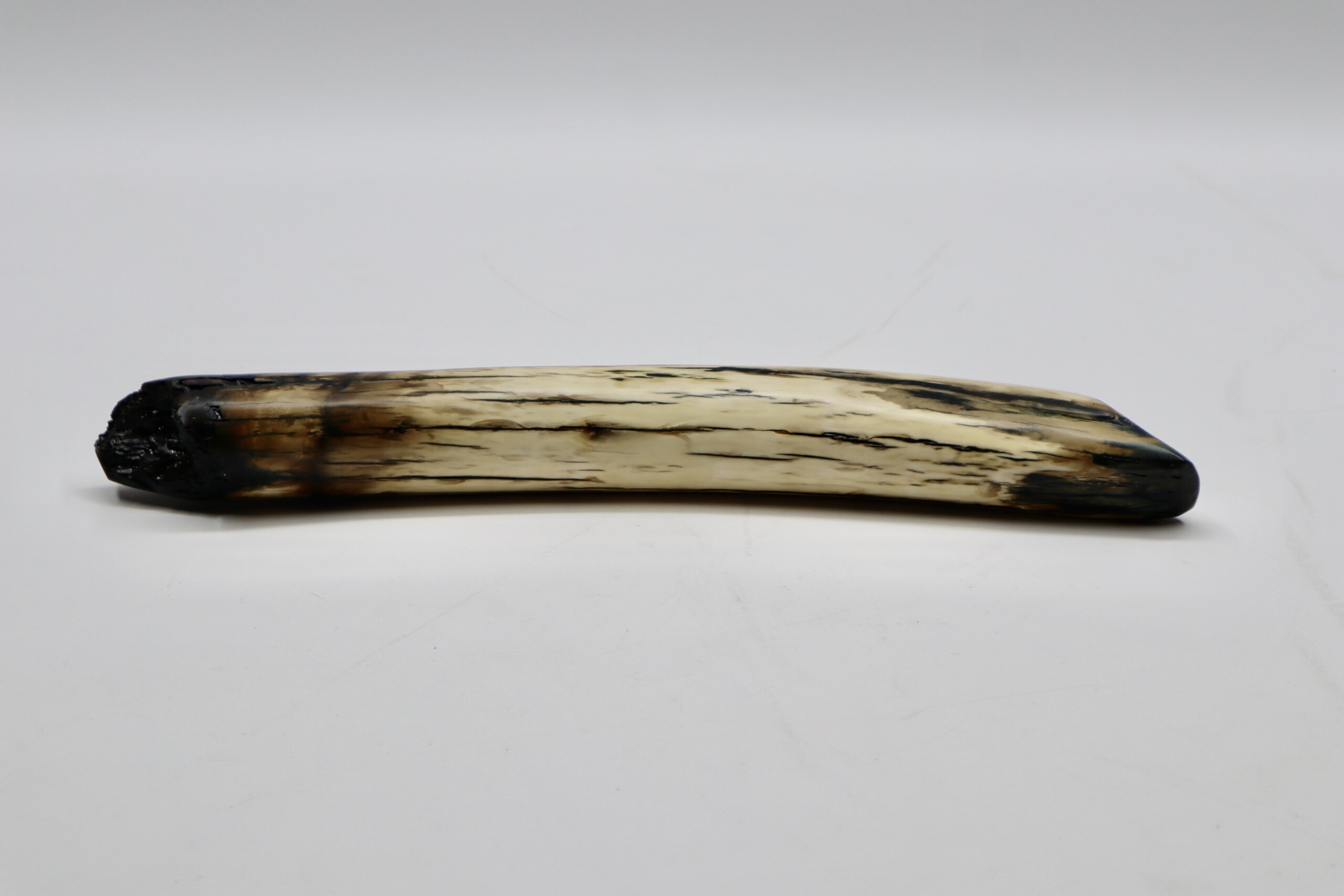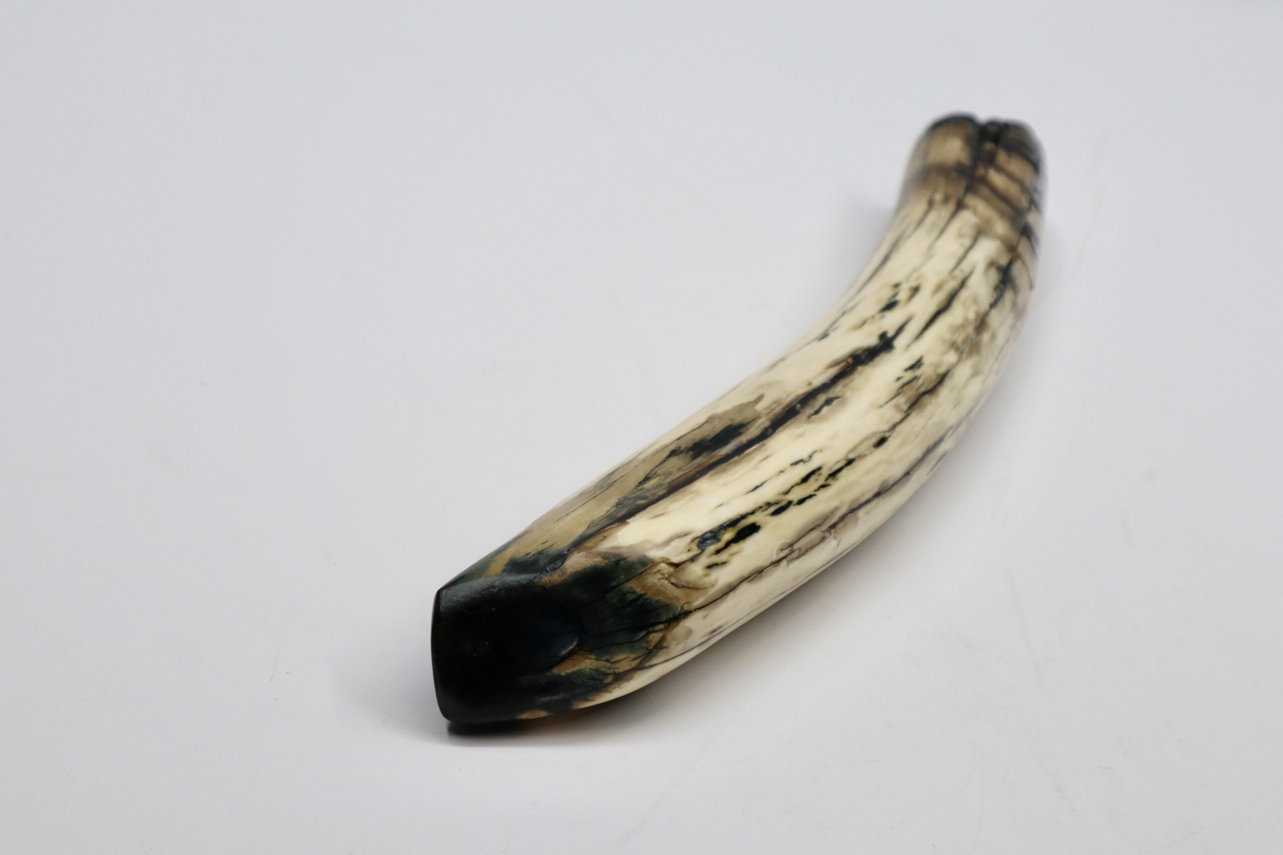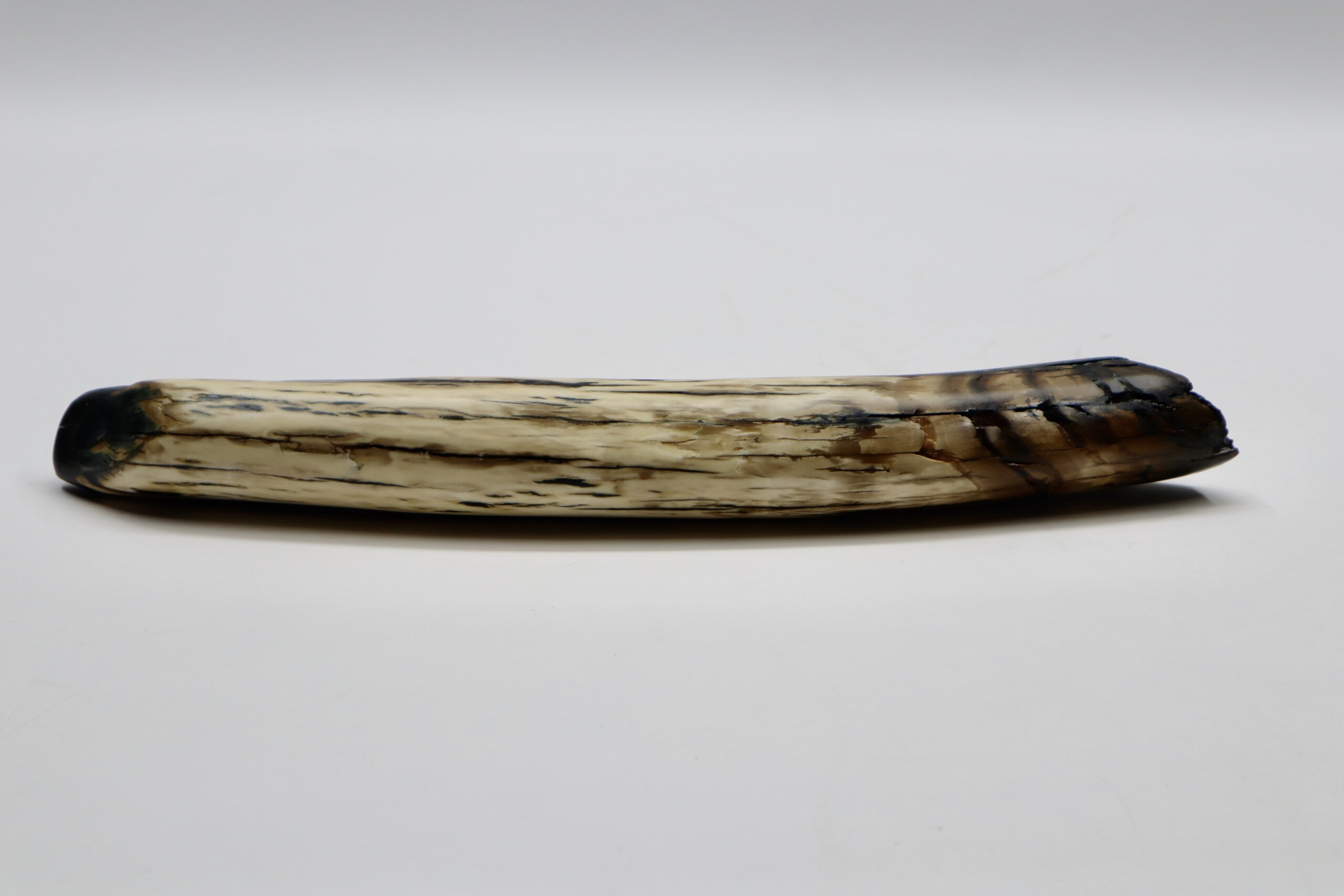 On offer is a beautiful base of a tusk of an adult Woolly Mammoth, in excellent condition. This is the tusk piece where it attached to the animal’s skull, hence the hollow part. This tusk base is of beautiful colouring of mainly white, black and brown ivory and with beautiful patterning. Judging from the circumference this would have belonged to an adult female Mammoth. A matt finish has been applied to this piece, but it is also possible to order it with a glossy finish.