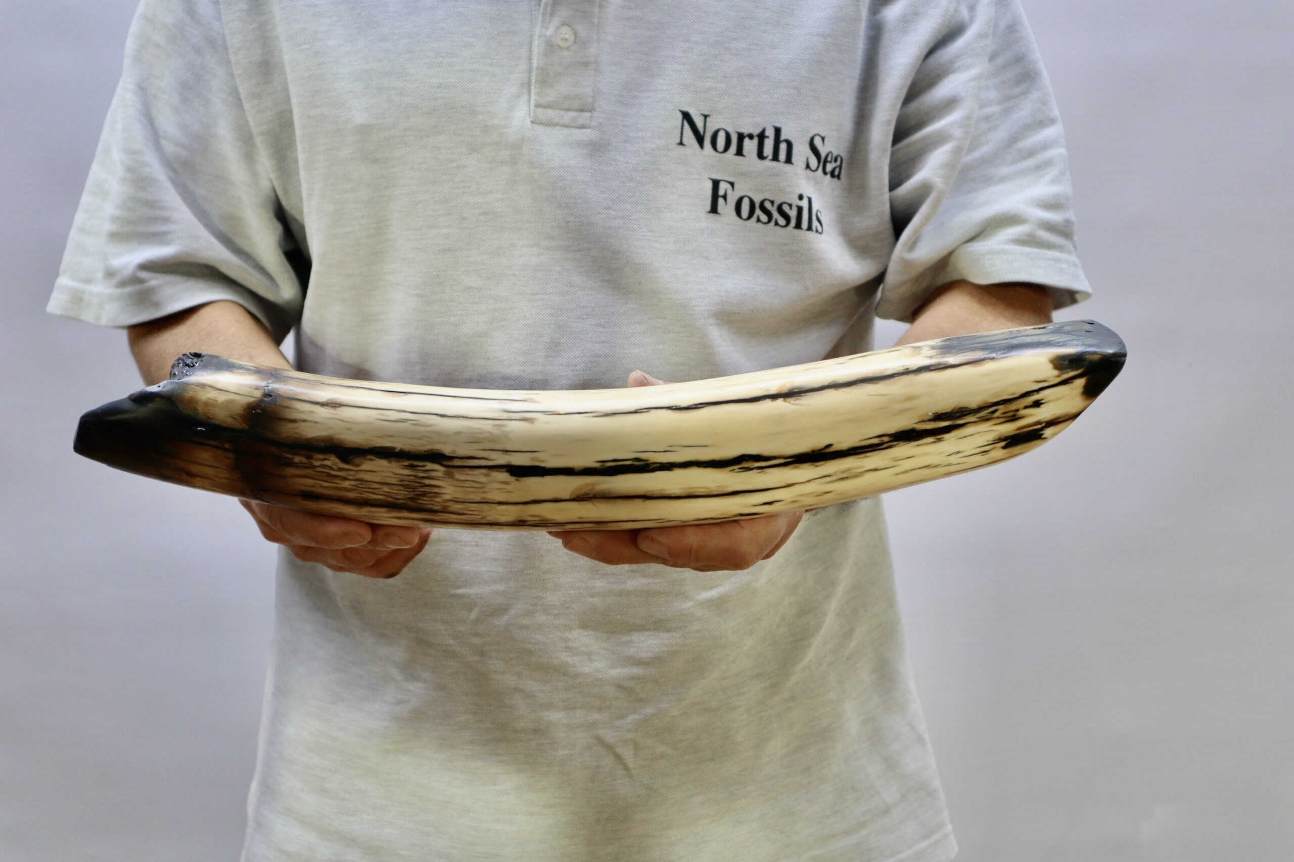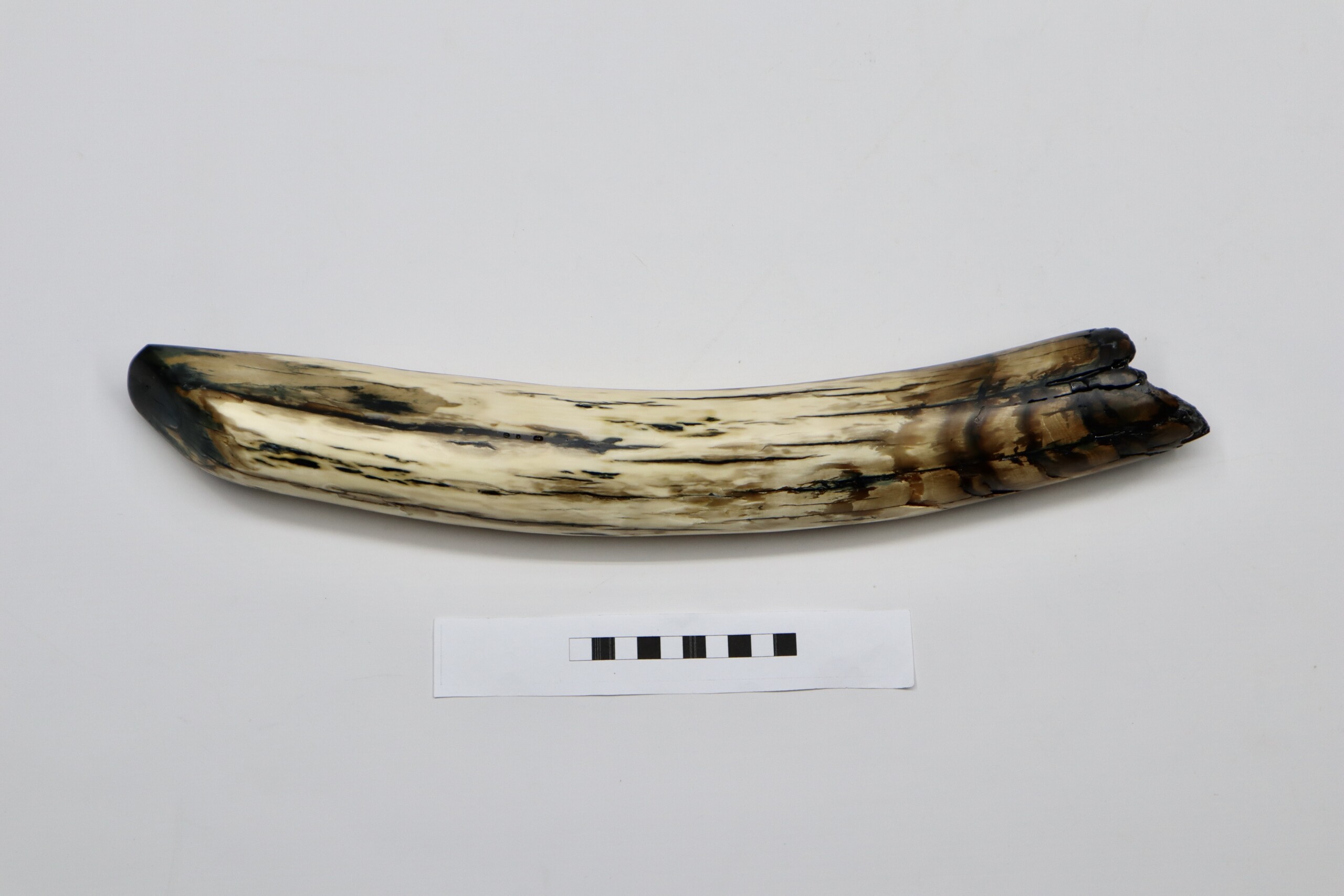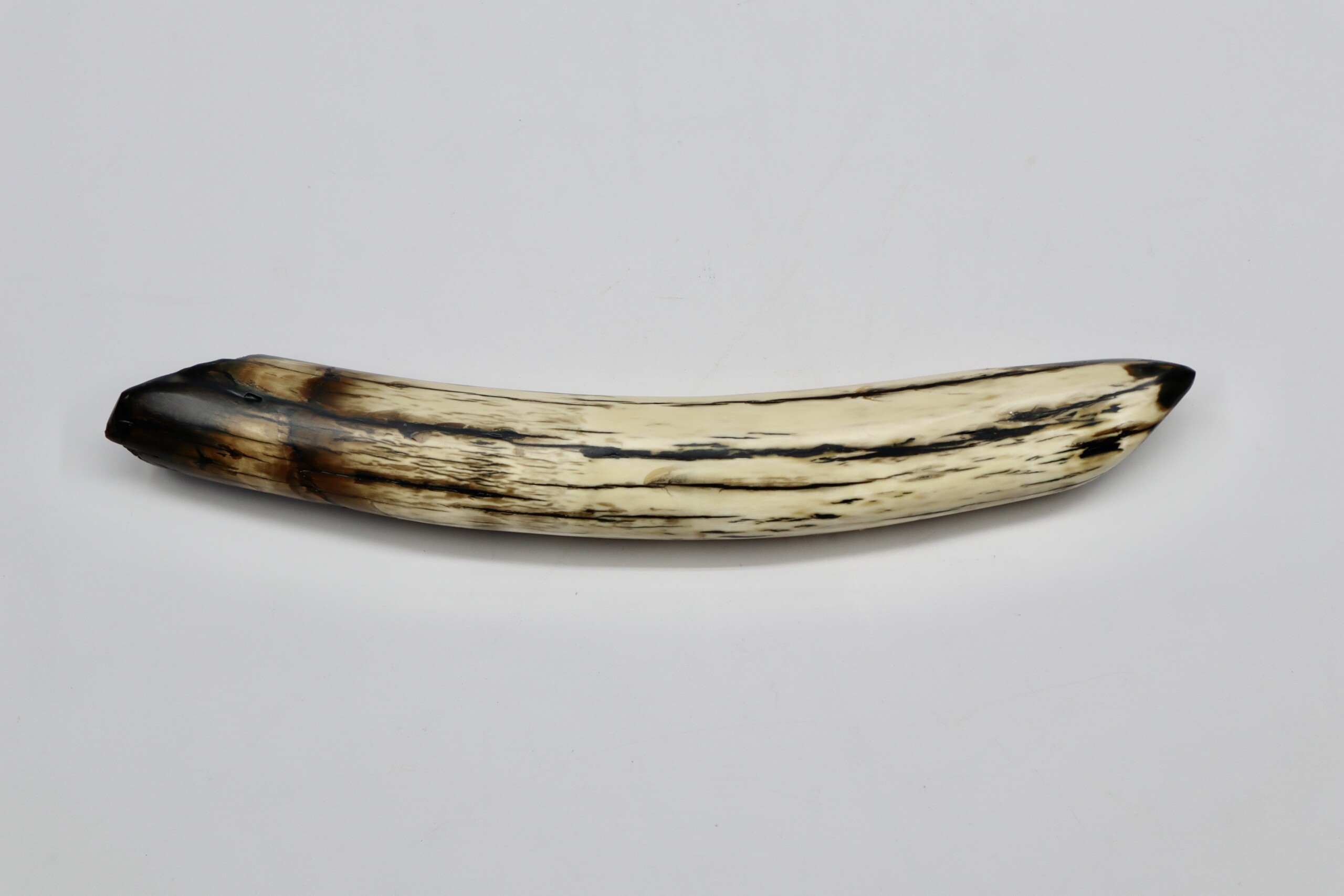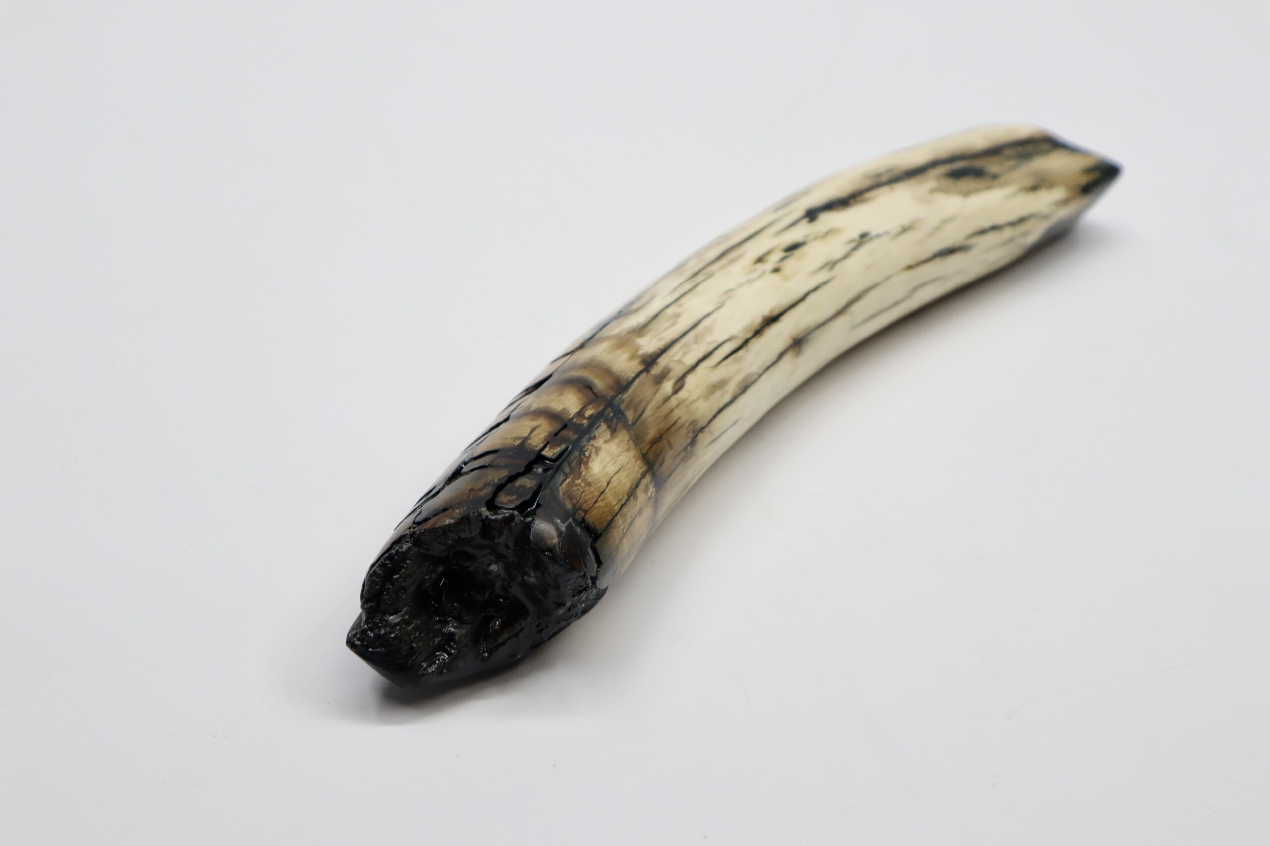 On offer is a beautiful base of a tusk of an adult Woolly Mammoth, in excellent condition. This is the tusk piece where it attached to the animal’s skull, hence the hollow part. This tusk base is of beautiful colouring of mainly white, black and brown ivory and with beautiful patterning. Judging from the circumference this would have belonged to an adult female Mammoth. A matt finish has been applied to this piece, but it is also possible to order it with a glossy finish.