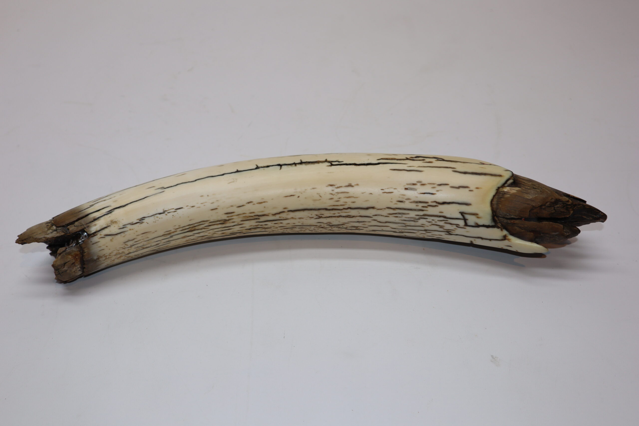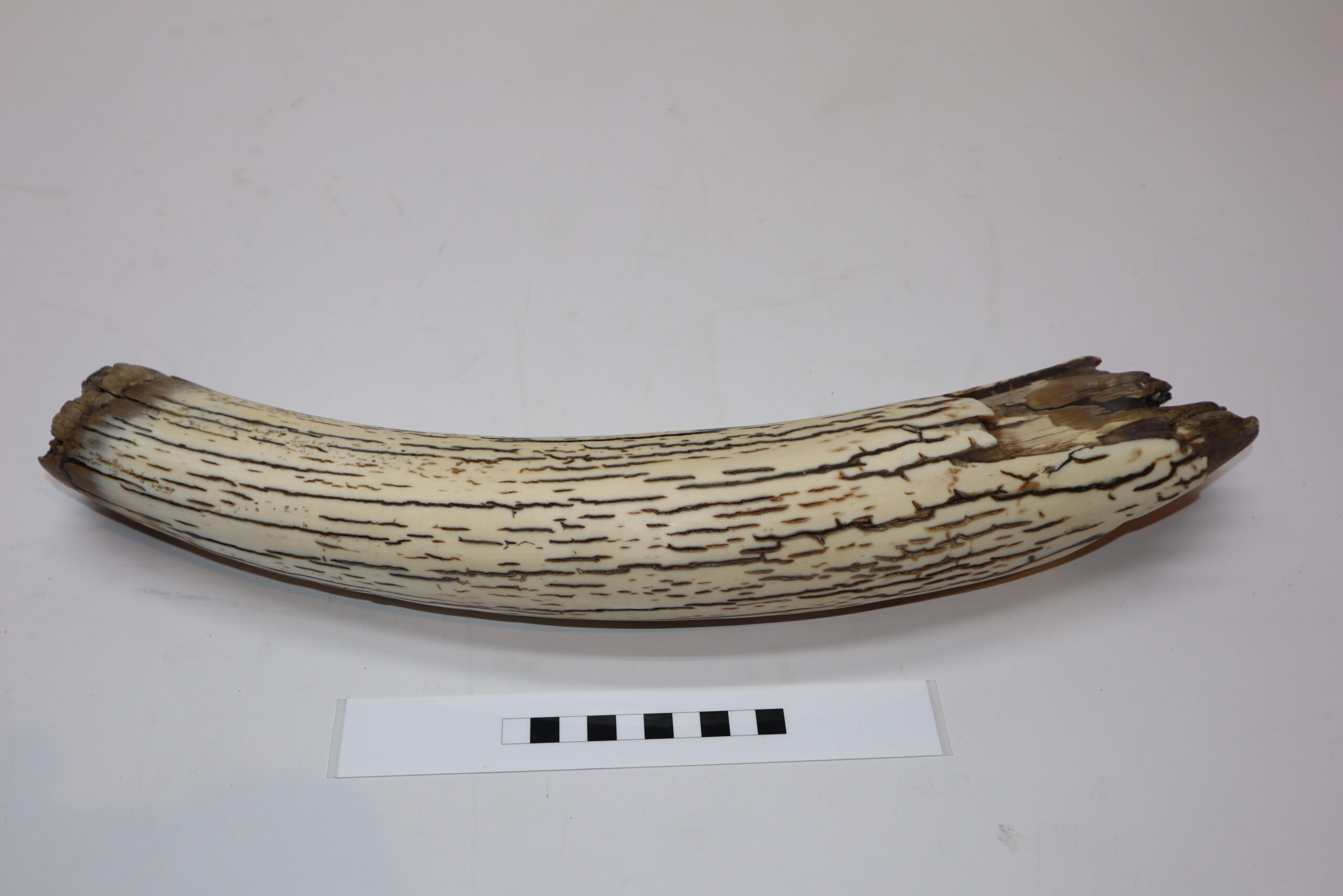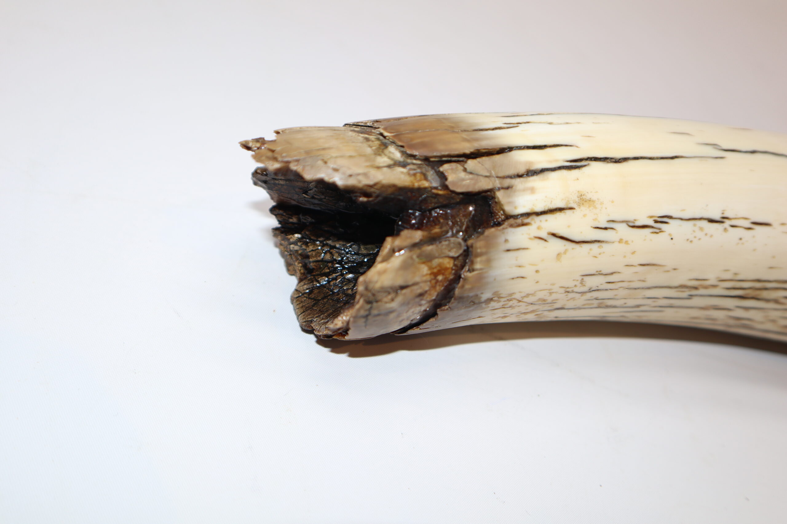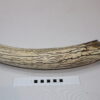 On offer is a beautiful base of a tusk of an adult Woolly Mammoth, in excellent condition. This is the tusk piece where it attached to the animal’s skull, hence the hollow part. This tusk base is of beautiful colouring of mainly white and black ivory and with beautiful patterning. Judging from the circumference this would have belonged to a female Mammoth. A matt finish has been applied to this piece, but it is also possible to order it with a glossy finish. The black-and-white section of the ruler in the image represents 10 cm / 3.9 inch.