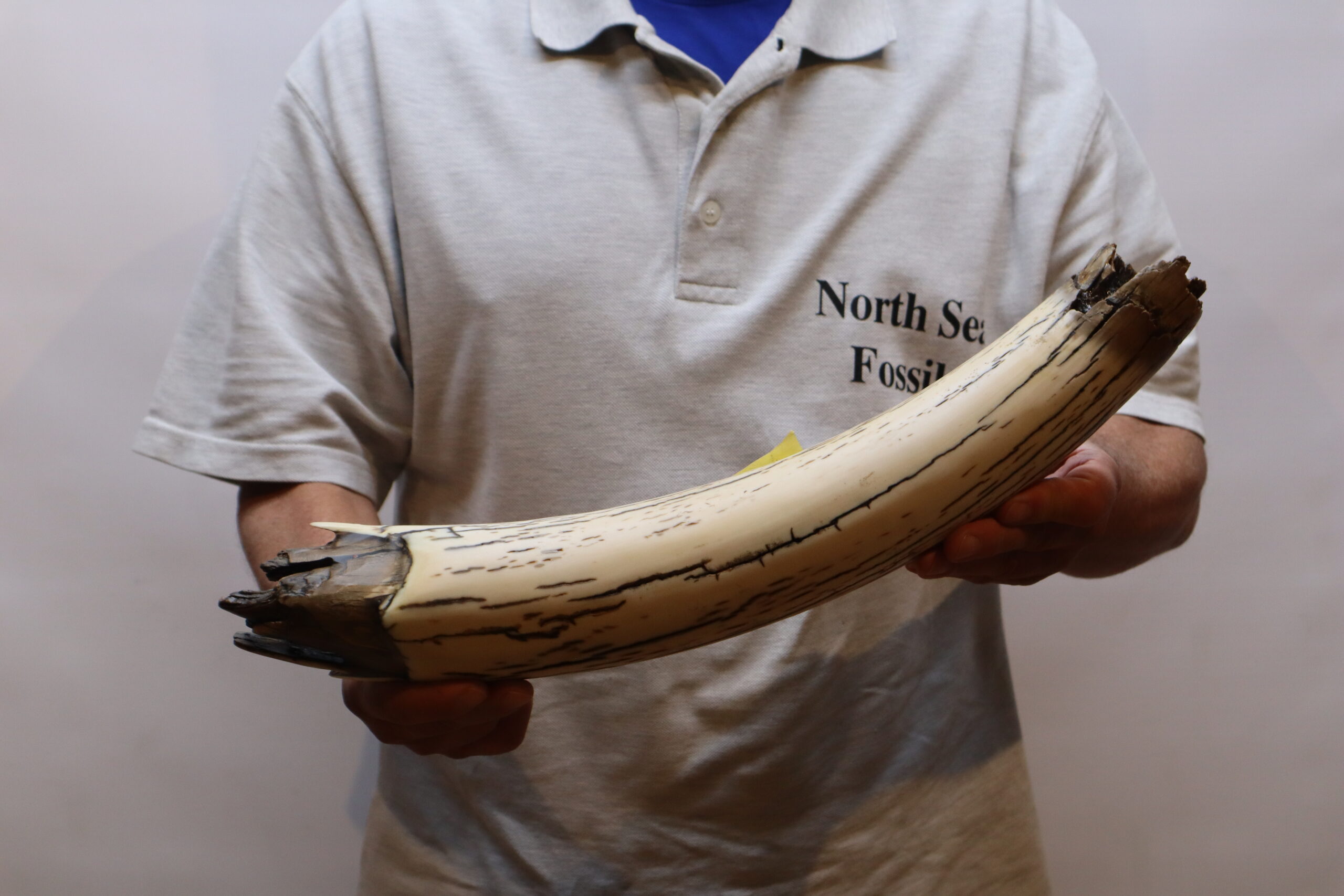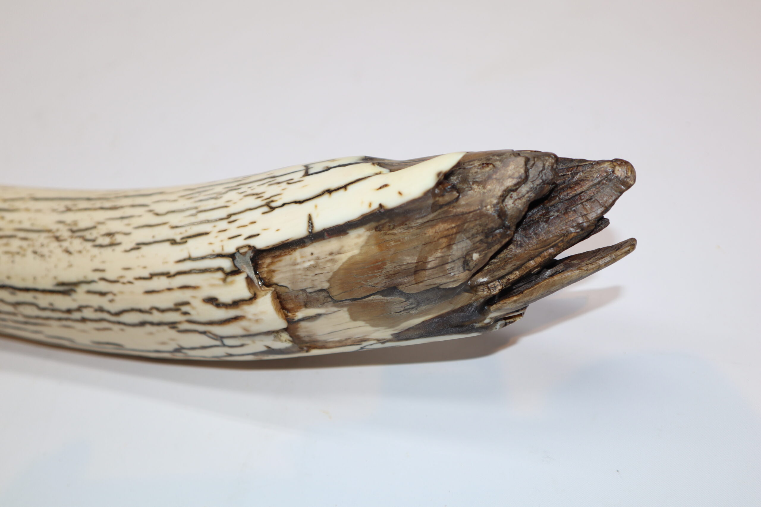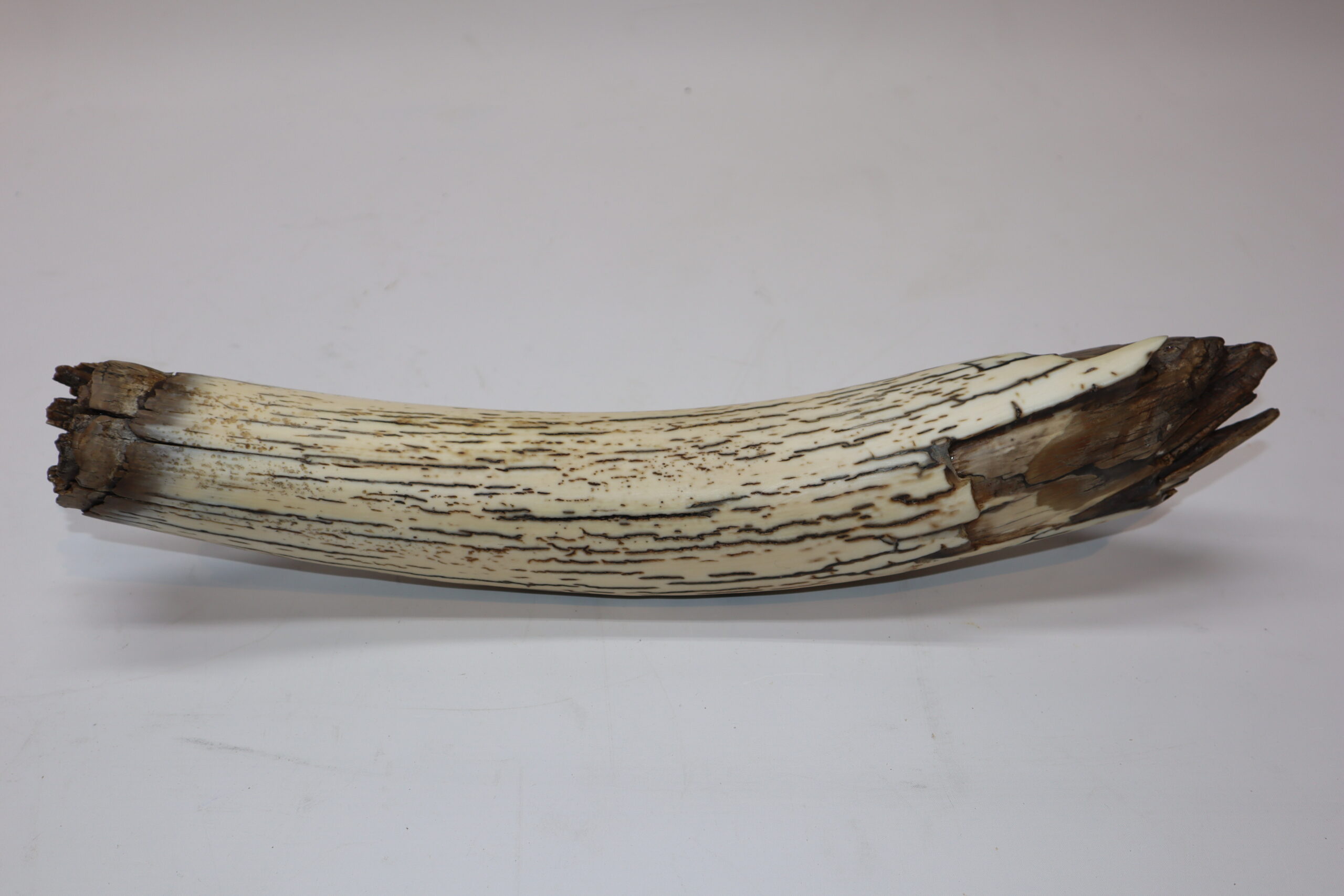 On offer is a beautiful base of a tusk of an adult Woolly Mammoth, in excellent condition. This is the tusk piece where it attached to the animal’s skull, hence the hollow part. This tusk base is of beautiful colouring of mainly white and black ivory and with beautiful patterning. Judging from the circumference this would have belonged to a female Mammoth. A matt finish has been applied to this piece, but it is also possible to order it with a glossy finish. The black-and-white section of the ruler in the image represents 10 cm / 3.9 inch.