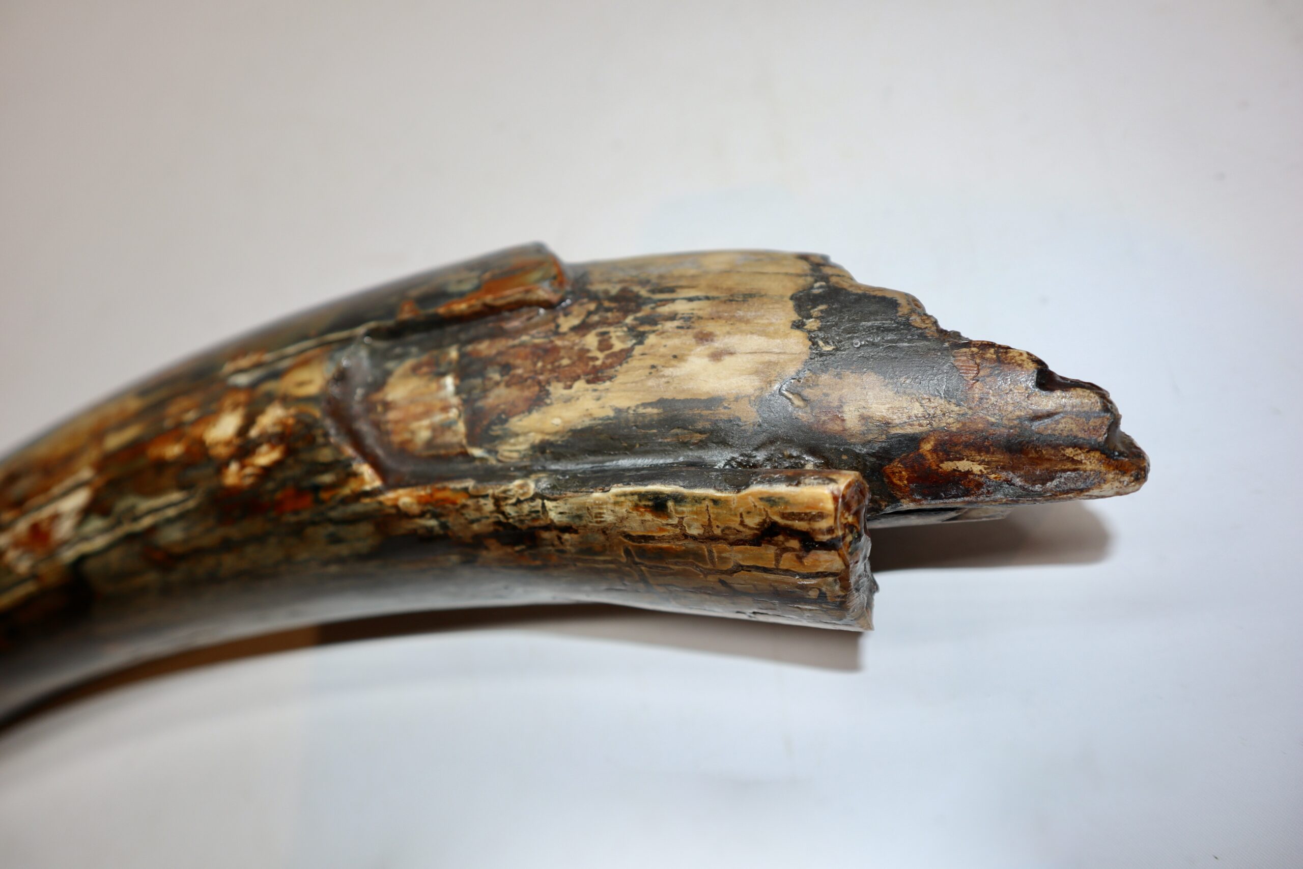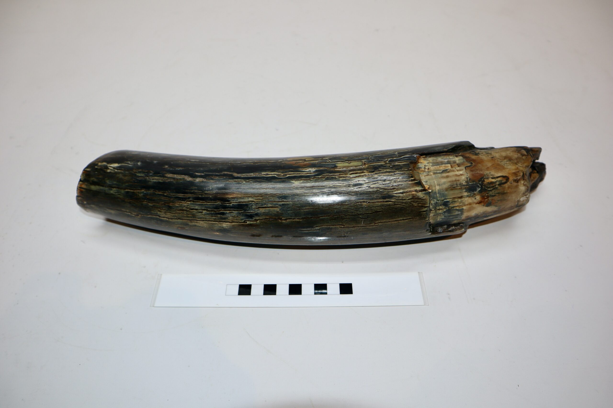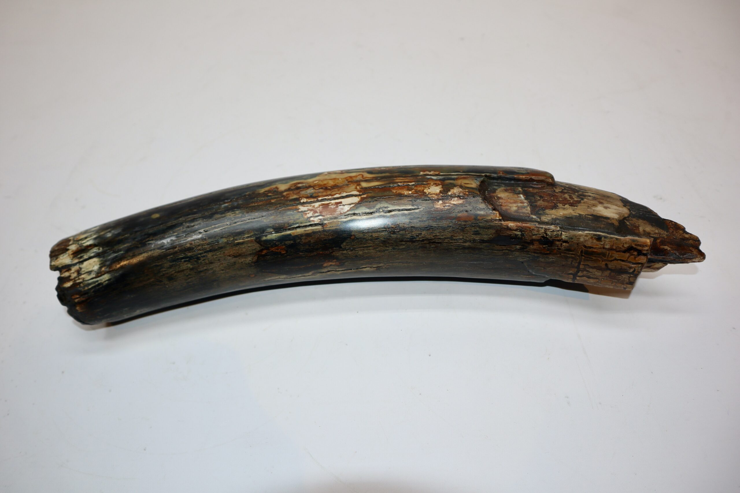 On offer is a beautiful base of a tusk of an adult Woolly Mammoth, in excellent condition. This is the tusk piece where it attached to the animal’s skull, hence the hollow part. This tusk base is of beautiful colouring of mainly white, gold, brown and black ivory and with stunning patterning. Judging from the circumference this would have belonged to a female Mammoth. A matt finish has been applied to this piece, but it is also possible to order it with a glossy finish. The black-and-white section of the ruler in the image represents 10 cm / 3.9 inch.