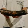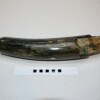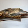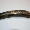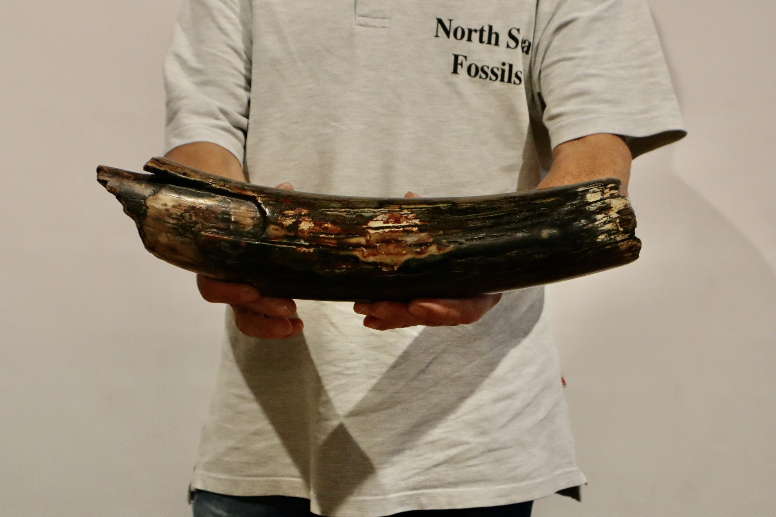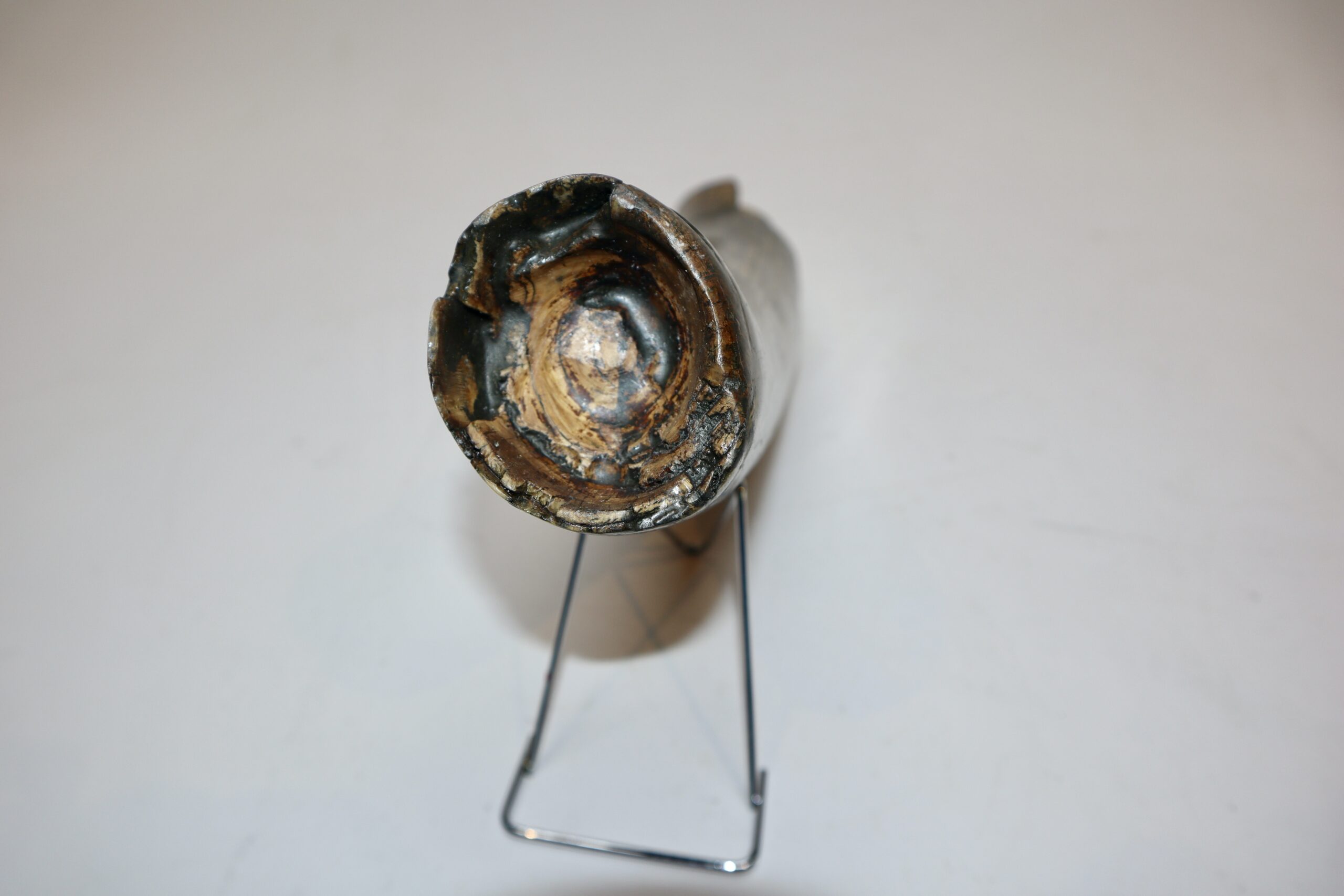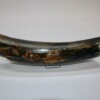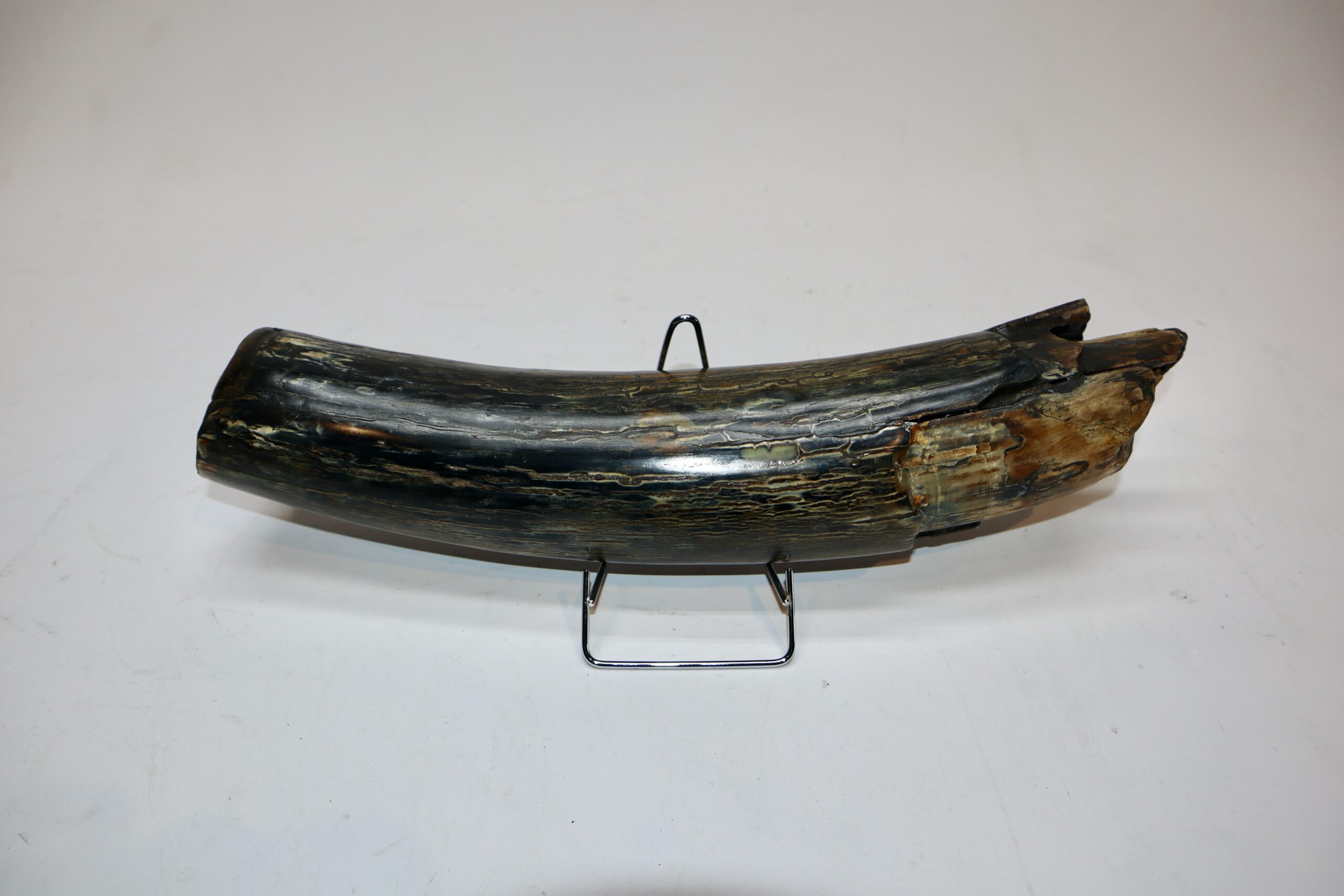 On offer is a beautiful base of a tusk of an adult Woolly Mammoth, in excellent condition. This is the tusk piece where it attached to the animal’s skull, hence the hollow part. This tusk base is of beautiful colouring of mainly white, gold, brown and black ivory and with stunning patterning. Judging from the circumference this would have belonged to a female Mammoth. A matt finish has been applied to this piece, but it is also possible to order it with a glossy finish. The black-and-white section of the ruler in the image represents 10 cm / 3.9 inch.