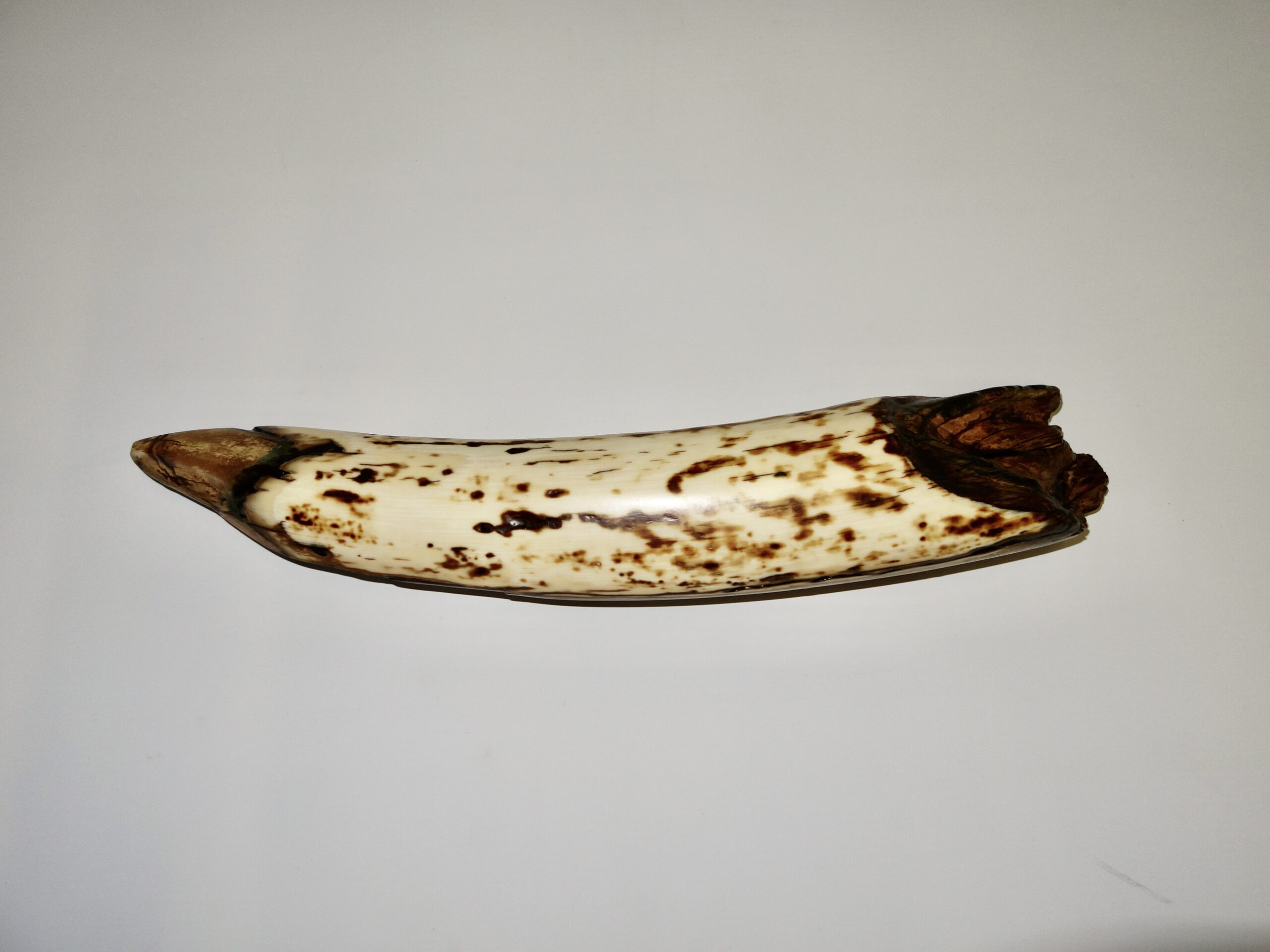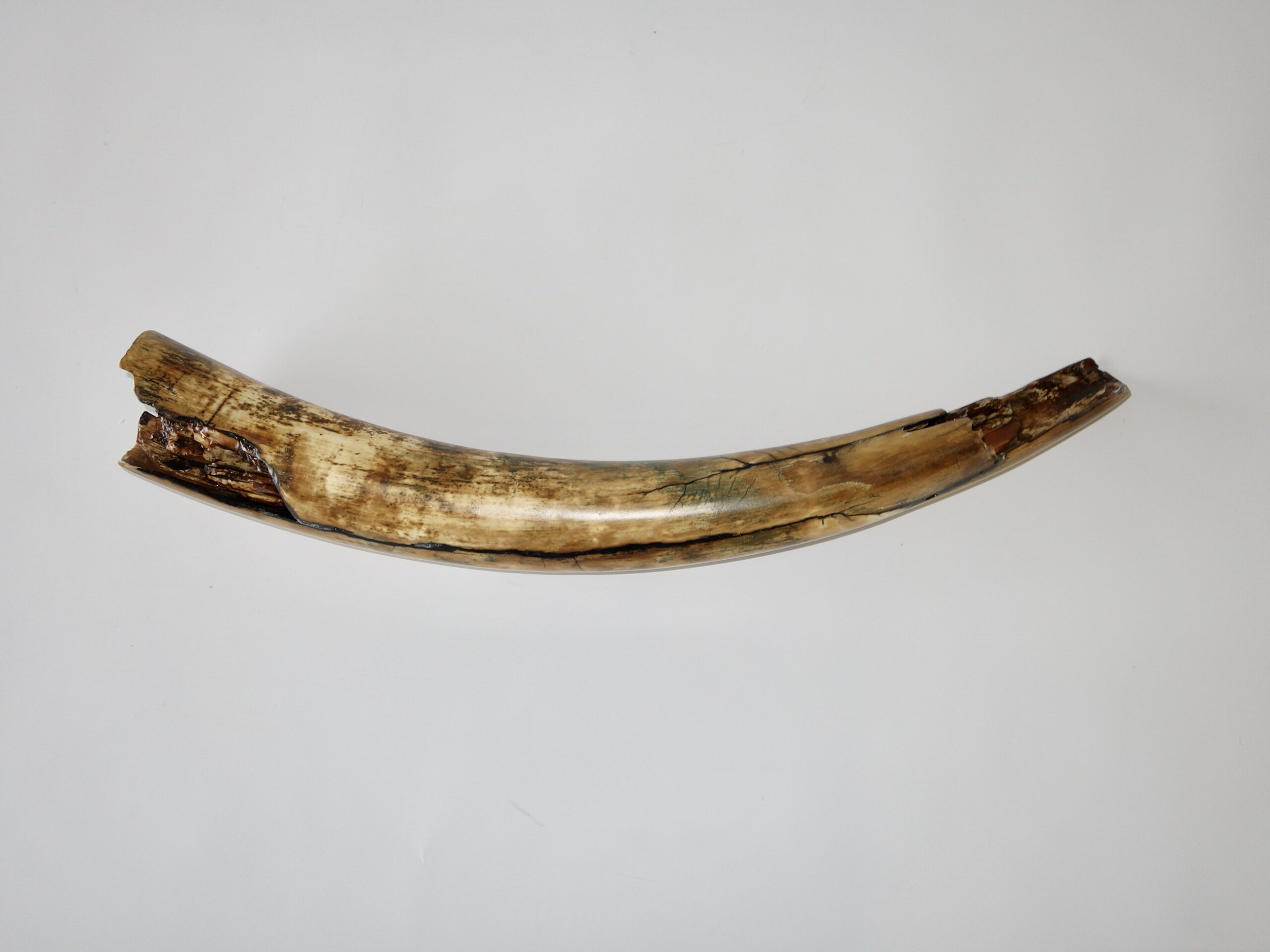 On offer is a beautiful base of a tusk of an adult Woolly Mammoth, in excellent condition. This is the tusk piece where it attached to the animal’s skull, hence the hollow part. This tusk base is of beautiful colouring of mainly white, gold, brown and black ivory and with stunning patterning. Judging from the circumference this would have belonged to a female Mammoth. A matt finish has been applied to this piece, but it is also possible to order it with a glossy finish. The black-and-white section of the ruler in the image represents 10 cm / 3.9 inch.