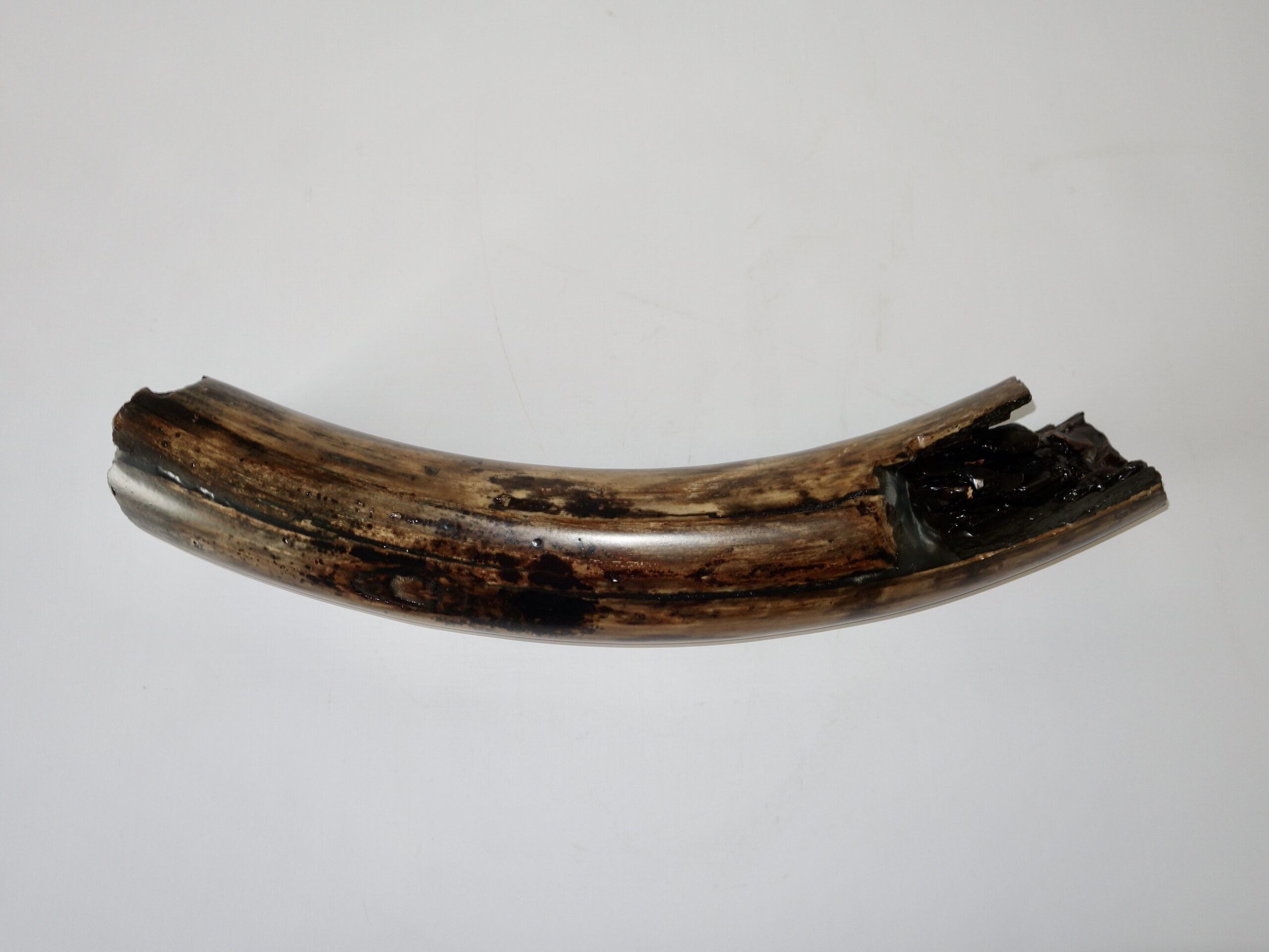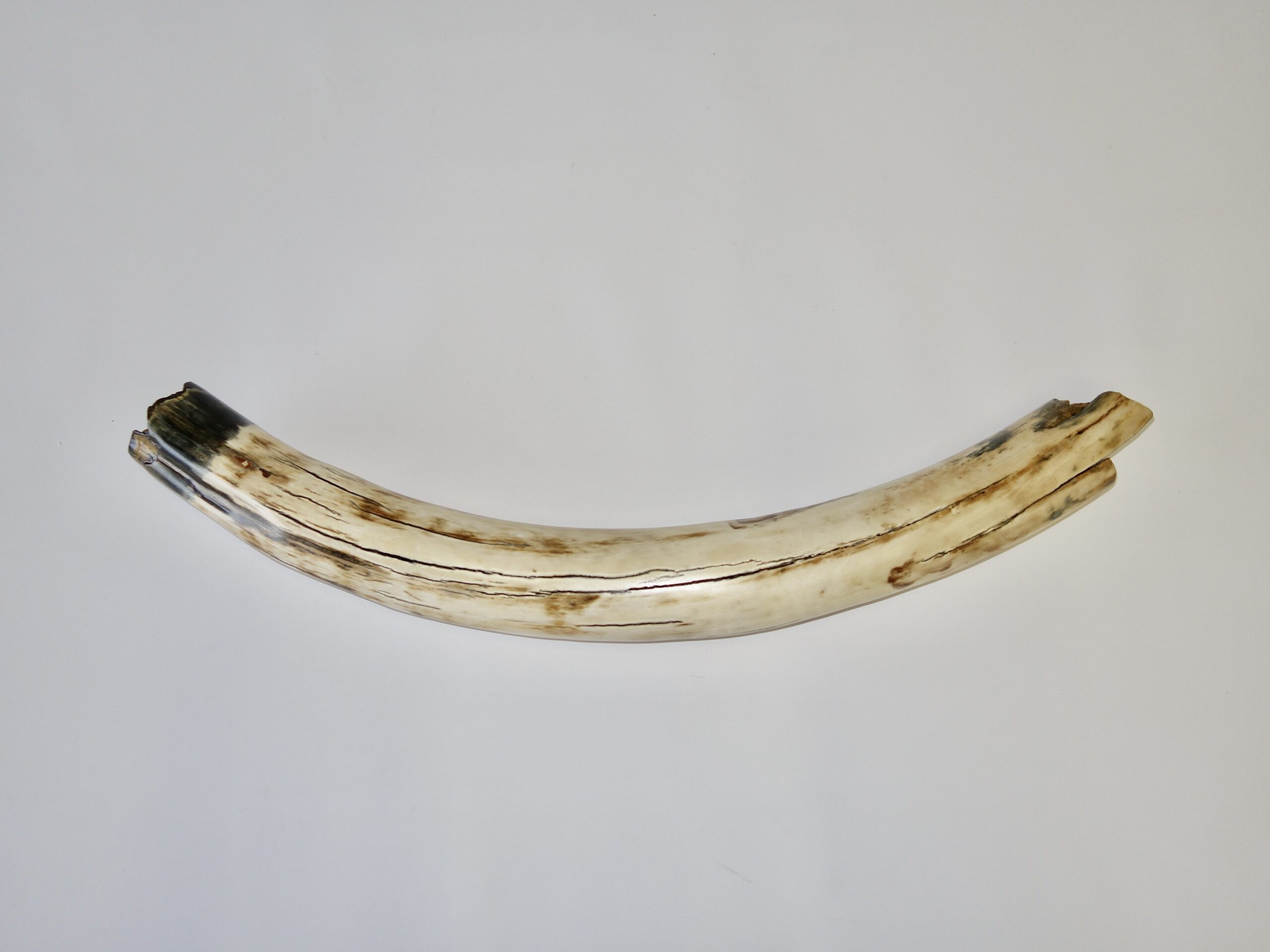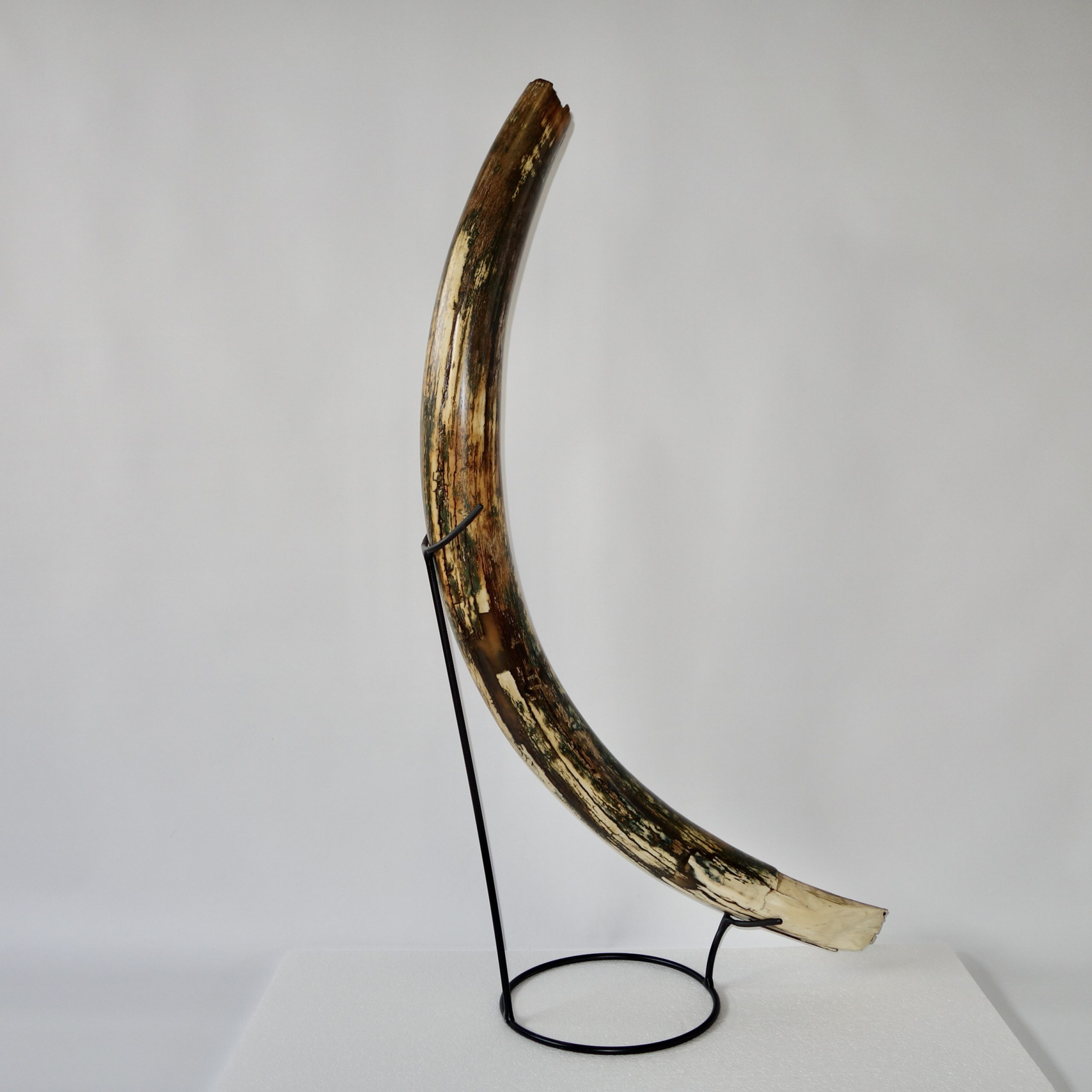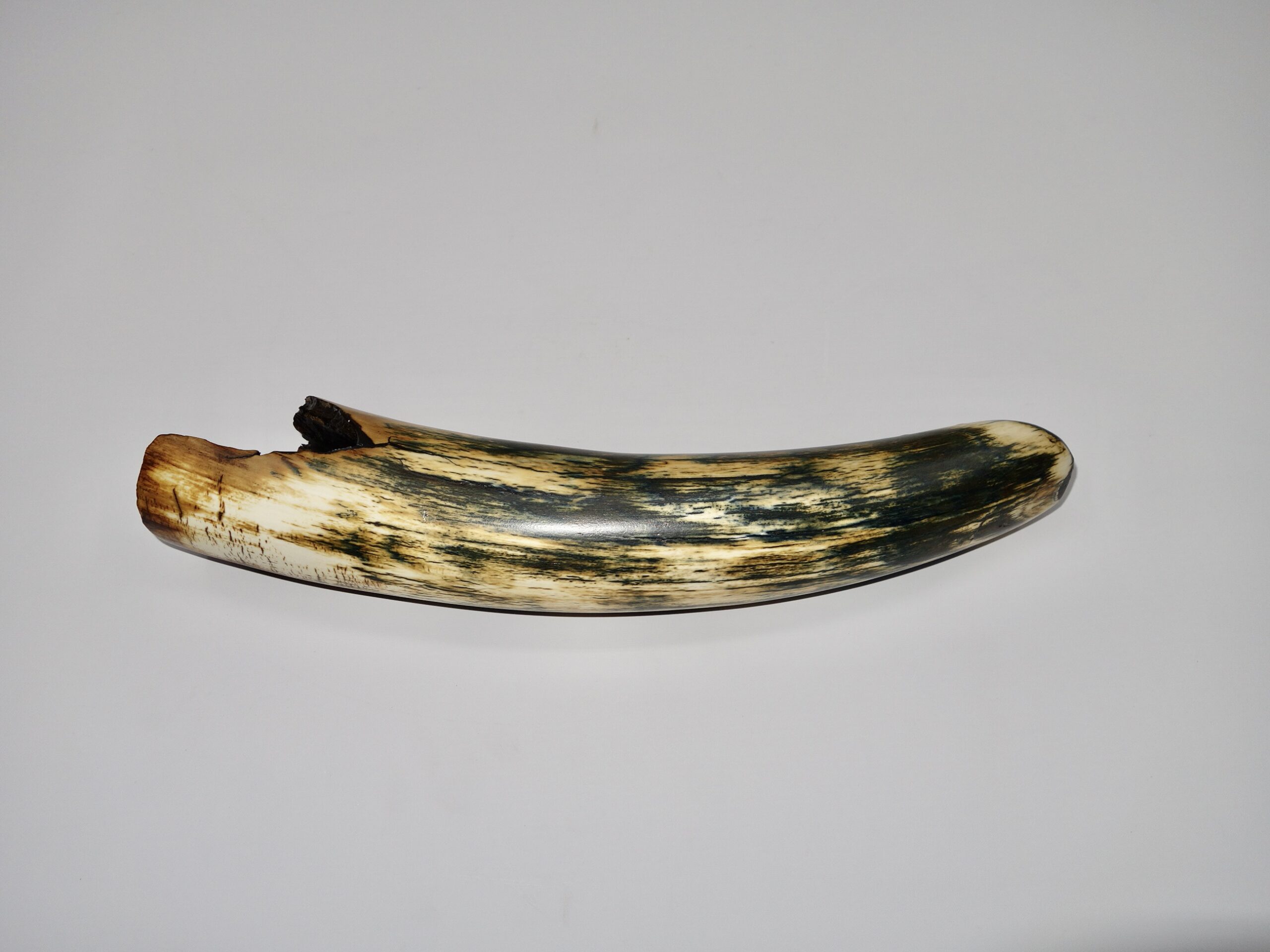 On offer is a beautiful base of a tusk of an adult Woolly Mammoth, in excellent condition. This is the tusk piece where it attached to the animal’s skull, hence the hollow part. This tusk base is of beautiful colouring of mainly white, black and brown ivory and with beautiful patterning. Judging from the circumference this would have belonged to an adult female Mammoth. A matt finish has been applied to this piece, but it is also possible to order it with a glossy finish.