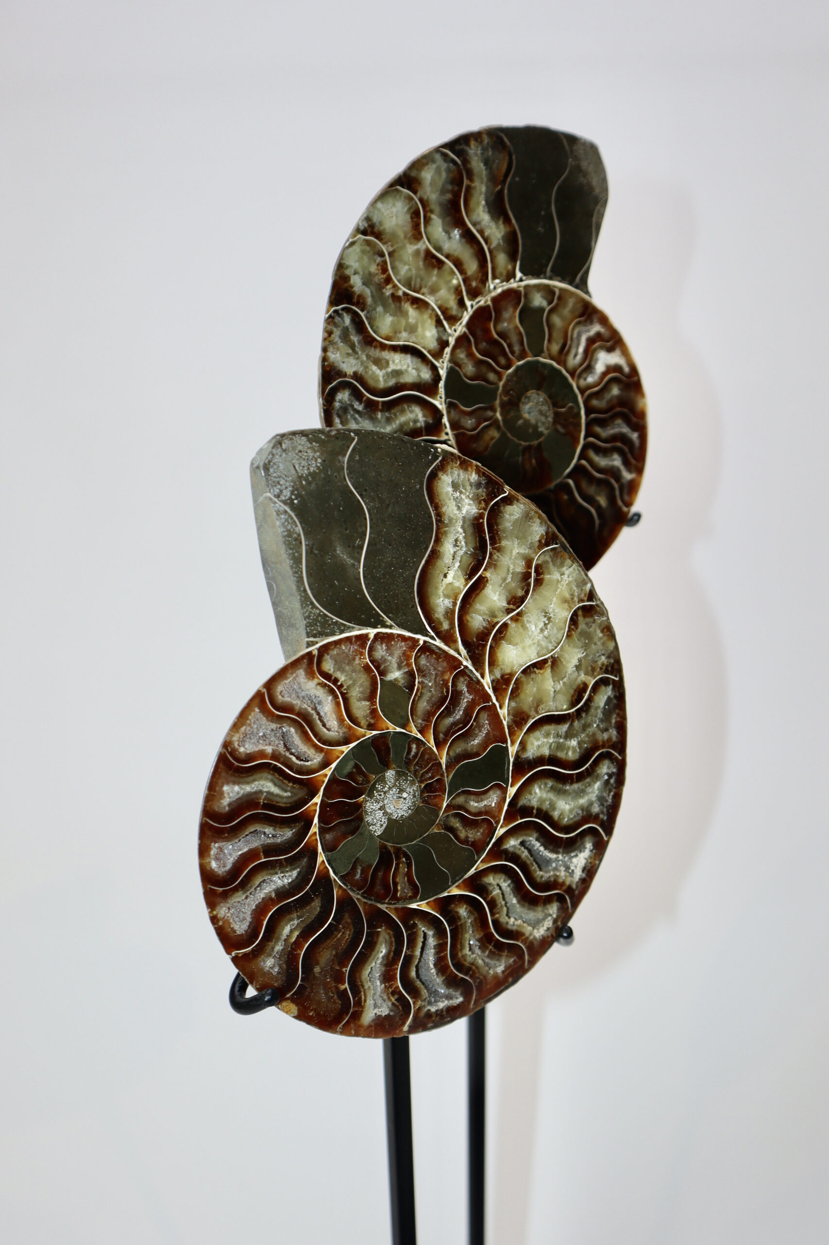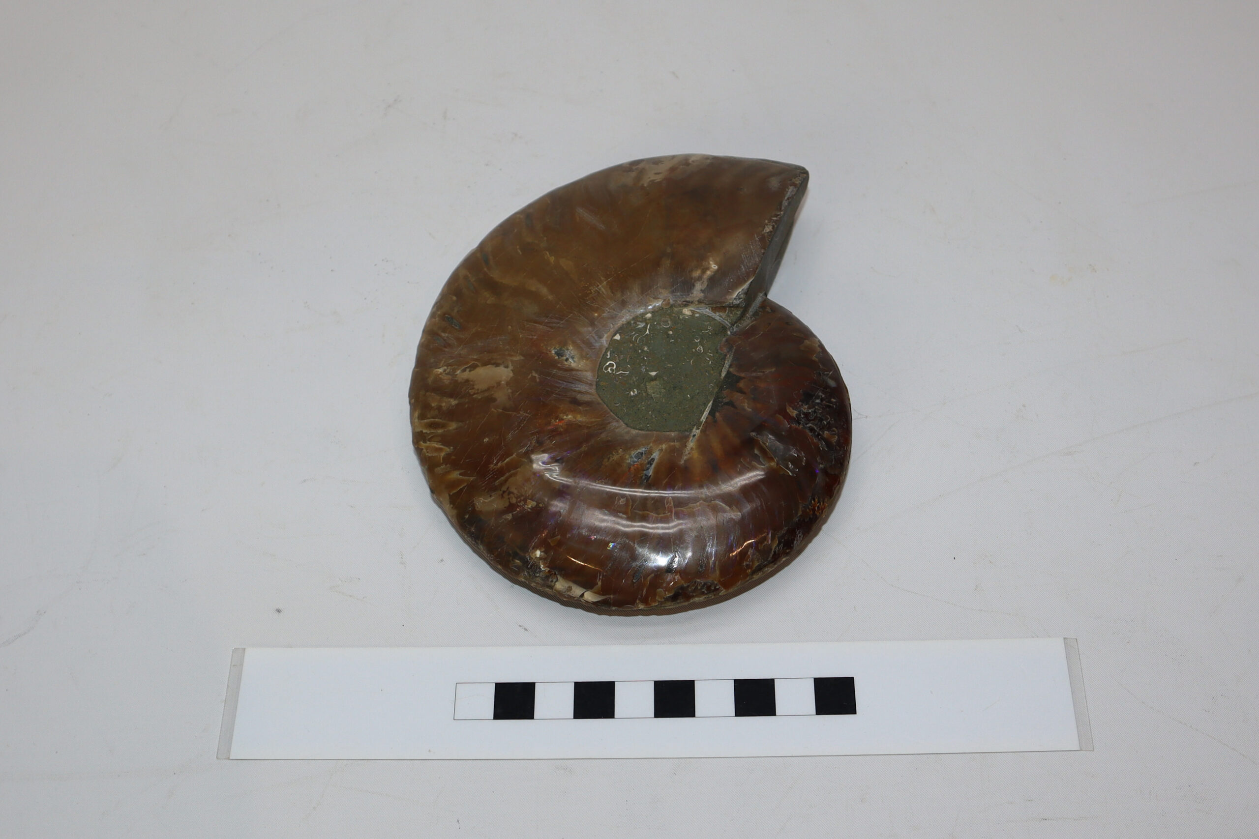 On offer is a good fossilized Ammonite. Ammonites were predatory mollusks that resembled a squid with a shell. These cephalopods had eyes, tentacles, and spiral shells. They are more closely related to a living octopus, though the shells resemble that of a nautilus. Ammonites appeared in the fossil record about 240 million years ago and they barely survived several major extinction events. The last lineages disappeared 65 million years ago at the end of the Cretaceous. This beautiful piece has been cut in half and polished to reveal the original stunning colours and patterning. The black and white ruler in the image represents 10 cm (3.9 inch).