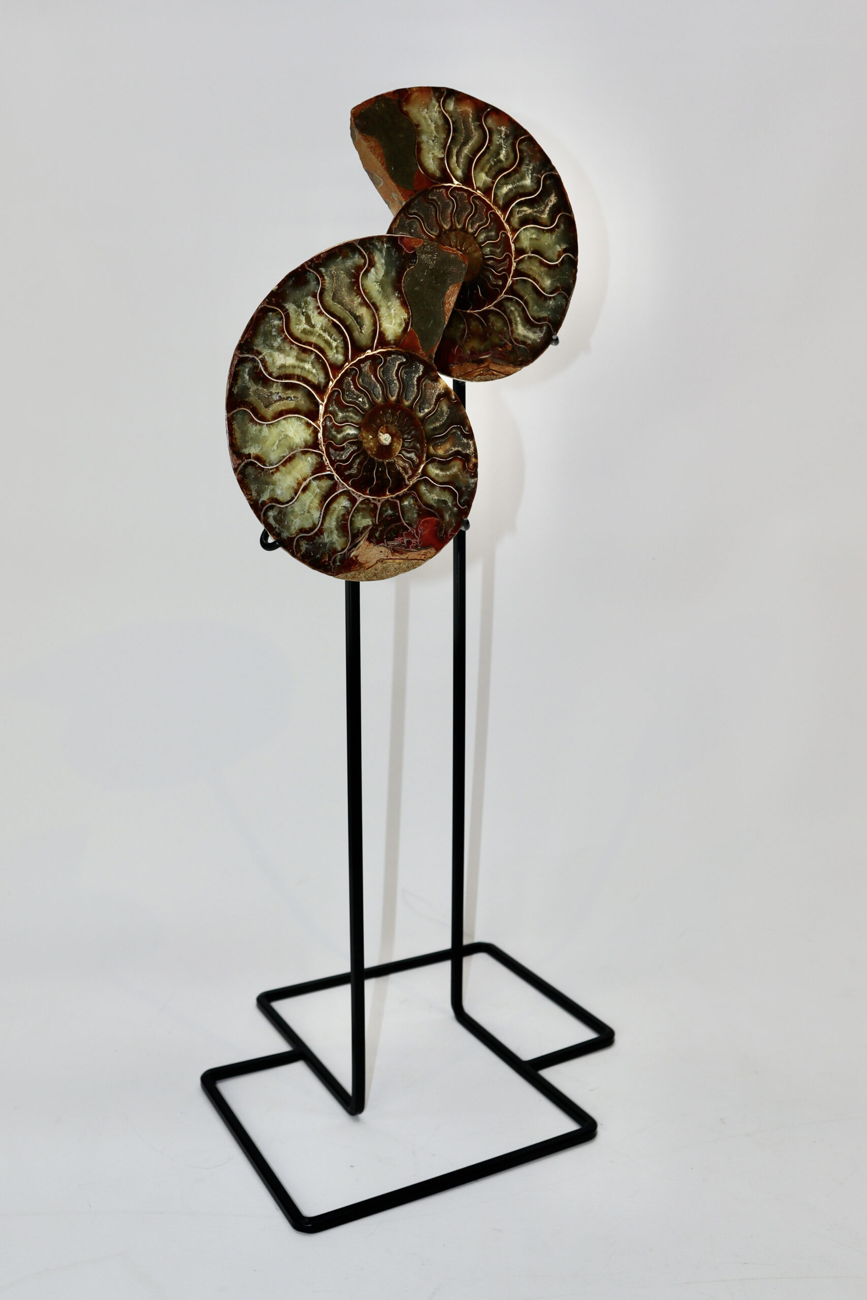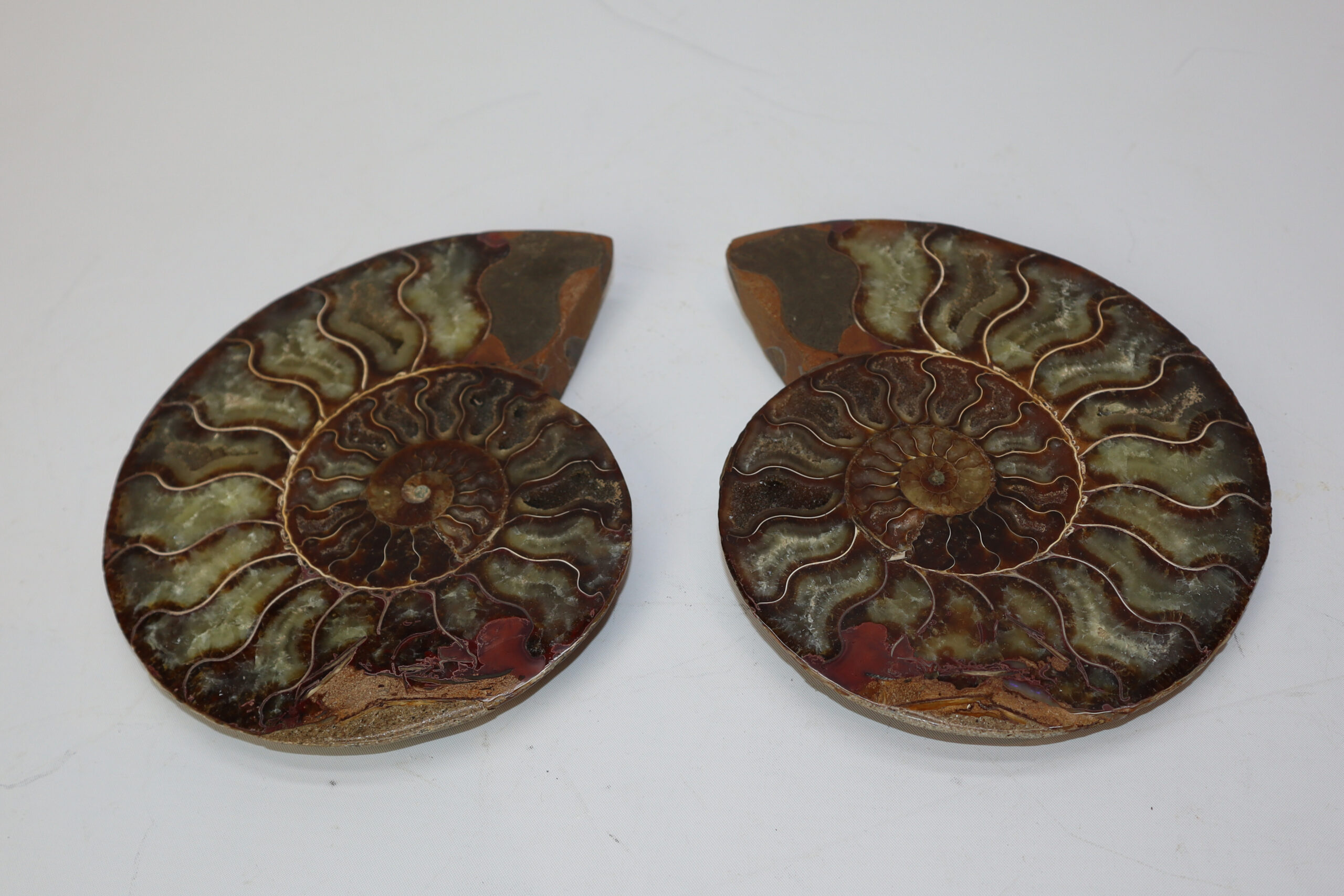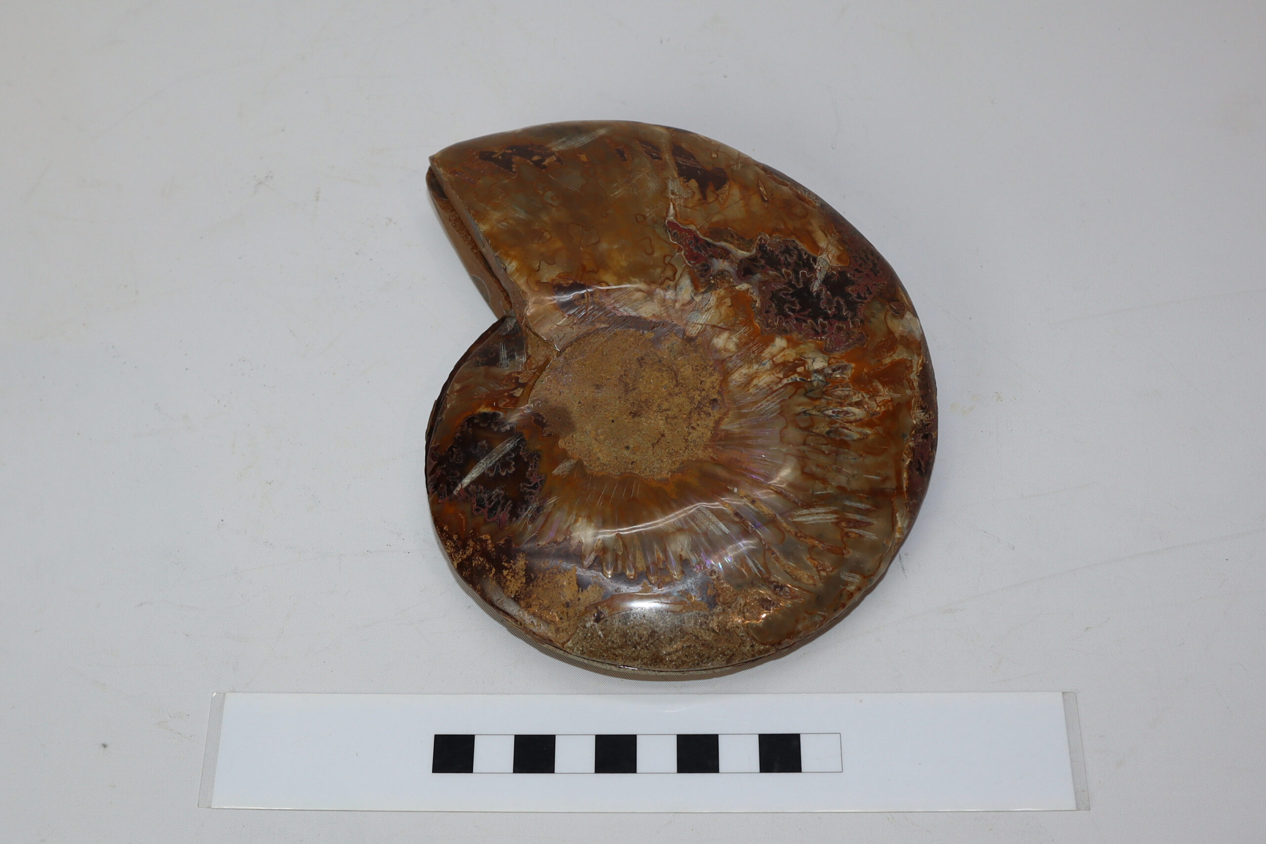 On offer is a good fossilized Ammonite. Ammonites were predatory mollusks that resembled a squid with a shell. These cephalopods had eyes, tentacles, and spiral shells. They are more closely related to a living octopus, though the shells resemble that of a nautilus. Ammonites appeared in the fossil record about 240 million years ago and they barely survived several major extinction events. The last lineages disappeared 65 million years ago at the end of the Cretaceous. This beautiful piece has been cut in half and polished to reveal the original stunning colours and patterning. The black and white ruler in the image represents 10 cm (3.9 inch).