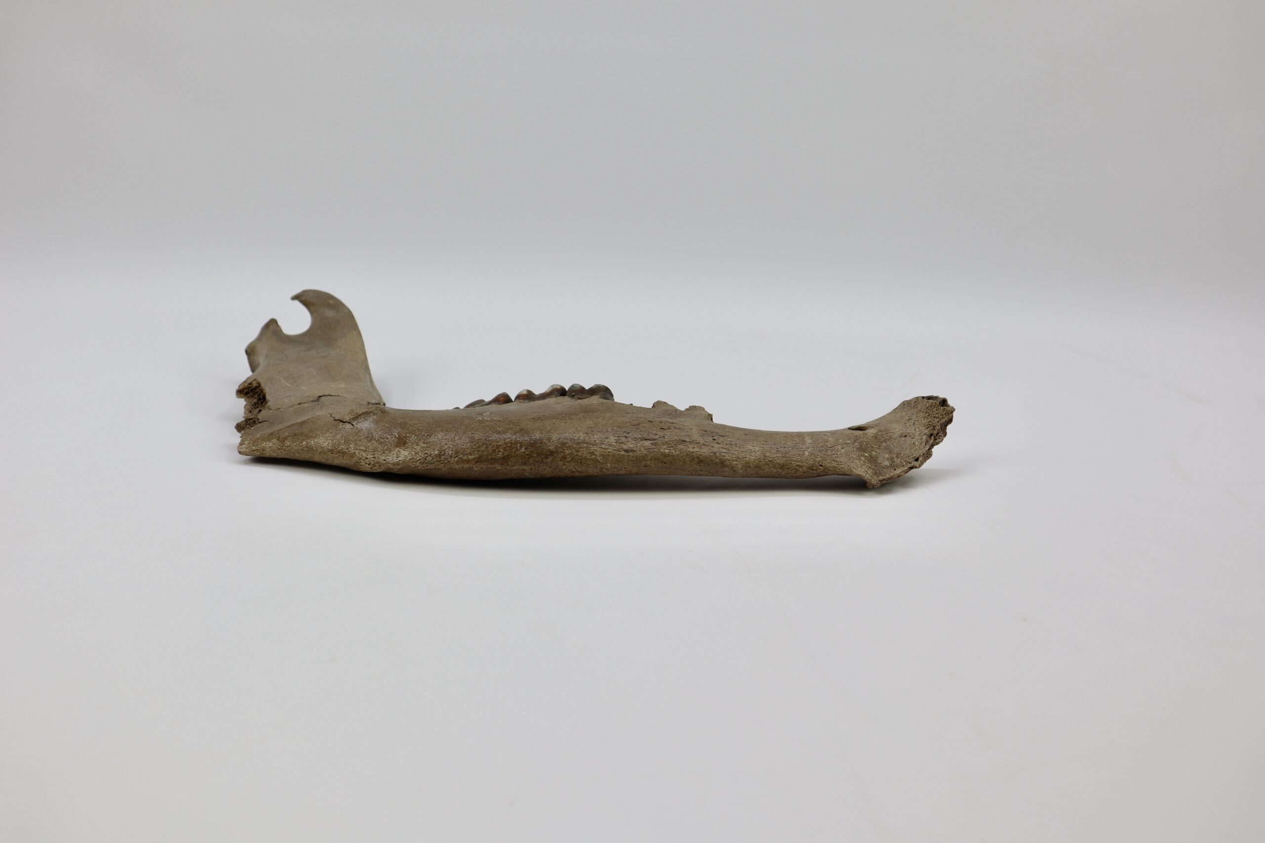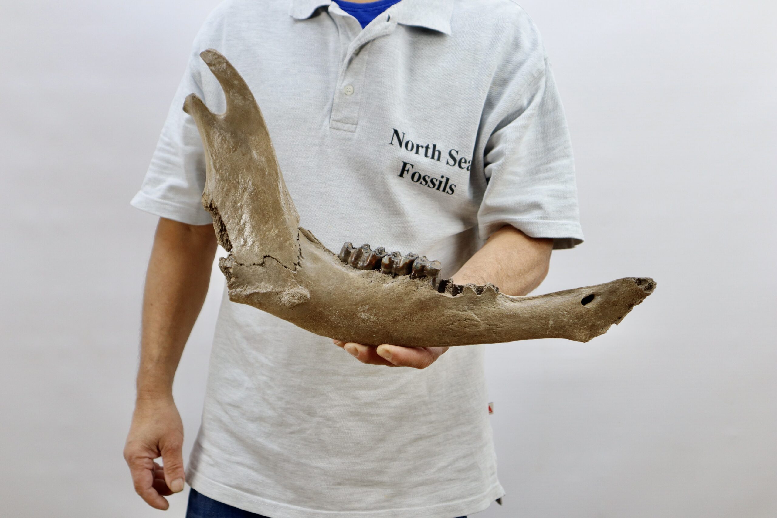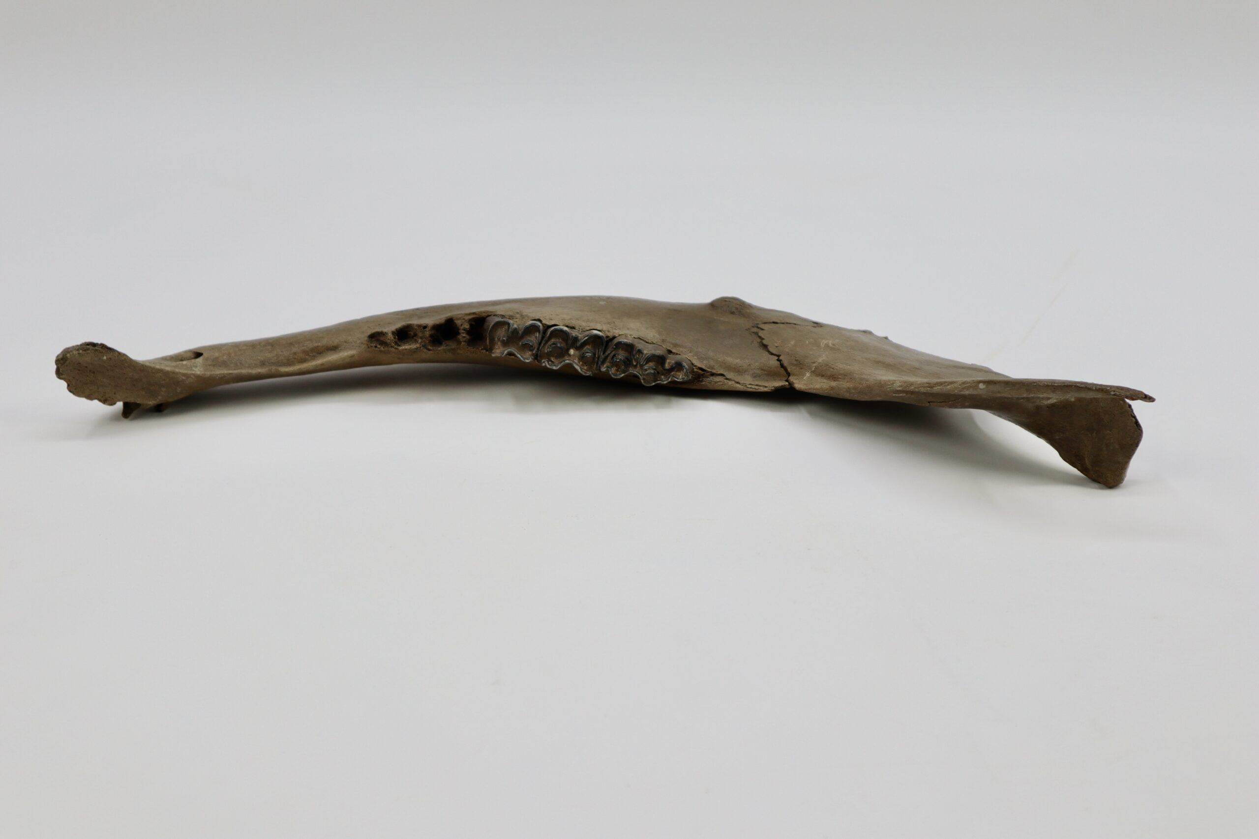 On offer is a good half lower jaw of a Wisent from the Pleistocene era. This piece has been professionally repaired from the two original halves but is otherwise in good condition and still includes three of the original molars, as seen in the photographs. The black and white ruler in the image represents 10 cm / 3.9 inch.