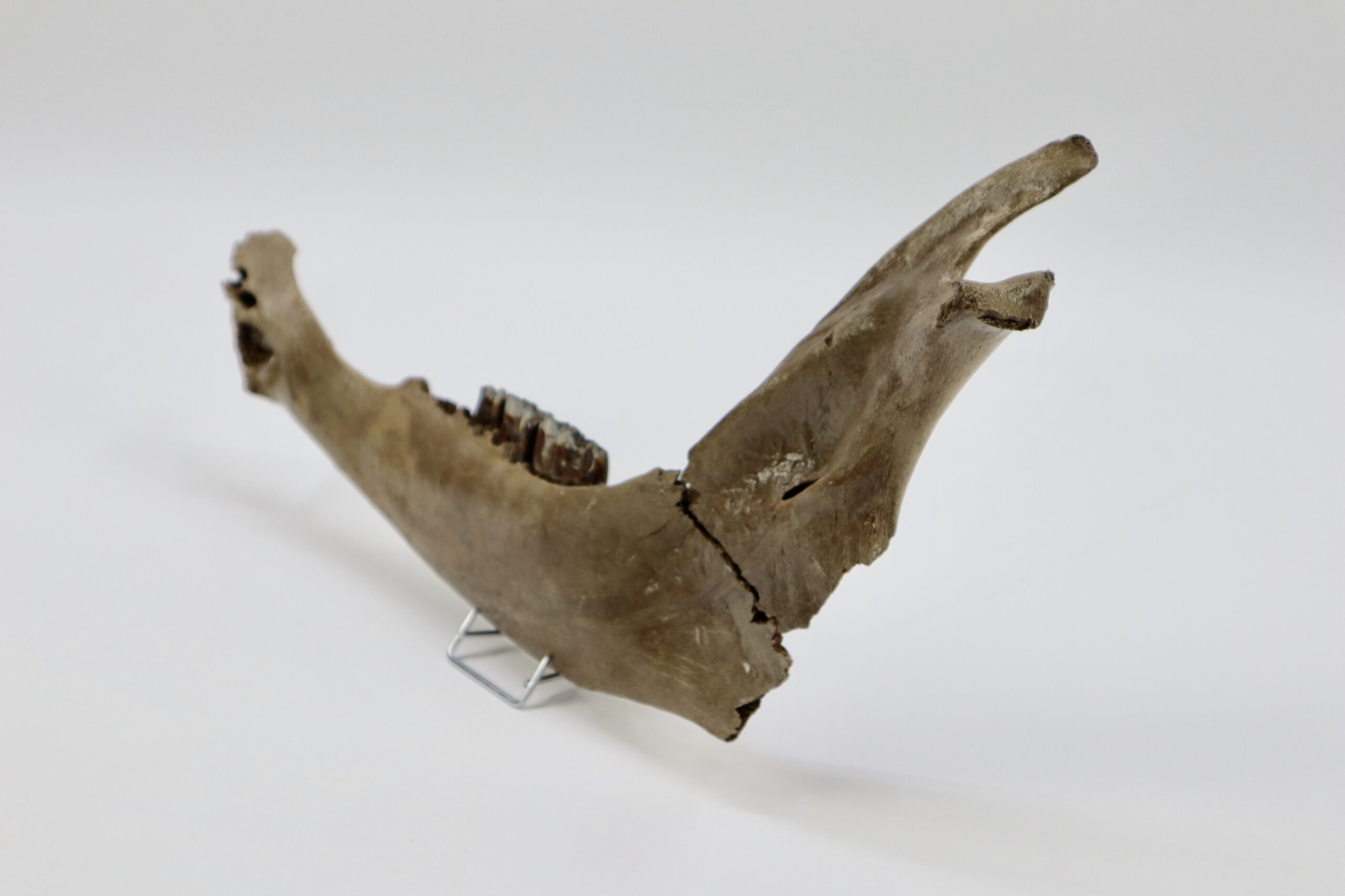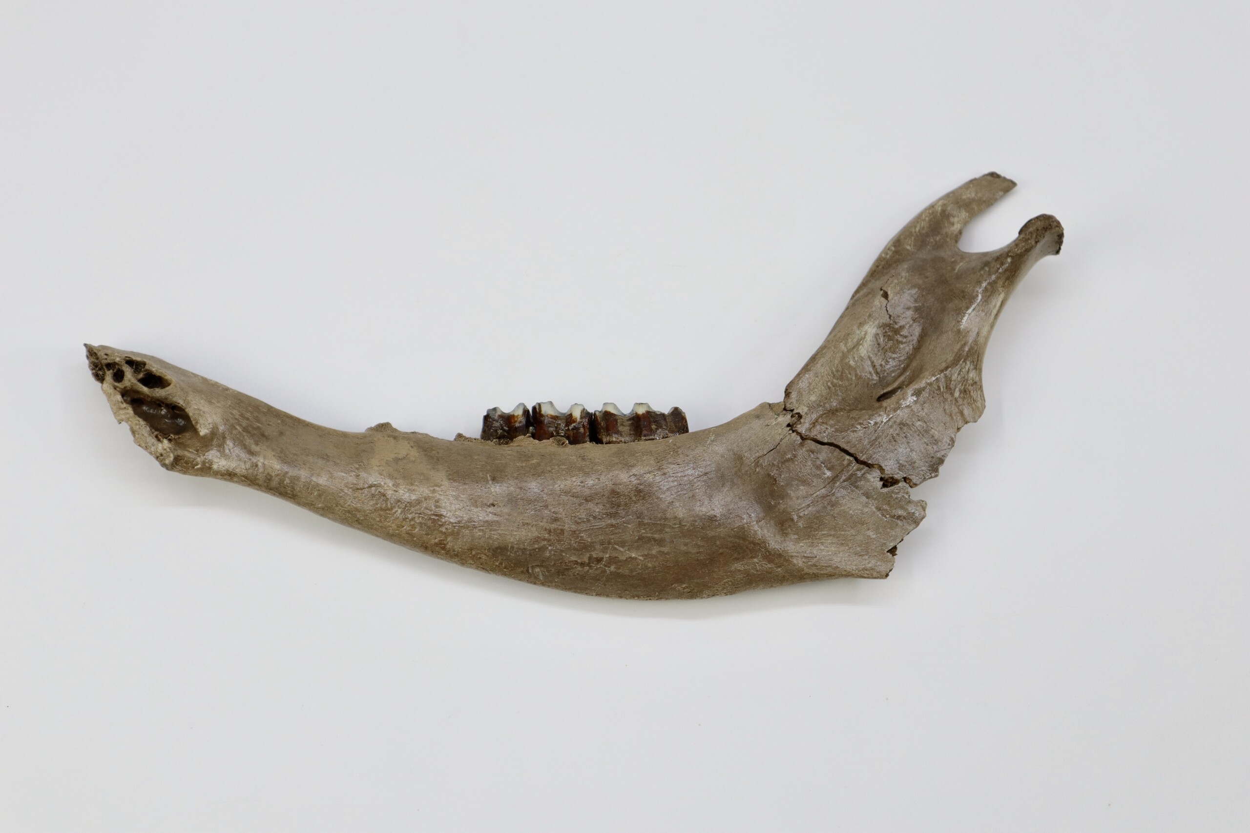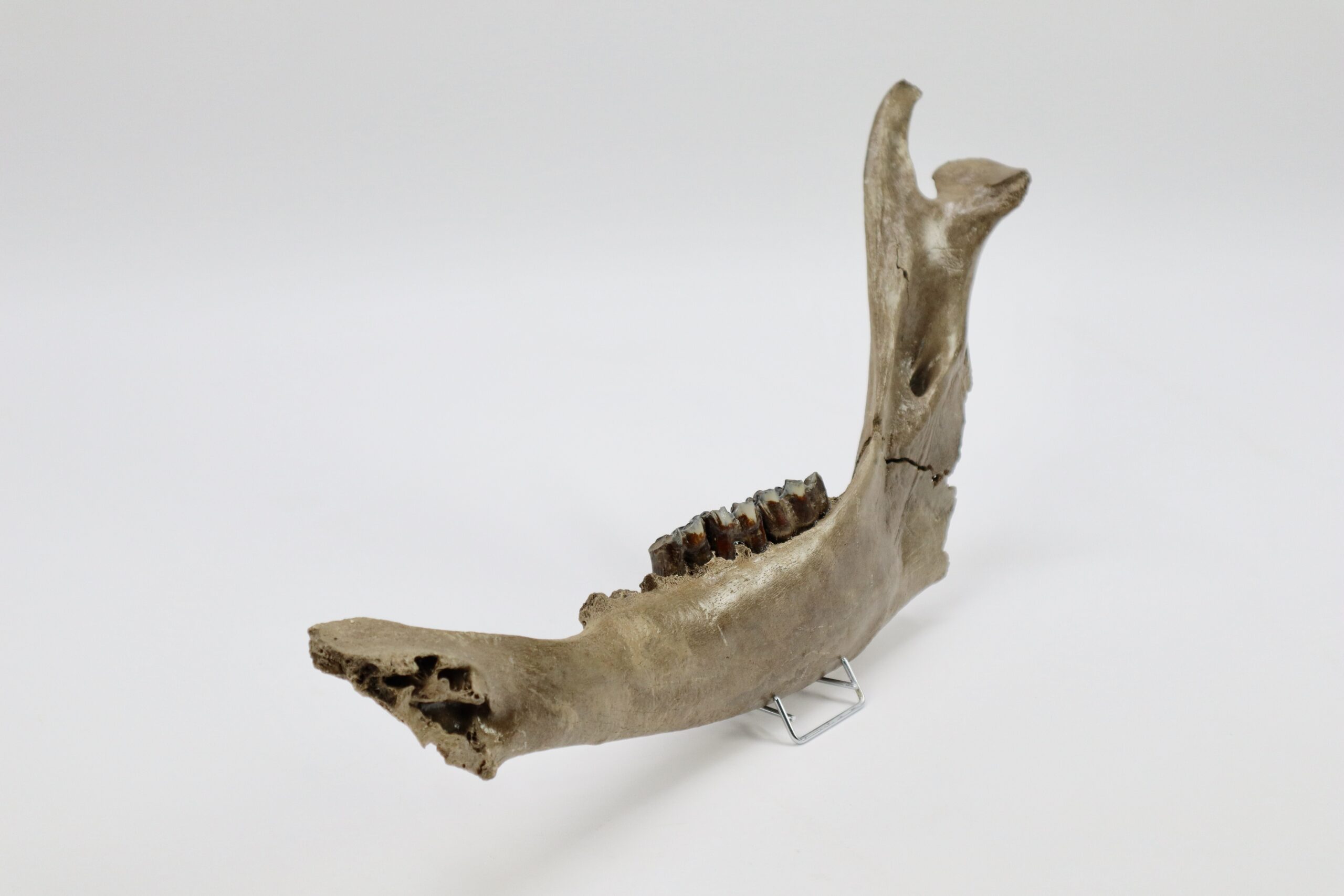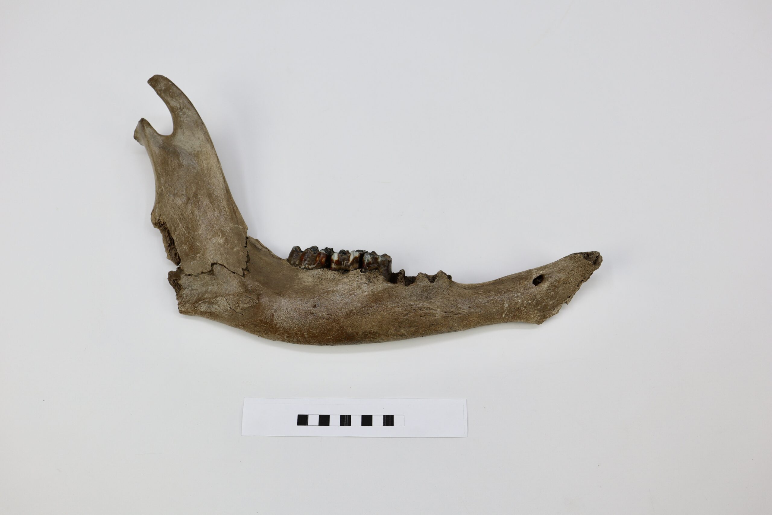 On offer is a good half lower jaw of a Wisent from the Pleistocene era. This piece has been professionally repaired from the two original halves but is otherwise in good condition and still includes three of the original molars, as seen in the photographs. The black and white ruler in the image represents 10 cm / 3.9 inch.
