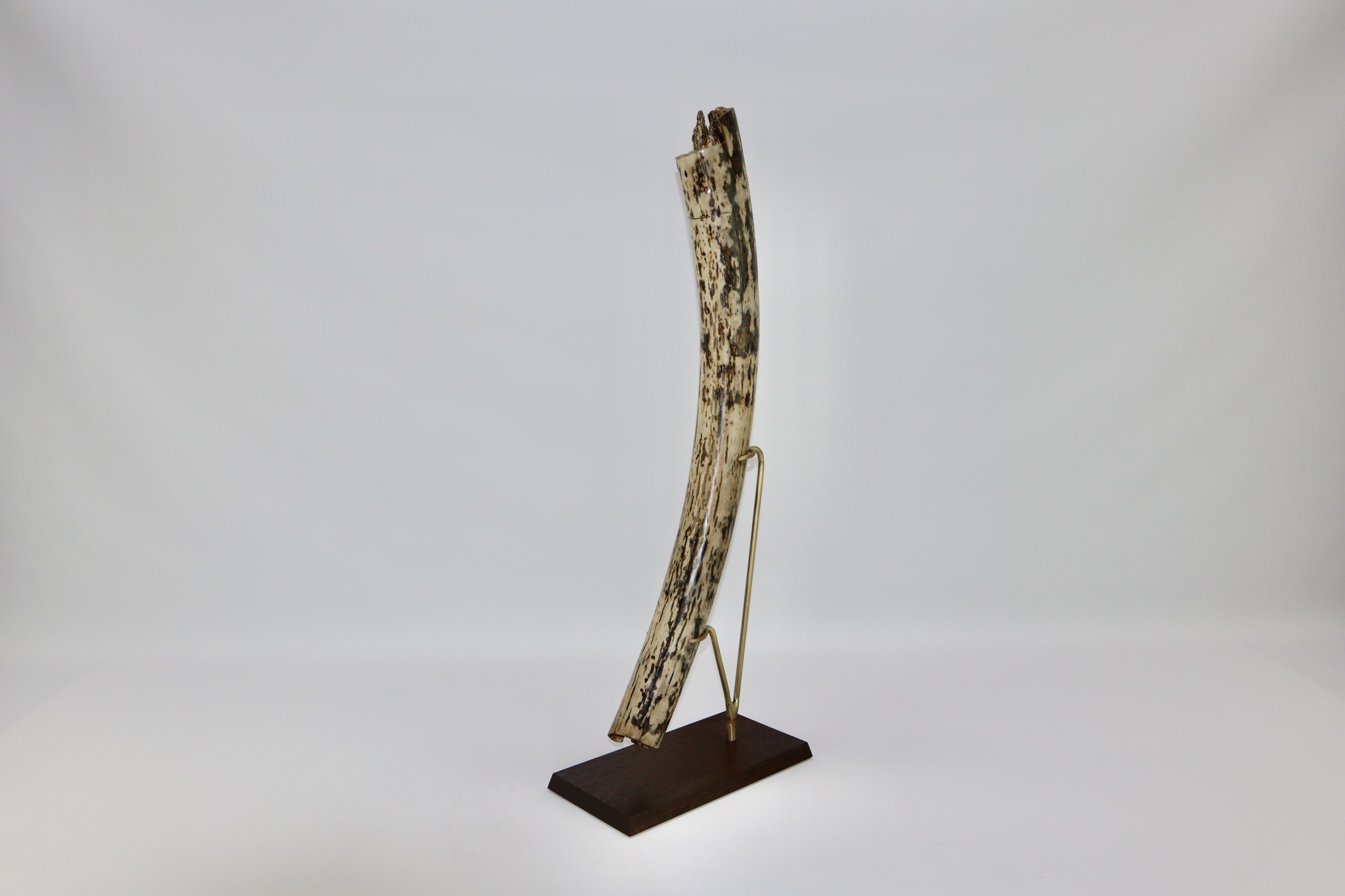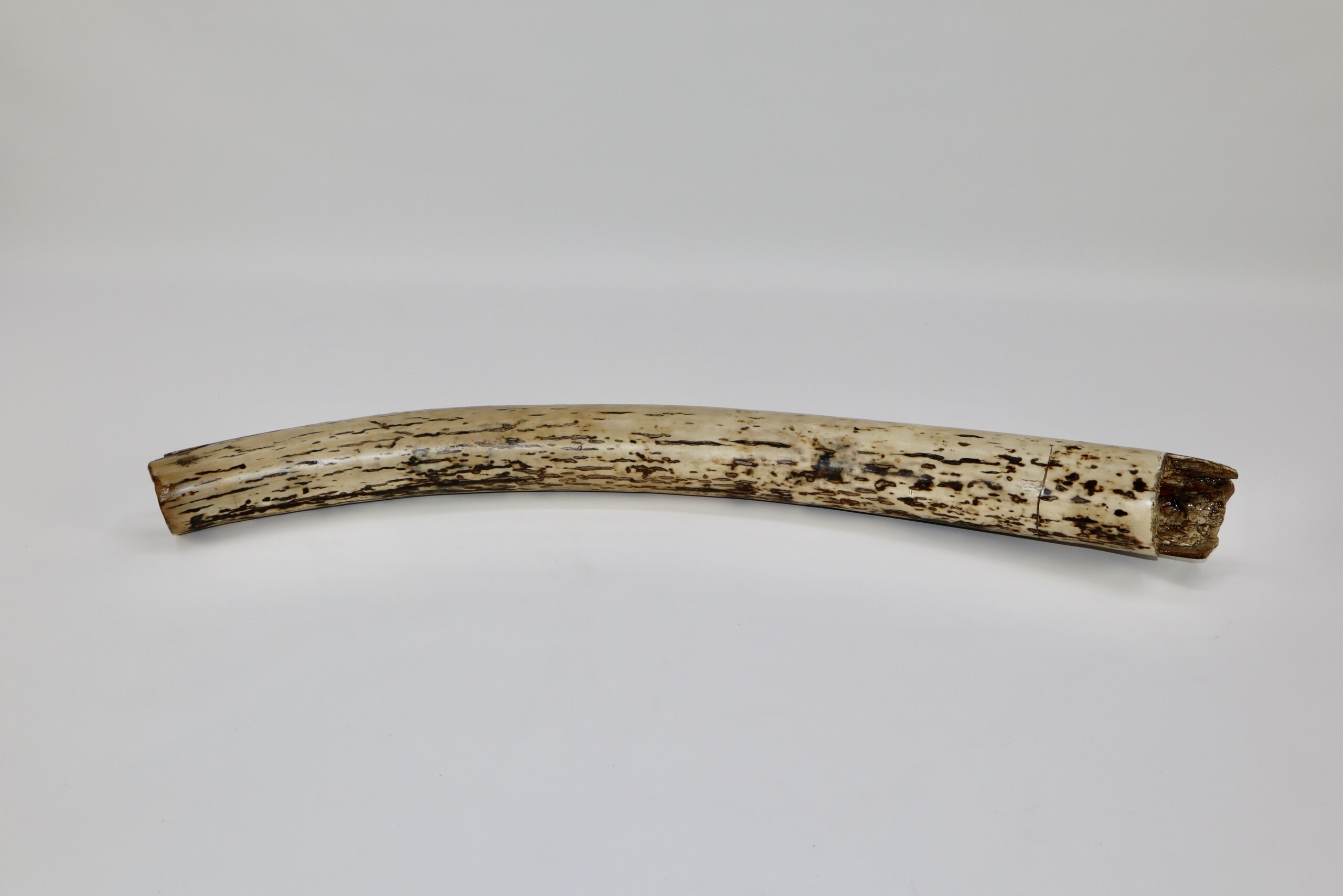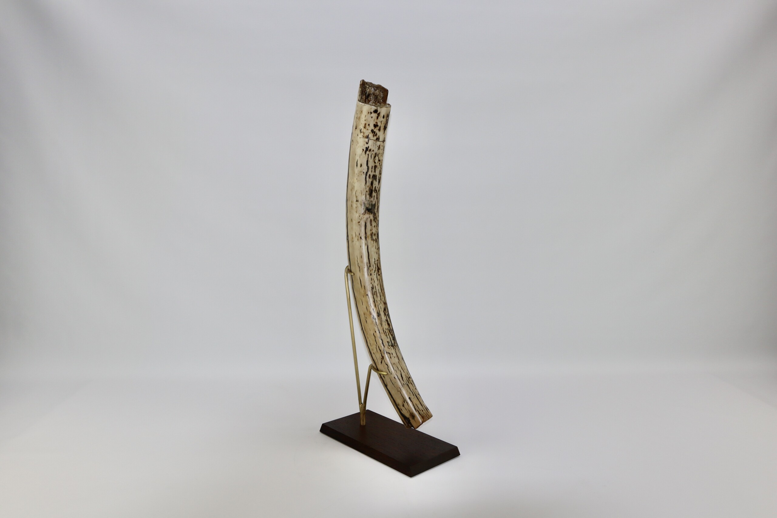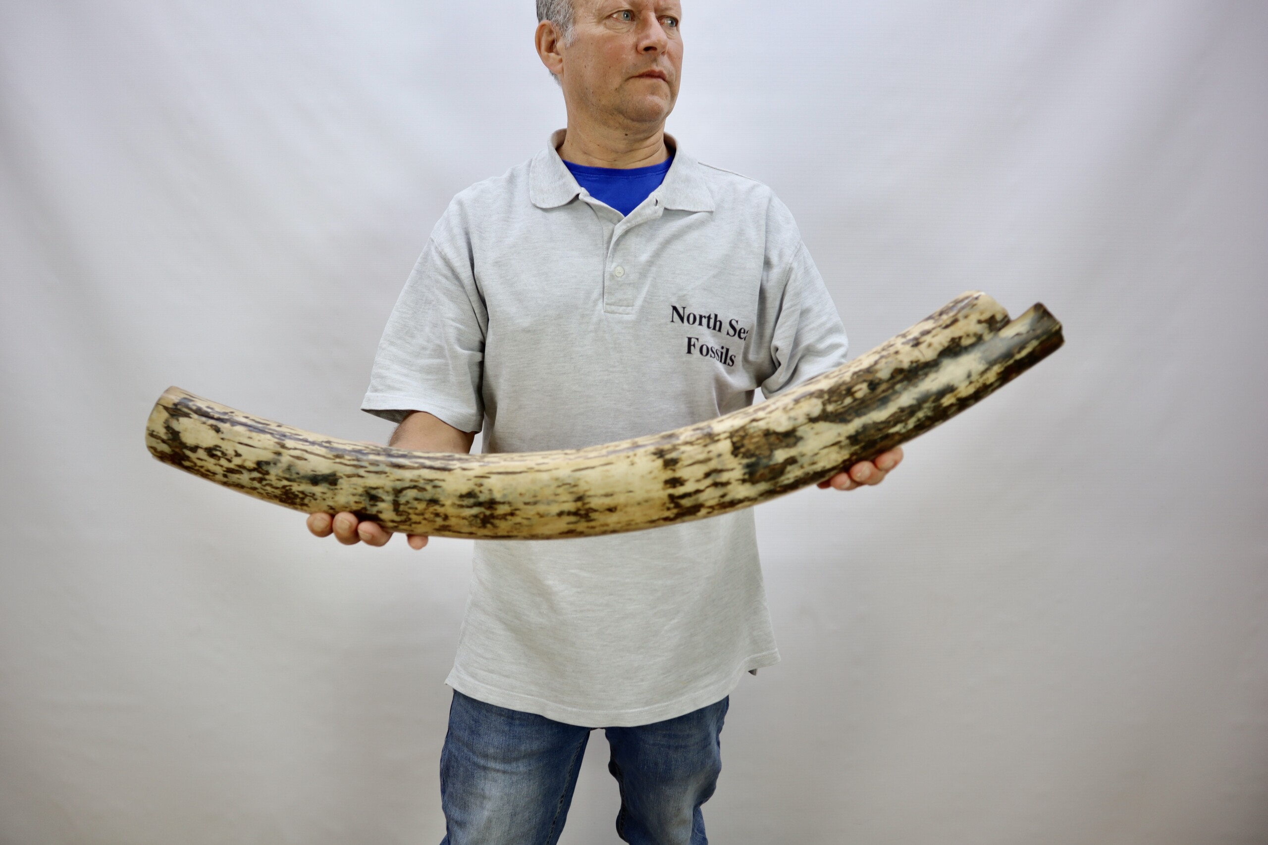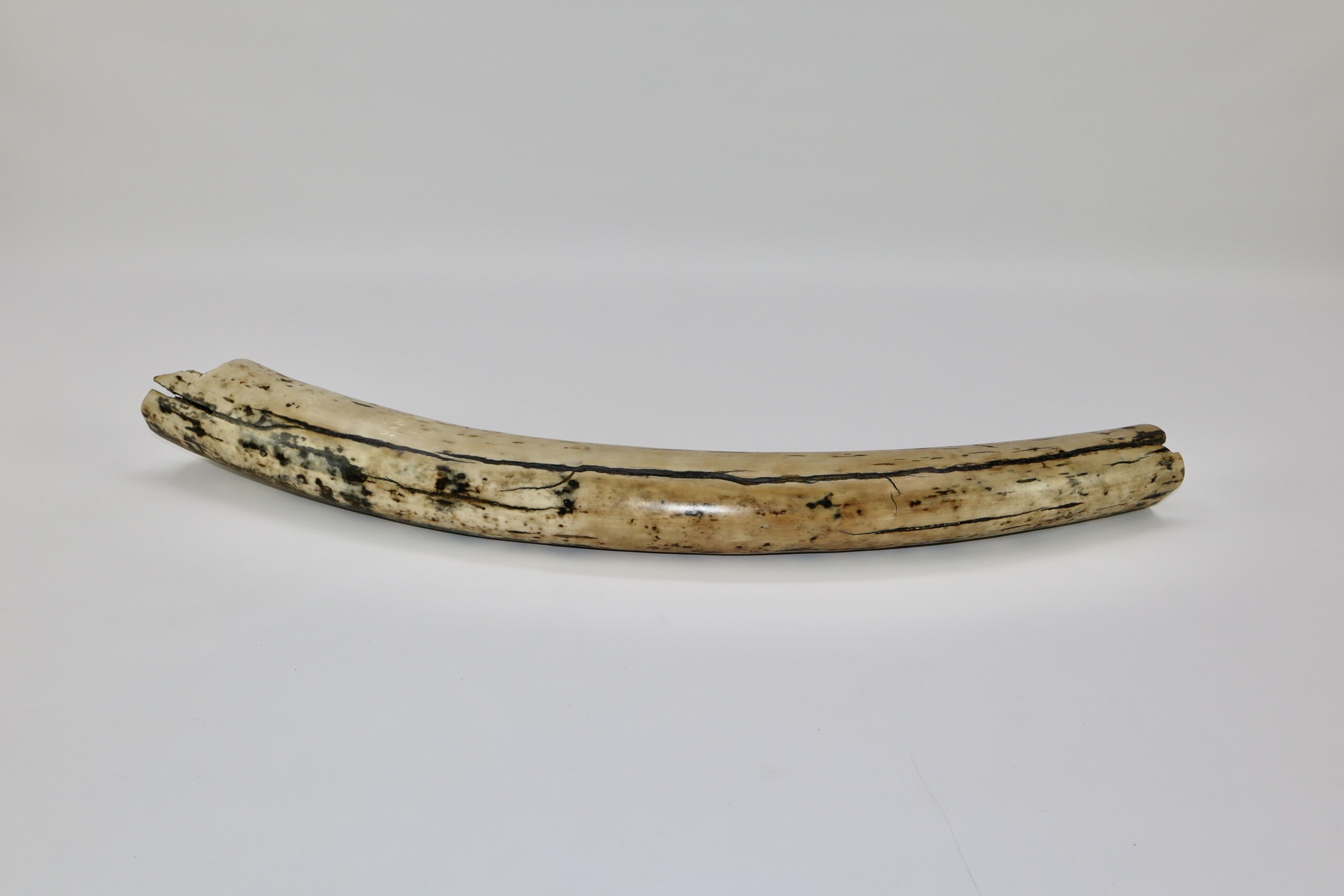On offer is a fantastic half tusk of a female Woolly Mammoth from the Pleistocene era. Although it is only a half tusk, otherwise it is in excellent condition as seen in the images. No restoration whatsoever. This is the middle part of the tusk, the base and tip are missing. This tusk piece is of beautiful ivory of mainly white, grey and brown ivory. Stunning patterning. Fantastic piece and highly recommended. The black and white section of the ruler in the image represents 10 cm / 3.9 inch. This piece has been applied with a matt finish, but it is also possible to order it with a glossy finish.
