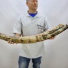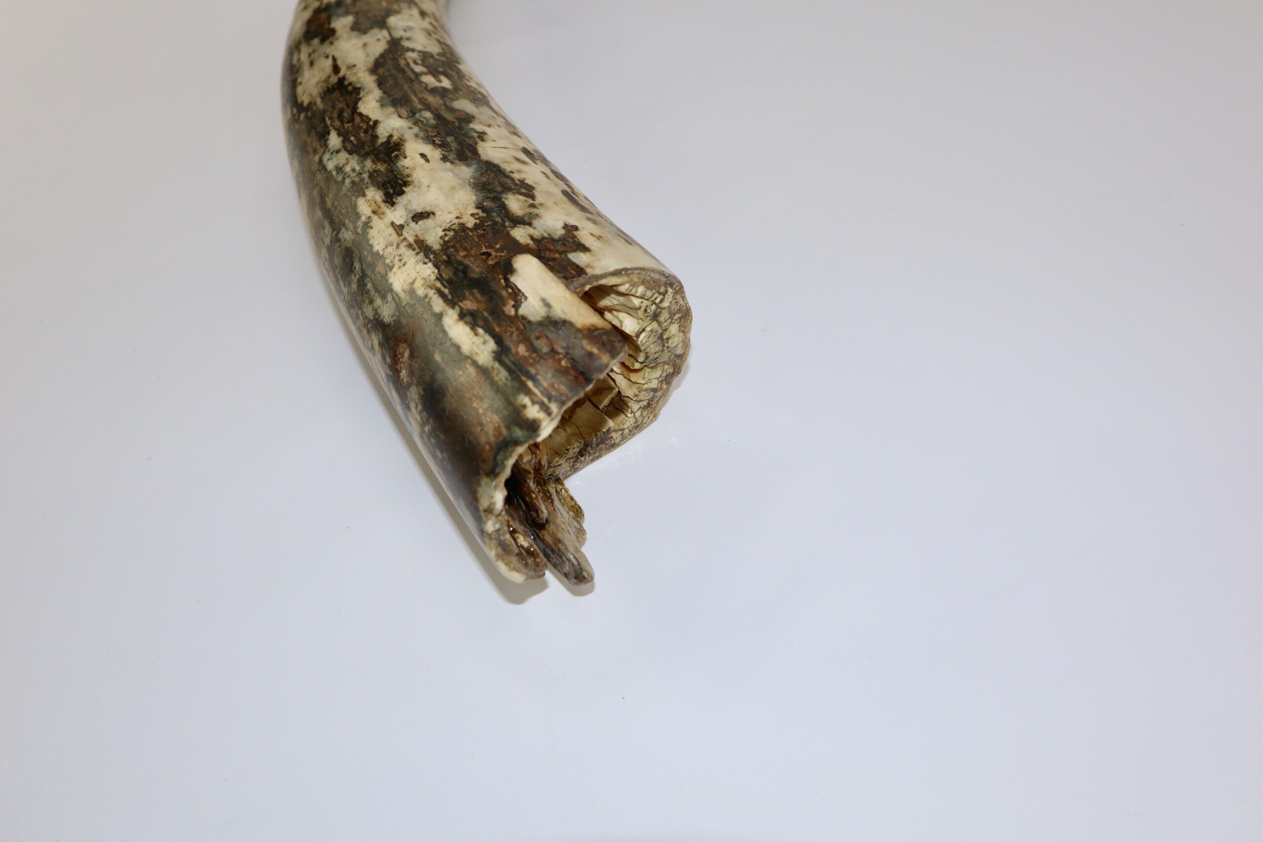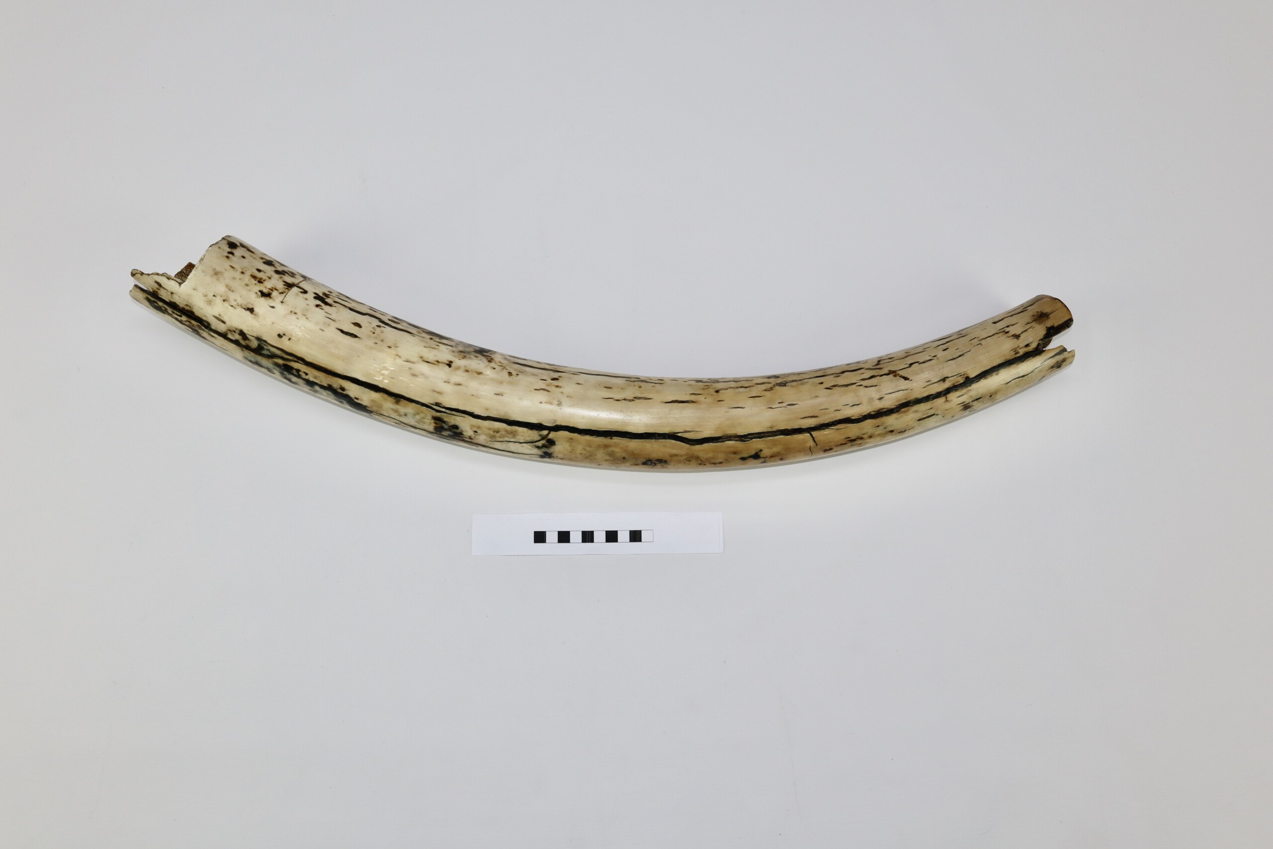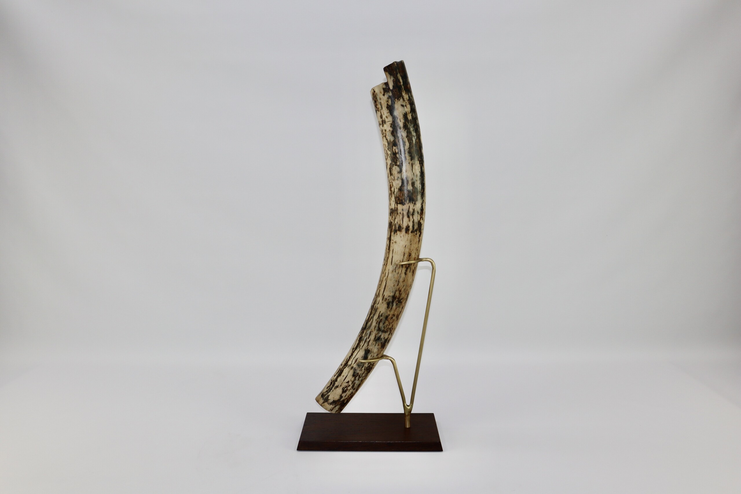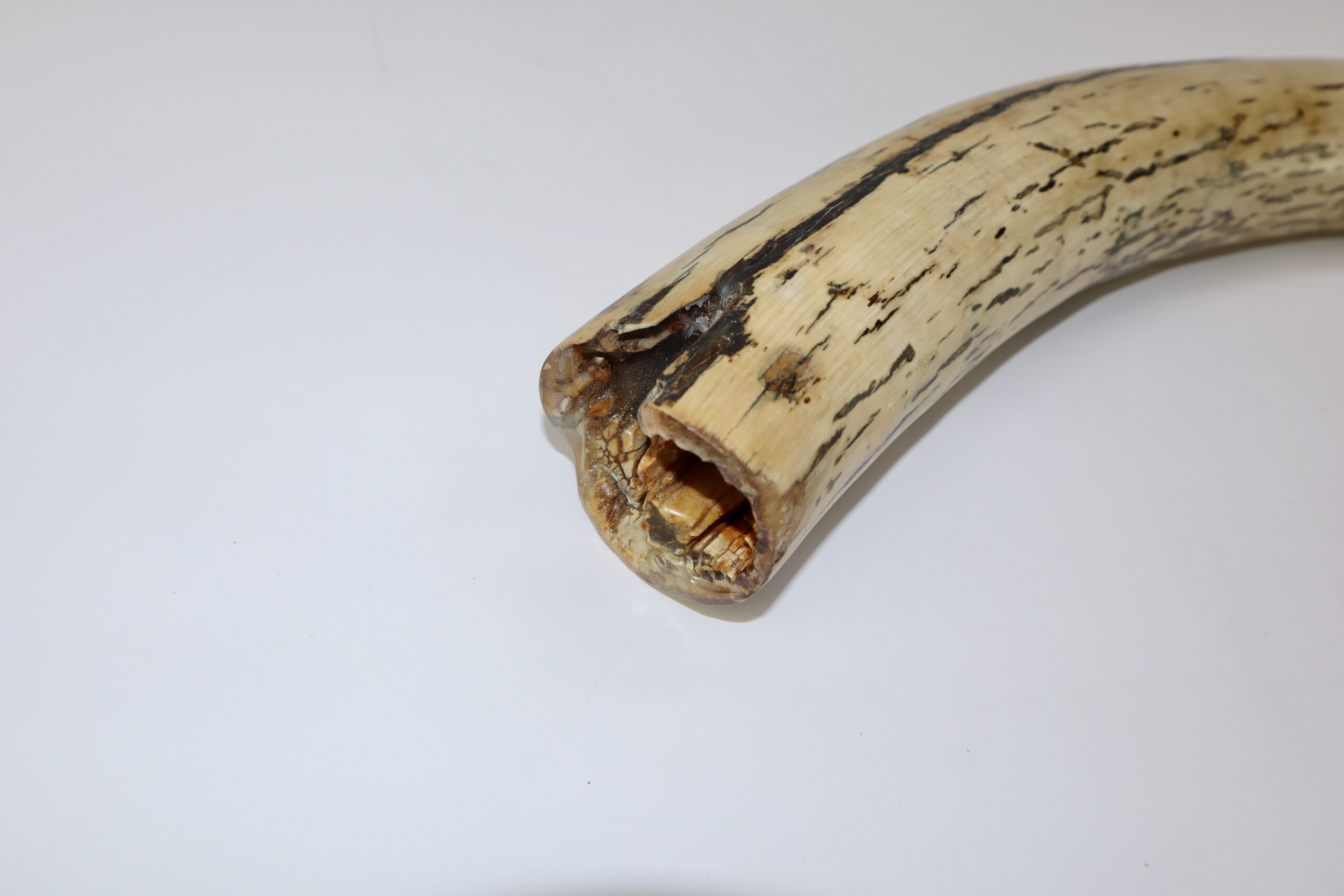 On offer is a fantastic half tusk of a female Woolly Mammoth from the Pleistocene era. Although it is only a half tusk, otherwise it is in excellent condition as seen in the images. No restoration whatsoever. This is the middle part of the tusk, the base and tip are missing. This tusk piece is of beautiful ivory of mainly white, grey and brown ivory. Stunning patterning. Fantastic piece and highly recommended. The black and white section of the ruler in the image represents 10 cm / 3.9 inch. This piece has been applied with a matt finish, but it is also possible to order it with a glossy finish.