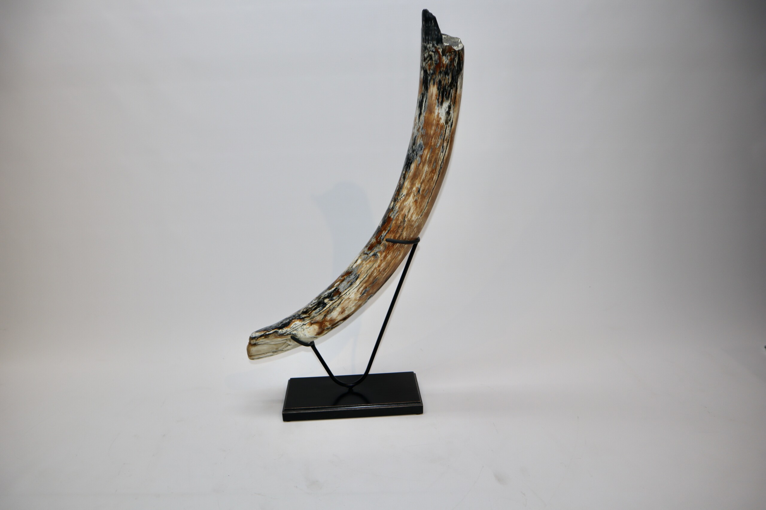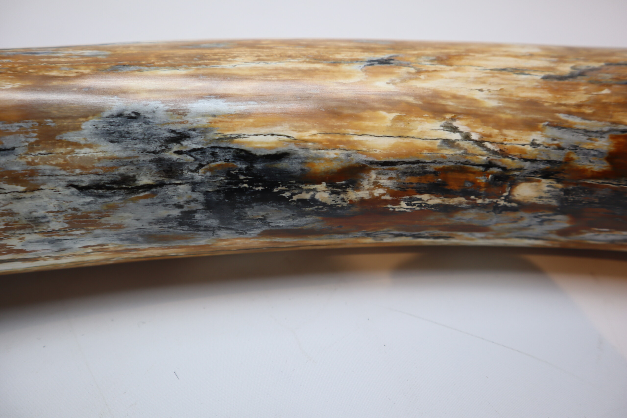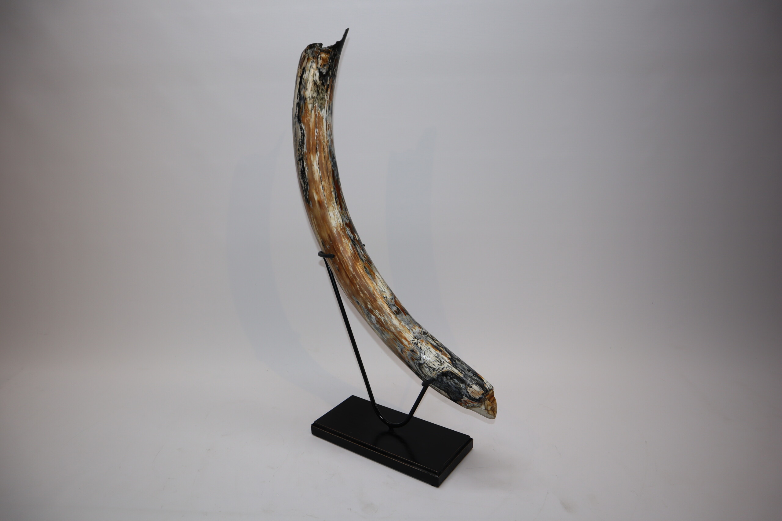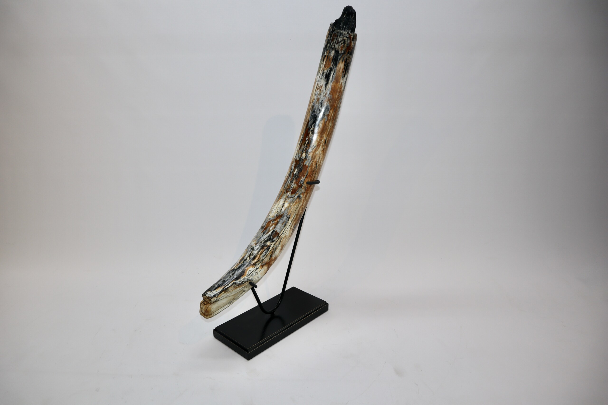 On offer is a fantastic half tusk of a Woolly Mammoth from the Pleistocene era. Although it is only a half tusk, otherwise it is in excellent condition as seen in the images. This is the middle part of the tusk, the base and tip are missing. A crack has been professionally repaired, otherwise no restoration whatsoever. This tusk piece is of beautiful ivory of mainly white, gold, grey, black and brown ivory, and with stunning patterning. Fantastic piece and highly recommended. The black and white section of the ruler in the image represents 10 cm / 3.9 inch. This piece has been applied with a matt finish, but it is also possible to order it with a glossy finish.