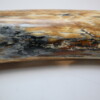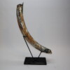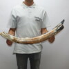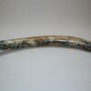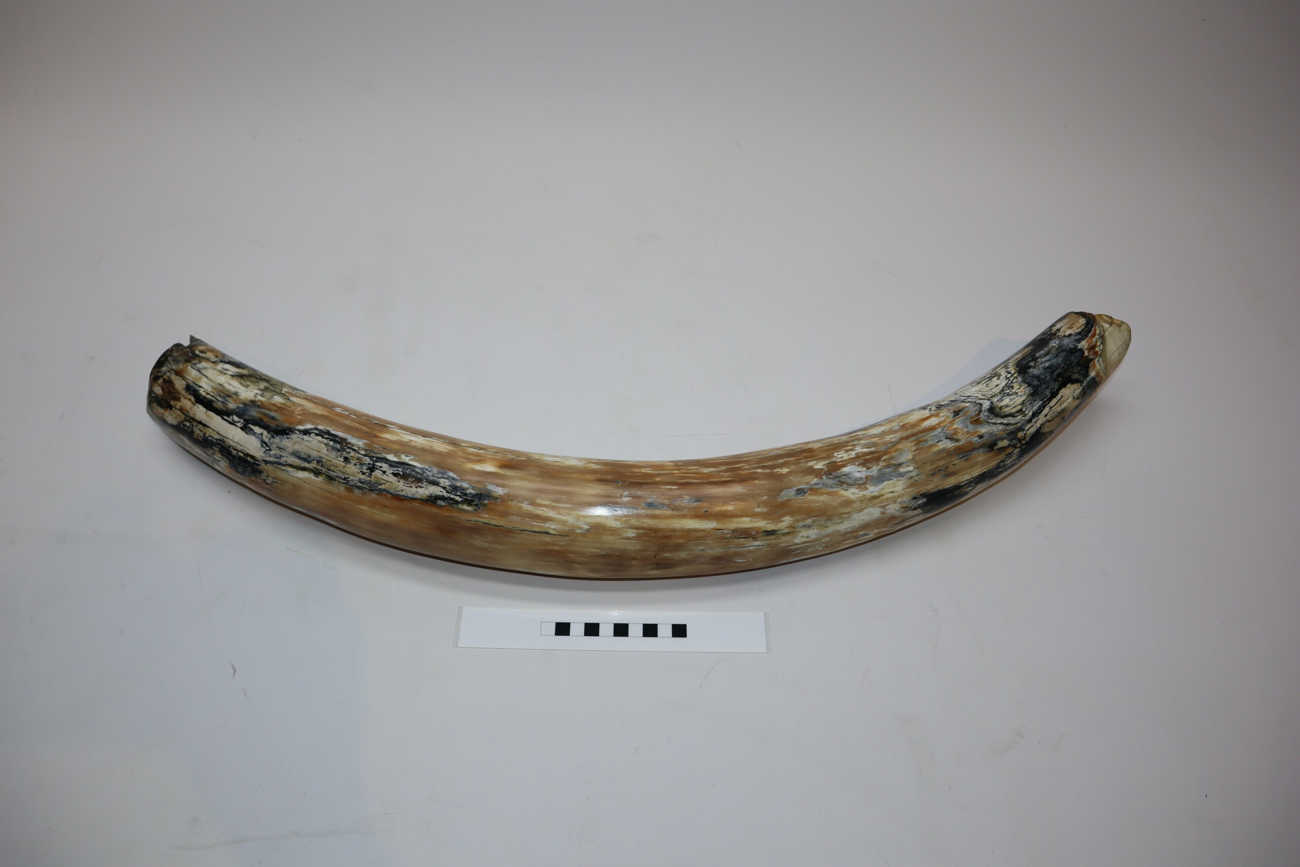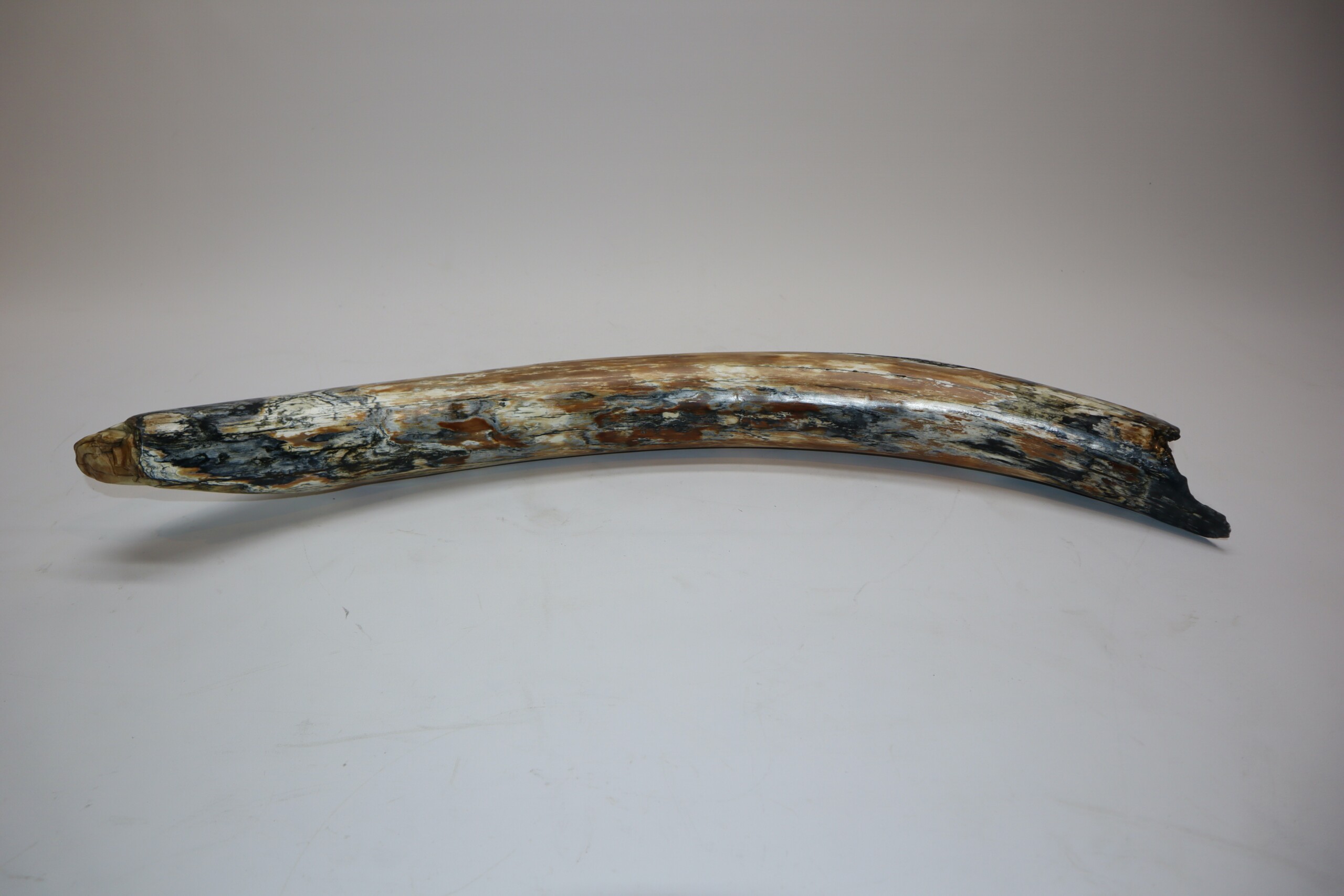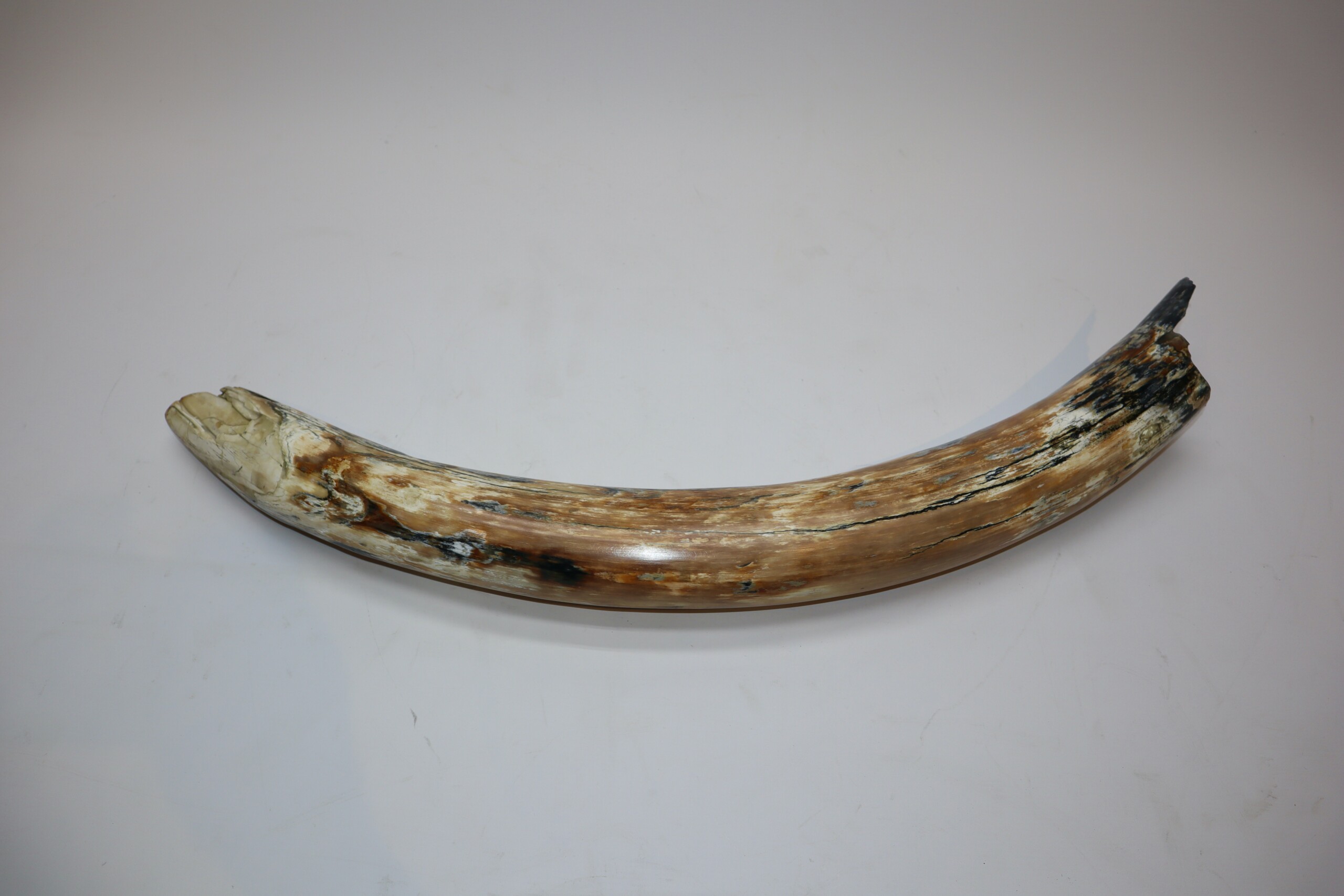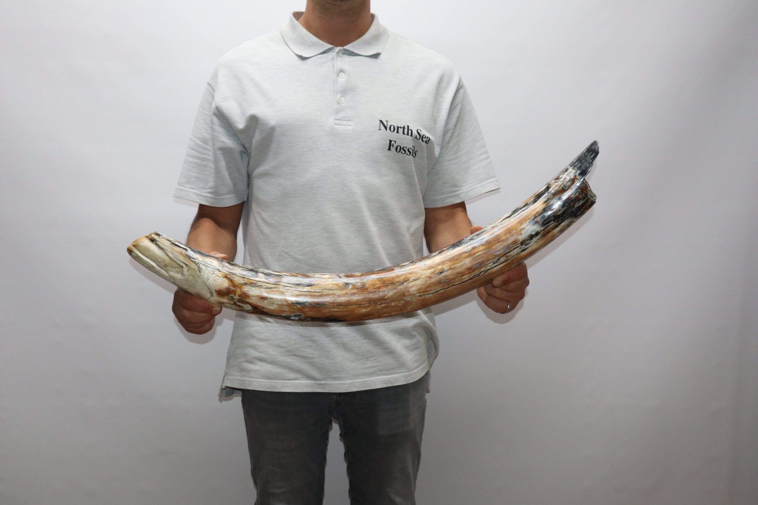 On offer is a fantastic half tusk of a Woolly Mammoth from the Pleistocene era. Although it is only a half tusk, otherwise it is in excellent condition as seen in the images. This is the middle part of the tusk, the base and tip are missing. A crack has been professionally repaired, otherwise no restoration whatsoever. This tusk piece is of beautiful ivory of mainly white, gold, grey, black and brown ivory, and with stunning patterning. Fantastic piece and highly recommended. The black and white section of the ruler in the image represents 10 cm / 3.9 inch. This piece has been applied with a matt finish, but it is also possible to order it with a glossy finish.