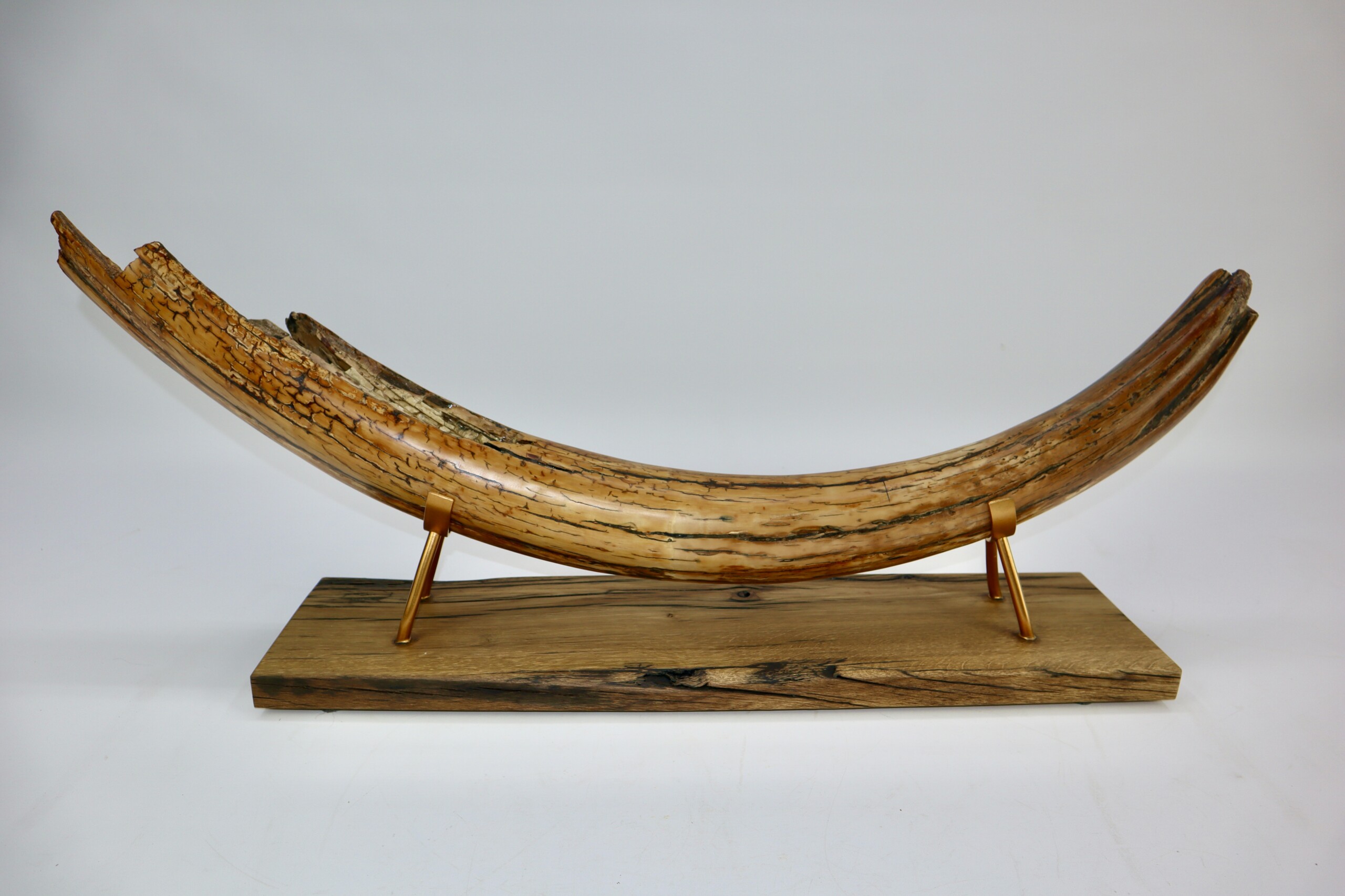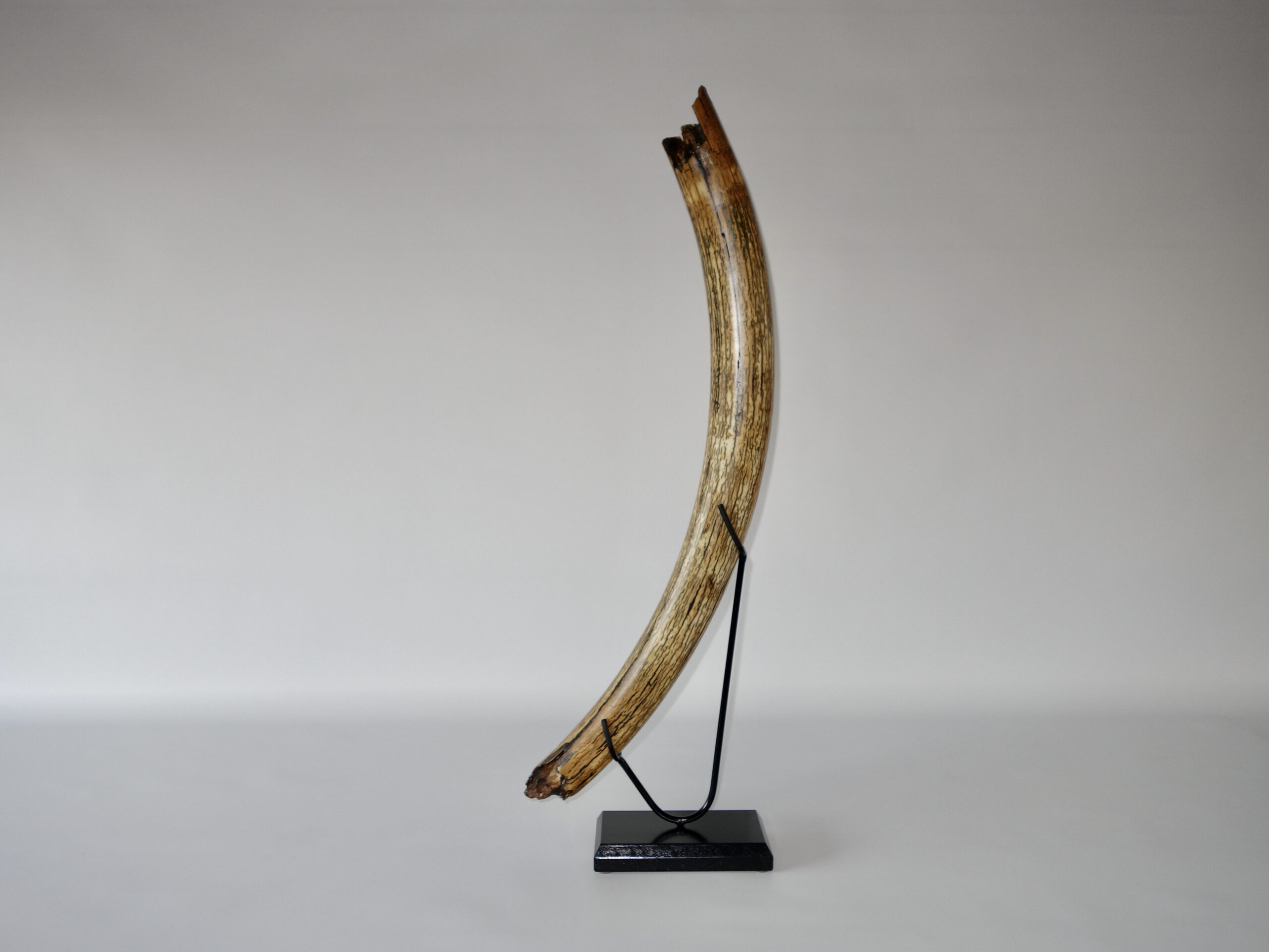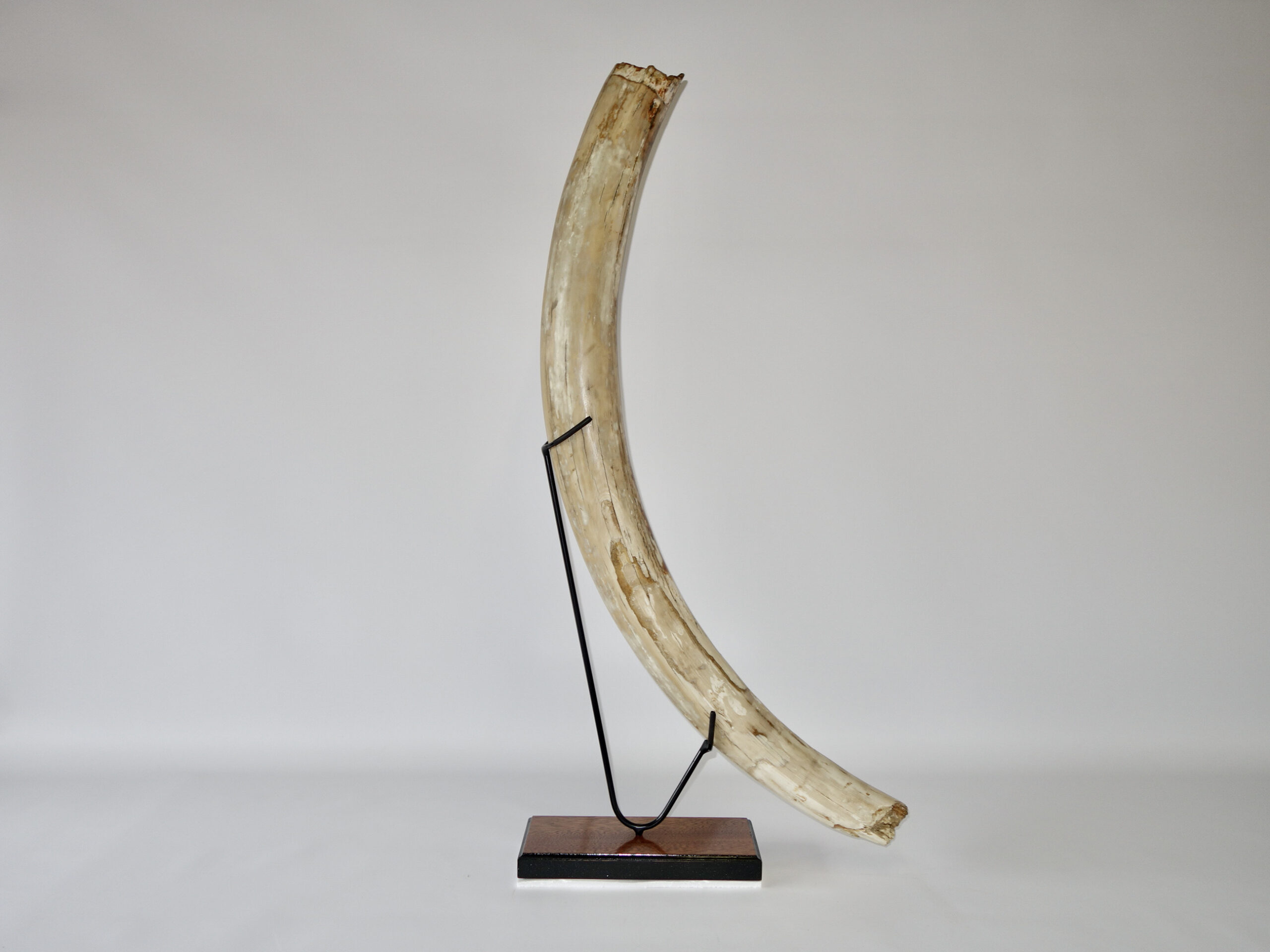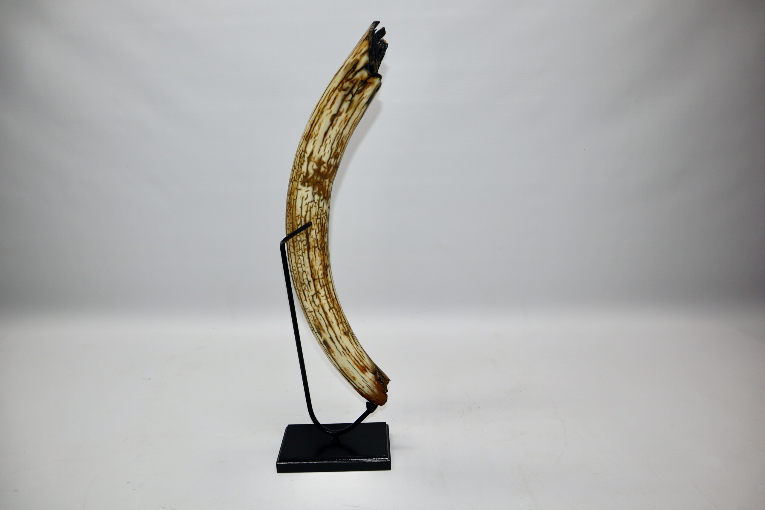 On offer is a fantastic half tusk of a Woolly Mammoth from the Pleistocene era. Although it is only a half tusk, otherwise it is in excellent condition as seen in the images. This is the middle part of the tusk, the base and tip are missing. A crack has been professionally repaired, otherwise no restoration whatsoever. This tusk piece is of beautiful ivory of mainly white, gold, grey, black and brown ivory, and with stunning patterning. Fantastic piece and highly recommended. The black and white section of the ruler in the image represents 10 cm / 3.9 inch. This piece has been applied with a matt finish, but it is also possible to order it with a glossy finish.