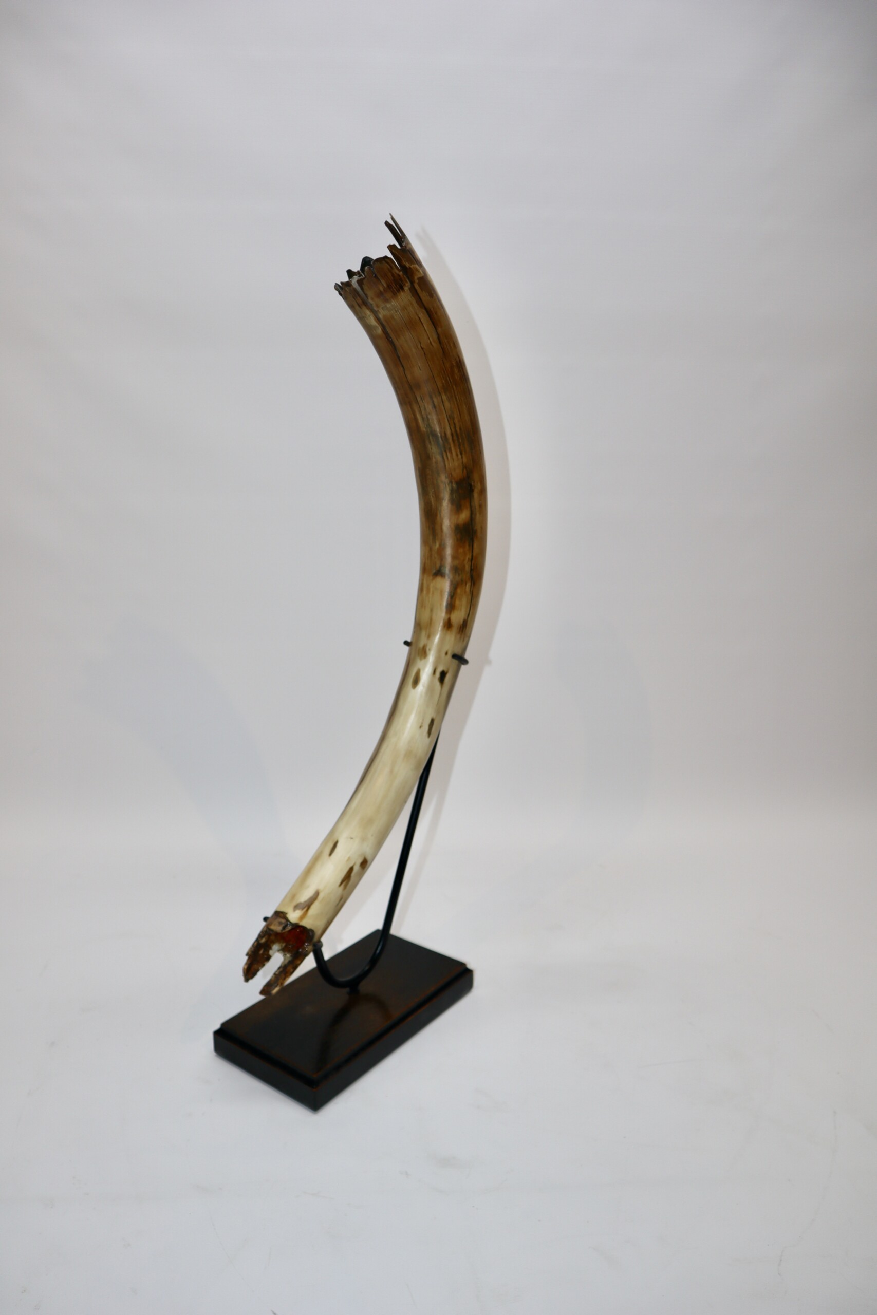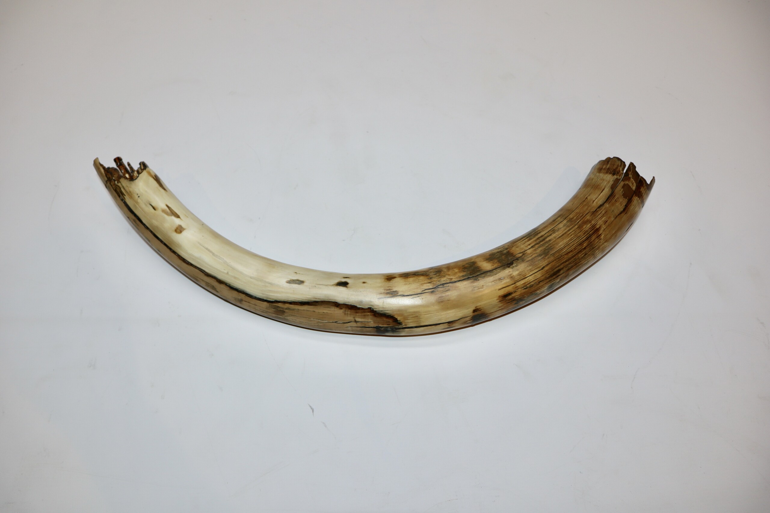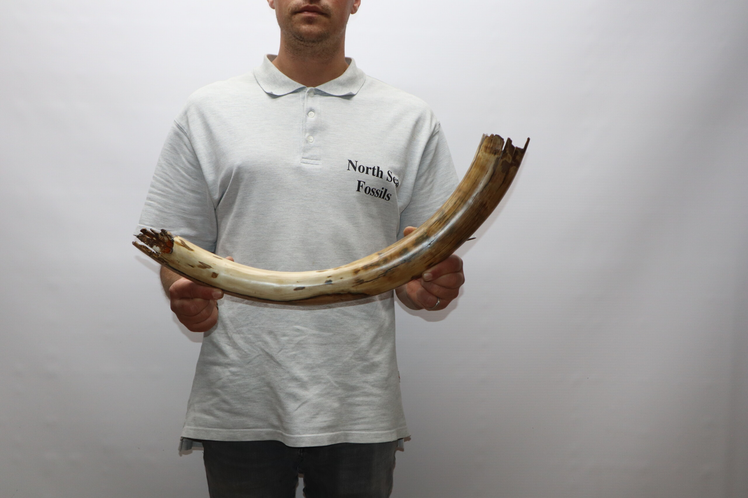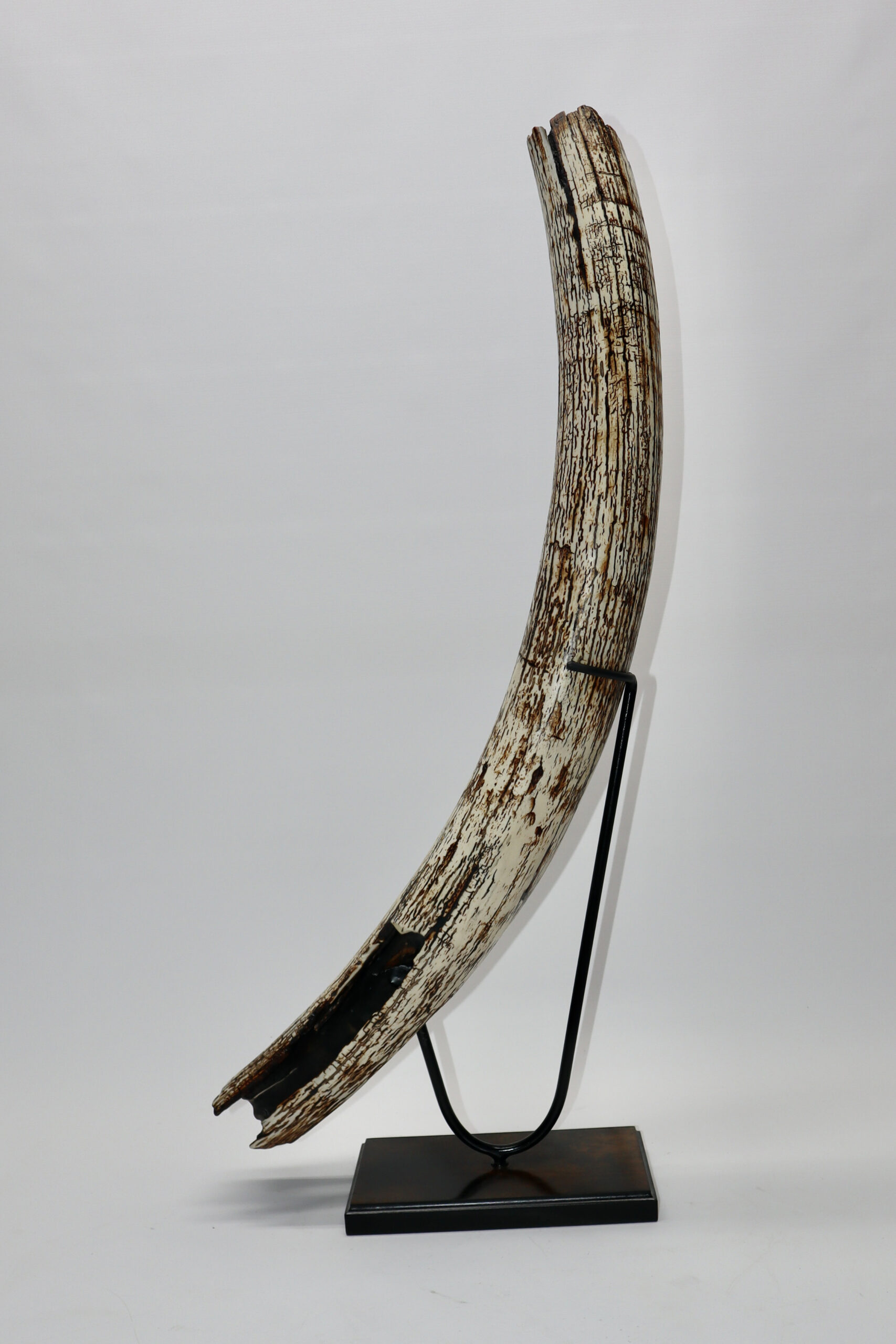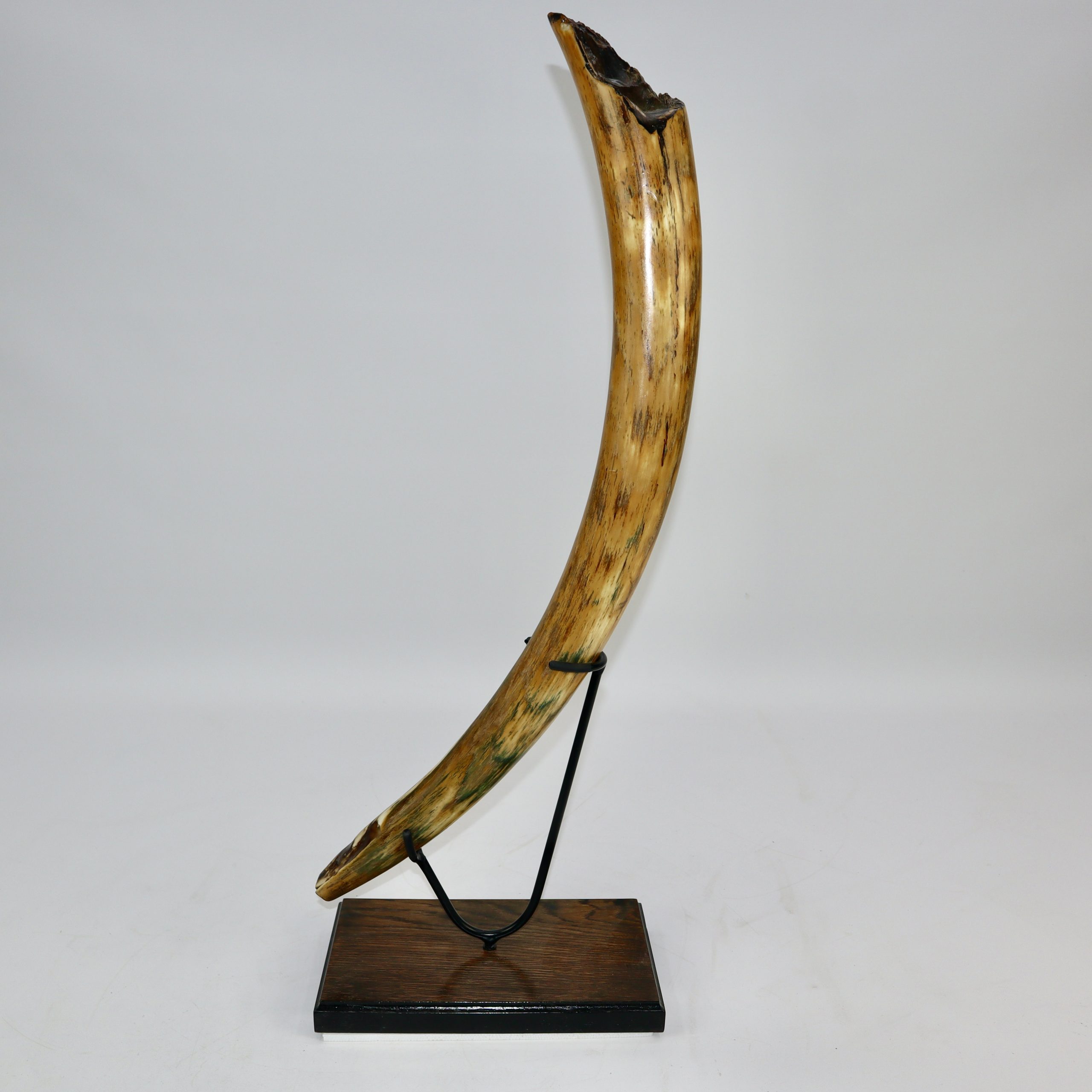 On offer is a fantastic half tusk of a Woolly Mammoth from the Pleistocene era. Although it is only a half tusk, otherwise it is in excellent condition as seen in the images. This is the middle part of the tusk, the base and tip are missing. A crack has been professionally repaired, otherwise no restoration whatsoever. This tusk piece is of beautiful ivory of mainly white, gold, grey and brown ivory, and with stunning patterning. Fantastic piece and highly recommended. The black and white section of the ruler in the image represents 10 cm / 3.9 inch. This piece has been applied with a matt finish, but it is also possible to order it with a glossy finish.