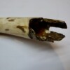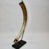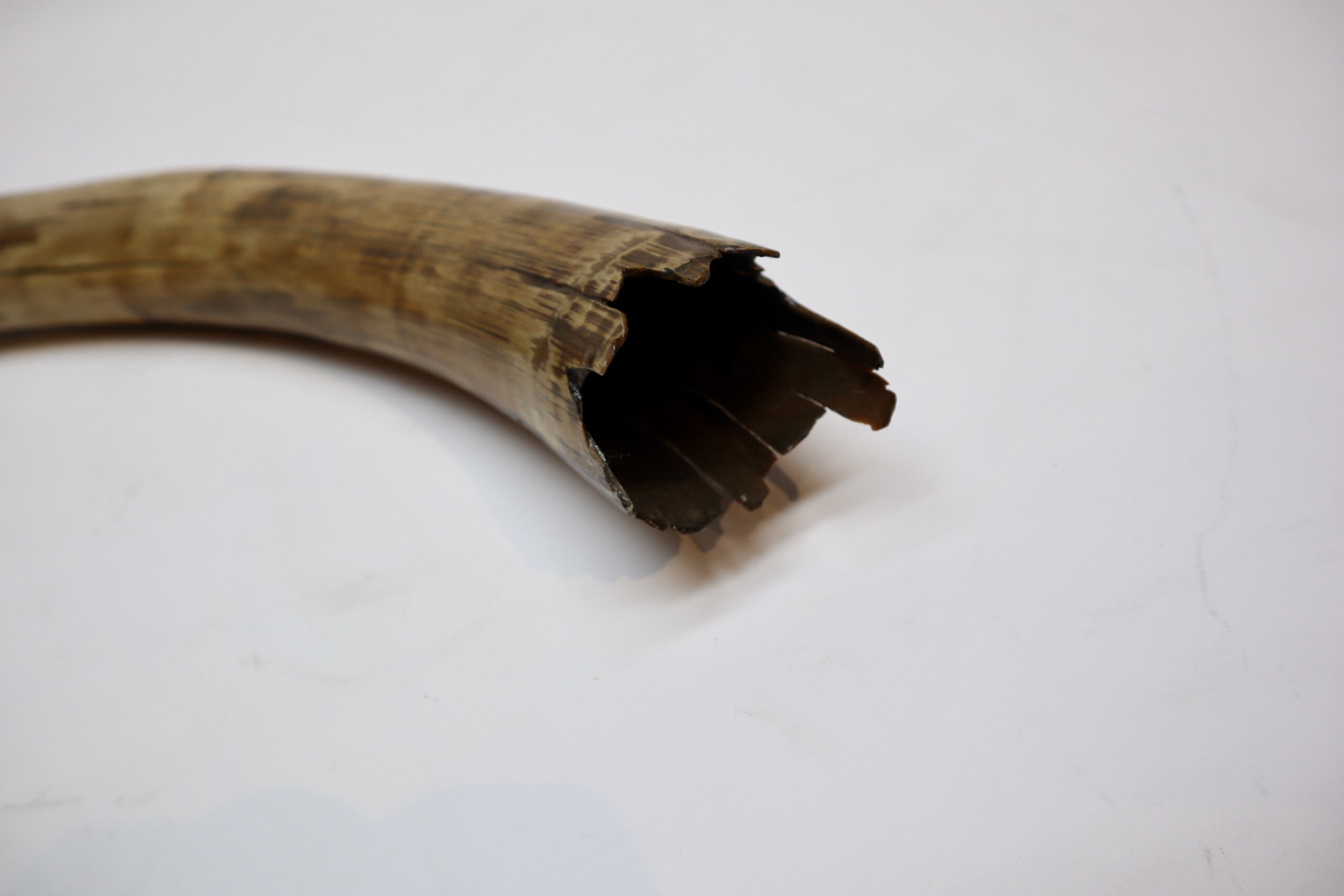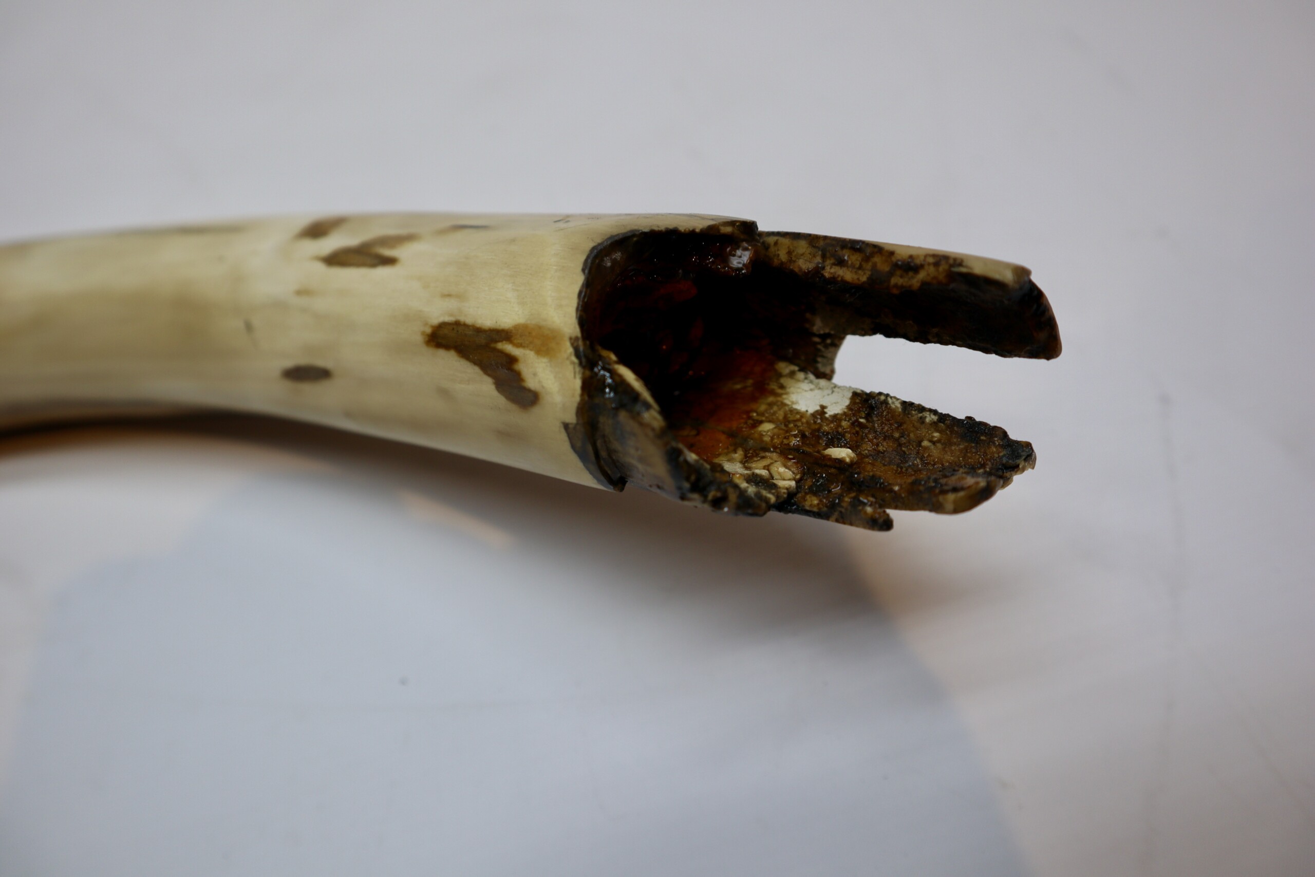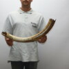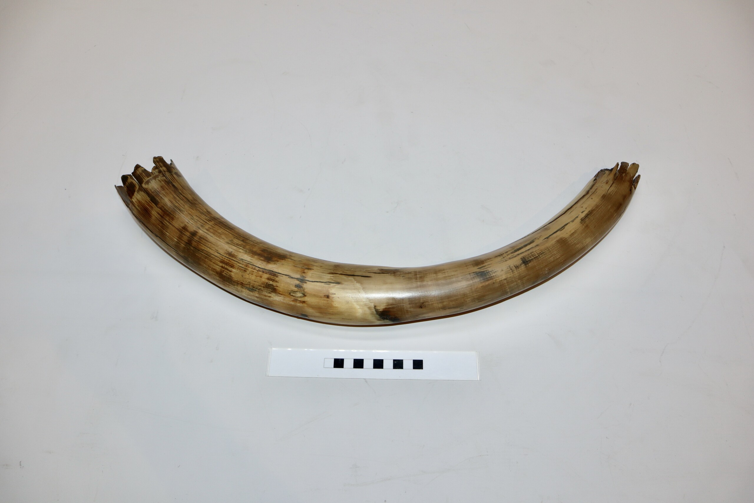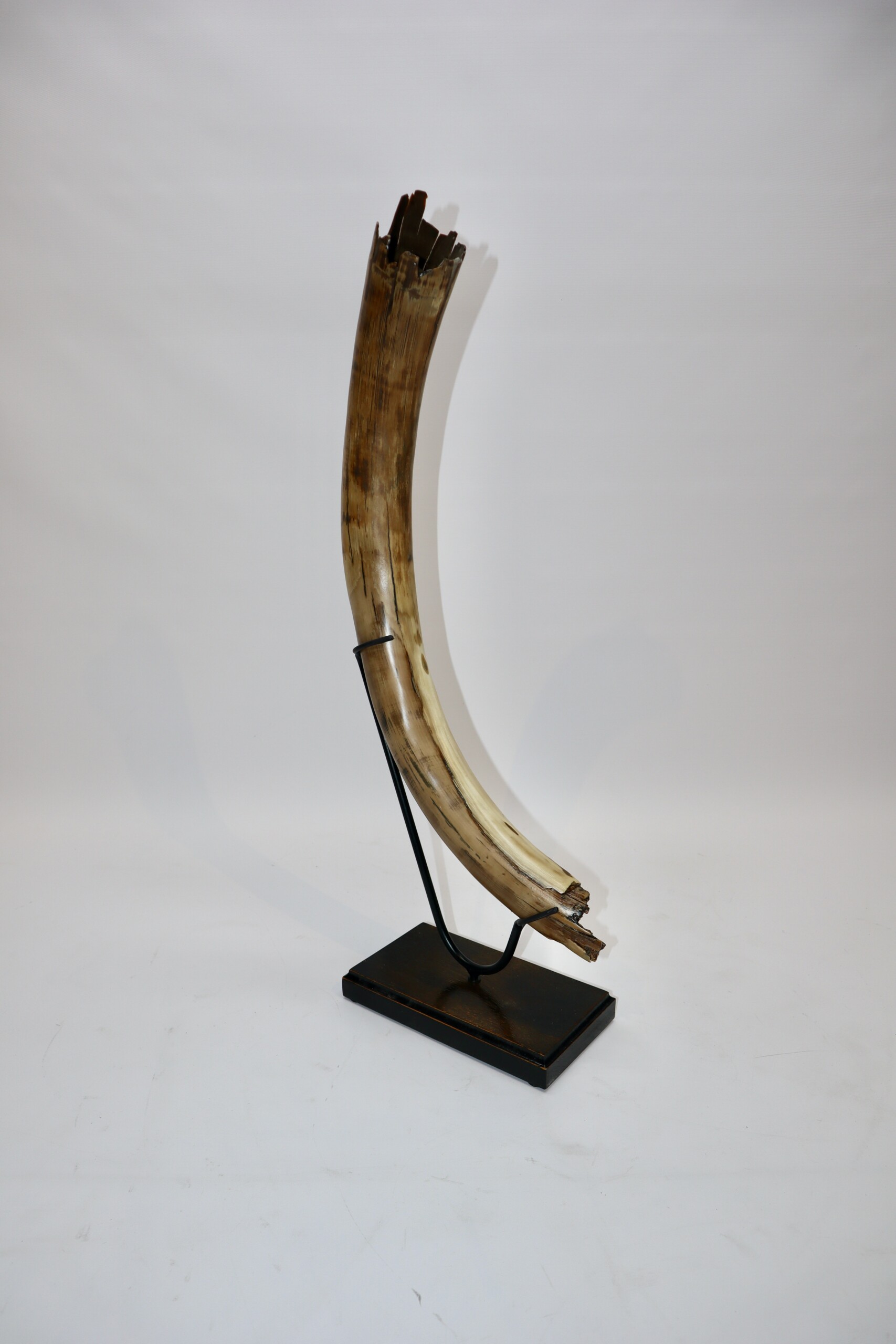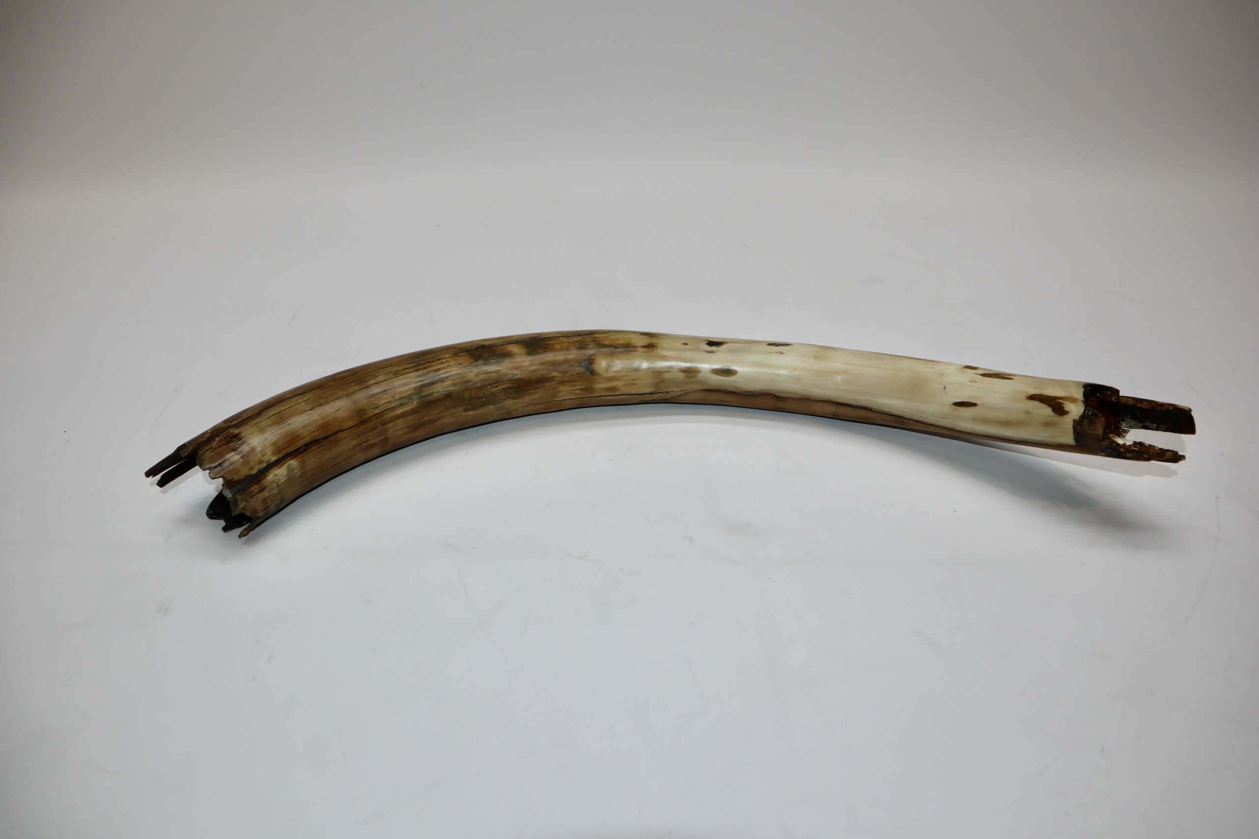 On offer is a fantastic half tusk of a Woolly Mammoth from the Pleistocene era. Although it is only a half tusk, otherwise it is in excellent condition as seen in the images. This is the middle part of the tusk, the base and tip are missing. A crack has been professionally repaired, otherwise no restoration whatsoever. This tusk piece is of beautiful ivory of mainly white, gold, grey and brown ivory, and with stunning patterning. Fantastic piece and highly recommended. The black and white section of the ruler in the image represents 10 cm / 3.9 inch. This piece has been applied with a matt finish, but it is also possible to order it with a glossy finish.