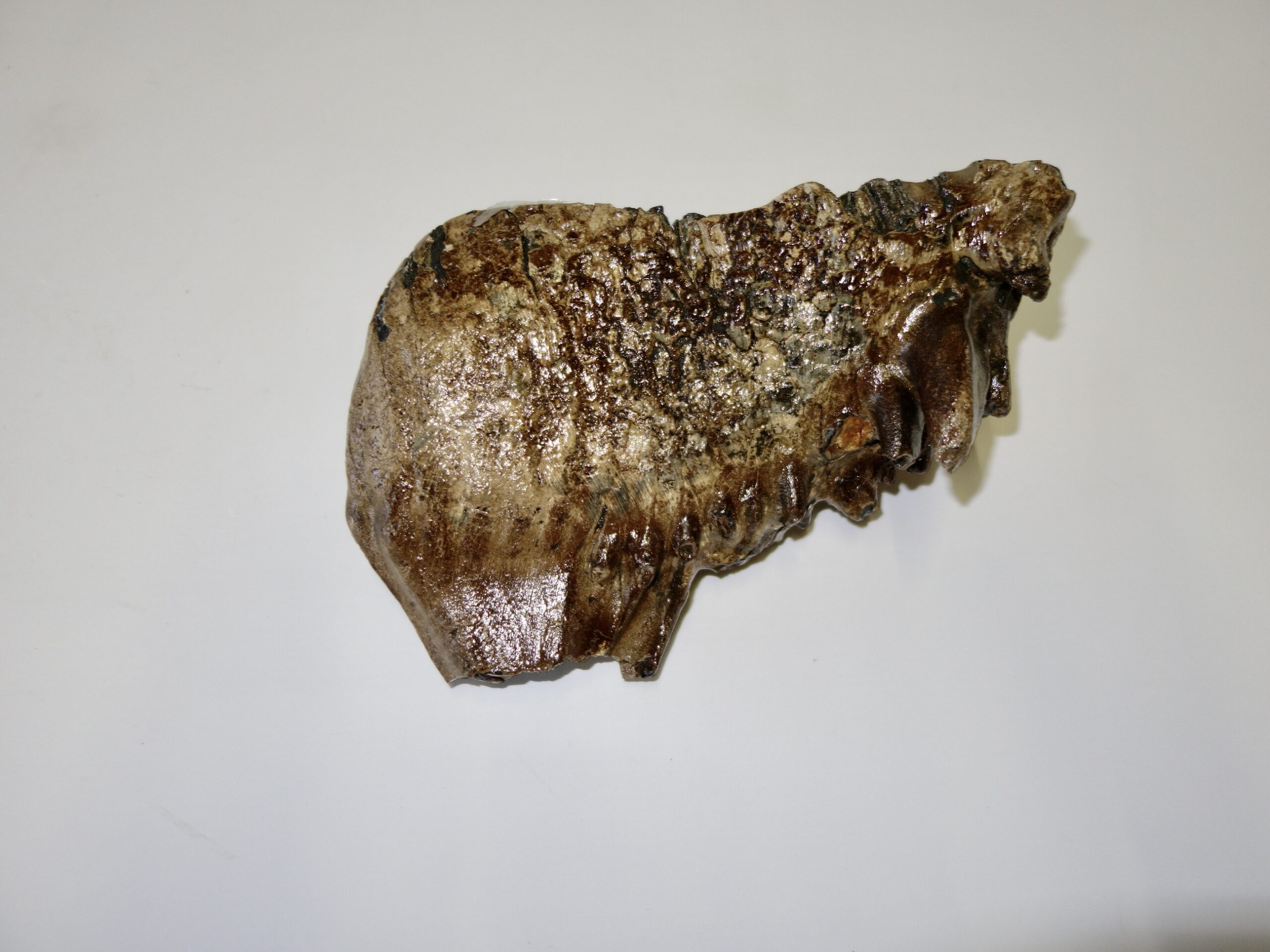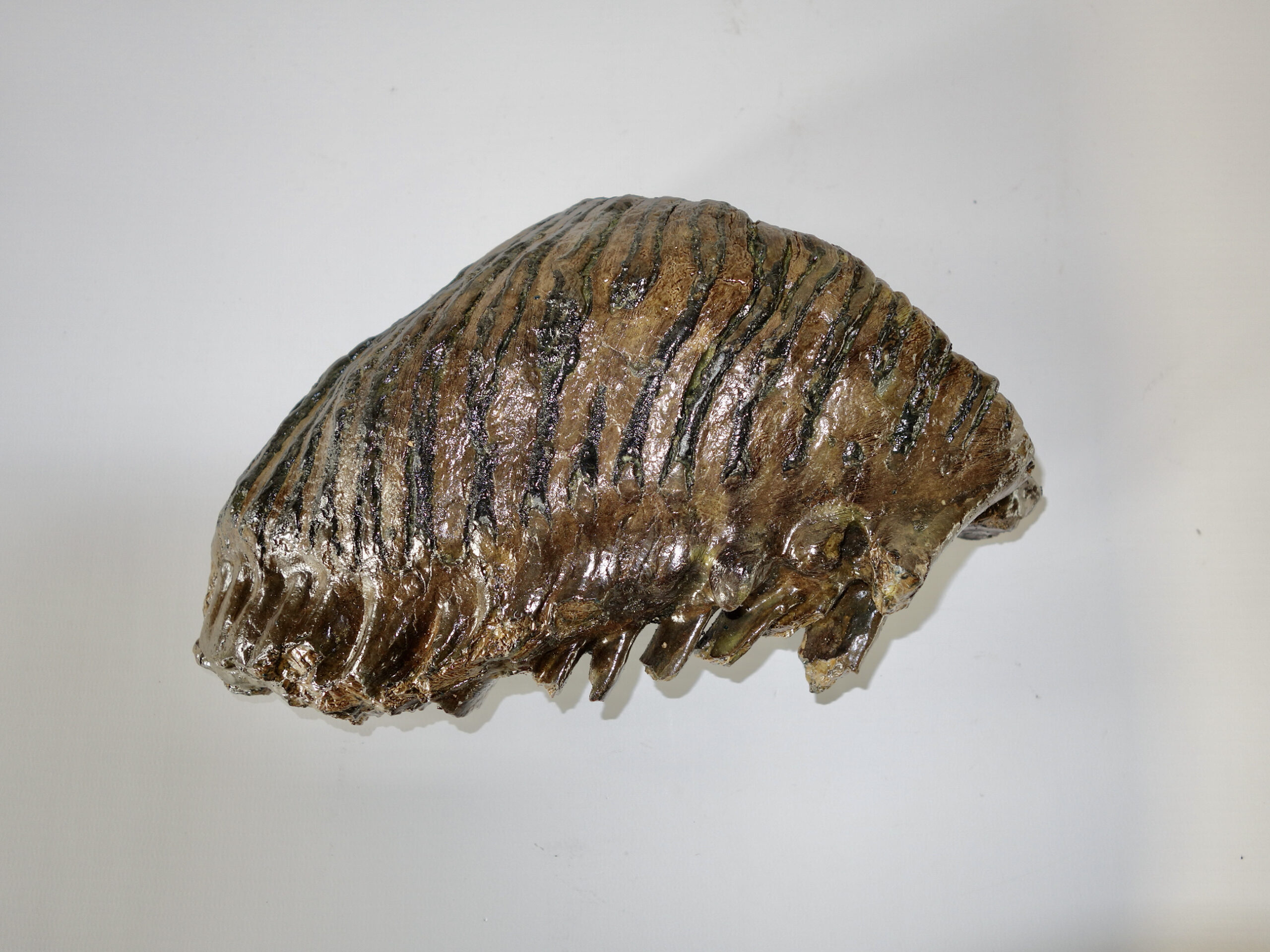On offer is a beautiful M3 molar of an adult Woolly Mammoth from the Pleistocene era. This molar comes from the right lower jaw. Fantastic quality tooth with beautiful chewing surface. Wonderful state of preservation, as seen in the images, and no restoration whatsoever. Judging from the size, this molar belonged to an adult Mammoth. The black and white section of the ruler in the image represents 10 cm / 3.9 inch.