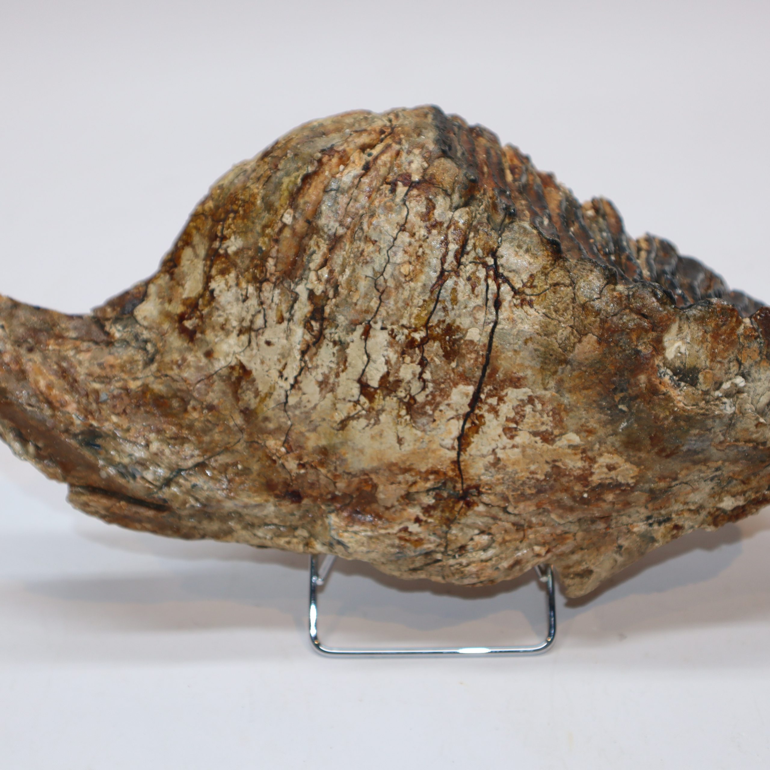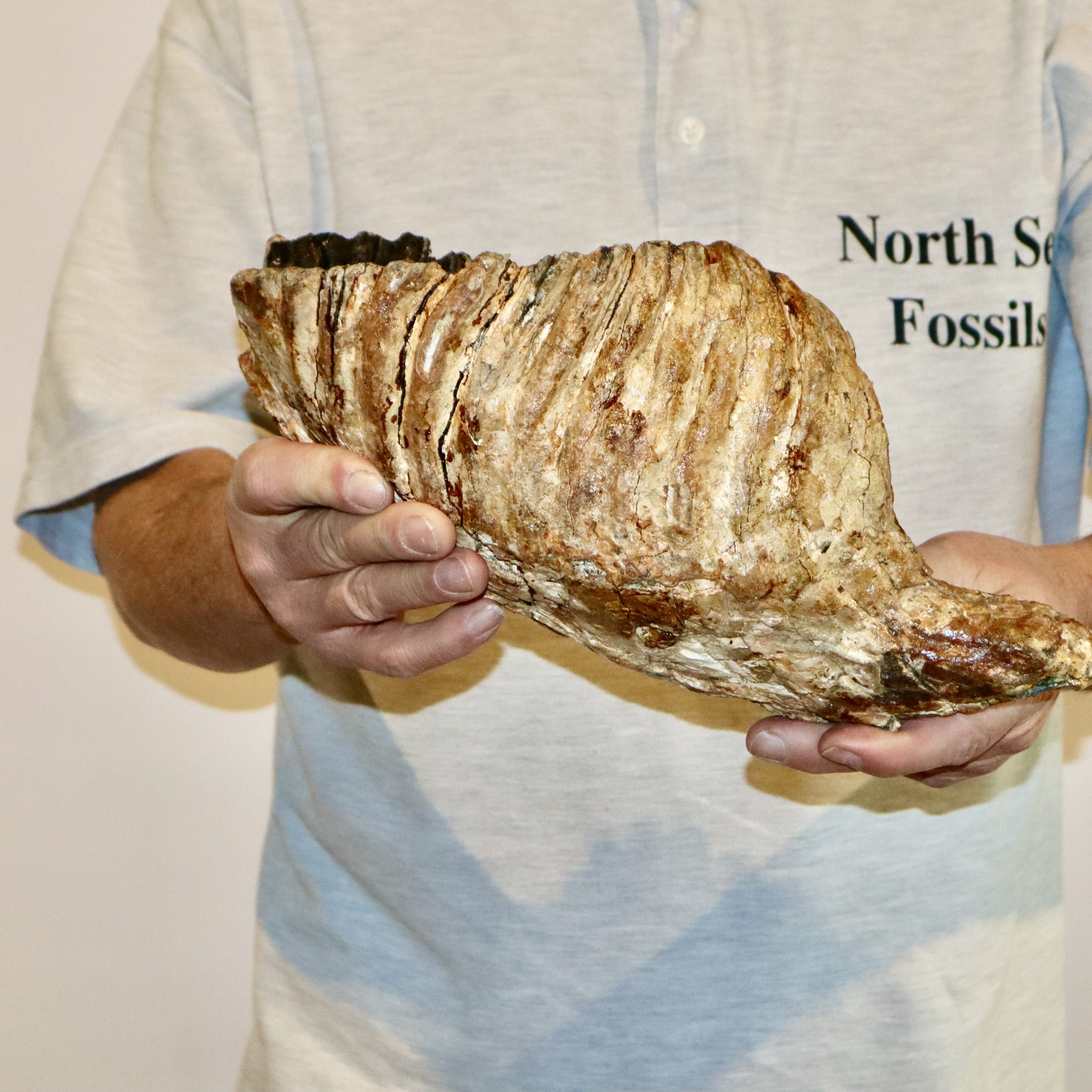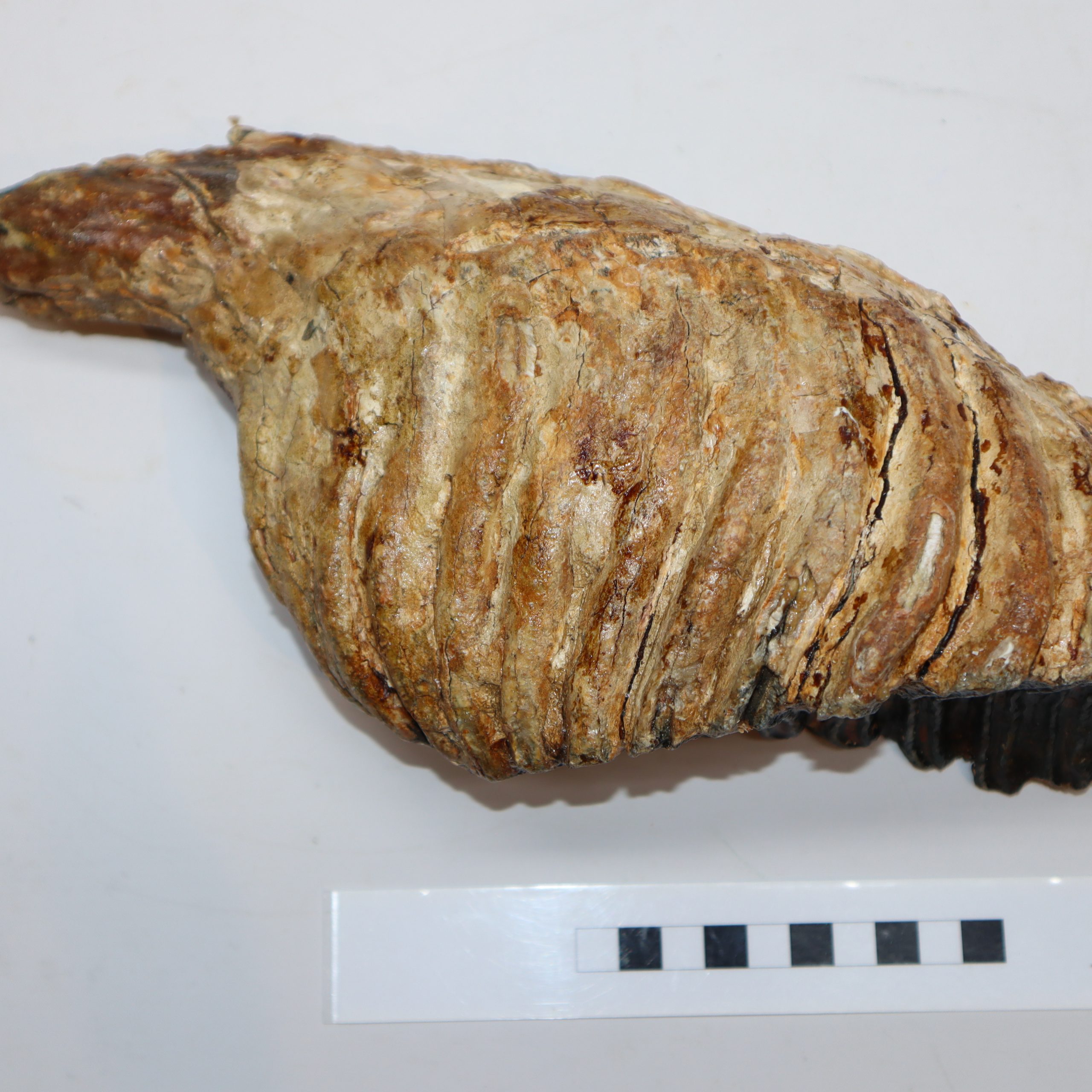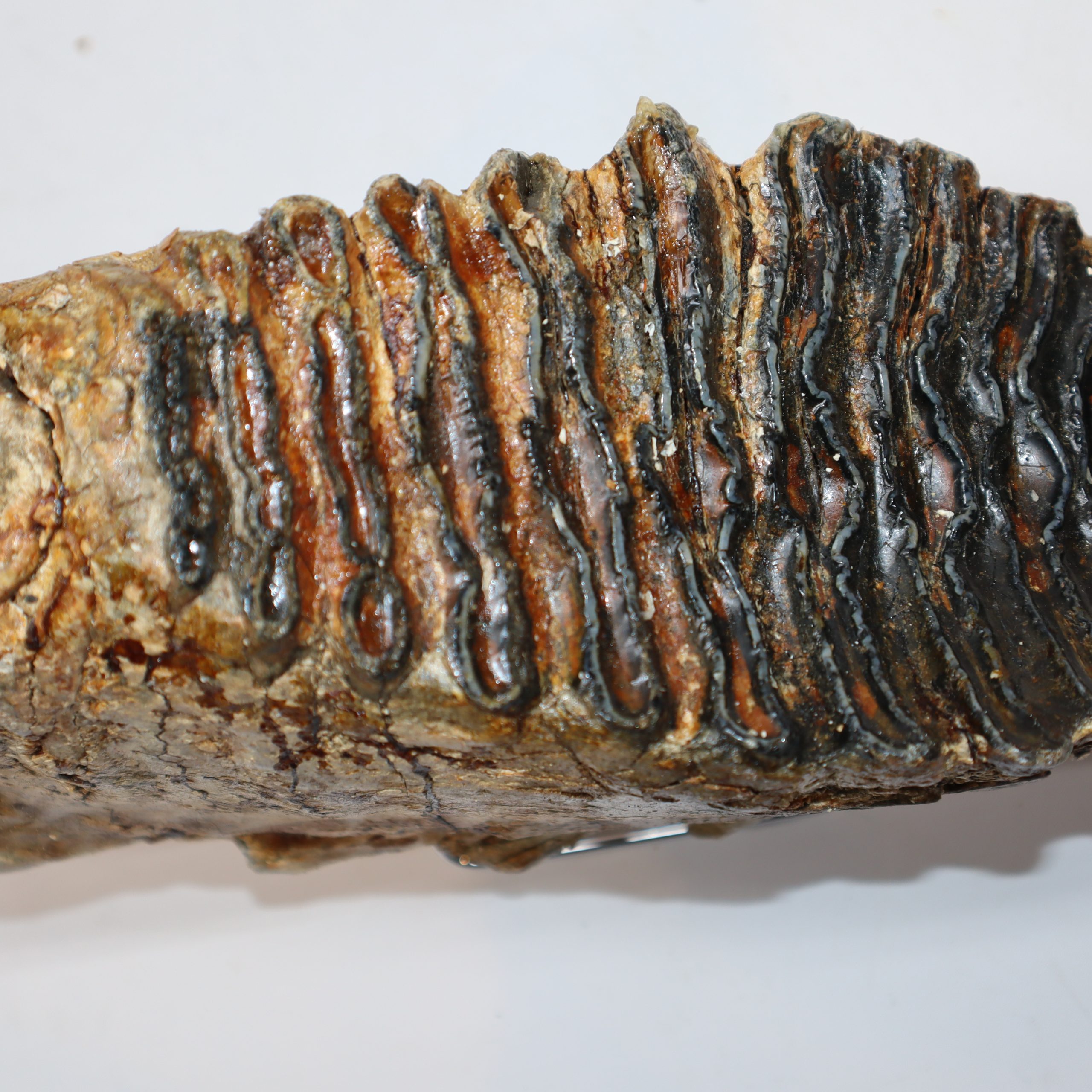 On offer is a beautiful M3 molar of an adult Woolly Mammoth from the Pleistocene era. This molar comes from the left lower jaw and is a goodย example of a fully grown animal. Good state state of preservation as seen in the images. Judging from the amount of wear, this molar belonged to an old animal, which had reached the end of its life. No restoration whatsoever. The black and white section of the ruler in the image represents 10 cm / 3.9 inch.