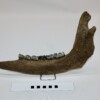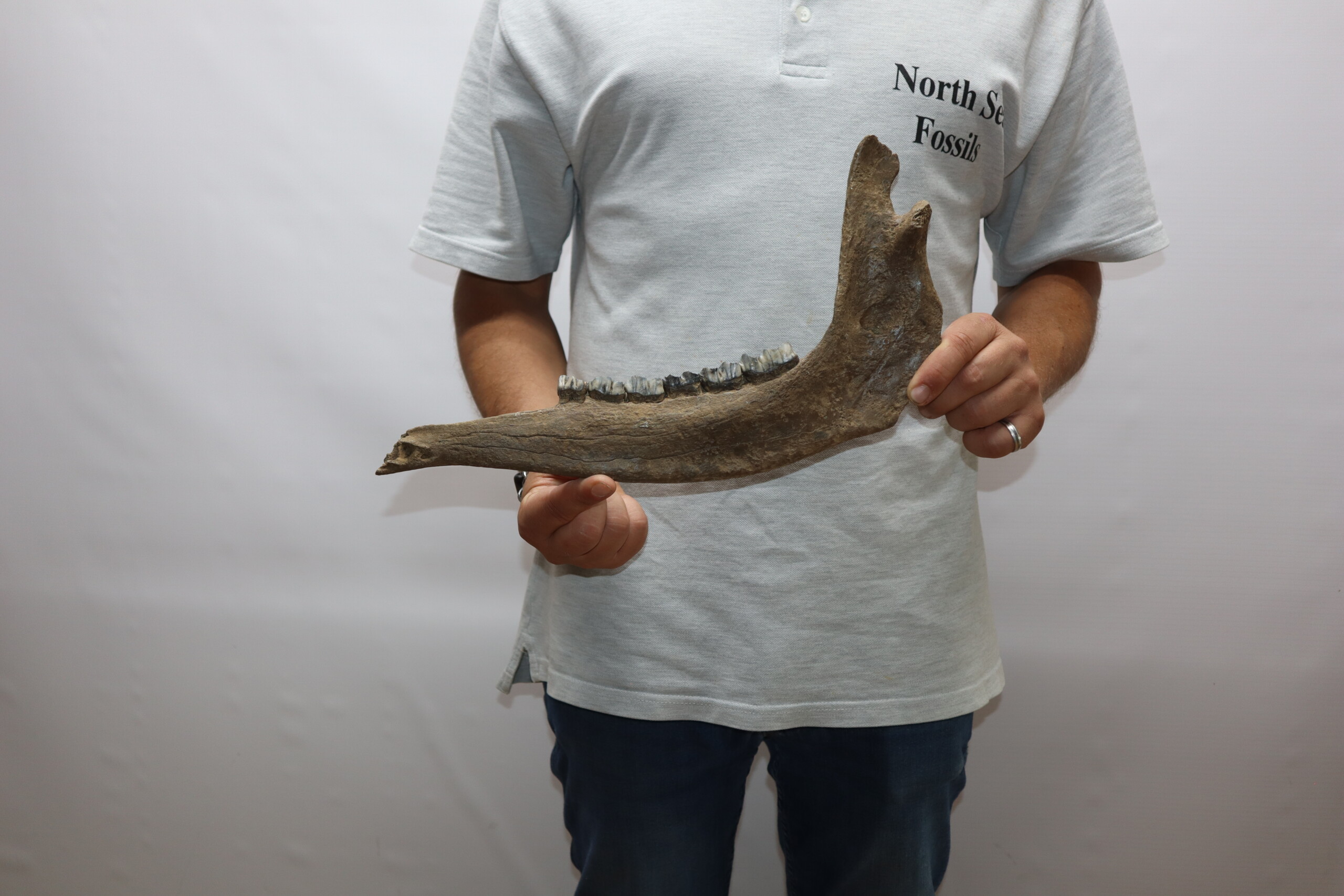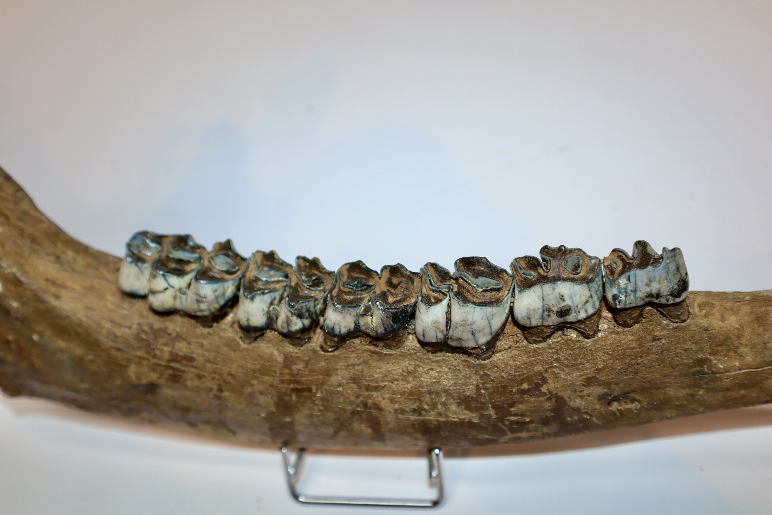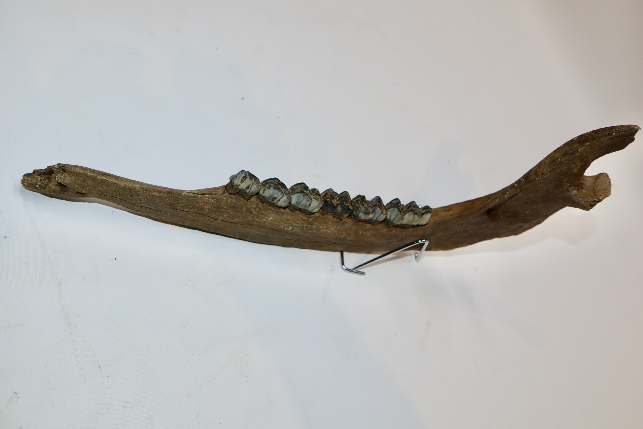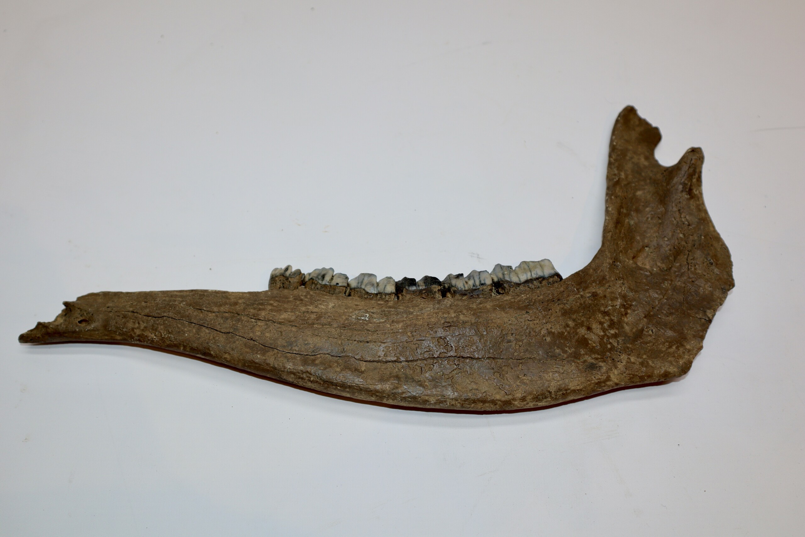 On offer is a beautiful partial lower jaw of an adult moose from the Pleistocene era. Although only partially preserved, this jaw still has many wonderful details of anatomy, as seen in the images. Six of the original molars survive. No restoration whatsoever. Interesting and exceptionally rare item. Judging from the size, this belonged to an adult animal. Moose material is much rarer than Mammoth fossils. The black and white section of the ruler in the image represents 10 cm / 3.9 inch.