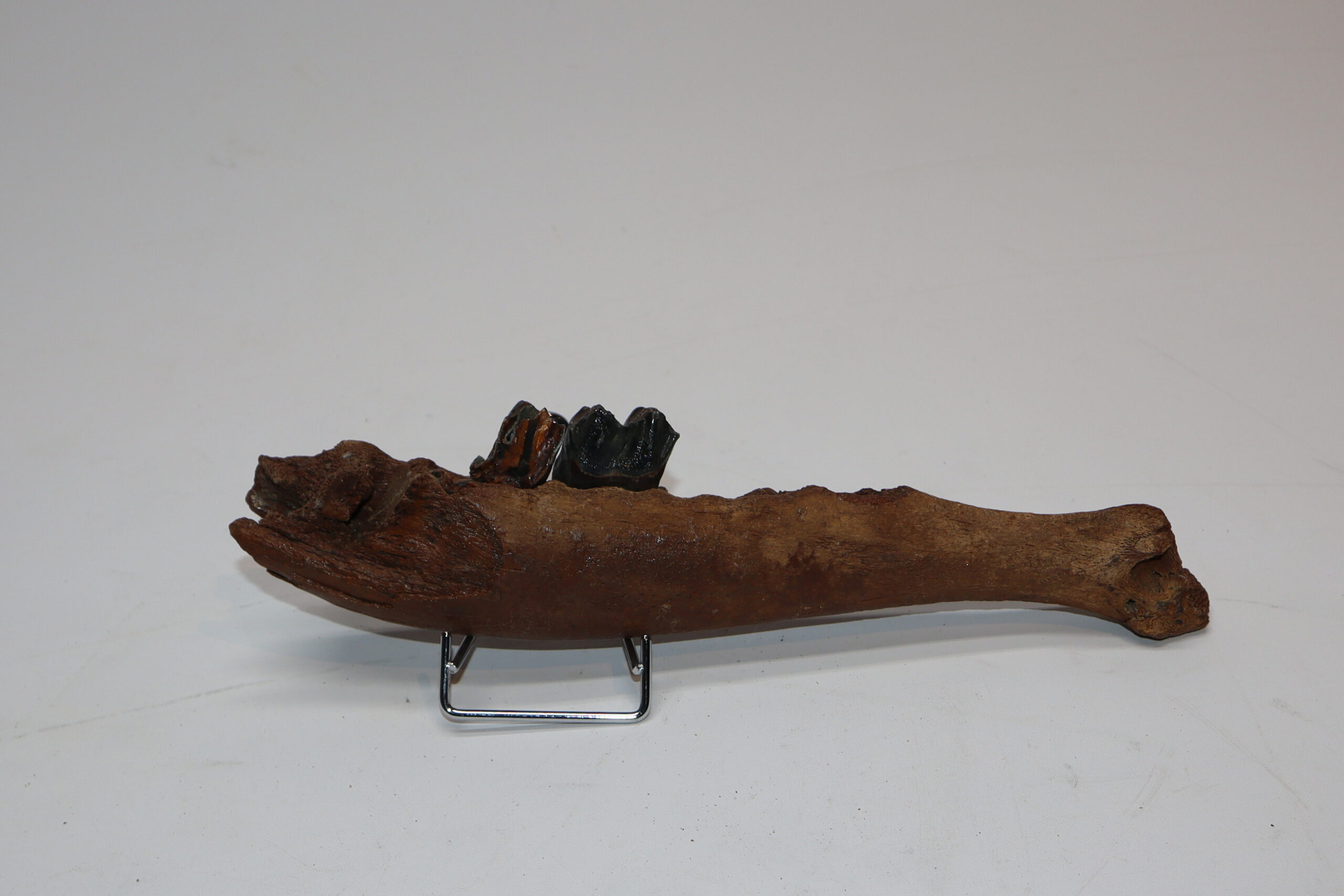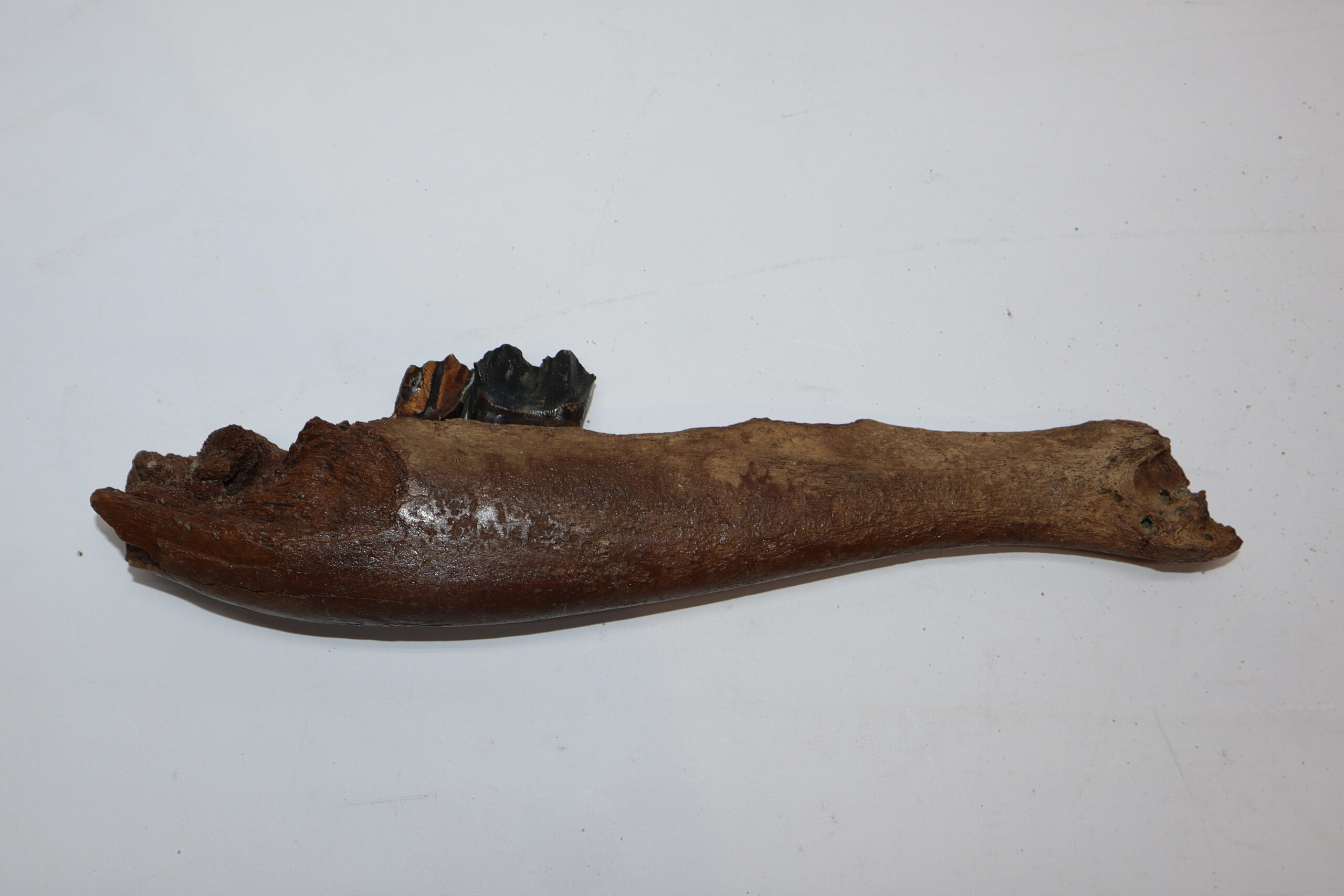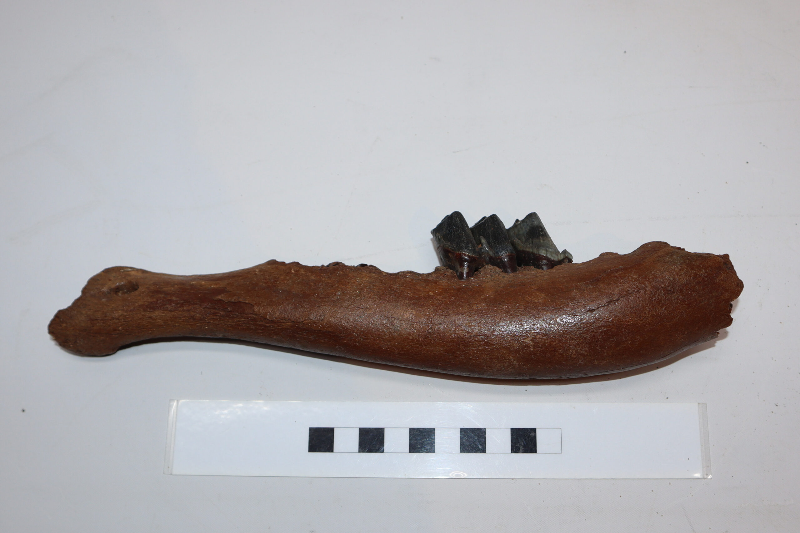 Irish elk was one of the most impressive creatures of all Ice age fauna, its enormous antlers being very sought after. On offer is a good partial lower jaw of this fantastic animal, in good condition, as seen in the images. This jaw still includes one of the original molars. No restoration whatsoever. The black and white section of the ruler in the image represents 10 cm / 3.9 inch.