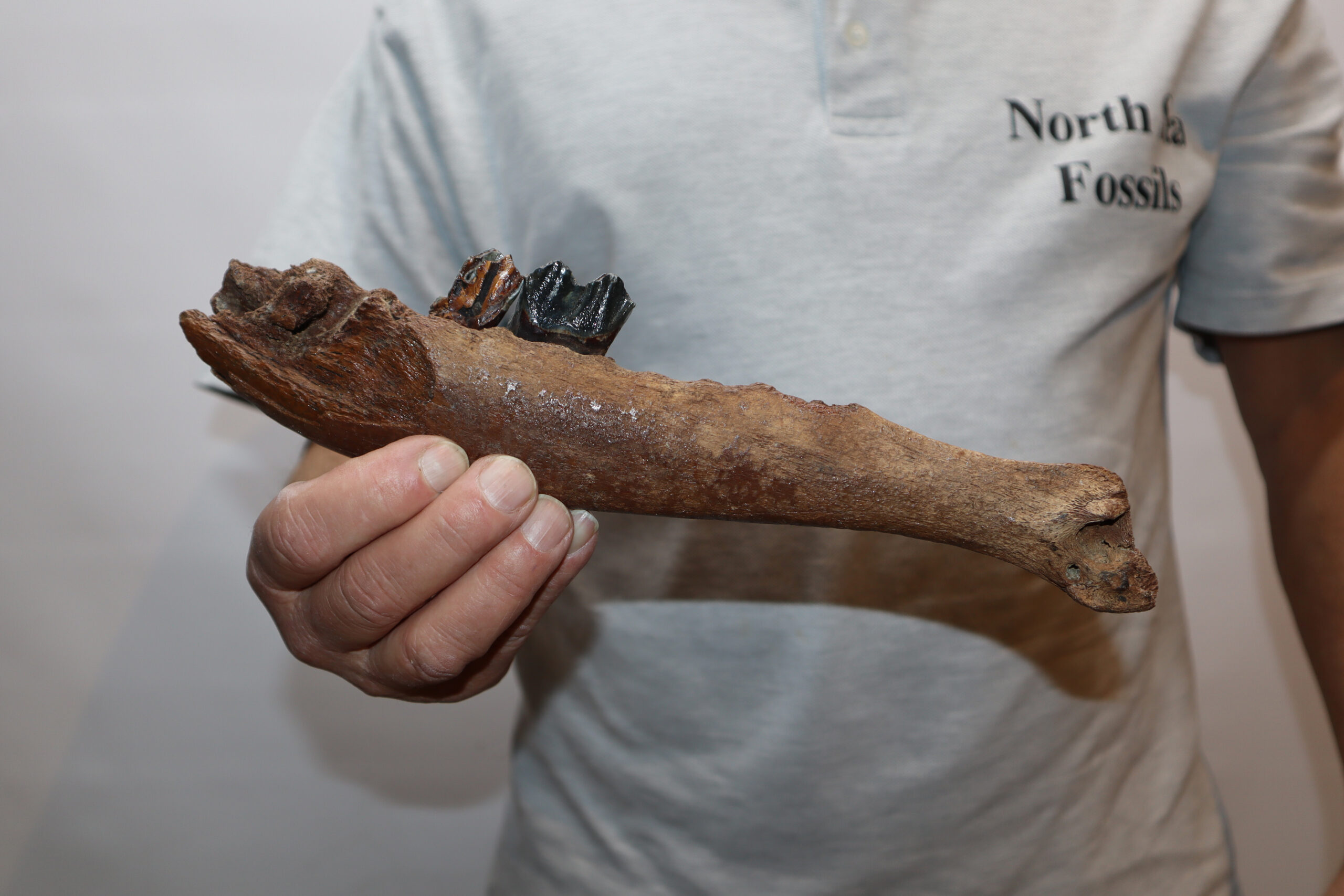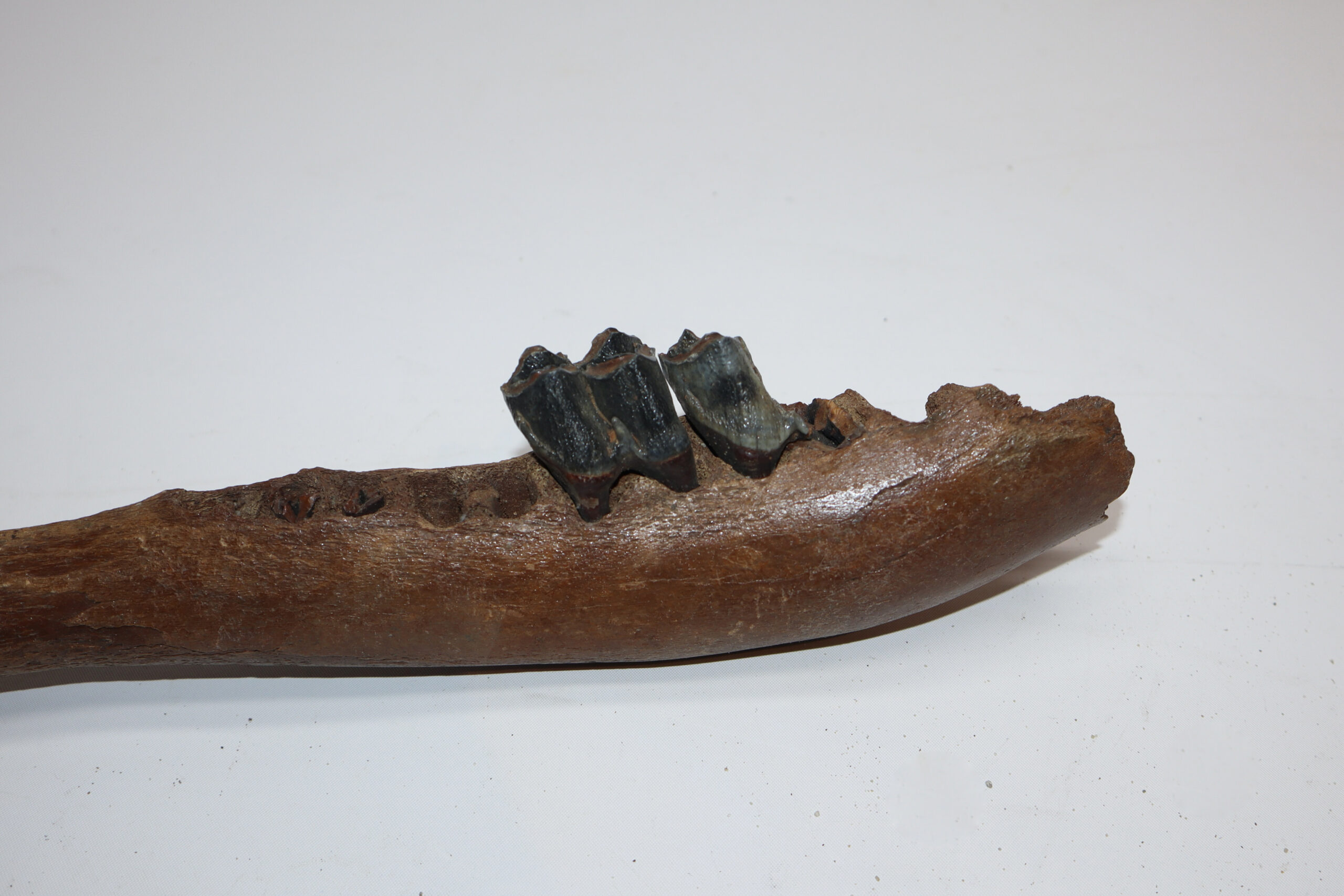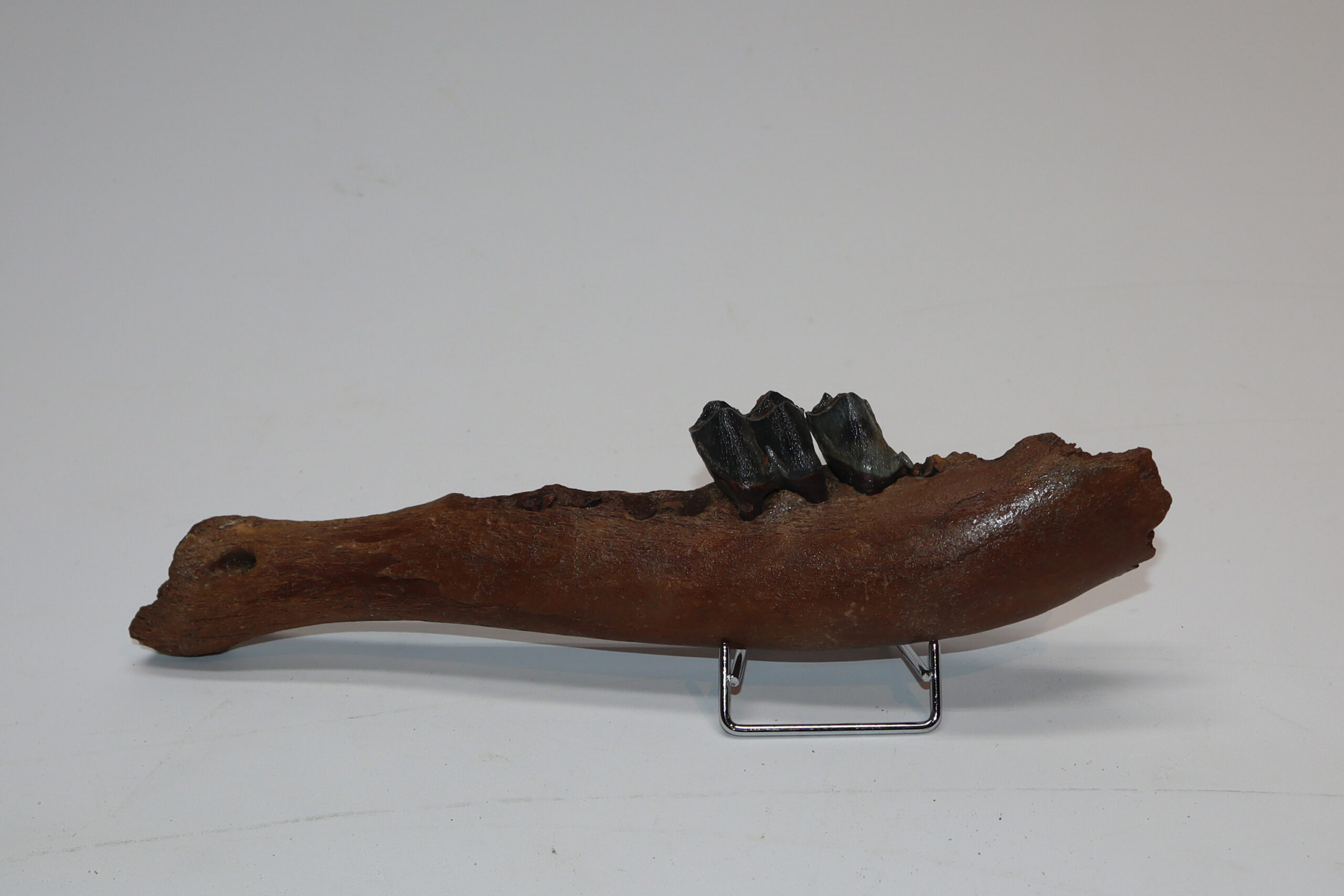 Irish elk was one of the most impressive creatures of all Ice age fauna, its enormous antlers being very sought after. On offer is a good partial lower jaw of this fantastic animal, in good condition, as seen in the images. This jaw still includes one of the original molars. No restoration whatsoever. The black and white section of the ruler in the image represents 10 cm / 3.9 inch.