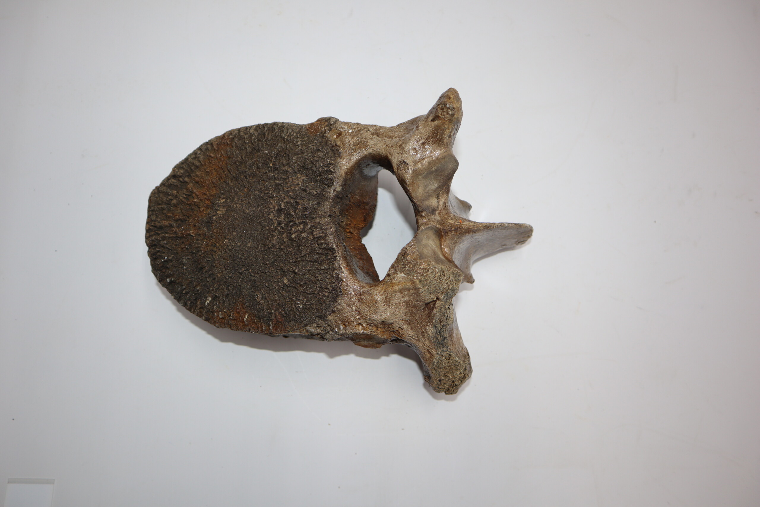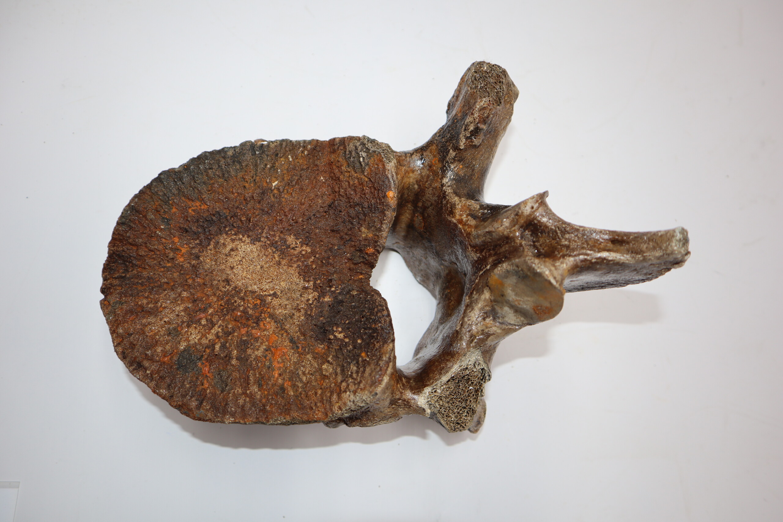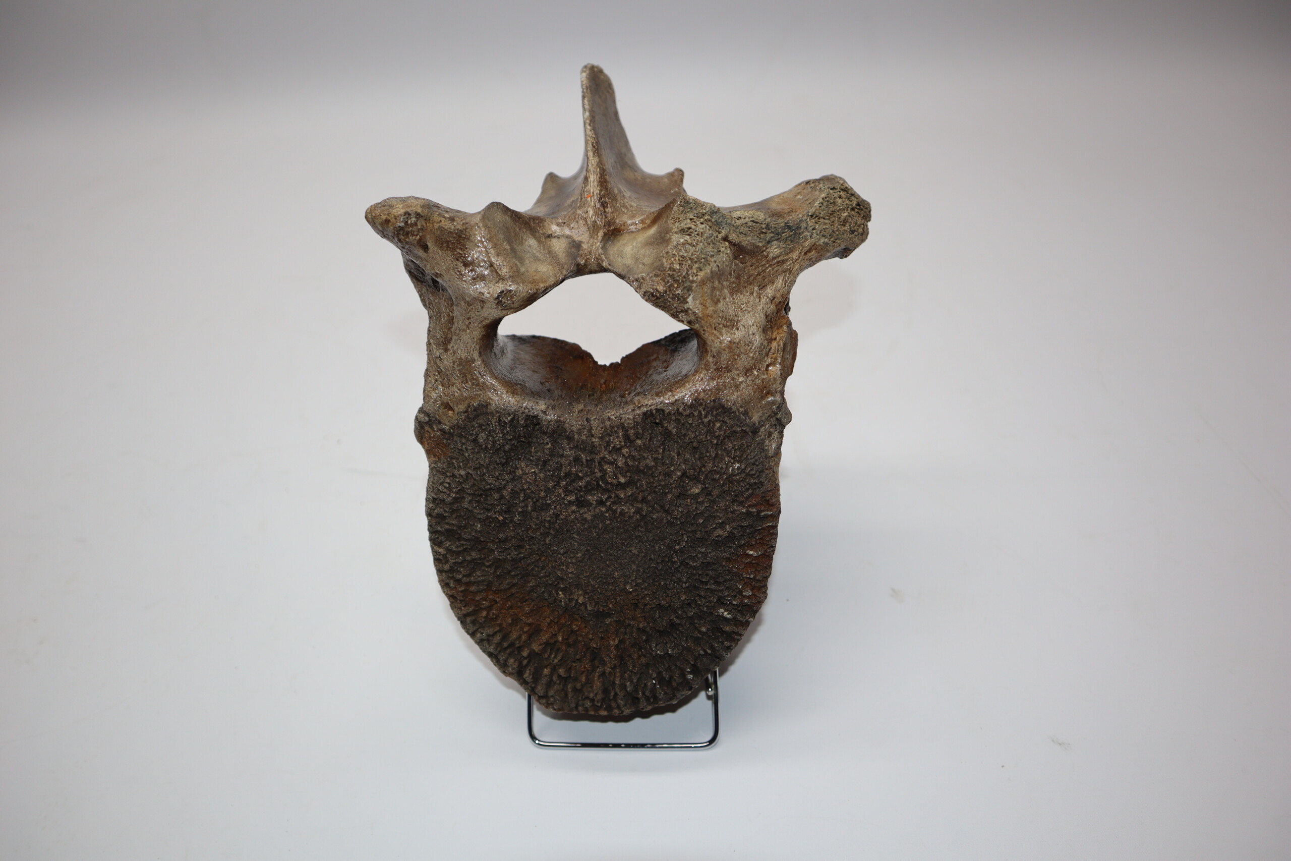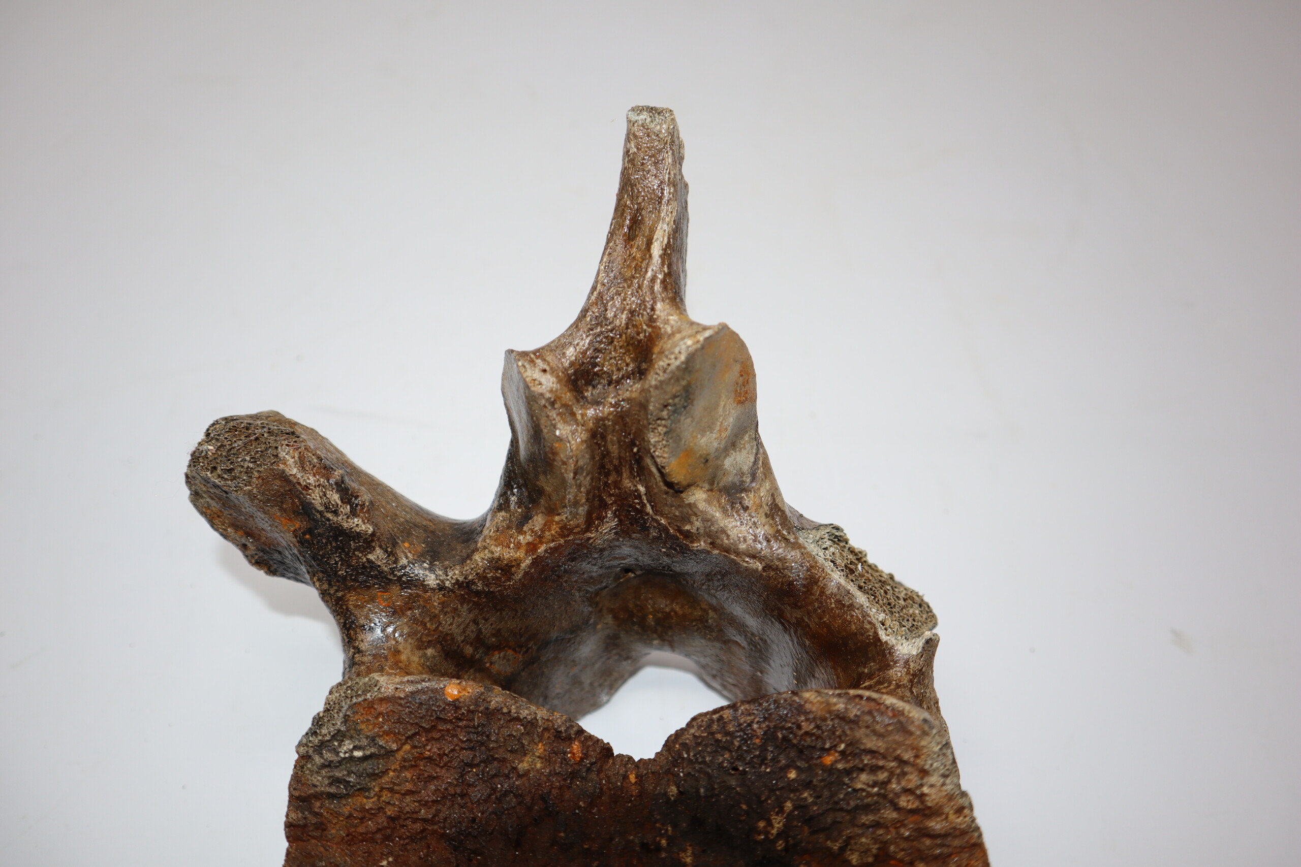 On offer is a beautiful partial thoracic vertebra of a Woolly Mammoth from the Pleistocene era. The Mammoth’s thoracic vertebrae were located in the chest area of the spinal cord. This example is in good condition with only a few usual minor damages, as seen in the photographs. No restoration whatsoever. Judging from the size, this belonged to an adult animal. The black and white section of the ruler in the image represents 10 cm / 3.9 inch.