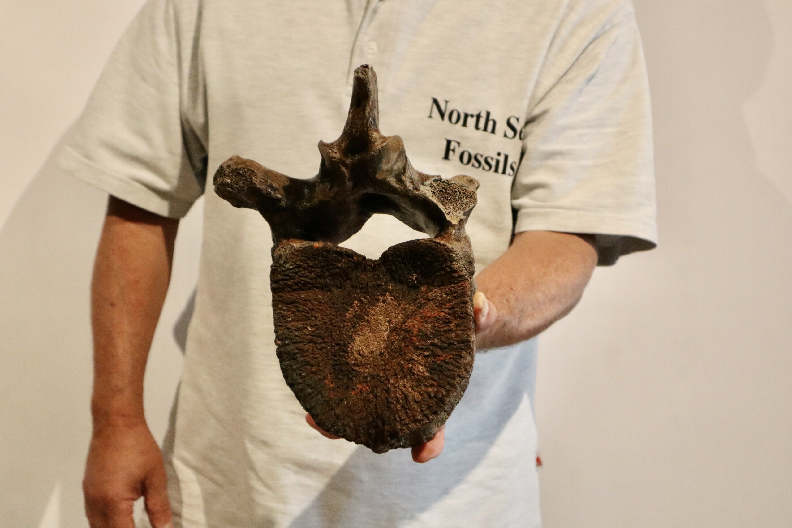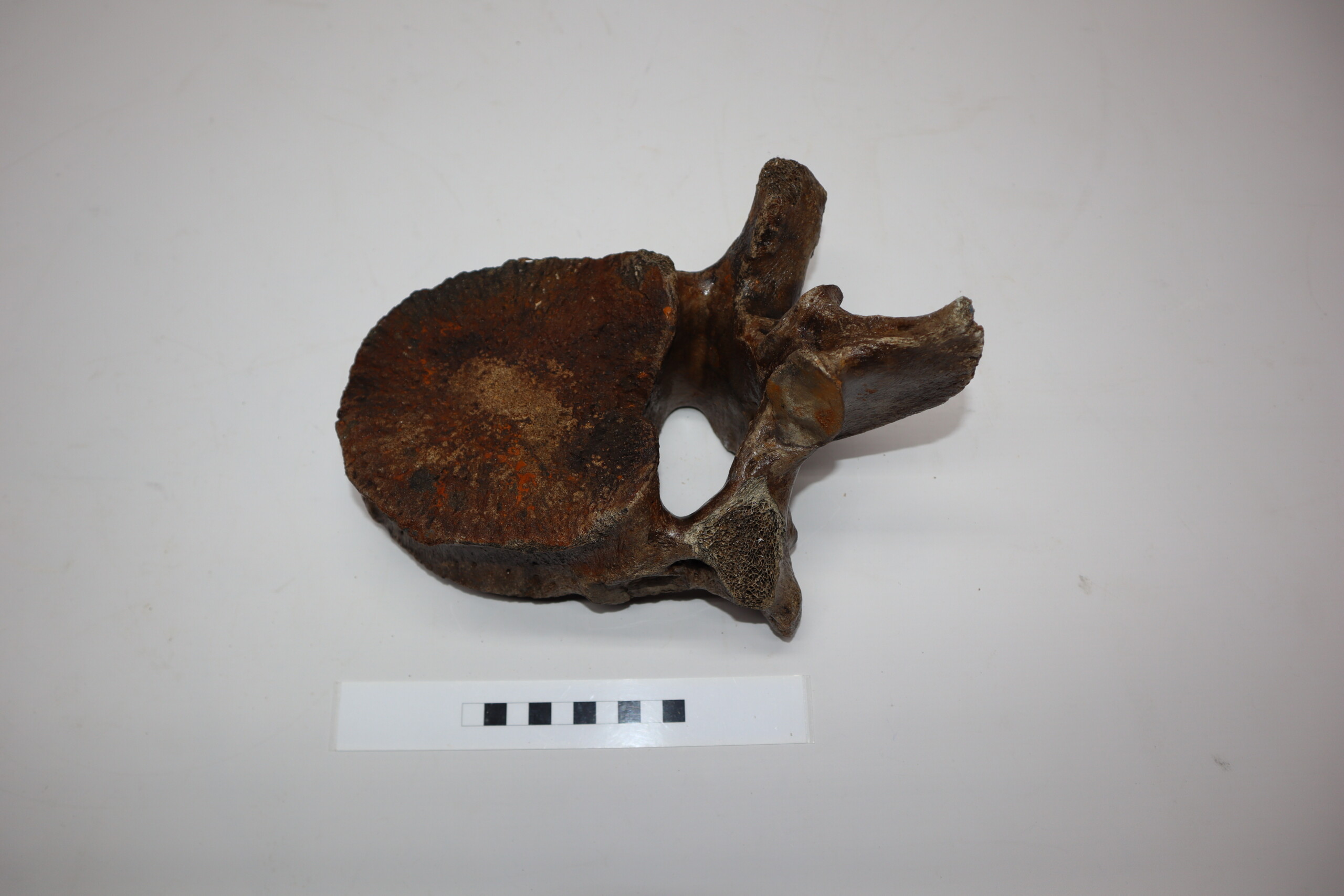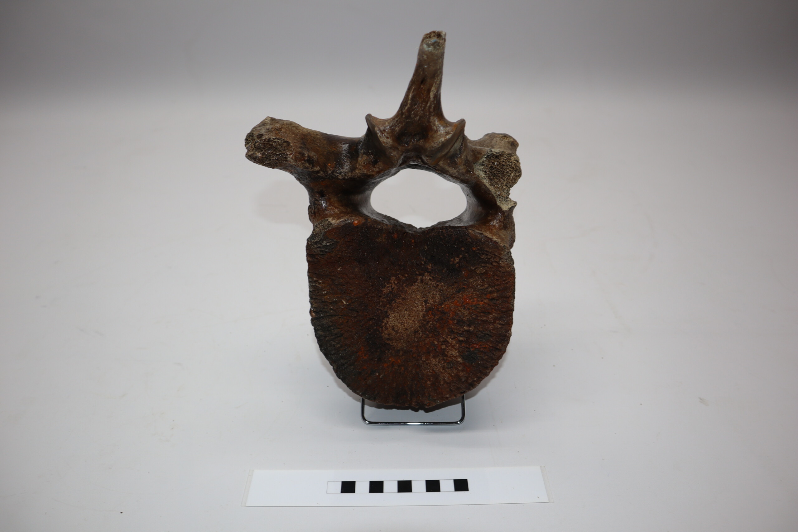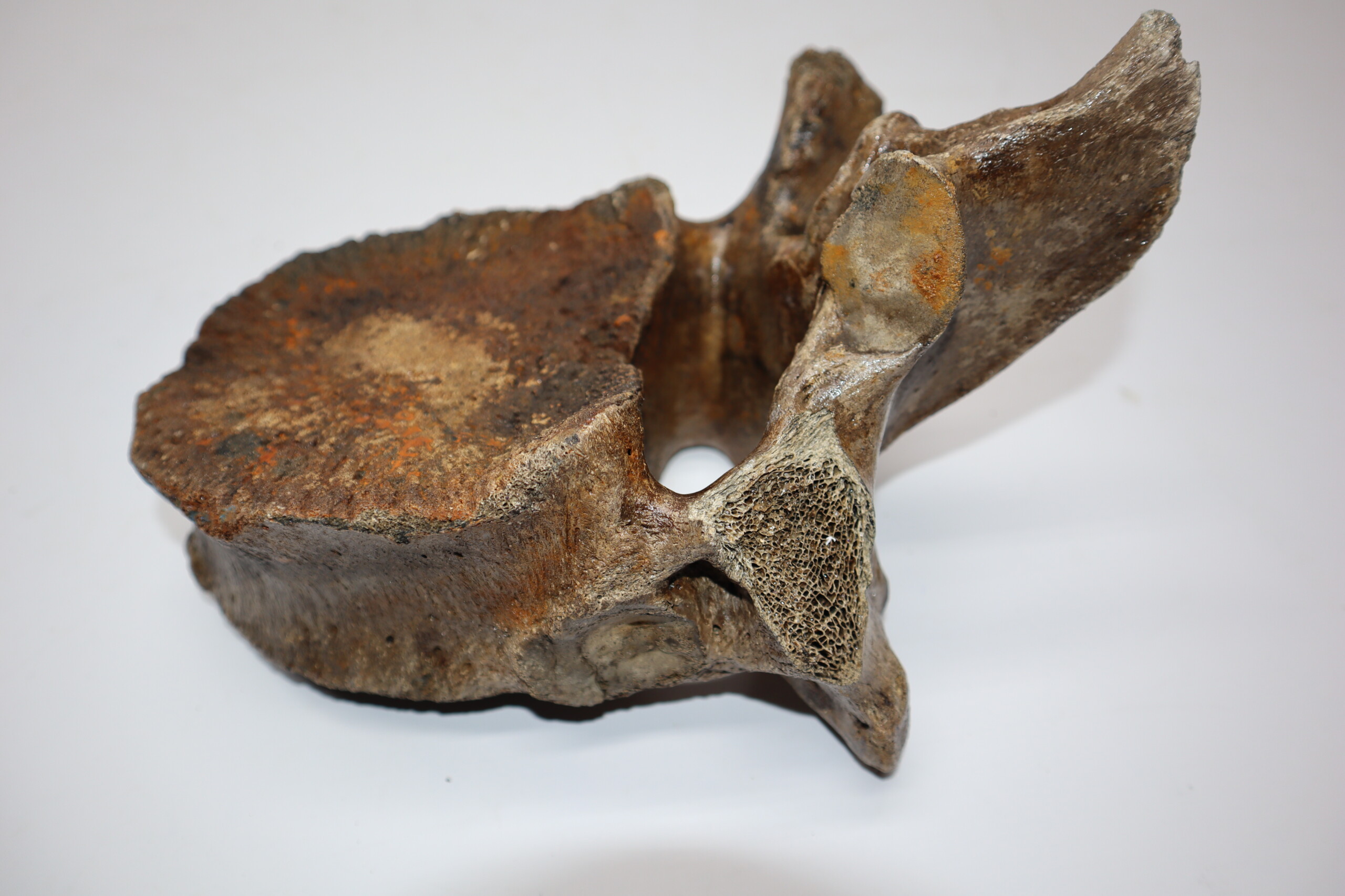 On offer is a beautiful partial thoracic vertebra of a Woolly Mammoth from the Pleistocene era. The Mammoth’s thoracic vertebrae were located in the chest area of the spinal cord. This example is in good condition with only a few usual minor damages, as seen in the photographs. No restoration whatsoever. Judging from the size, this belonged to an adult animal. The black and white section of the ruler in the image represents 10 cm / 3.9 inch.