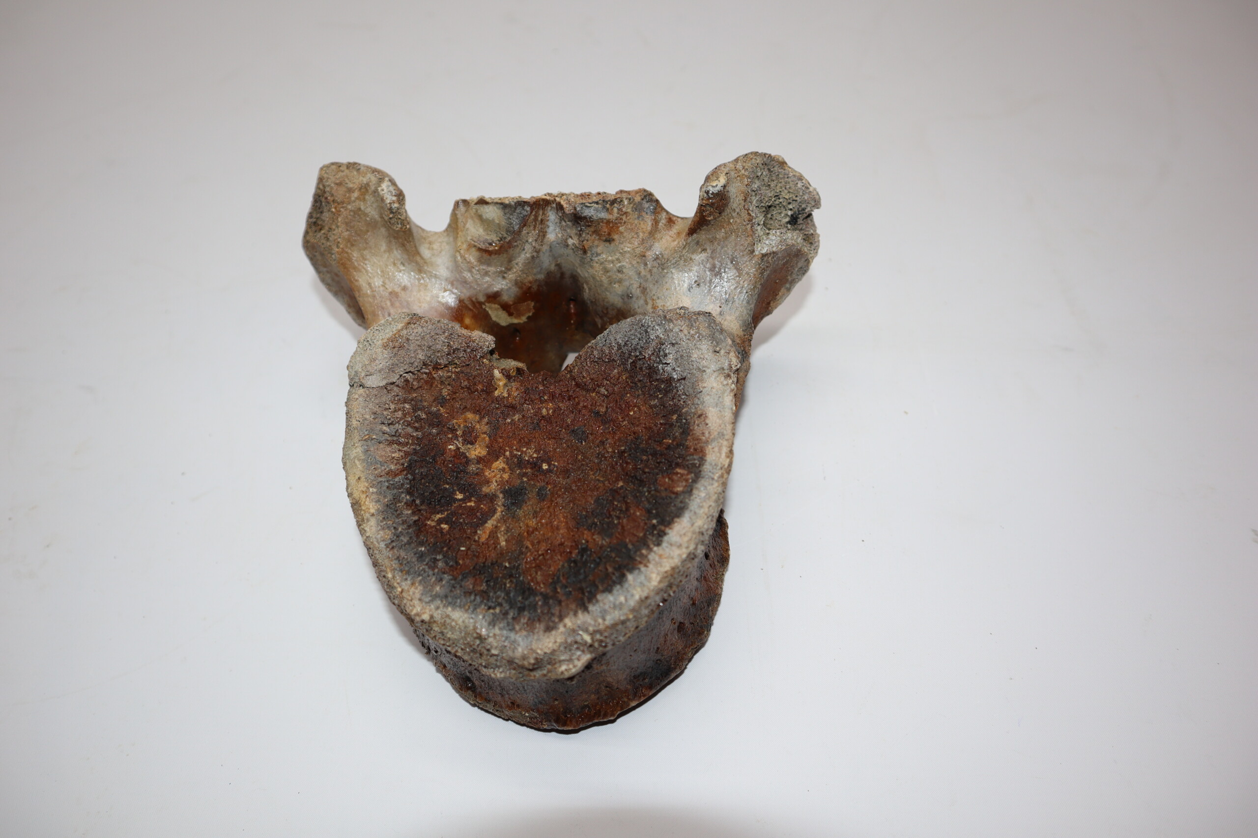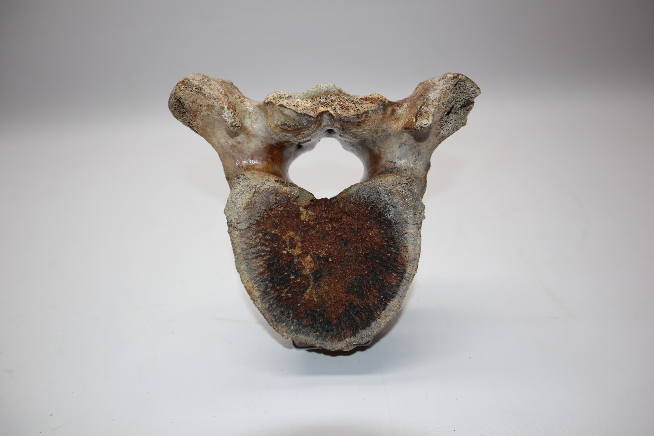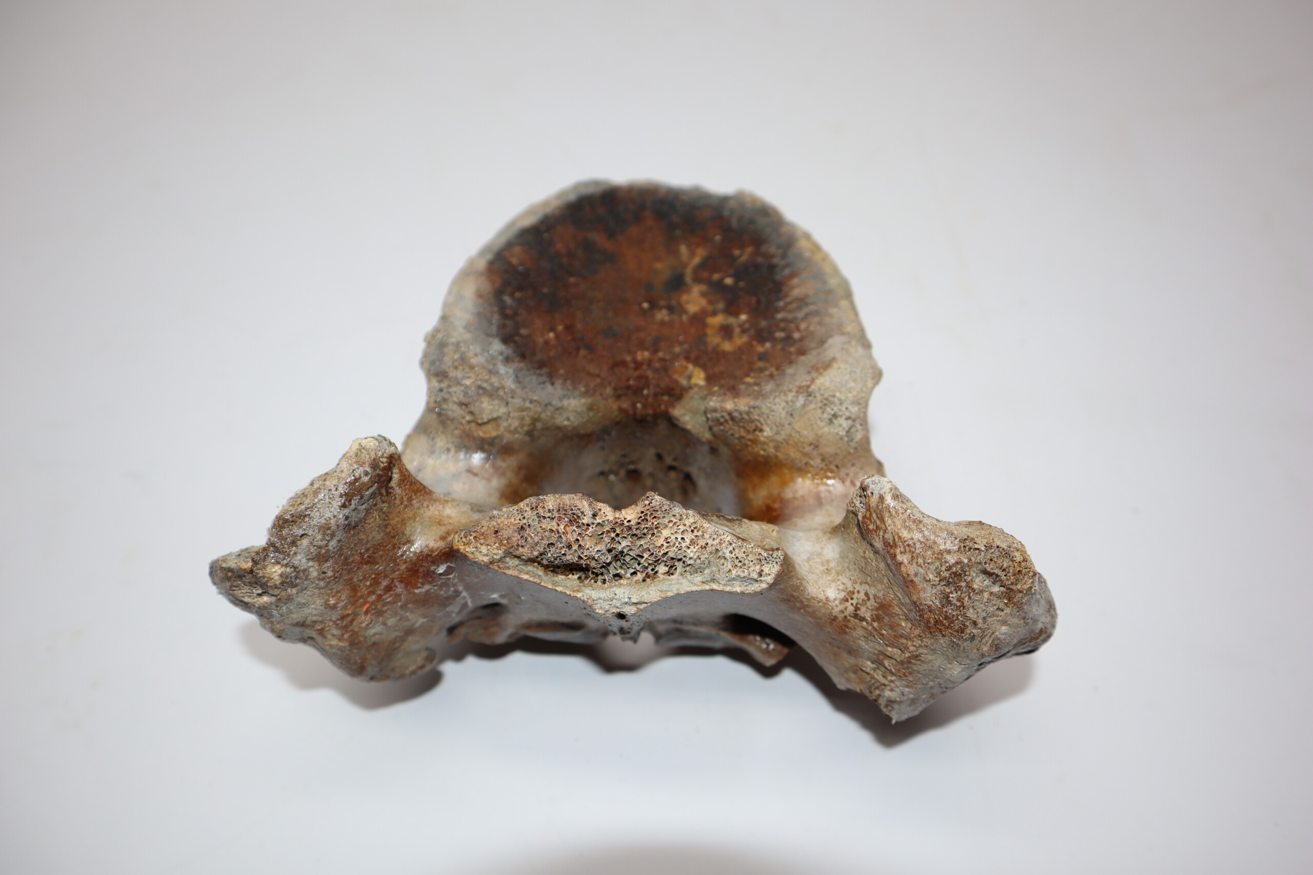 On offer is a beautiful partial thoracic vertebra of a Woolly Mammoth from the Pleistocene era. The Mammoth’s thoracic vertebrae were located in the chest area of the spinal cord. This example is in good condition with only a few usual minor damages, as seen in the photographs. No restoration whatsoever. Judging from the size, this belonged to an adult animal. The black and white section of the ruler in the image represents 10 cm / 3.9 inch.