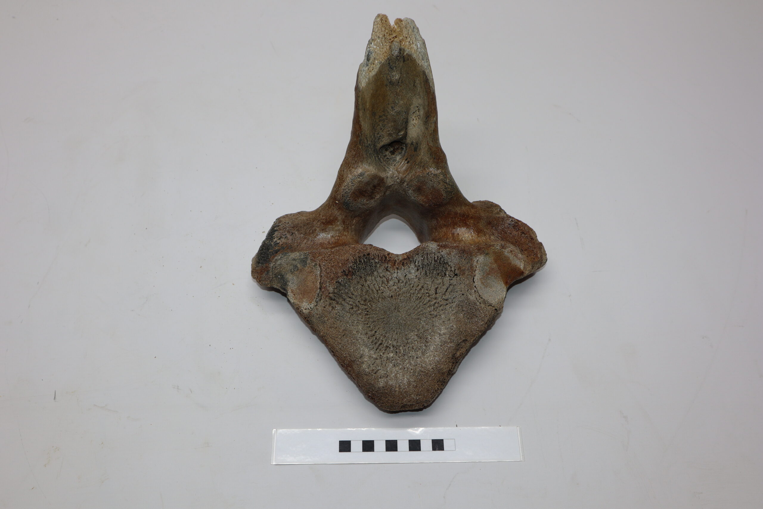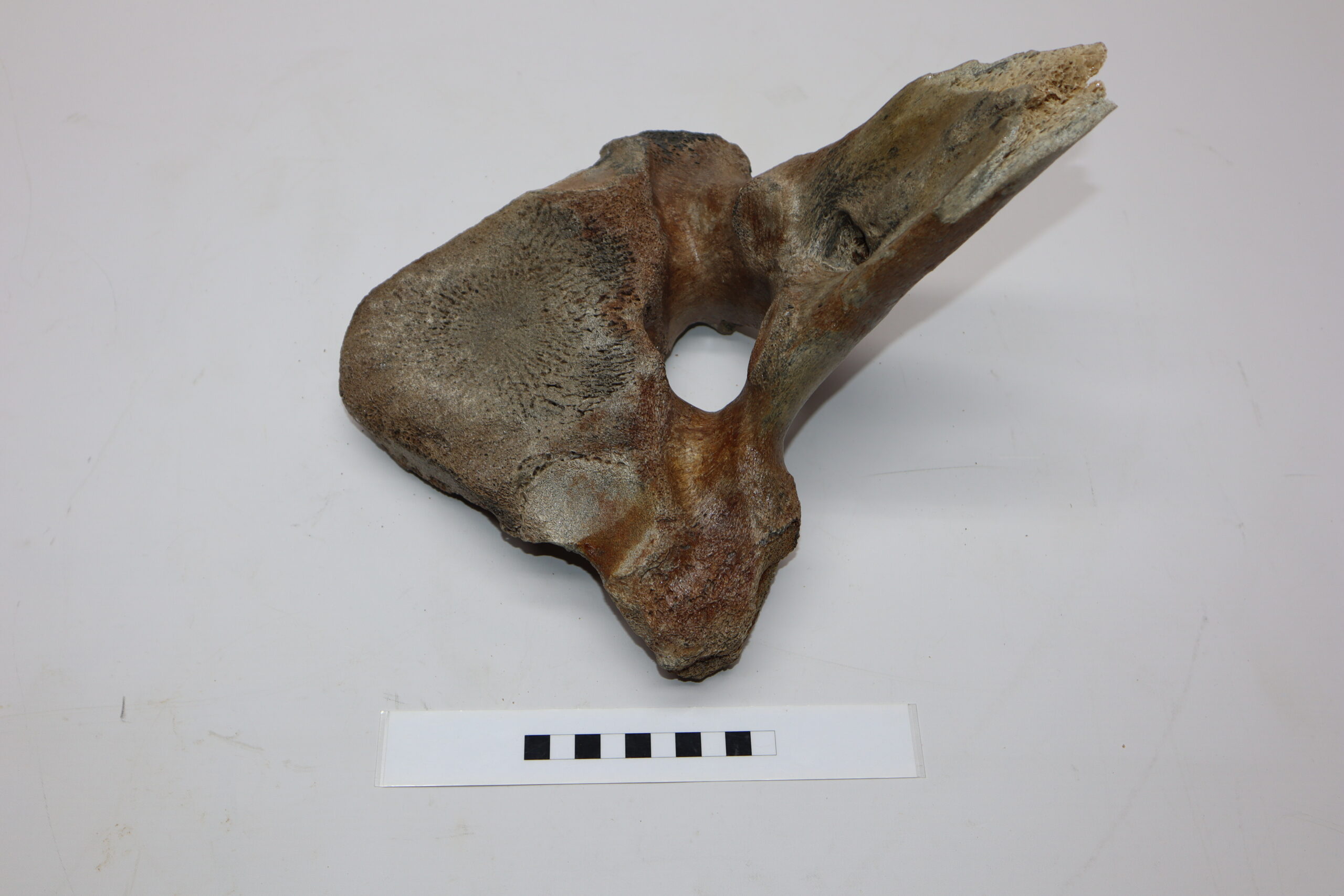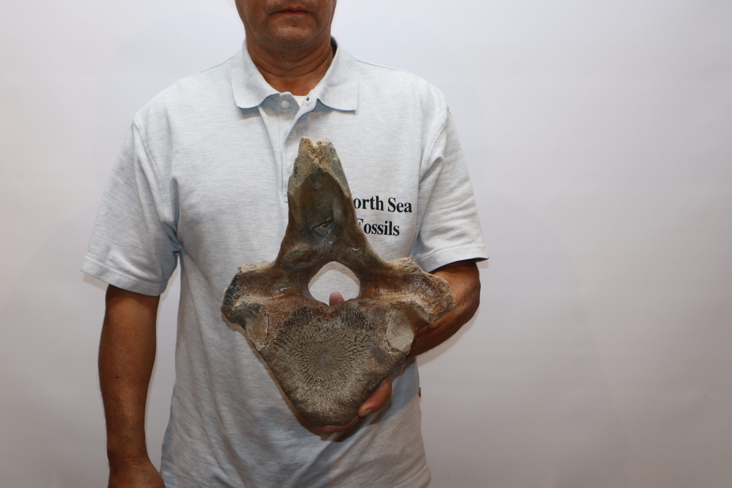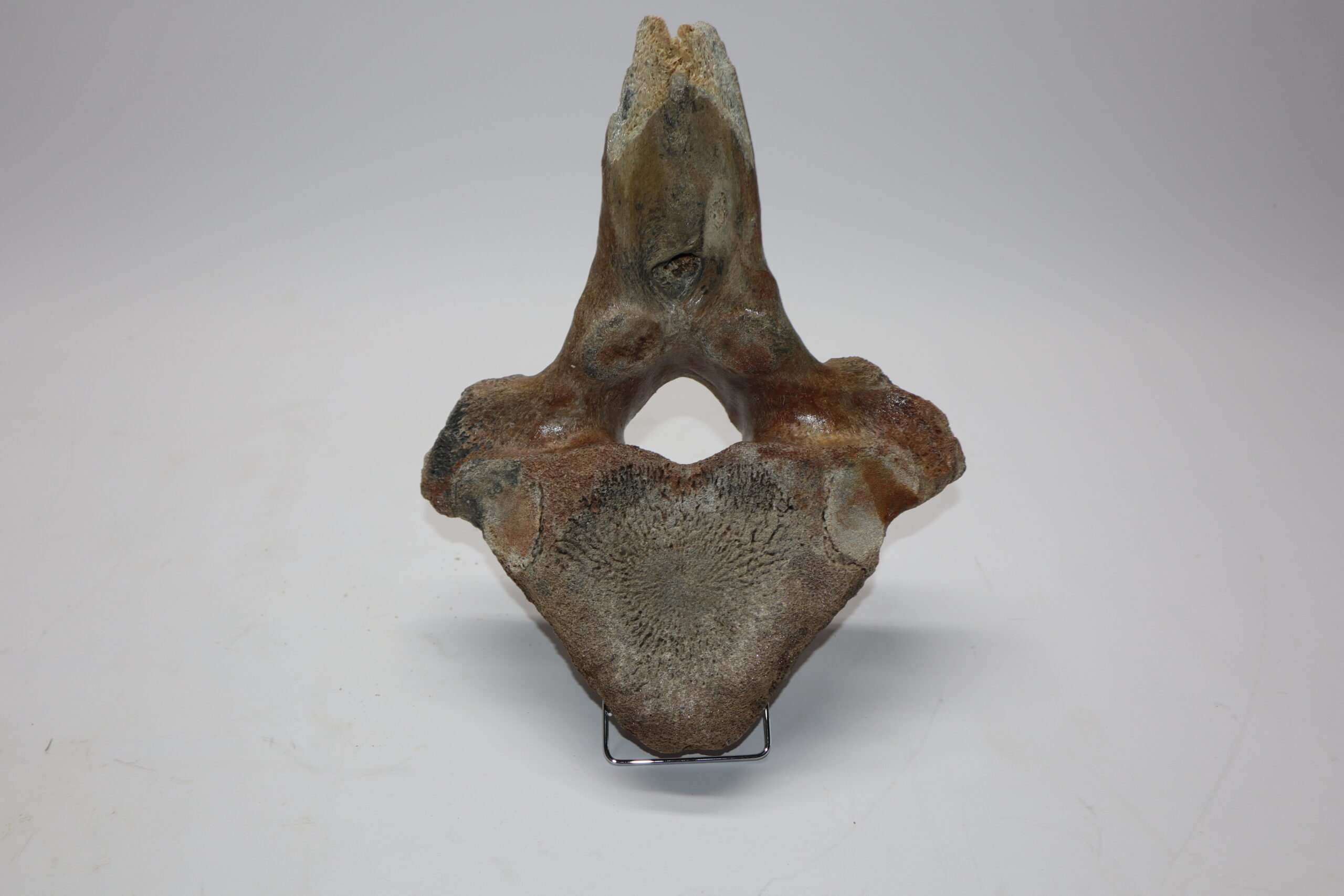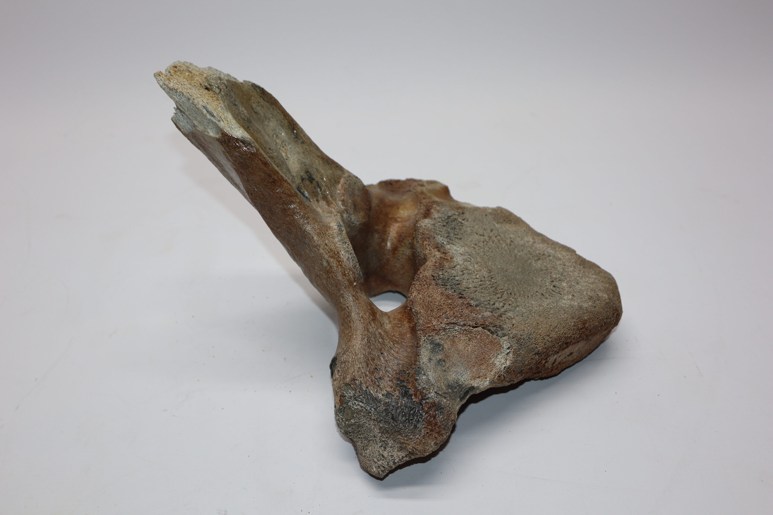 On offer is a beautiful thoracic vertebra of a Woolly Mammoth from the Pleistocene era. The Mammoth’s thoracic vertebrae were located in the chest area of the spinal cord. This example is in good condition with only a few minor damages, as seen in the photographs. No restoration whatsoever. Judging from the size, this belonged to an adult animal. The black and white section of the ruler in the image represents 10 cm / 3.9 inch.