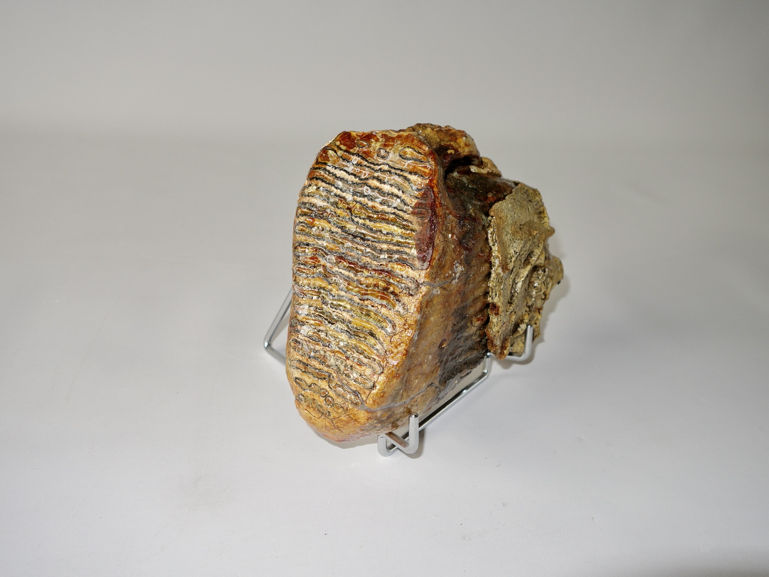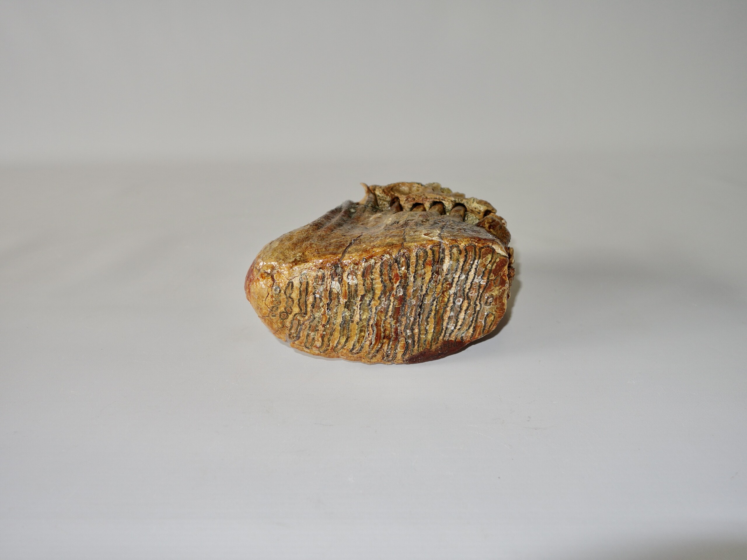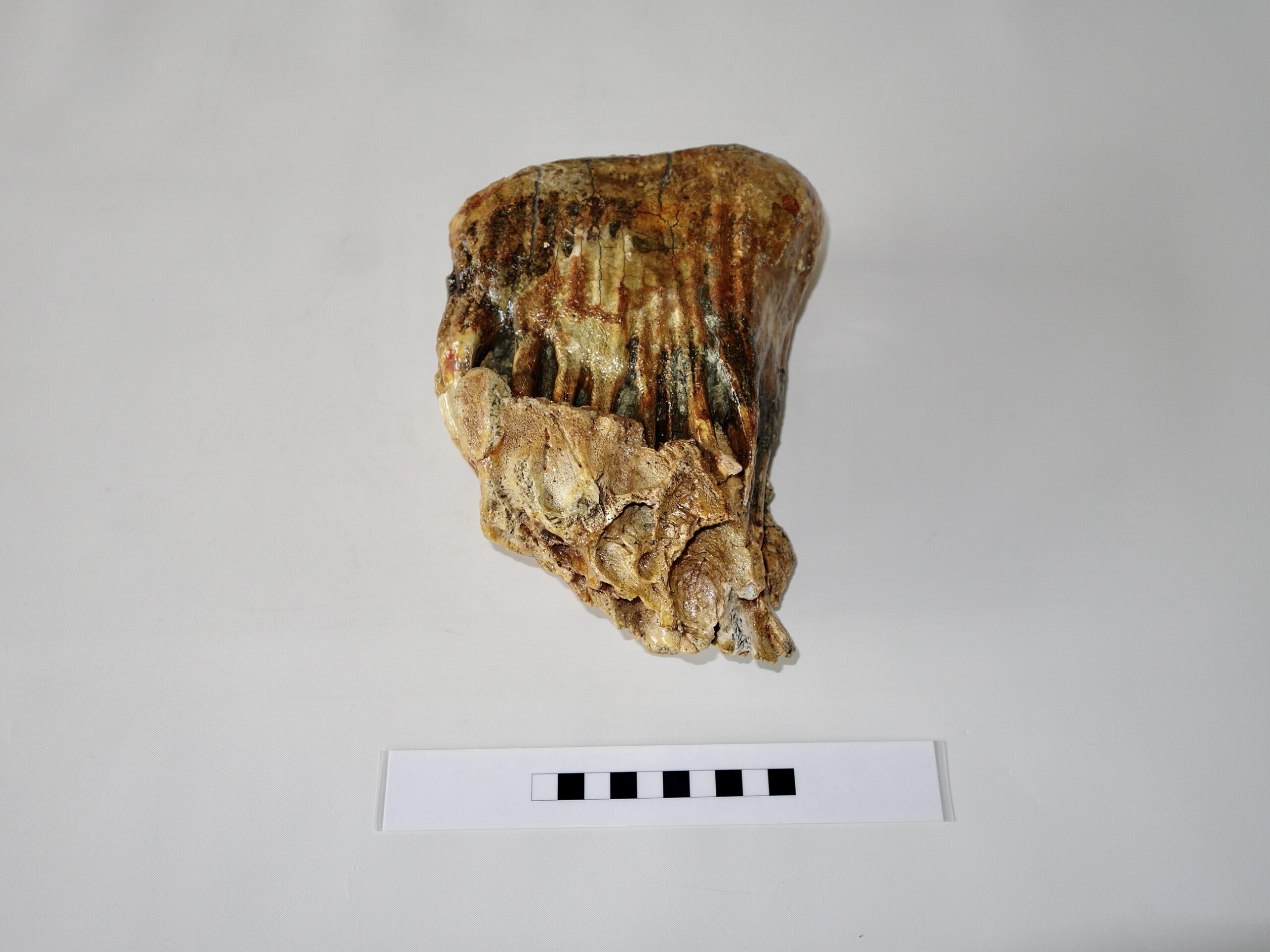 On offer is a beautifu M2 molar of a sub-adult Woolly Mammoth from the Pleistocene era. This molar comes from the left upper jaw and is a nice example of a nearly adult animal, in good state of preservation , a few cracks are repaired ,and with a beautiful chewing surface, as seen in the images. Interestingly this still includes some jaw tissue. The black and white section of the ruler in the image represents 10 cm / 3.9 inch. No restoration whatsoever.