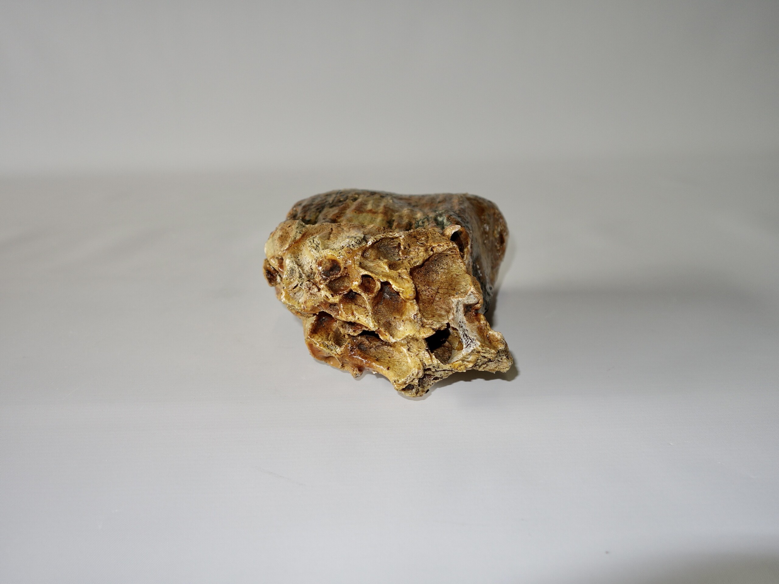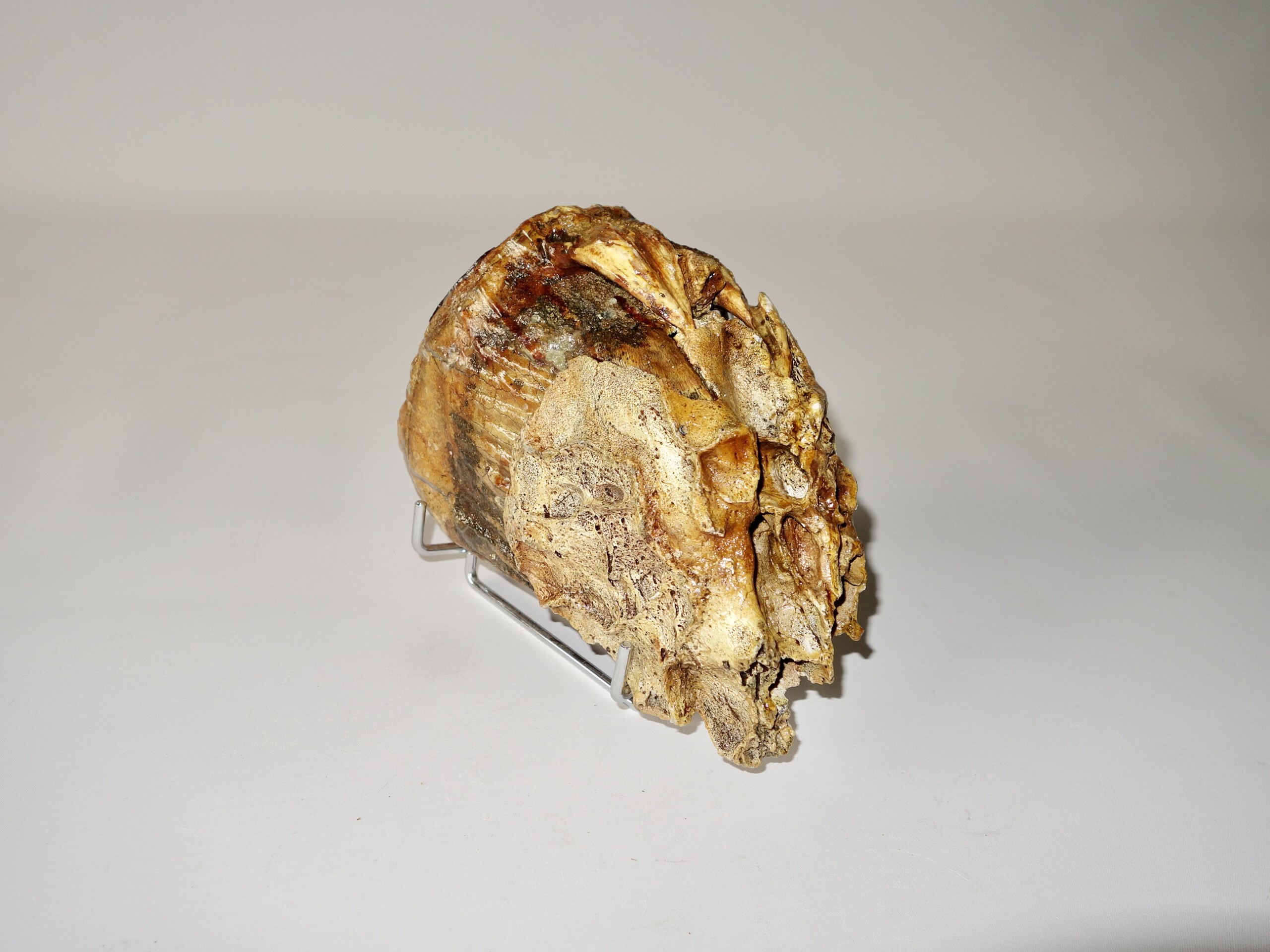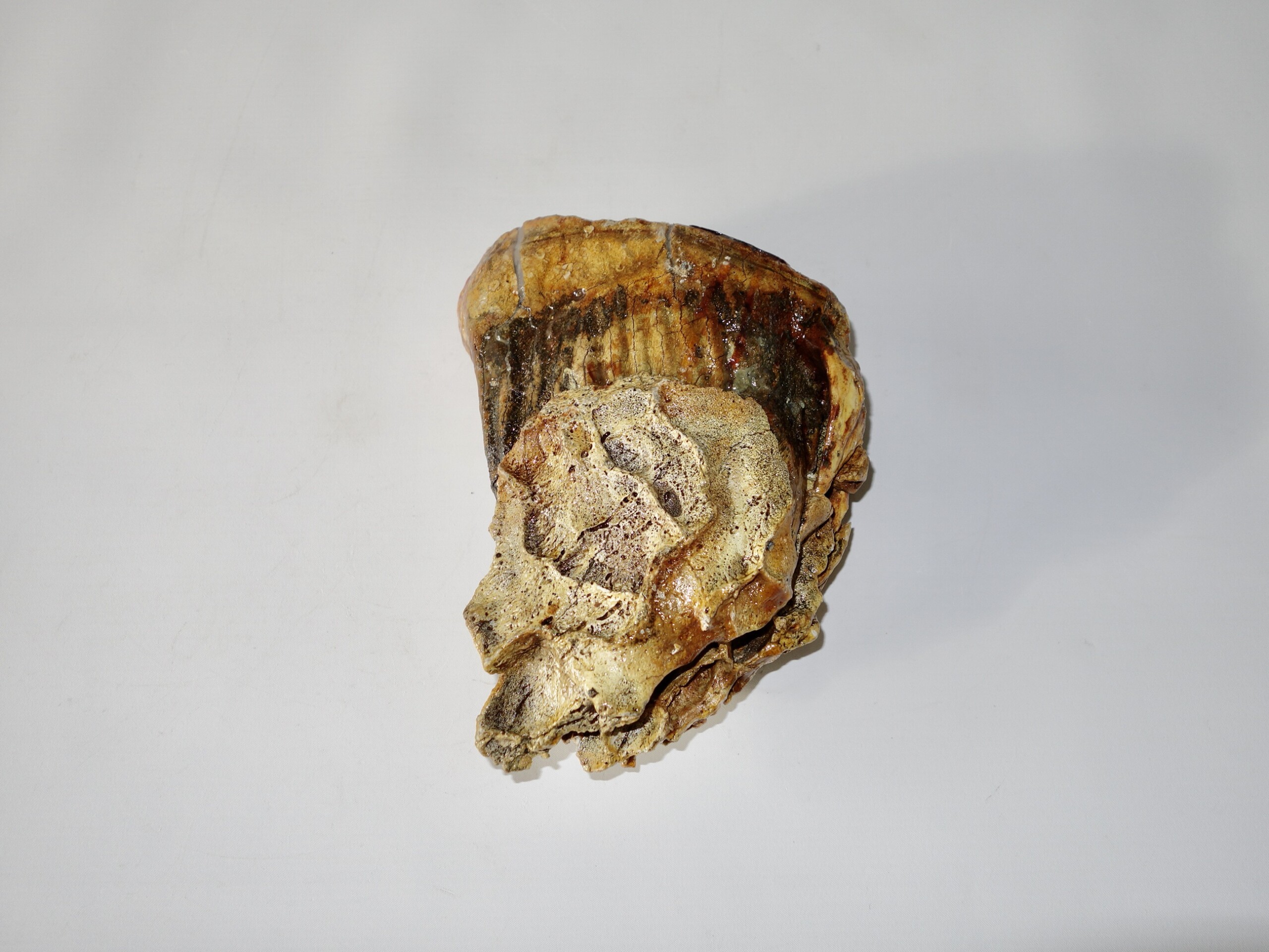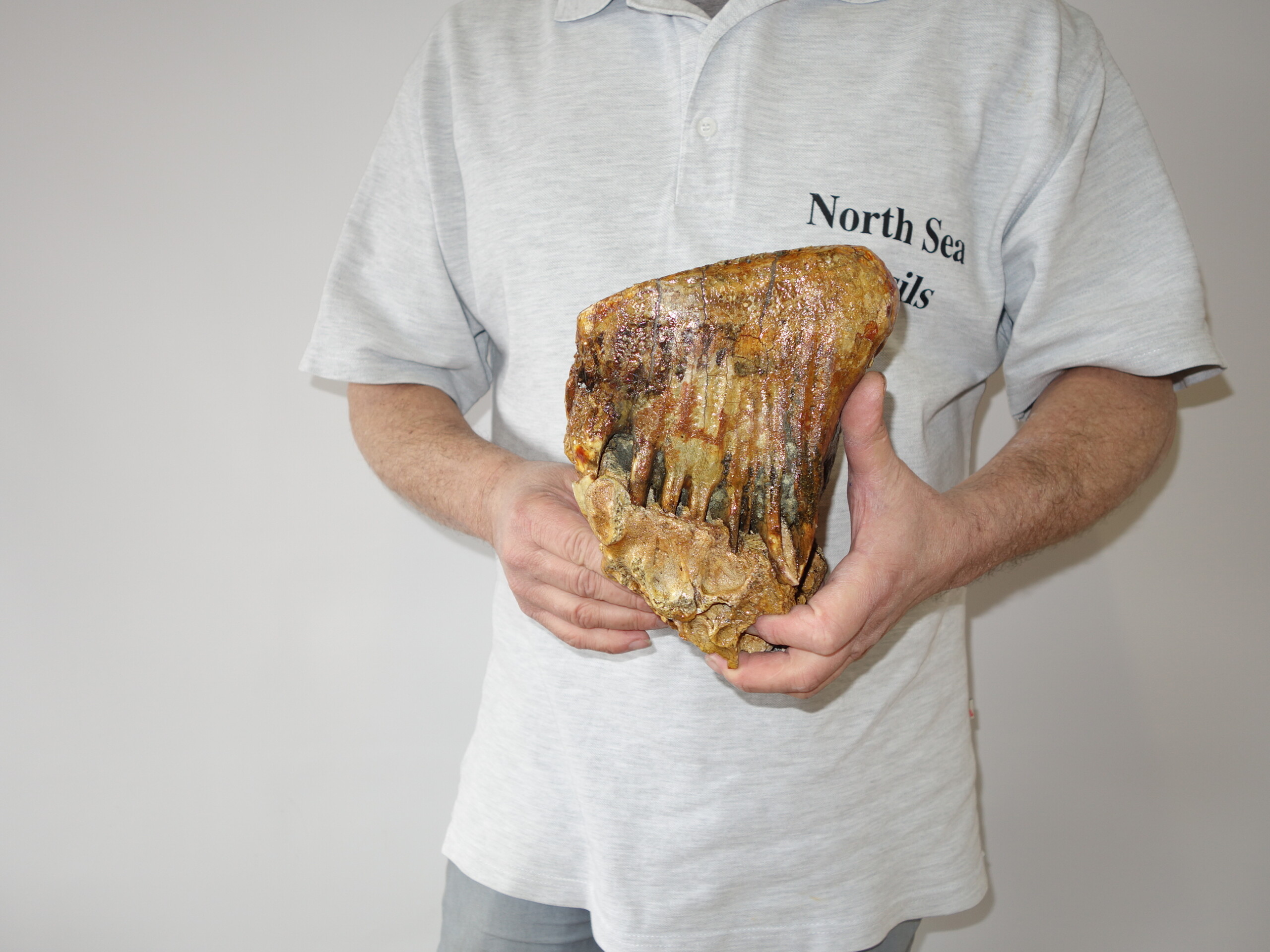 On offer is a beautifu M2 molar of a sub-adult Woolly Mammoth from the Pleistocene era. This molar comes from the left upper jaw and is a nice example of a nearly adult animal, in good state of preservation , a few cracks are repaired ,and with a beautiful chewing surface, as seen in the images. Interestingly this still includes some jaw tissue. The black and white section of the ruler in the image represents 10 cm / 3.9 inch. No restoration whatsoever.