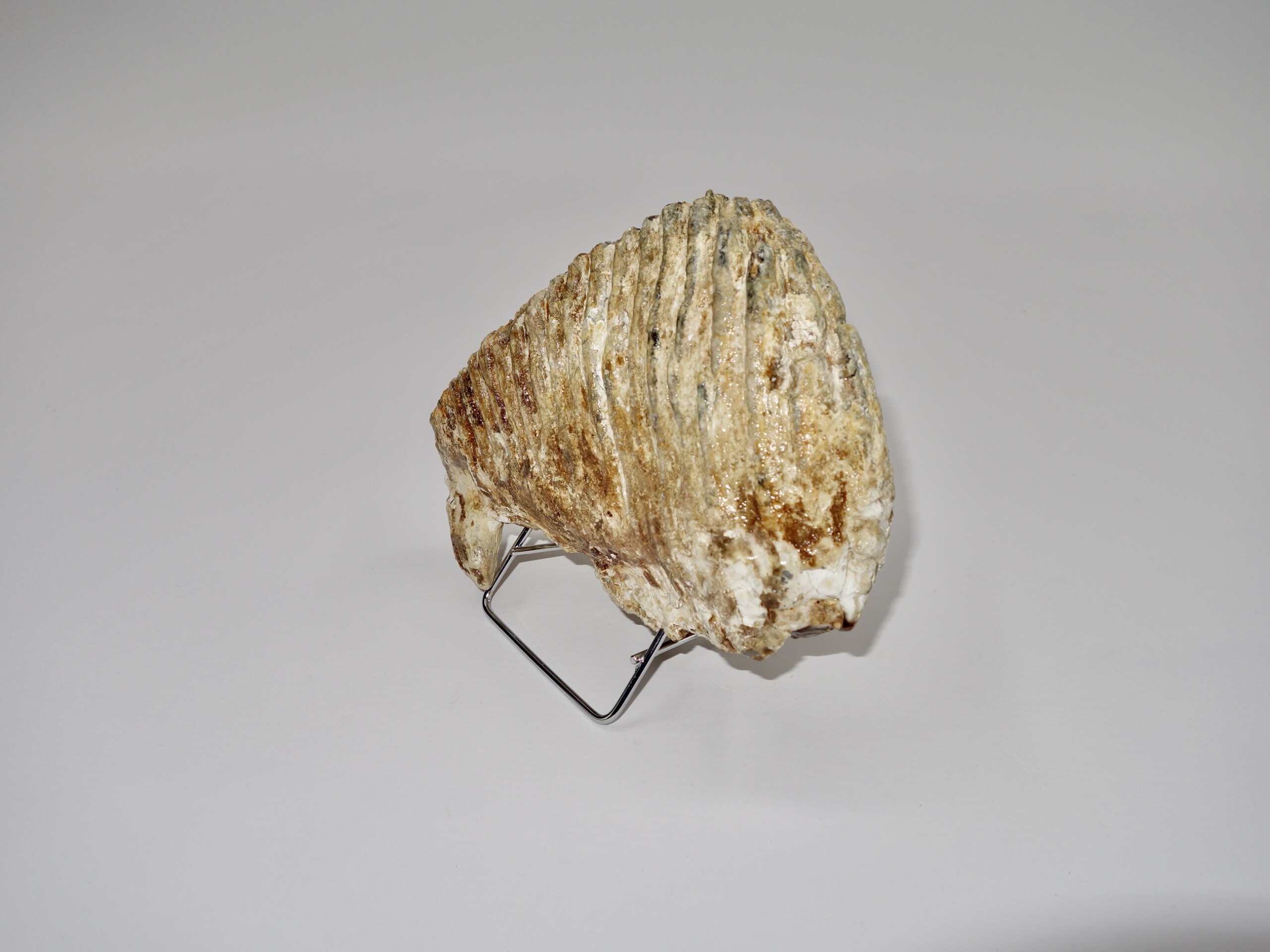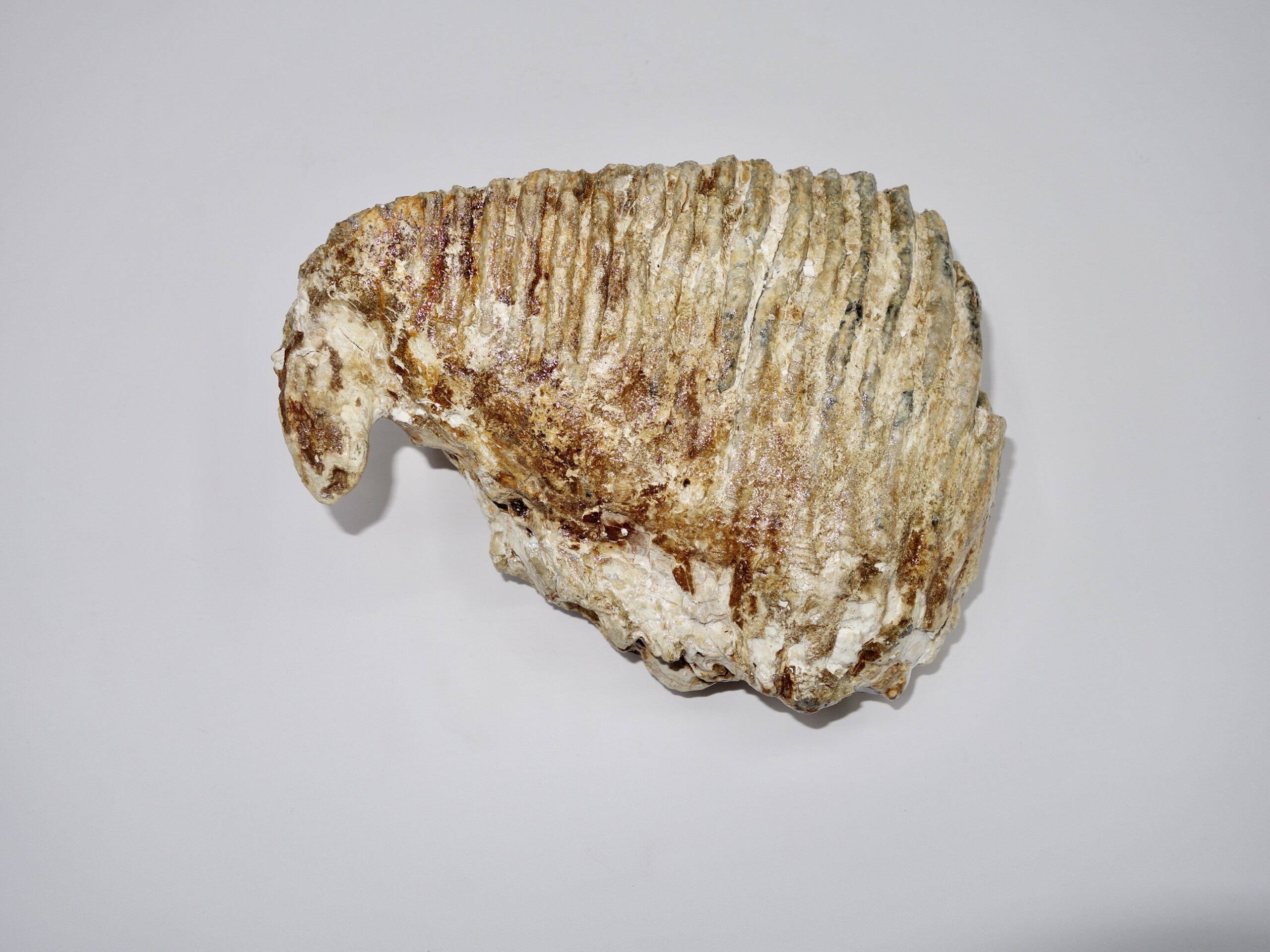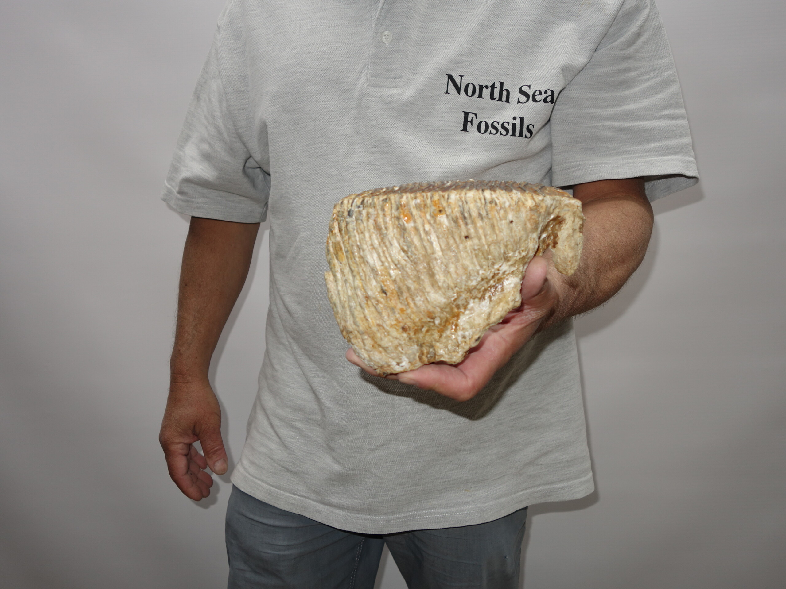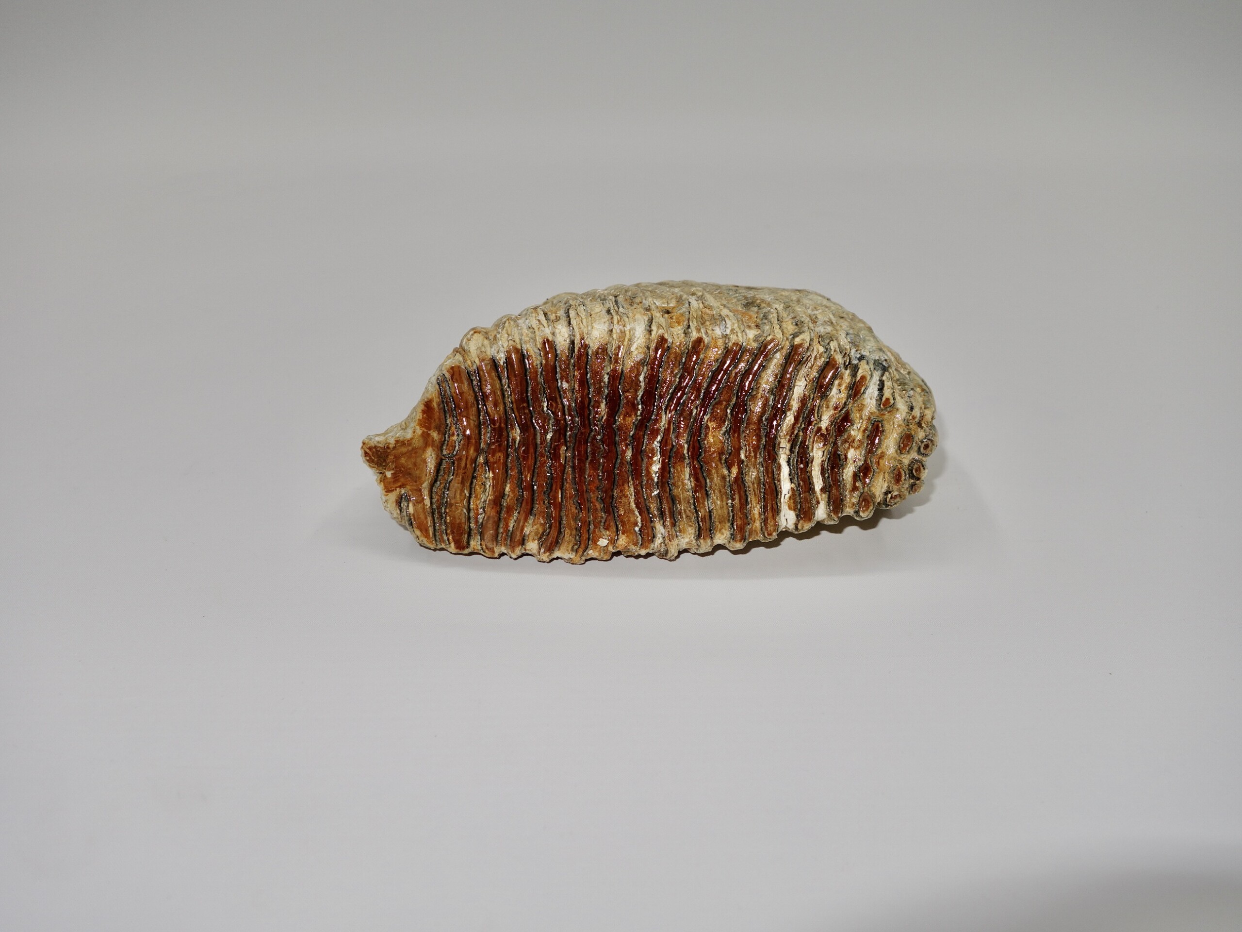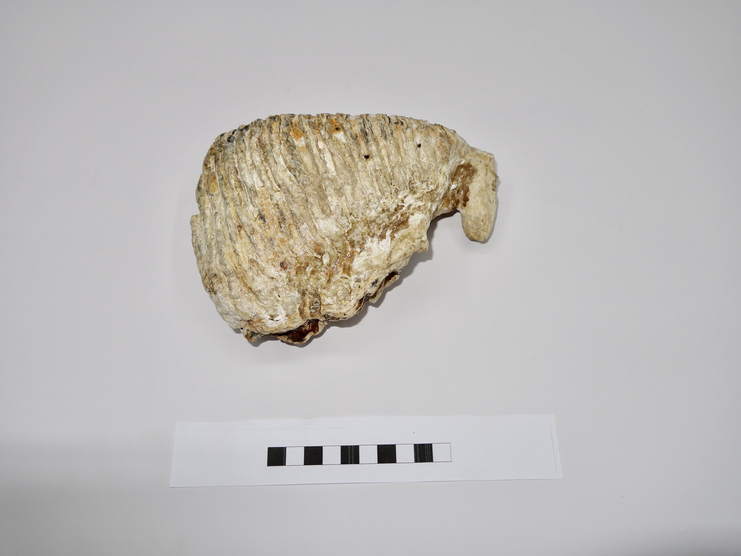 On offer is a good M3 molar of aย Woolly Mammoth from the Pleistocene era. This molar comes from the left upper jaw and is a nice example of a fully grown animal, in good state of preservation and with a beautiful chewing surface as seen in the images. Judging from the size, this belonged to an adultย Mammoth. The black and white section of the ruler in the image represents 10 cm / 3.9 inch. No restoration whatsoever.