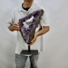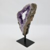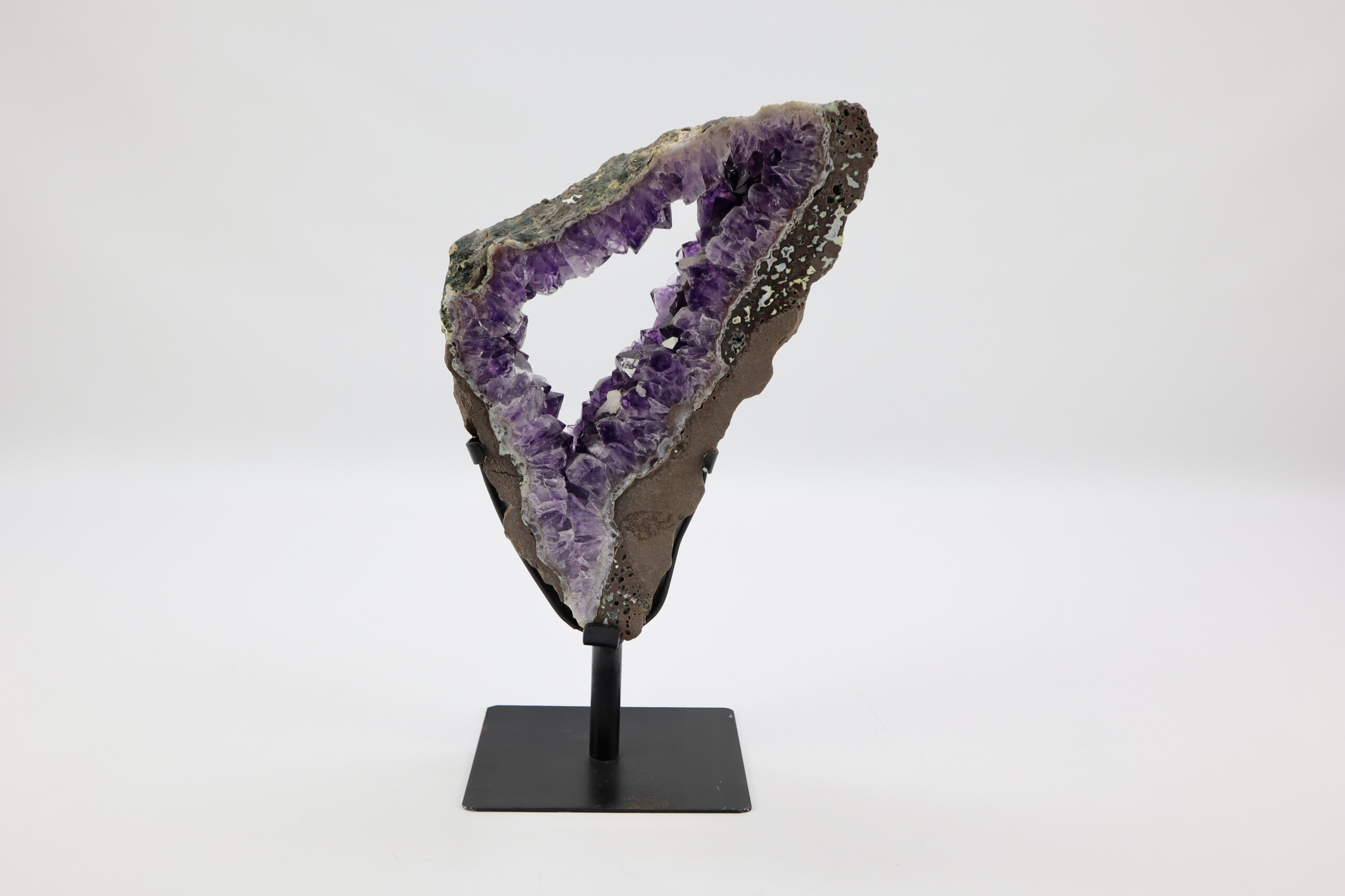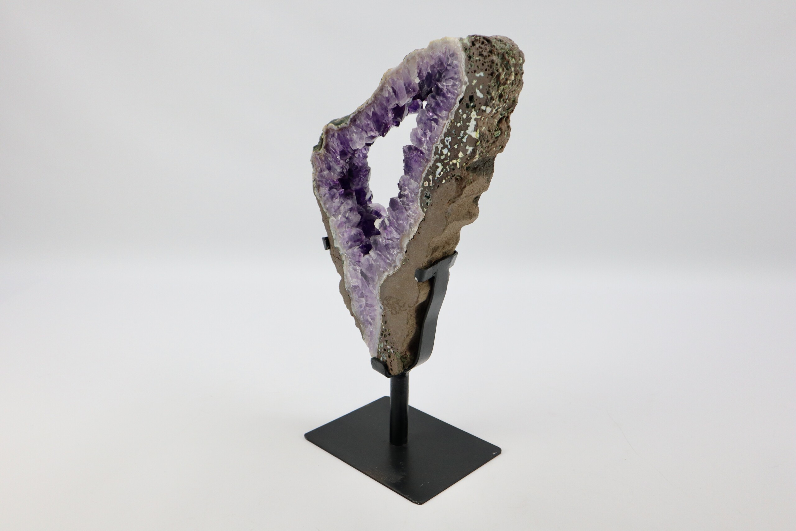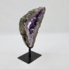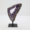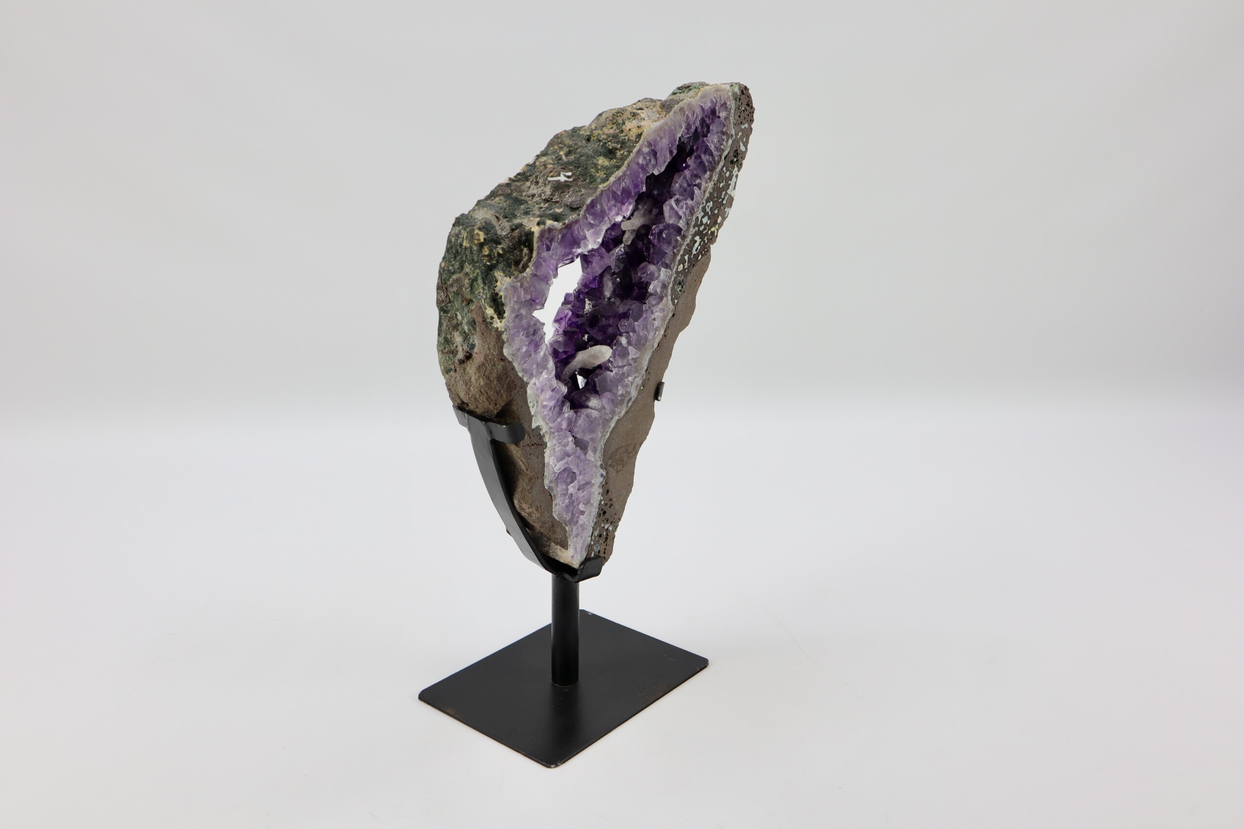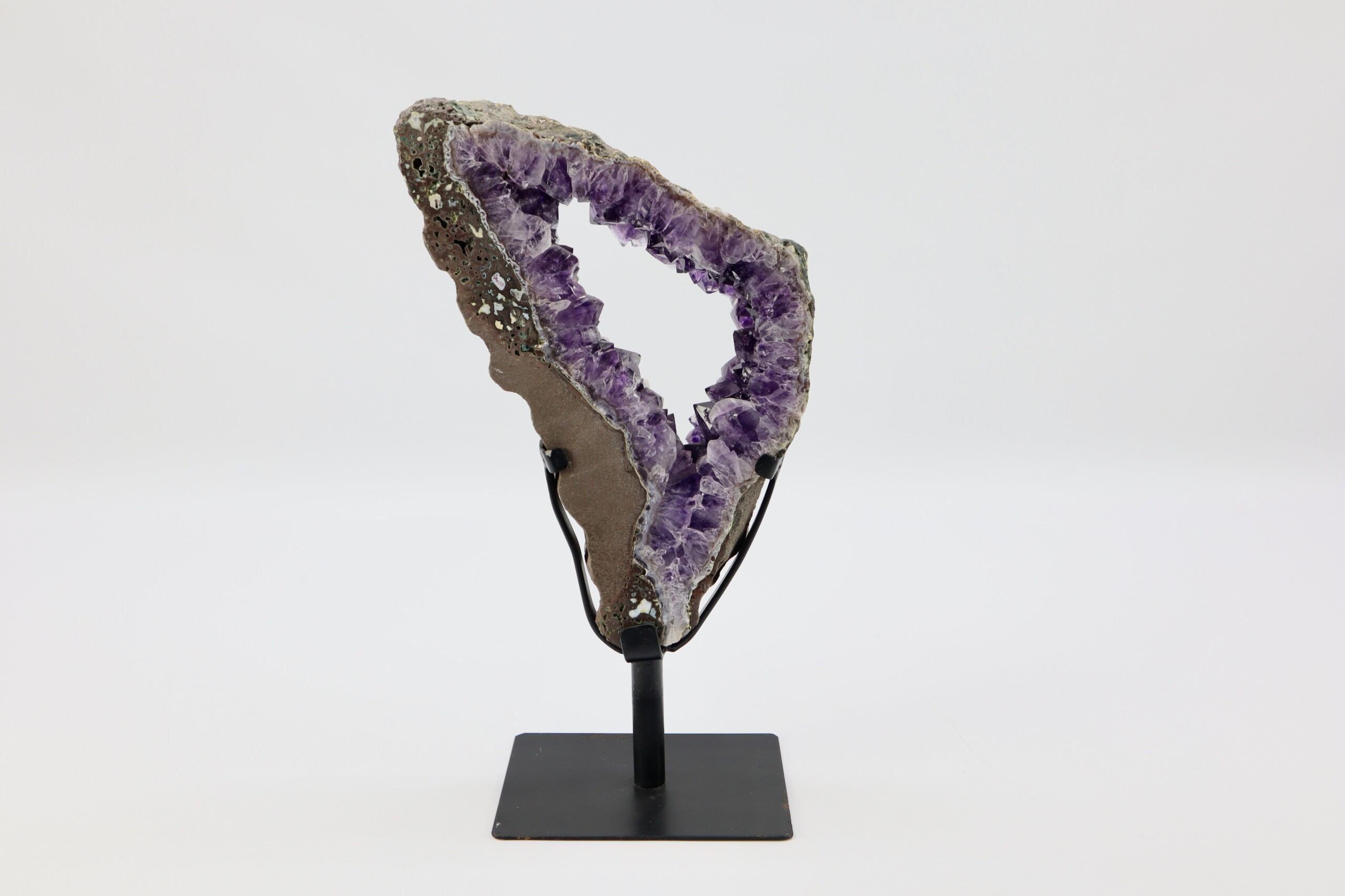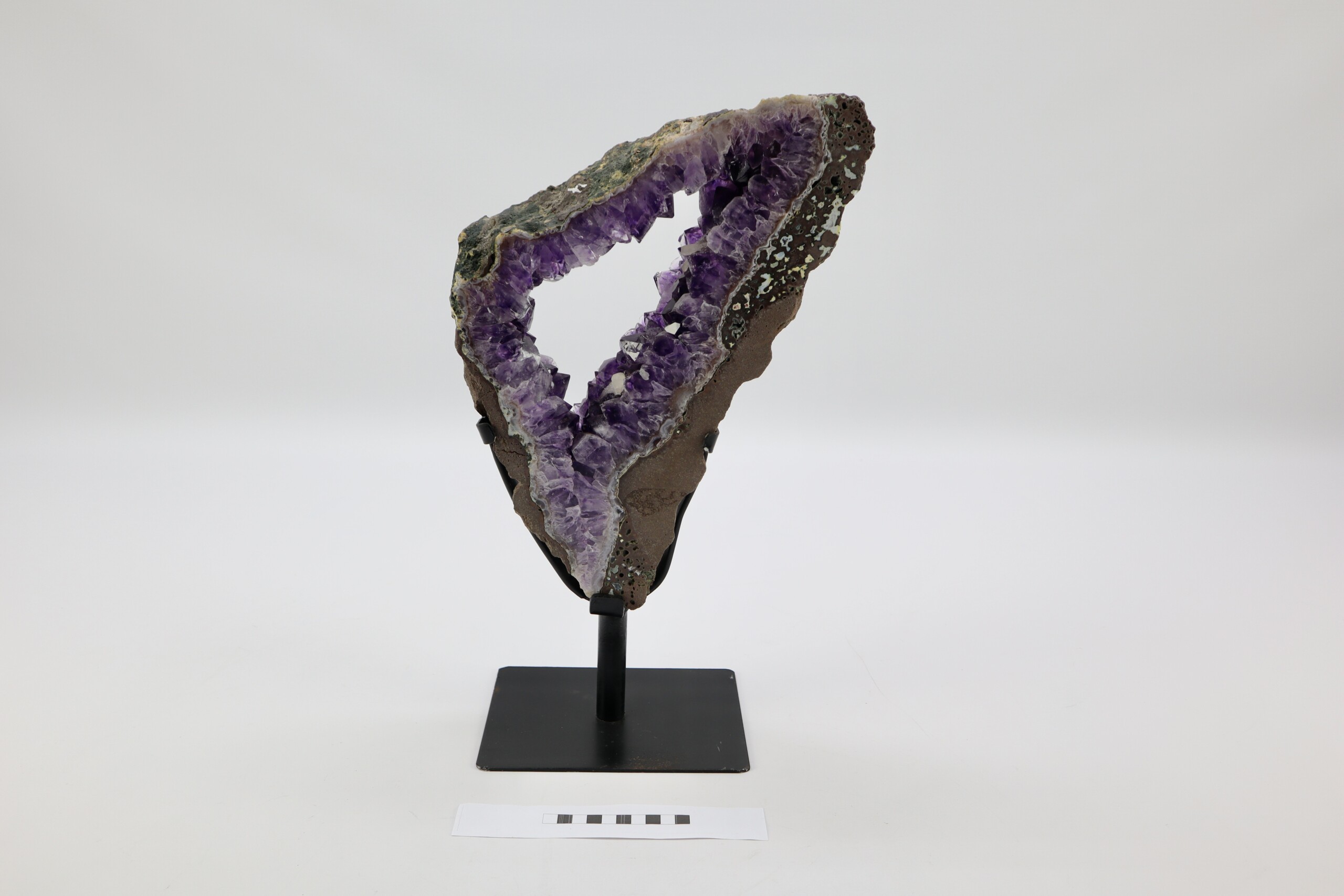 On offer is a section of a gorgeous amethyist geode, two sides cut and polished to reveal the dark purple cyristals of amethyst, a variety of quartz. A beautiful and interesting triangular shape. The black-and-white section of the ruler in the image represents 10 cm / 3.9 inch.
