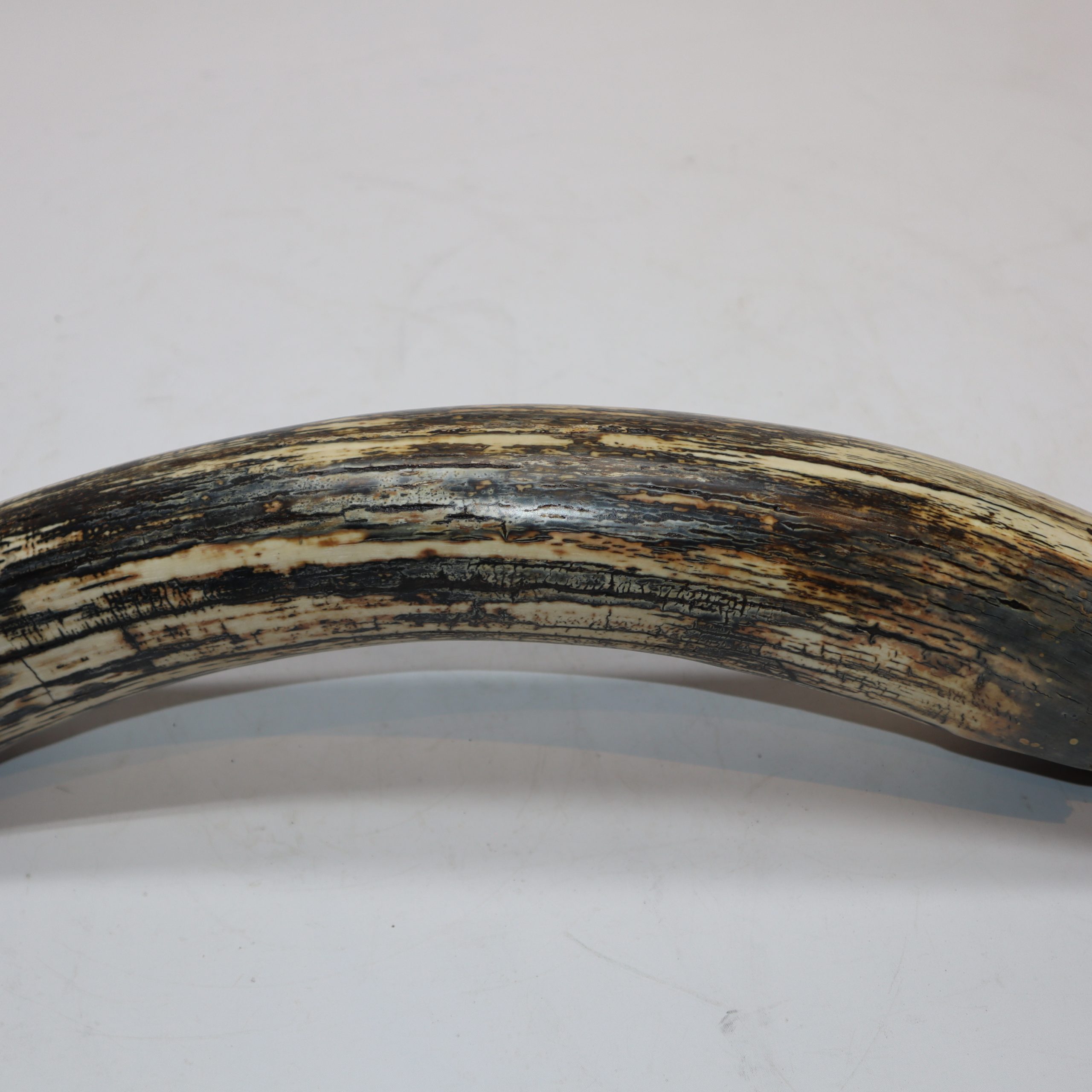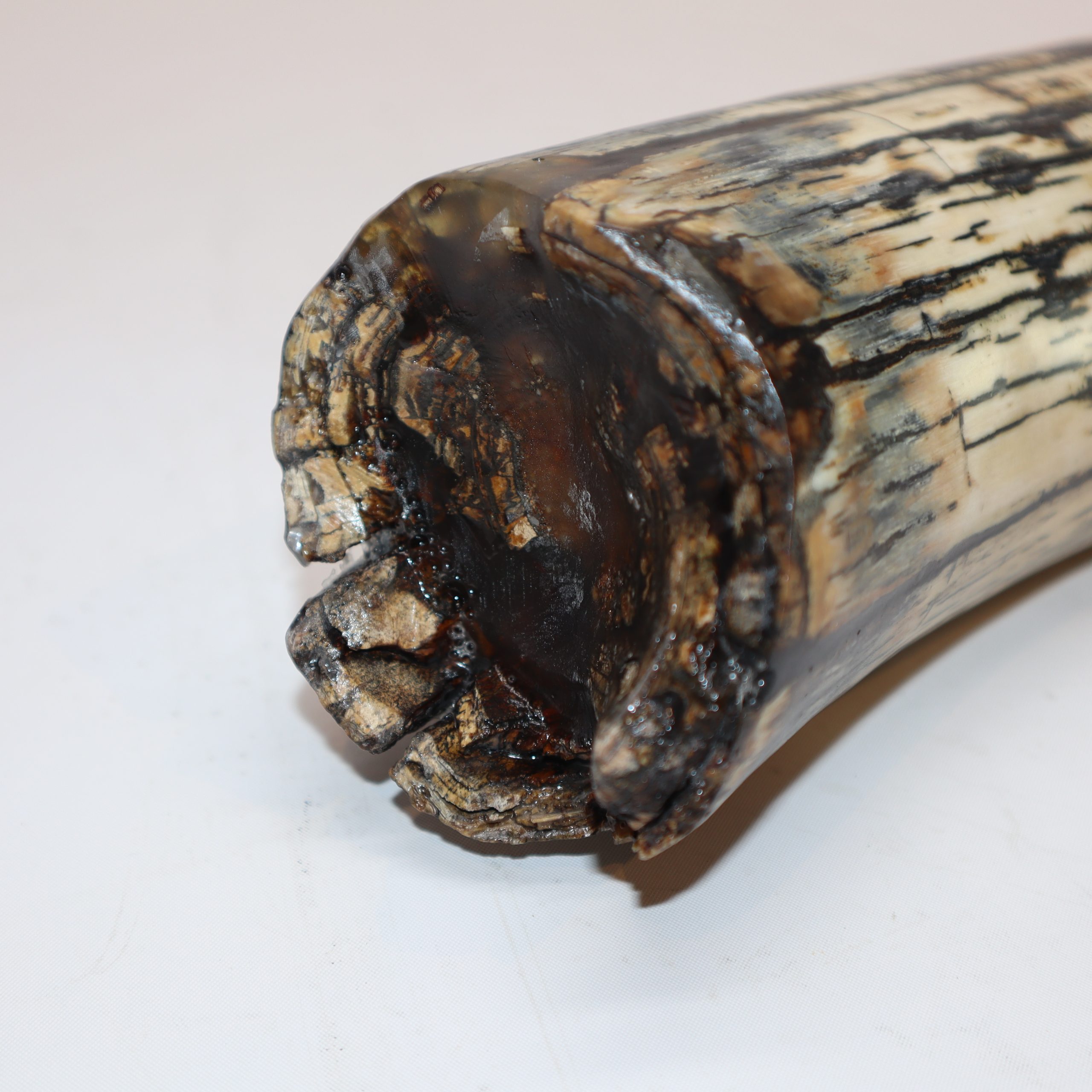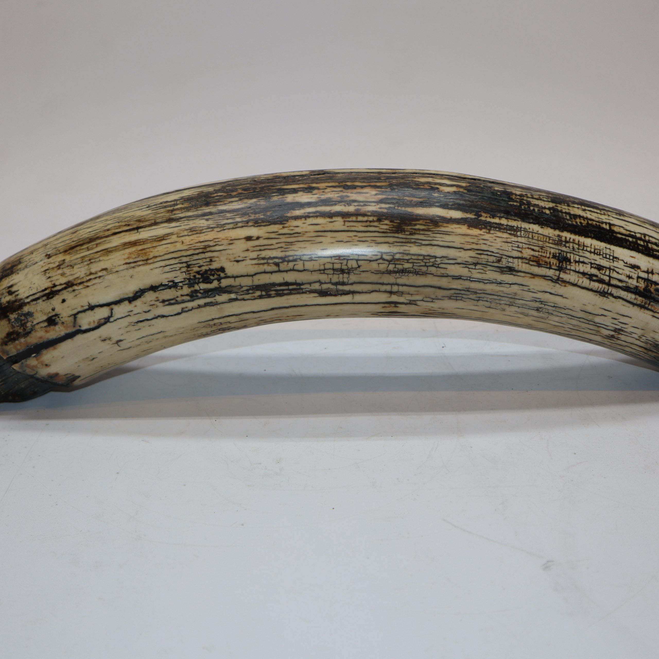On offer is a beautiful base of a tusk of an adult Woolly Mammoth, in excellent condition. This is the tusk piece where it attached to the animal’s skull, hence the hollow part. Very good state of preservation, as seen in the images. No restoration whatsoever. This tusk base is of beautiful colouring of mainly white, black, gold and brown ivory and with stunning patterning. Judging from the circumference this would have belonged to an adult Mammoth. A matt finish has been applied to this piece, but it is also possible to order it with a glossy finish. The black-and-white section of the ruler in the image represents 10 cm / 3.9 inch.