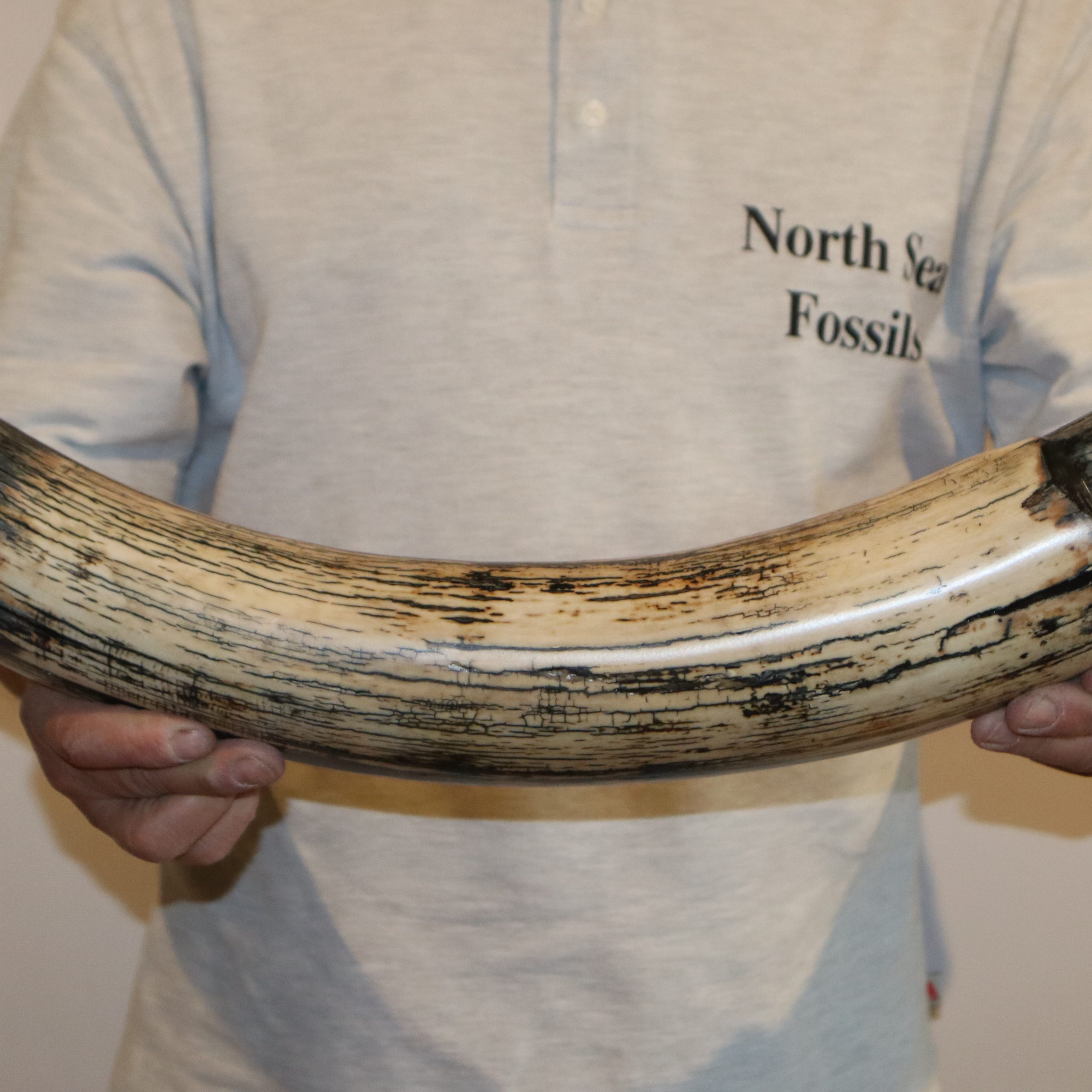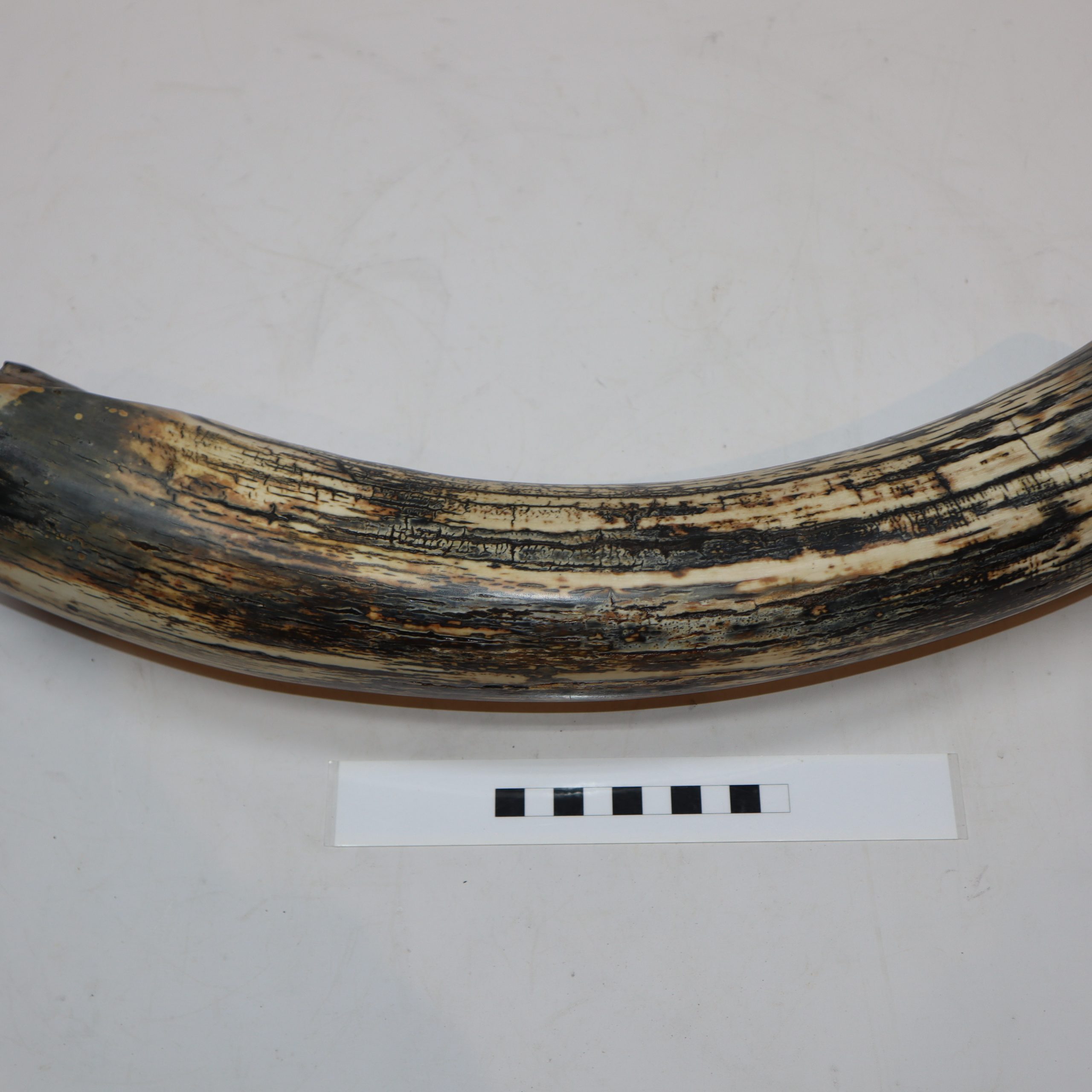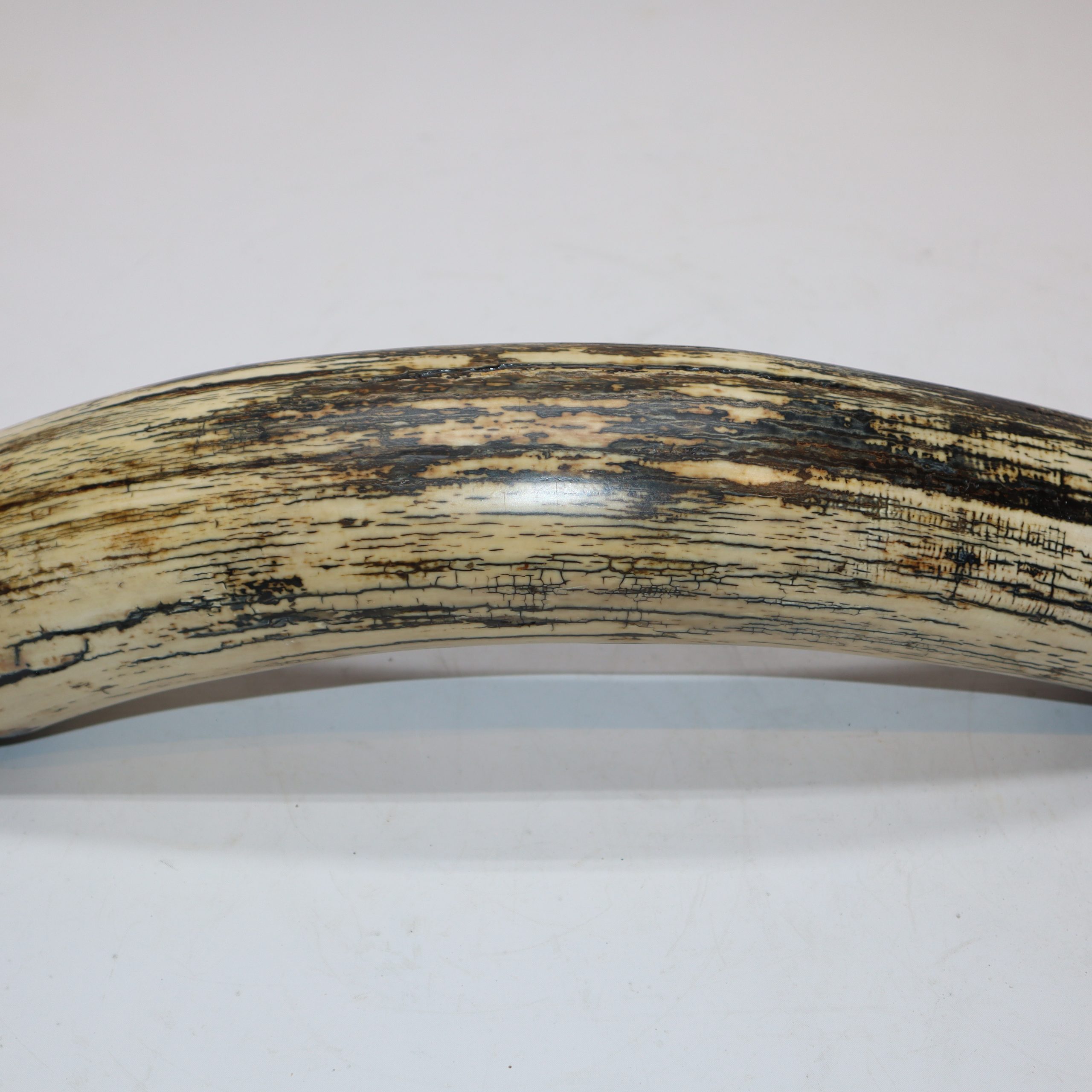 On offer is a beautiful base of a tusk of an adult Woolly Mammoth, in excellent condition. This is the tusk piece where it attached to the animal’s skull, hence the hollow part. Very good state of preservation, as seen in the images. No restoration whatsoever. This tusk base is of beautiful colouring of mainly white, black, gold and brown ivory and with stunning patterning. Judging from the circumference this would have belonged to an adult Mammoth. A matt finish has been applied to this piece, but it is also possible to order it with a glossy finish. The black-and-white section of the ruler in the image represents 10 cm / 3.9 inch.