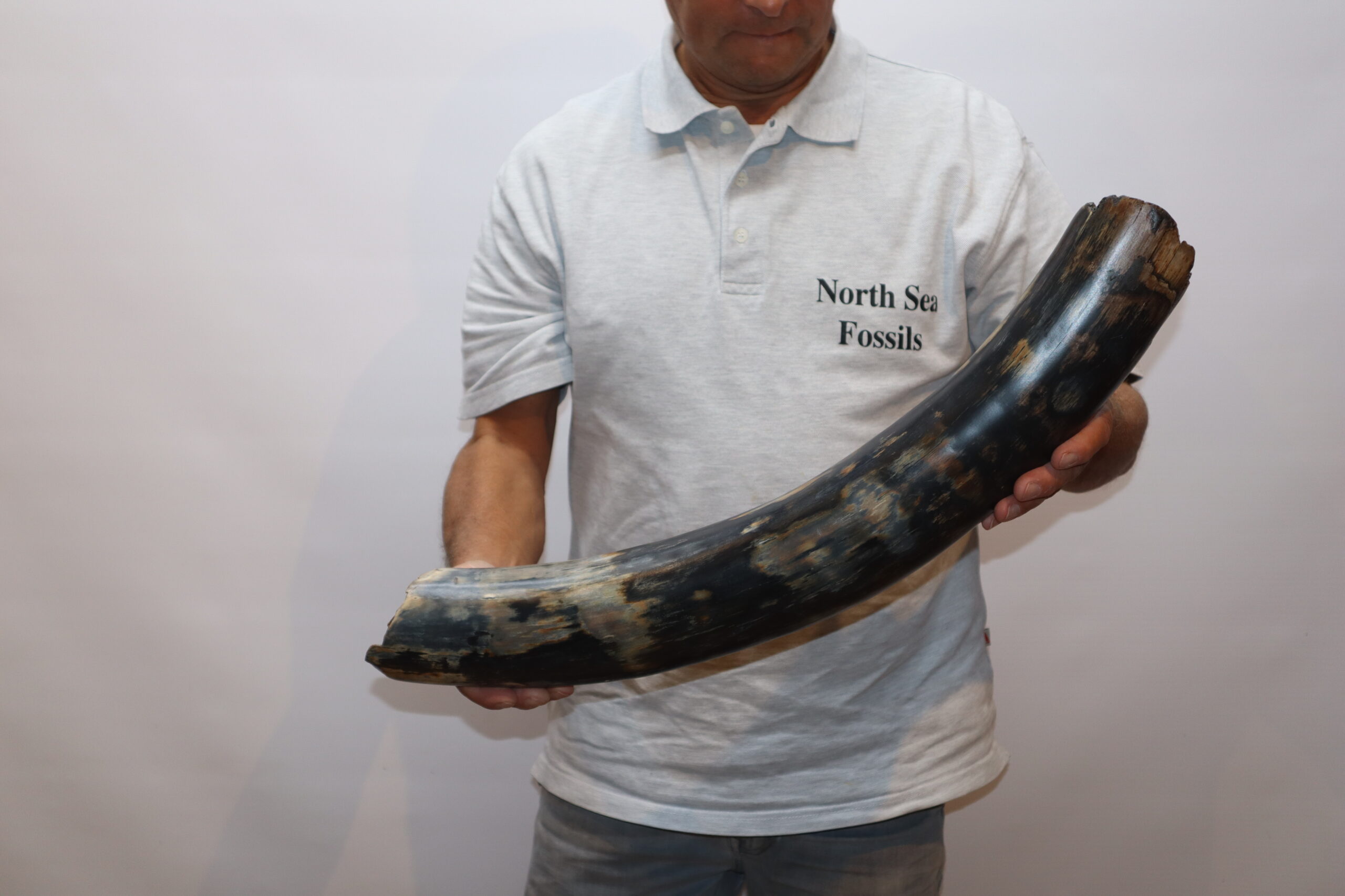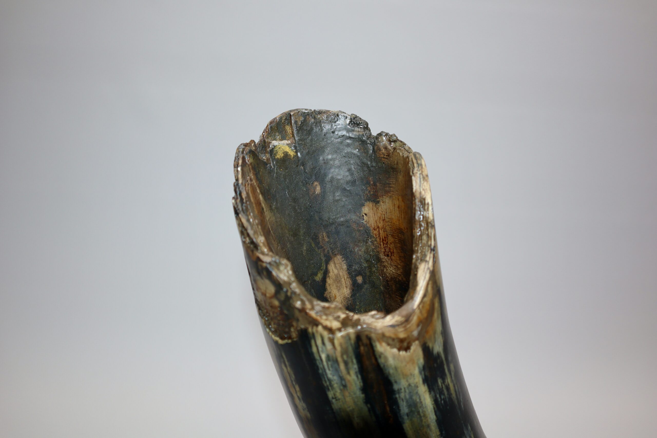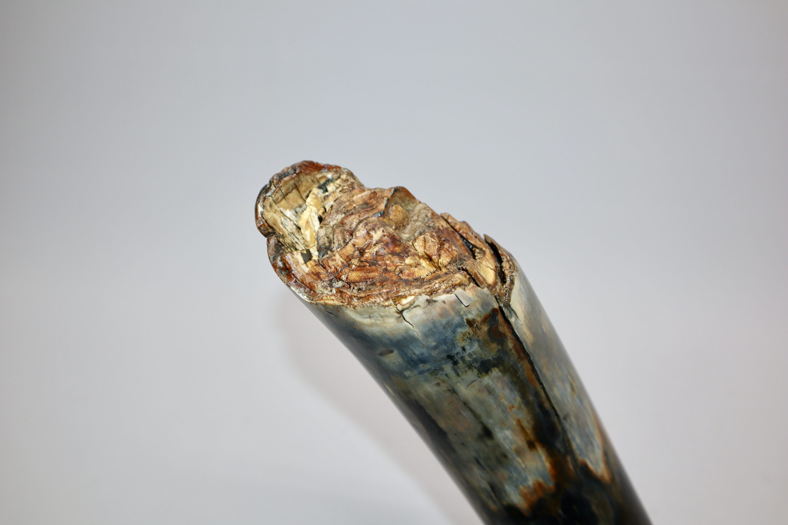 On offer is a beautiful base of a tusk of an adult Woolly Mammoth, in excellent condition. This is the tusk piece where it attached to the animal’s skull, hence the hollow part. Very good state of preservation, as seen in the images. No restoration whatsoever. This tusk base is of beautiful colouring of mainly white, black, gold and brown ivory and with stunning patterning. Judging from the circumference this would have belonged to an adult Mammoth. A matt finish has been applied to this piece, but it is also possible to order it with a glossy finish. The black-and-white section of the ruler in the image represents 10 cm / 3.9 inch.