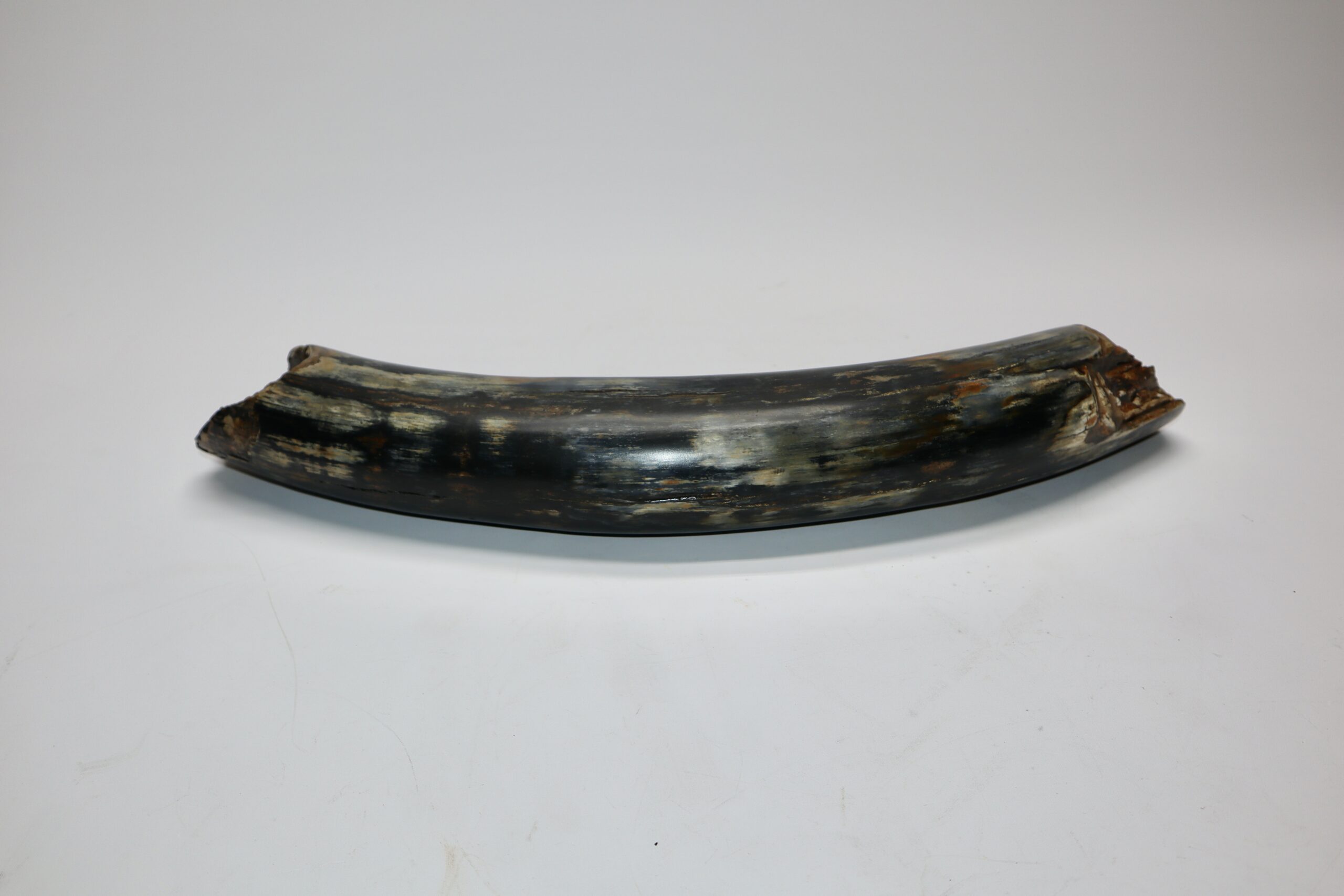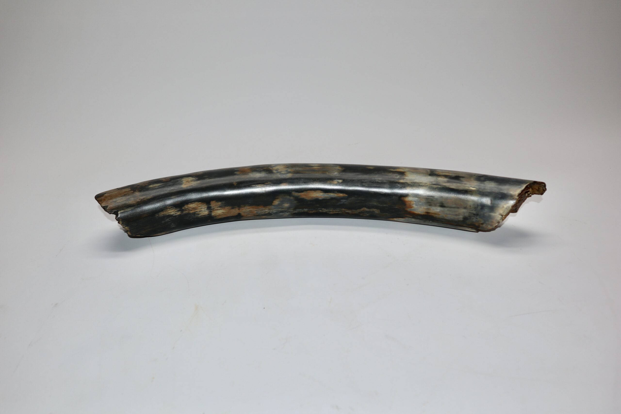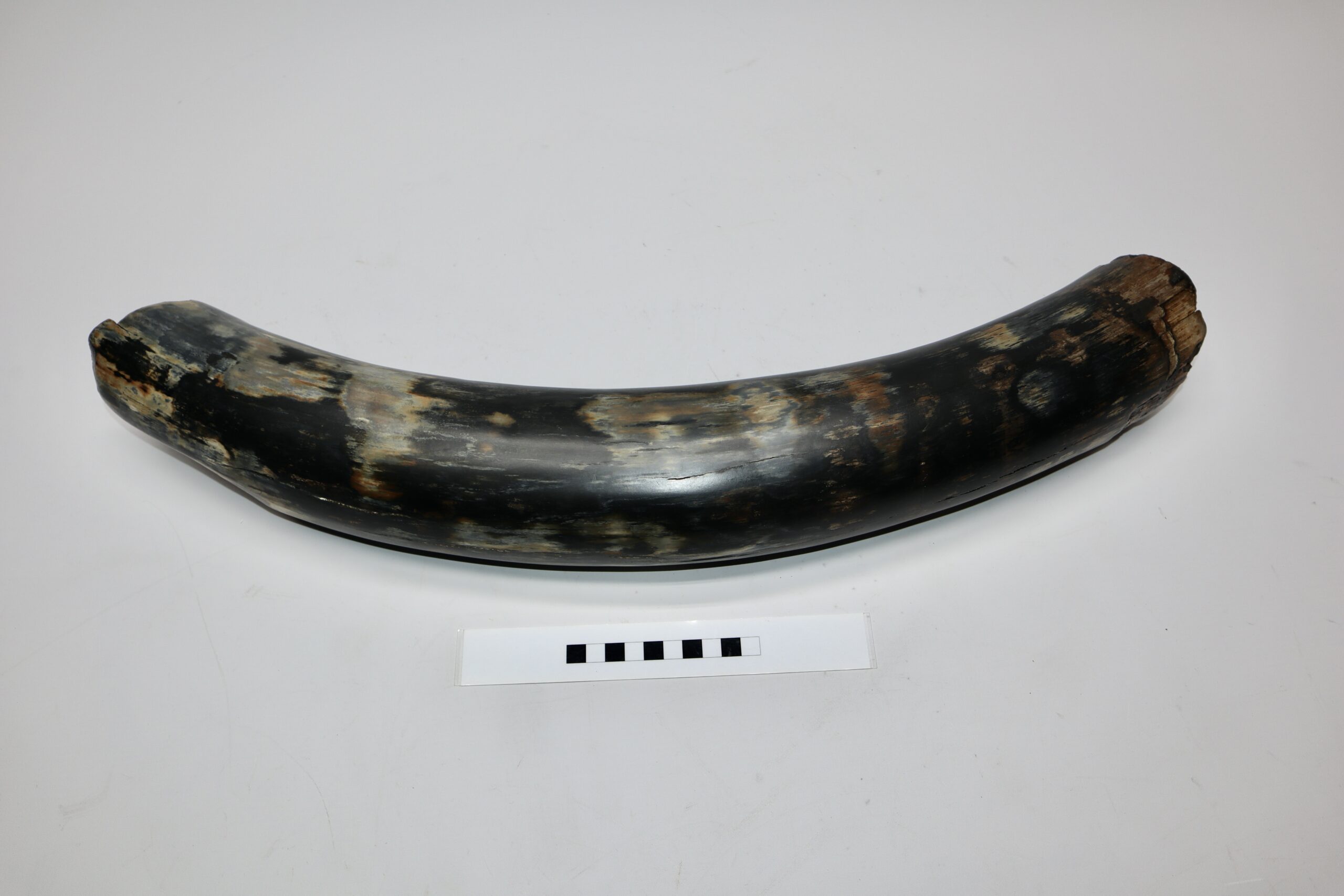 On offer is a beautiful base of a tusk of an adult Woolly Mammoth, in excellent condition. This is the tusk piece where it attached to the animal’s skull, hence the hollow part. Very good state of preservation, as seen in the images. No restoration whatsoever. This tusk base is of beautiful colouring of mainly white, black, gold and brown ivory and with stunning patterning. Judging from the circumference this would have belonged to an adult Mammoth. A matt finish has been applied to this piece, but it is also possible to order it with a glossy finish. The black-and-white section of the ruler in the image represents 10 cm / 3.9 inch.