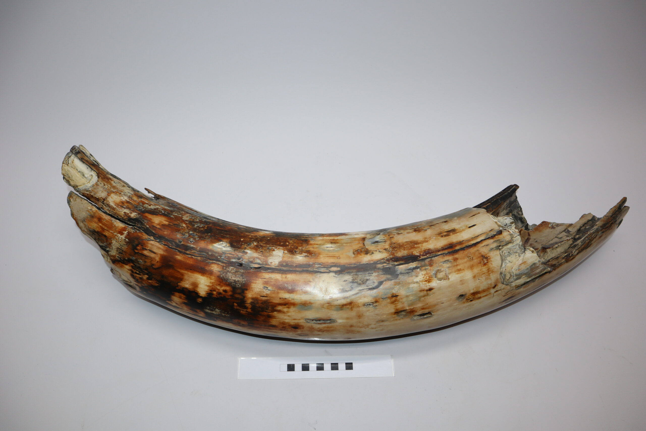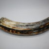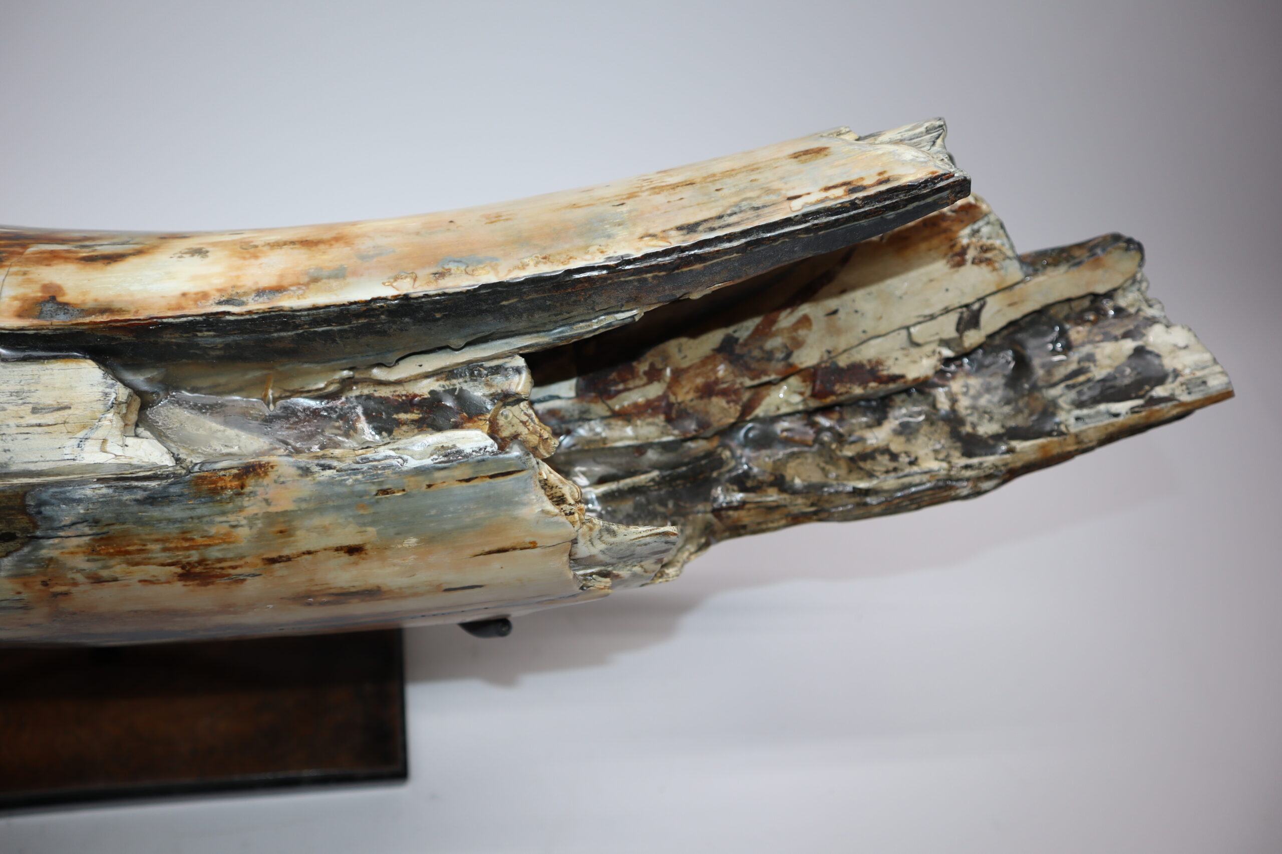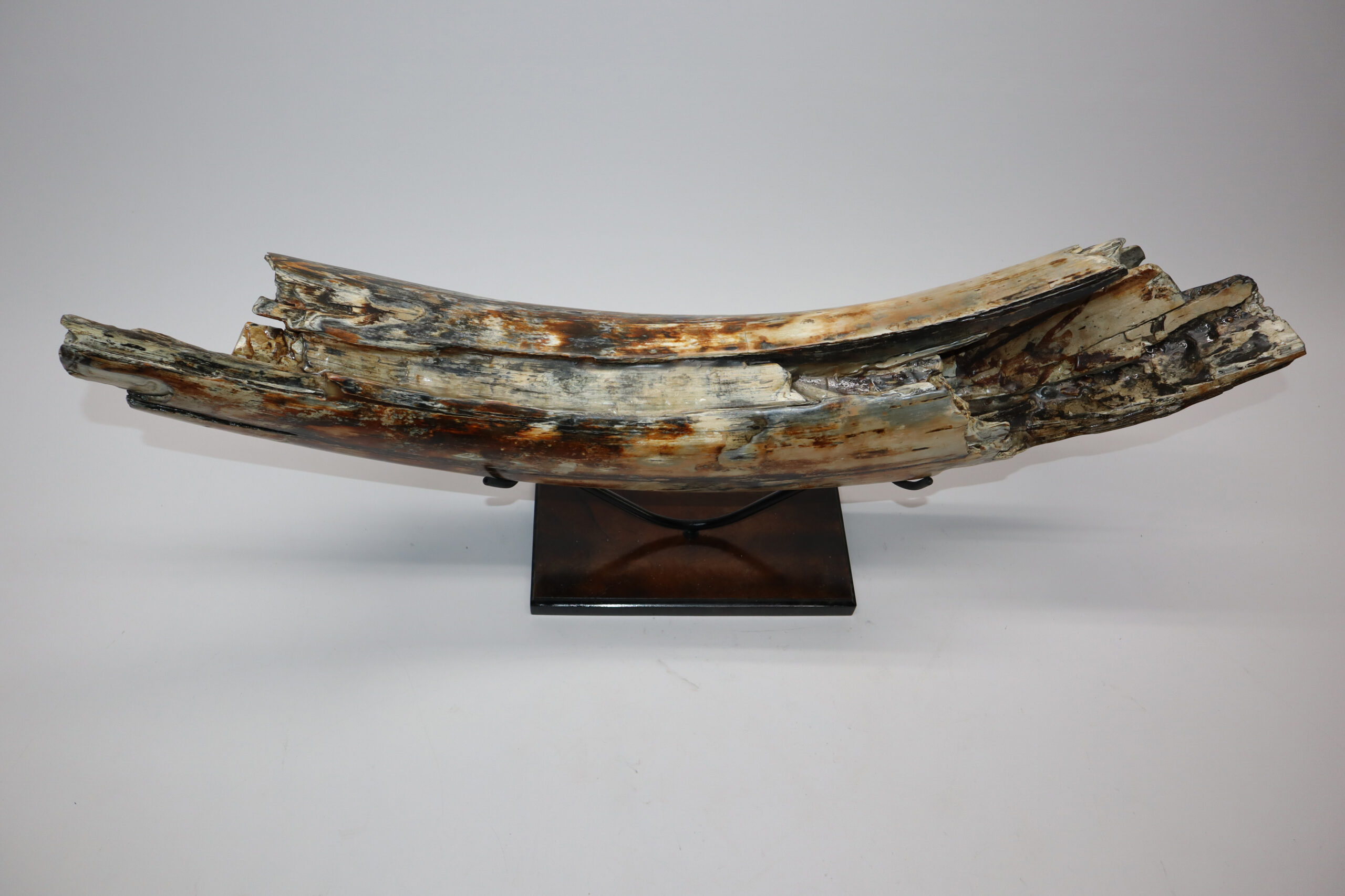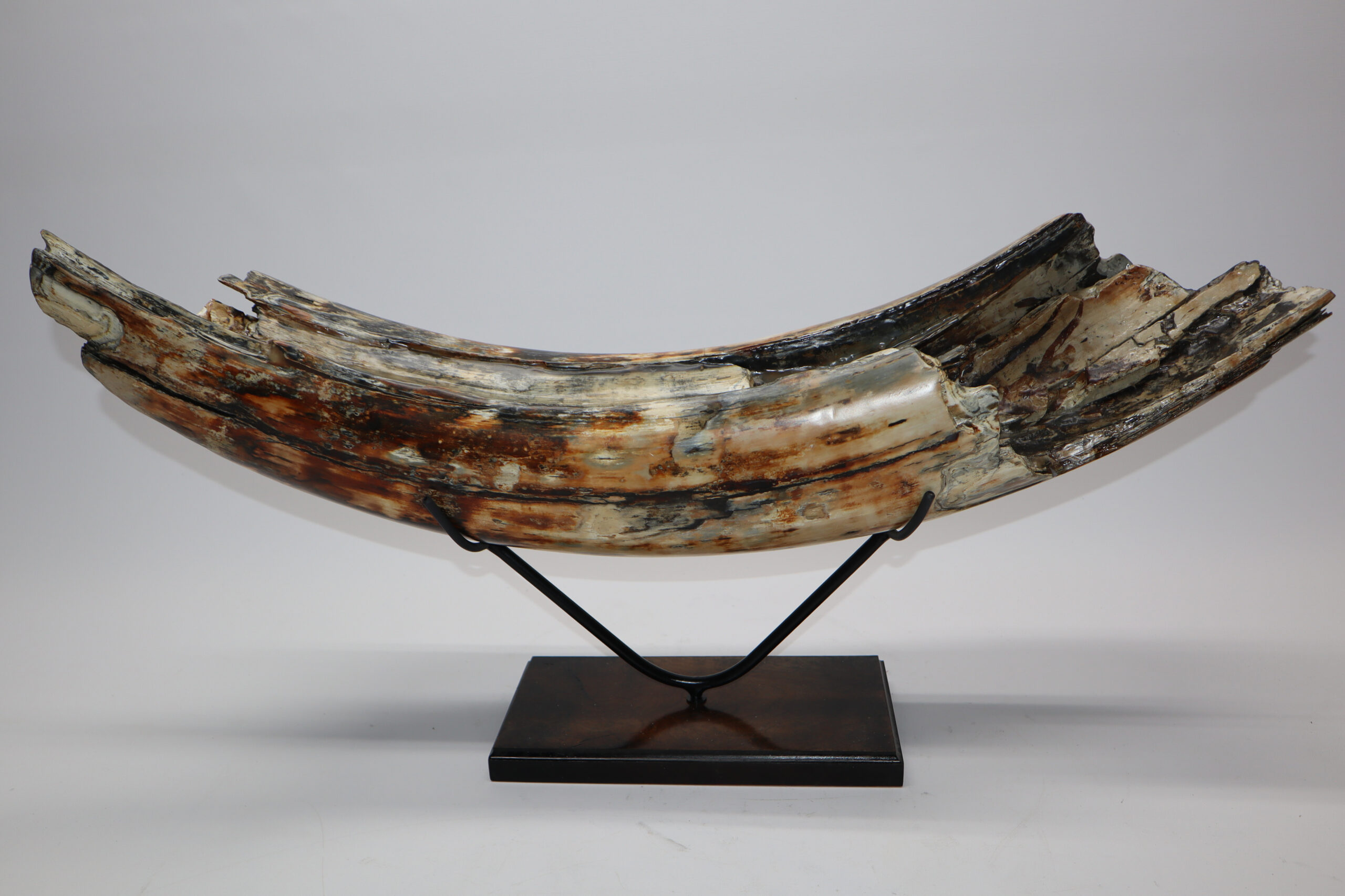 On offer is a beautiful base of a tusk of an adult Woolly Mammoth, in excellent condition. This is the tusk piece where it attached to the animal’s skull, hence the hollow part. Very good state of preservation, as seen in the images. No restoration whatsoever. This tusk base is of beautiful colouring of mainly white, black, gold and brown ivory and with stunning patterning. Judging from the circumference this would have belonged to an adult male Mammoth in the prime of its life. A matt finish has been applied to this piece, but it is also possible to order it with a glossy finish. The black-and-white section of the ruler in the image represents 10 cm / 3.9 inch.