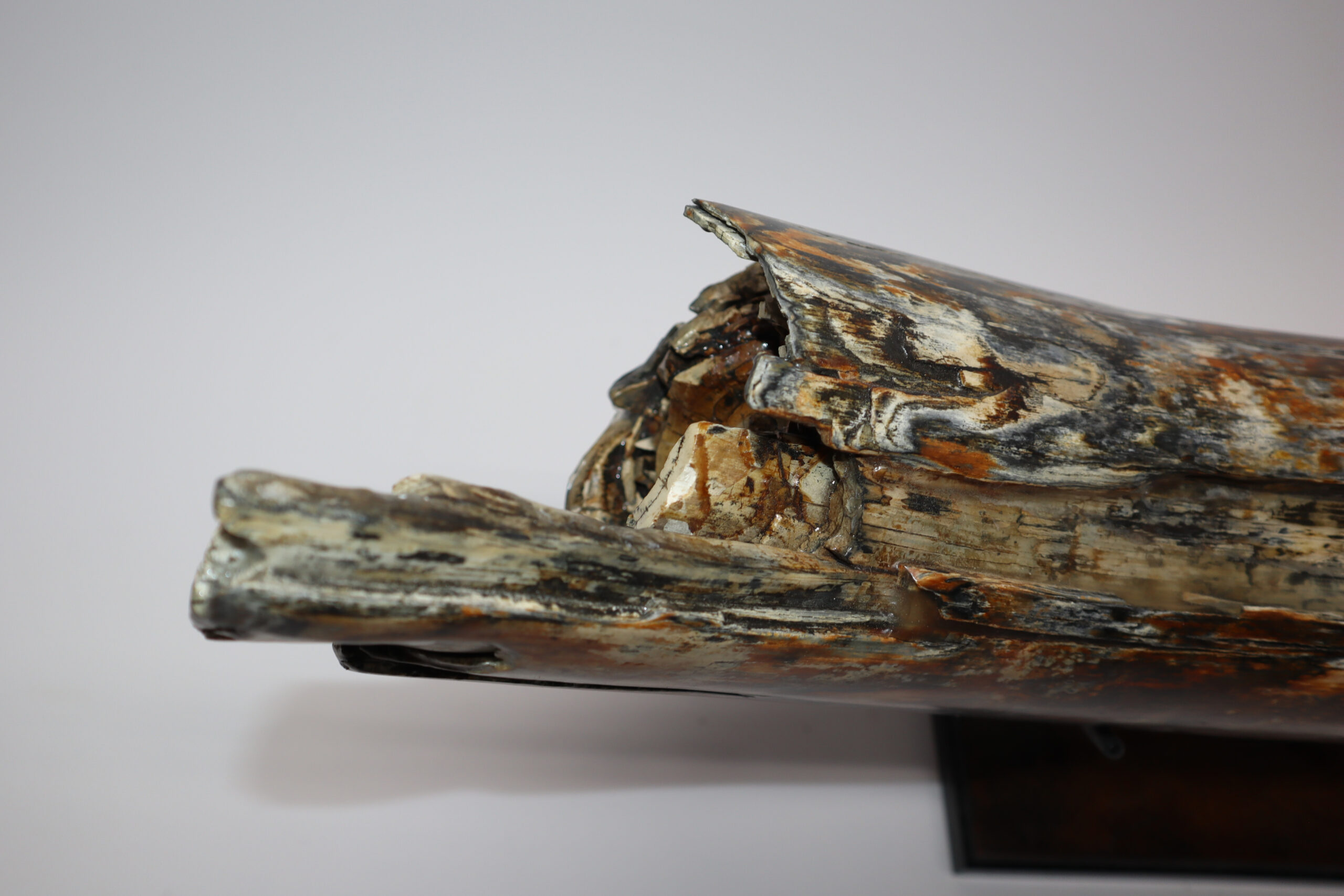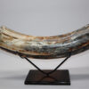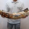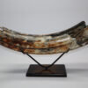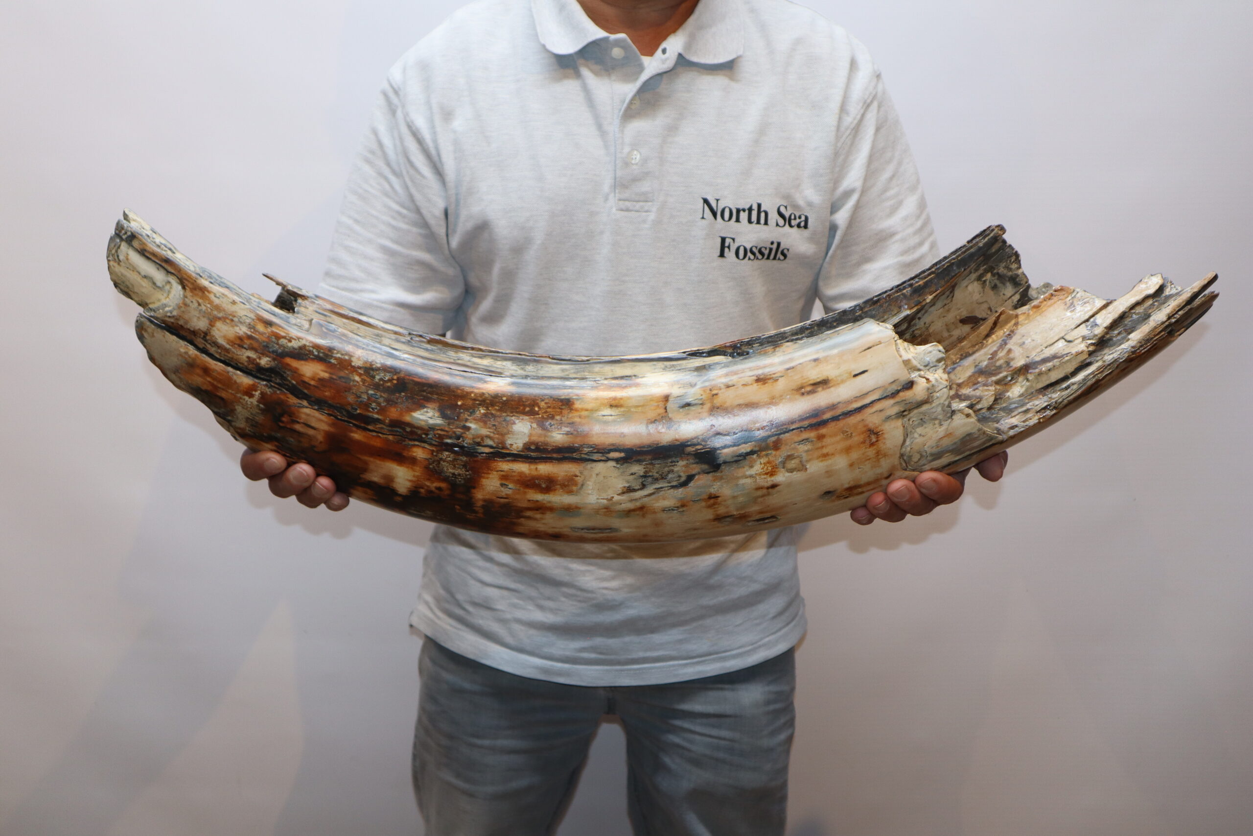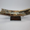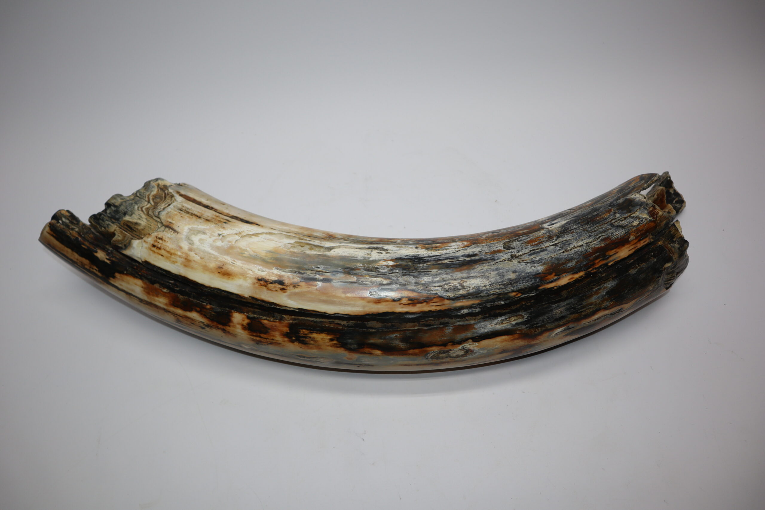 On offer is a beautiful base of a tusk of an adult Woolly Mammoth, in excellent condition. This is the tusk piece where it attached to the animal’s skull, hence the hollow part. Very good state of preservation, as seen in the images. No restoration whatsoever. This tusk base is of beautiful colouring of mainly white, black, gold and brown ivory and with stunning patterning. Judging from the circumference this would have belonged to an adult male Mammoth in the prime of its life. A matt finish has been applied to this piece, but it is also possible to order it with a glossy finish. The black-and-white section of the ruler in the image represents 10 cm / 3.9 inch.