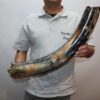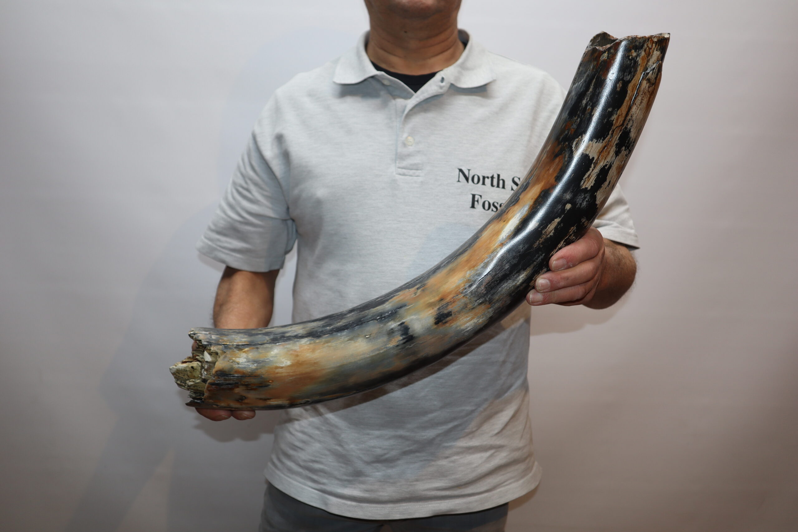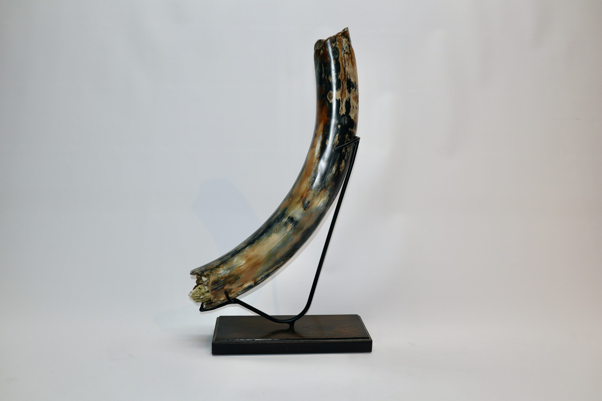 On offer is a beautiful base of a tusk of an adult Woolly Mammoth, in excellent condition. This is the tusk piece where it attached to the animalโs skull, hence the hollow part. Very good state of preservation, as seen in the images. No restoration whatsoever. This tusk base is of beautiful colouring of mainly white, black, gold and brown ivory and with stunning patterning. Judging from the circumference this would have belonged to an adult Mammoth. A matt finish has been applied to this piece, but it is also possible to order it with a glossy finish.
