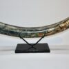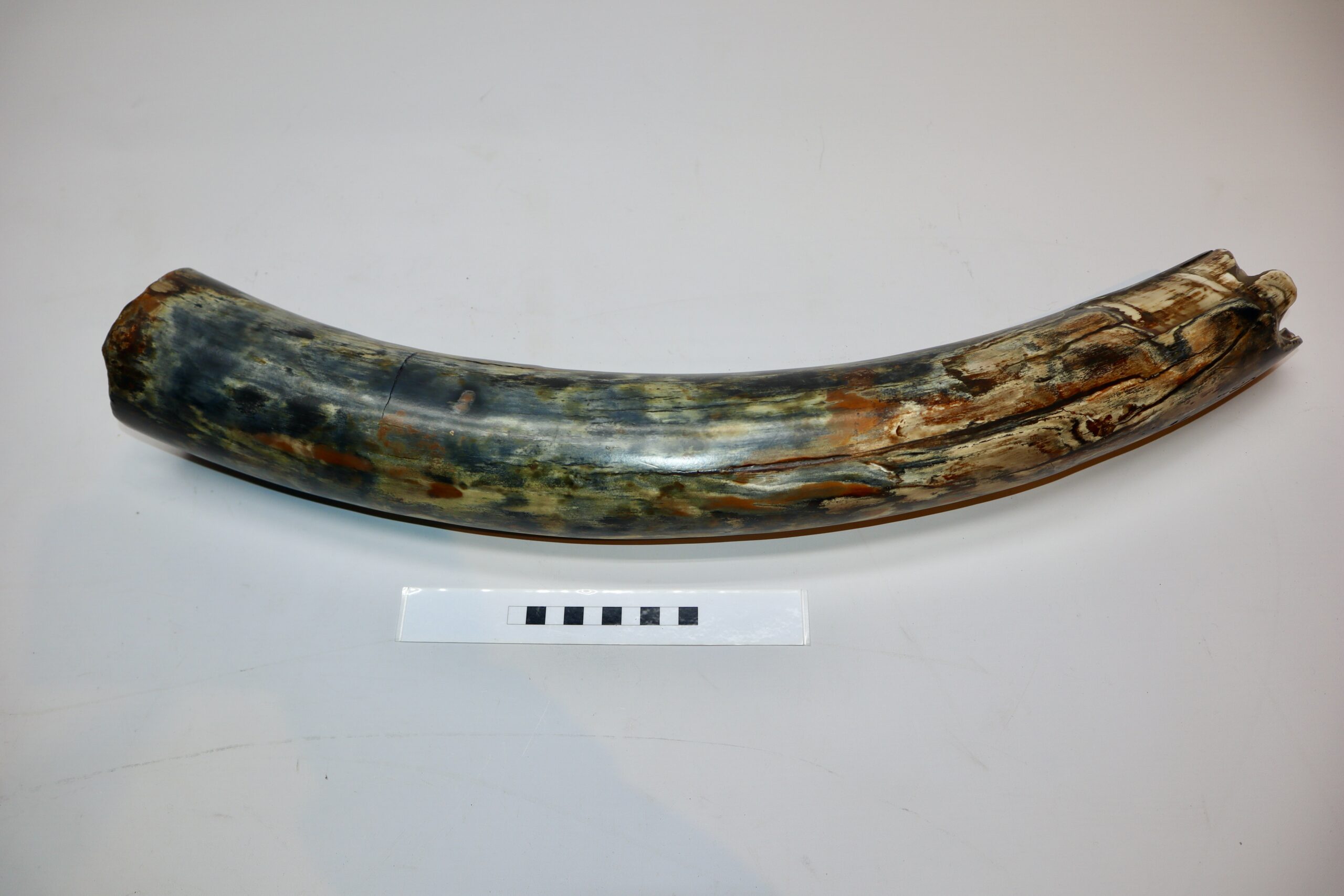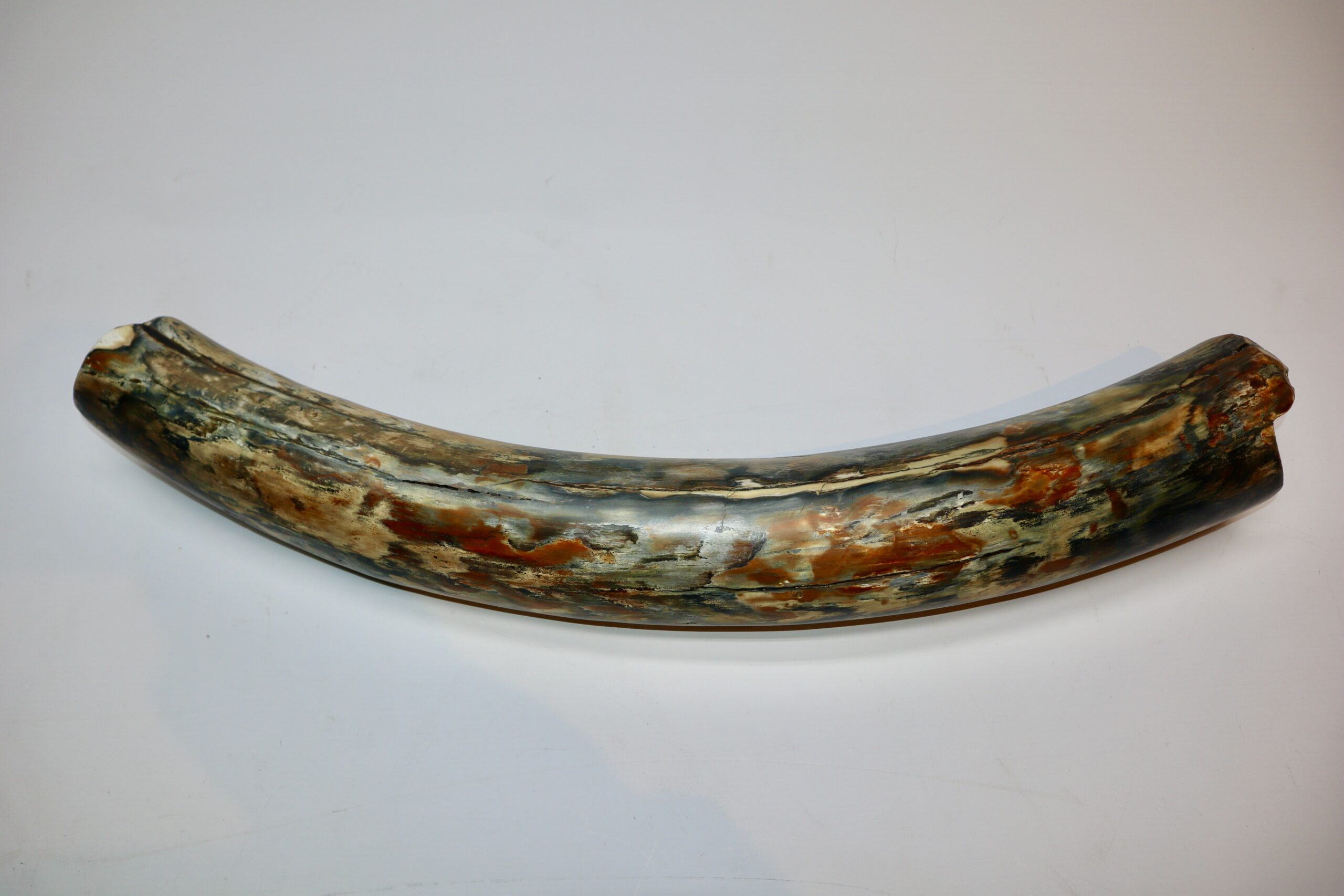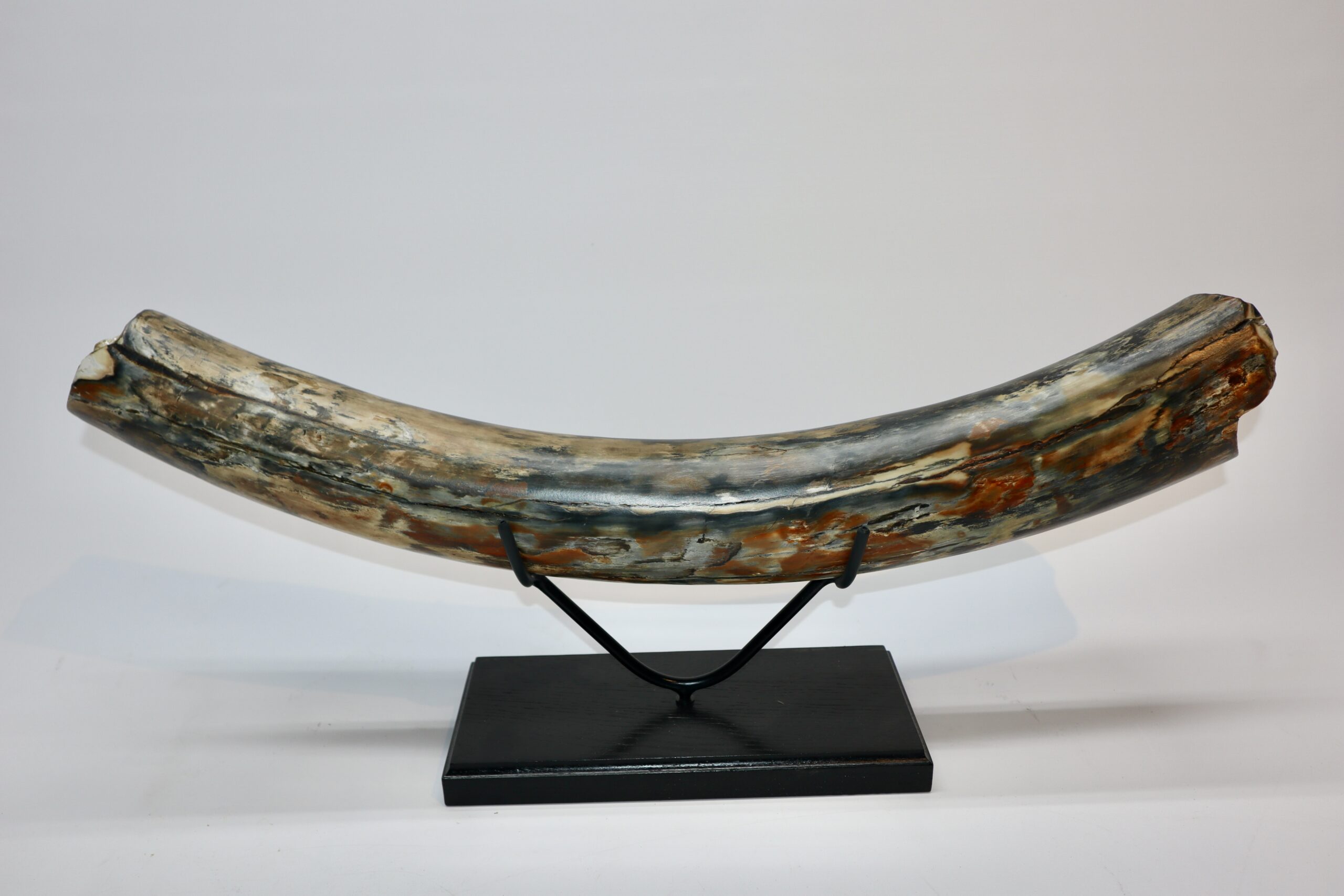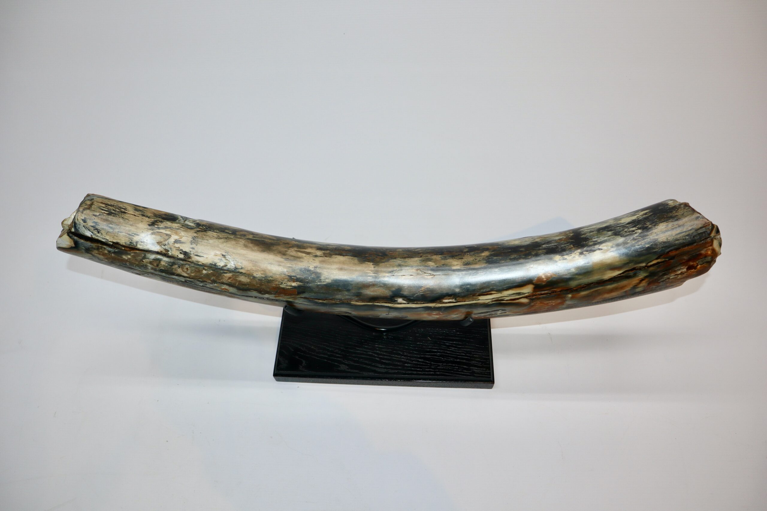 On offer is a beautiful base of a tusk of an adult Woolly Mammoth, in excellent condition. This is the tusk piece where it attached to the animalโs skull, hence the hollow part. Very good state of preservation, as seen in the images. No restoration whatsoever. This tusk base is of beautiful colouring of mainly white, black, gold and brown ivory and with stunning patterning. Judging from the circumference this would have belonged to an adult Mammoth. A matt finish has been applied to this piece, but it is also possible to order it with a glossy finish.