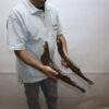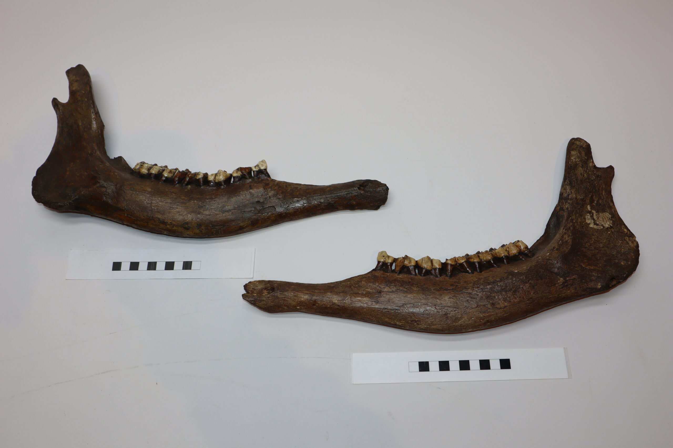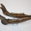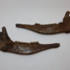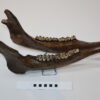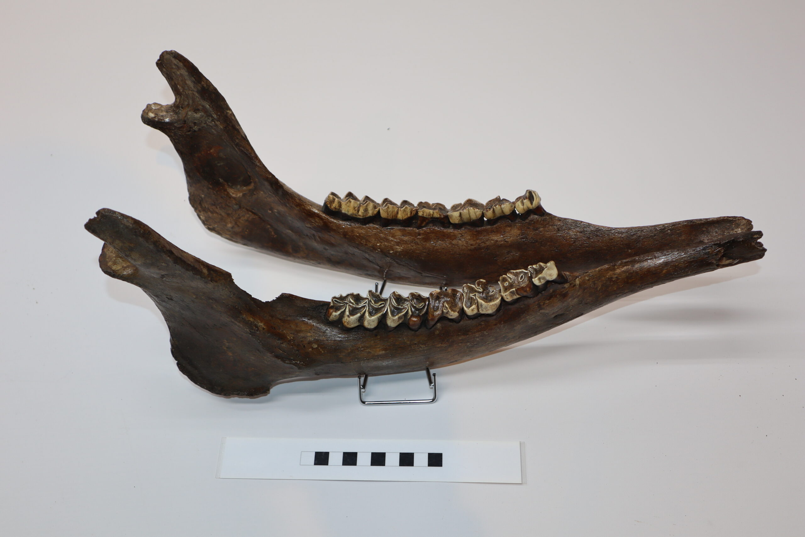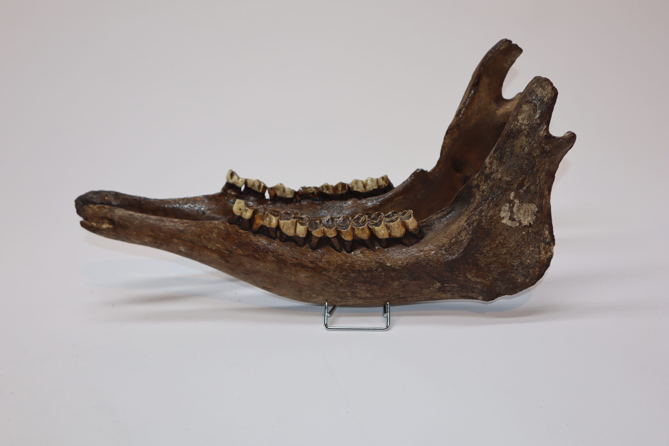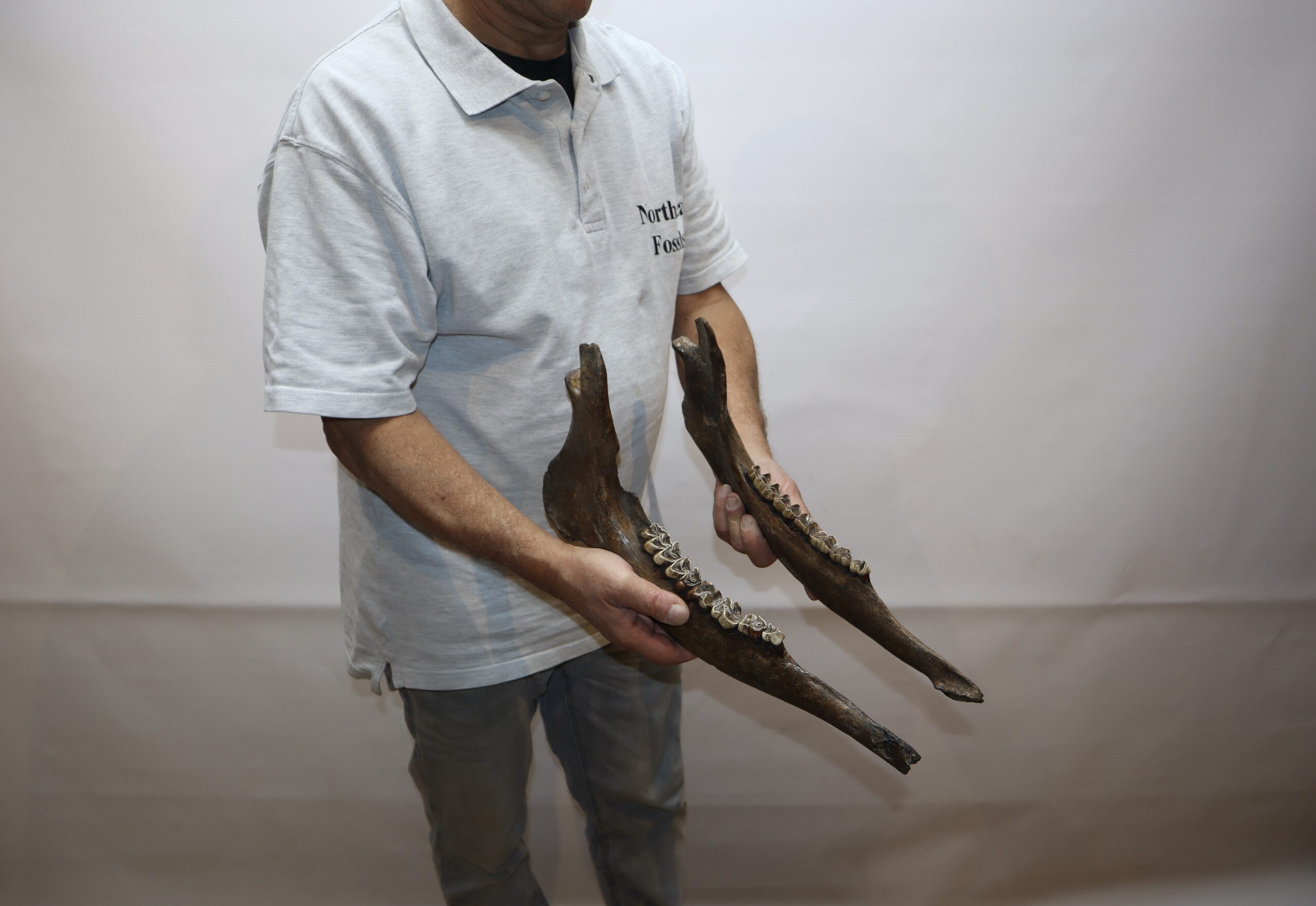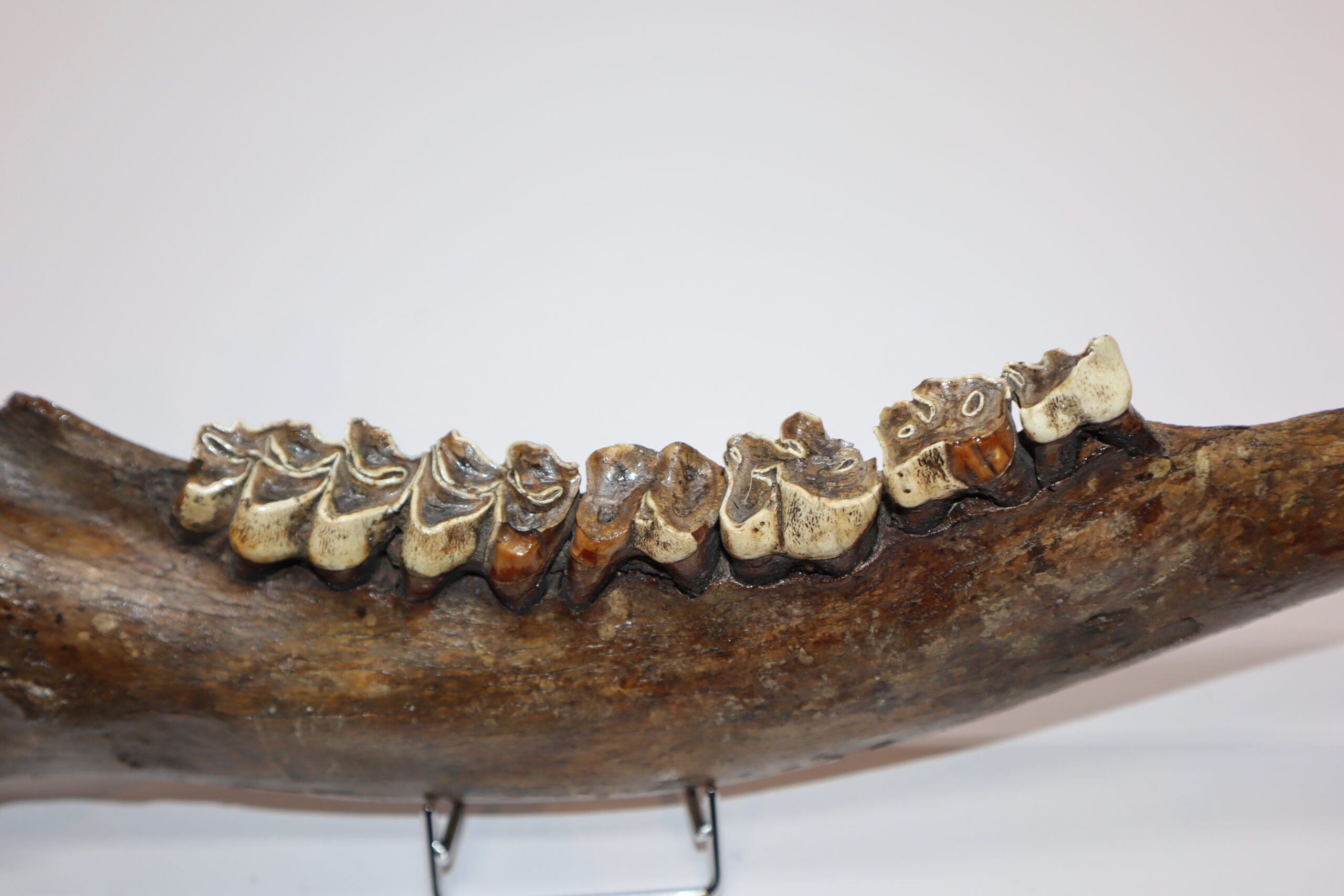 On offer is a fantastic and very rare lower jaw of an adult moose from the Pleistocene era. Consisting of two separate halves, this jaw is very well preserved and still has many wonderful details of anatomy, as seen in the images. Twelve of the original molars survive. No restoration whatsoever. Interesting and exceptionally rare item. Judging from the size, this belonged to an adult animal. Moose material is much rarer than Mammoth fossils. The black and white section of the ruler in the image represents 10 cm / 3.9 inch.